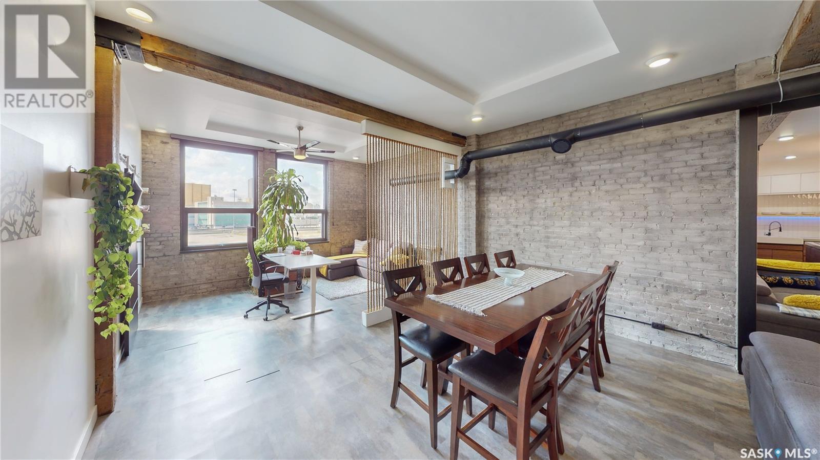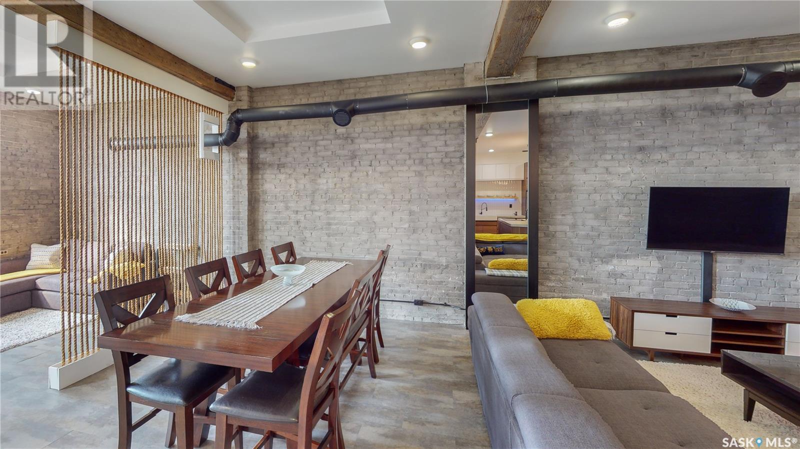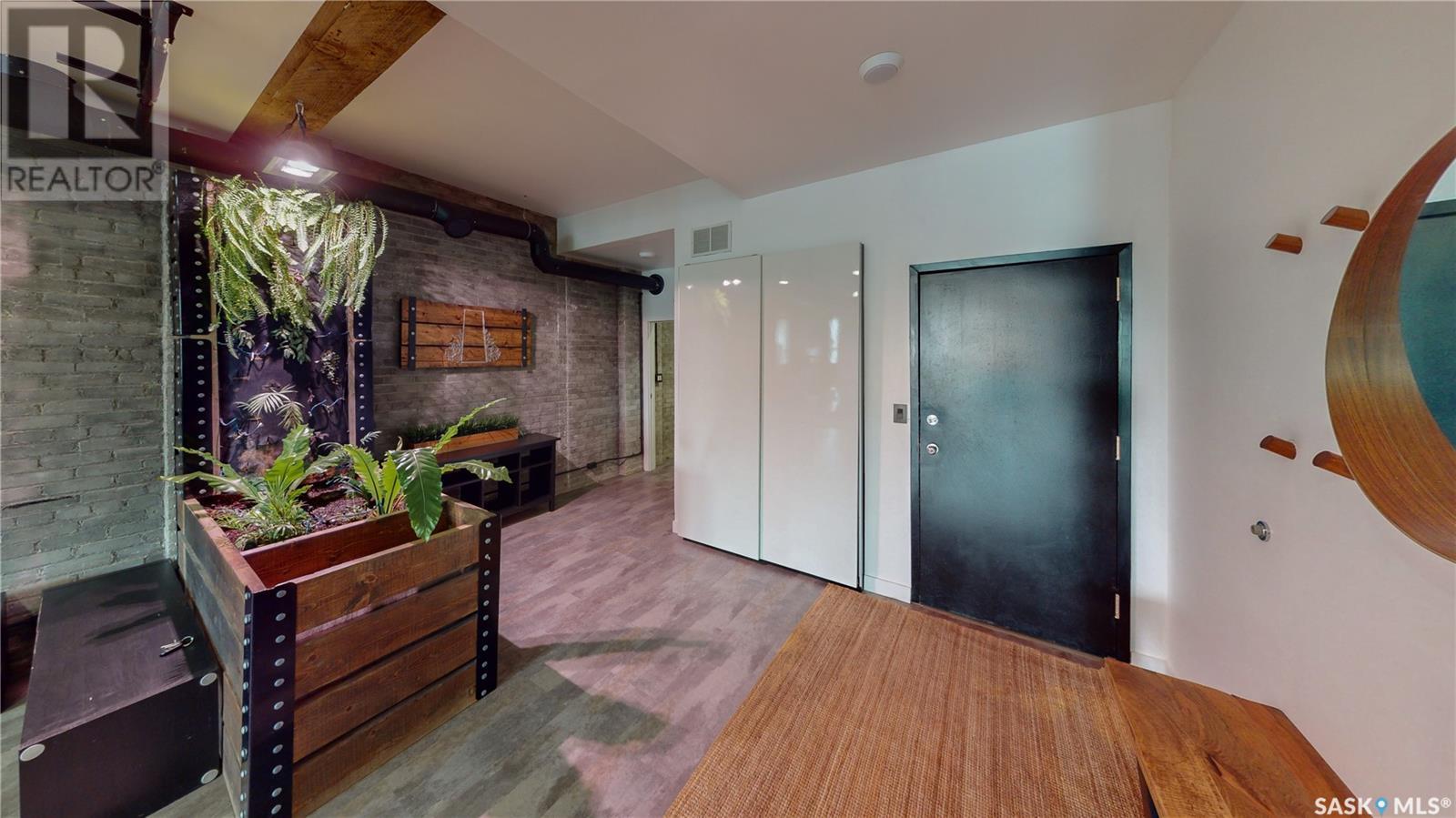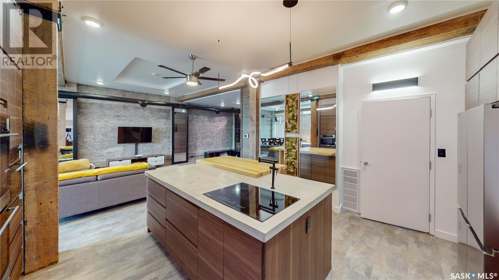 Welcome to unit 400 at 2128 Dewdney Ave in The Ackerman building! This 2 bed 3 bathroom, 1847 square foot fourth floor condo is located in Regina’s lively Warehouse district. You enter the fully furnished suite into the porch where a sitting area offers coat and shoe storage. One of the first things you see is a stunning vertical garden box with fully integrated lighting and watering system. Towards the back of the suite is the first bedroom with vinyl tile flooring, beautiful exposed brick and an auxiliary electrical heater. This bedroom also contains a dedicated entrance from the hallway. The 3 piece ensuite has a tile floor and a large corner jet tub. The main 3 piece bathroom is centrally located within the suite and has a tile shower, updated fixtures and a large vanity. The living room is open and bright with light filling the suite from large south facing windows. The original exposed beams and brick offer authentic warehouse condo feels. The kitchen has an abundance of cabinet storage. It's finished with concrete countertops, a waterfall butcher block, soft close cabinets/drawers, and LED under-lit floating shelves. New appliances include an induction cooktop with pot filler, stainless steel fridge, built in double oven, microwave and dishwasher. The laundry and utility room is neatly behind a door in the kitchen and includes the front load washer and dryer and has an updated gas furnace and water heater. The spacious dining area easily fits a large 8 person dining table. The office at the front of the unit is filled with light as the large windows look out to the cityscape. The primary bedroom is spacious enough for a king size bed and has two additional large south facing windows. The primary also contains a walk-in closet and a 3 piece ensuite with a large steam shower. Flexible possession date is available with option to continue executive rental ($2,350/mo) or renew Jan 1, 2024 (id:22211)