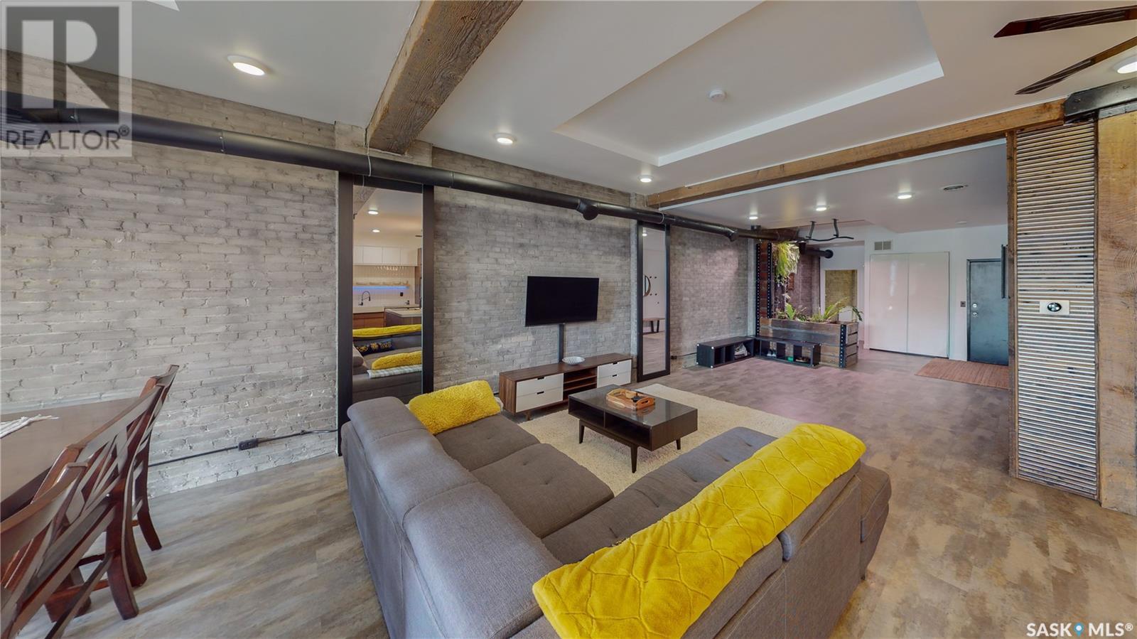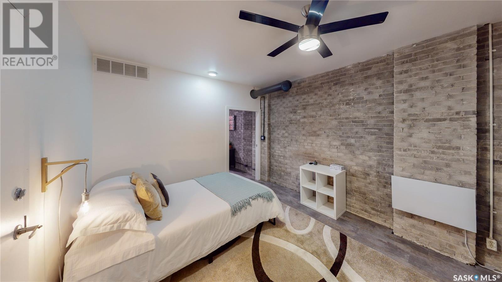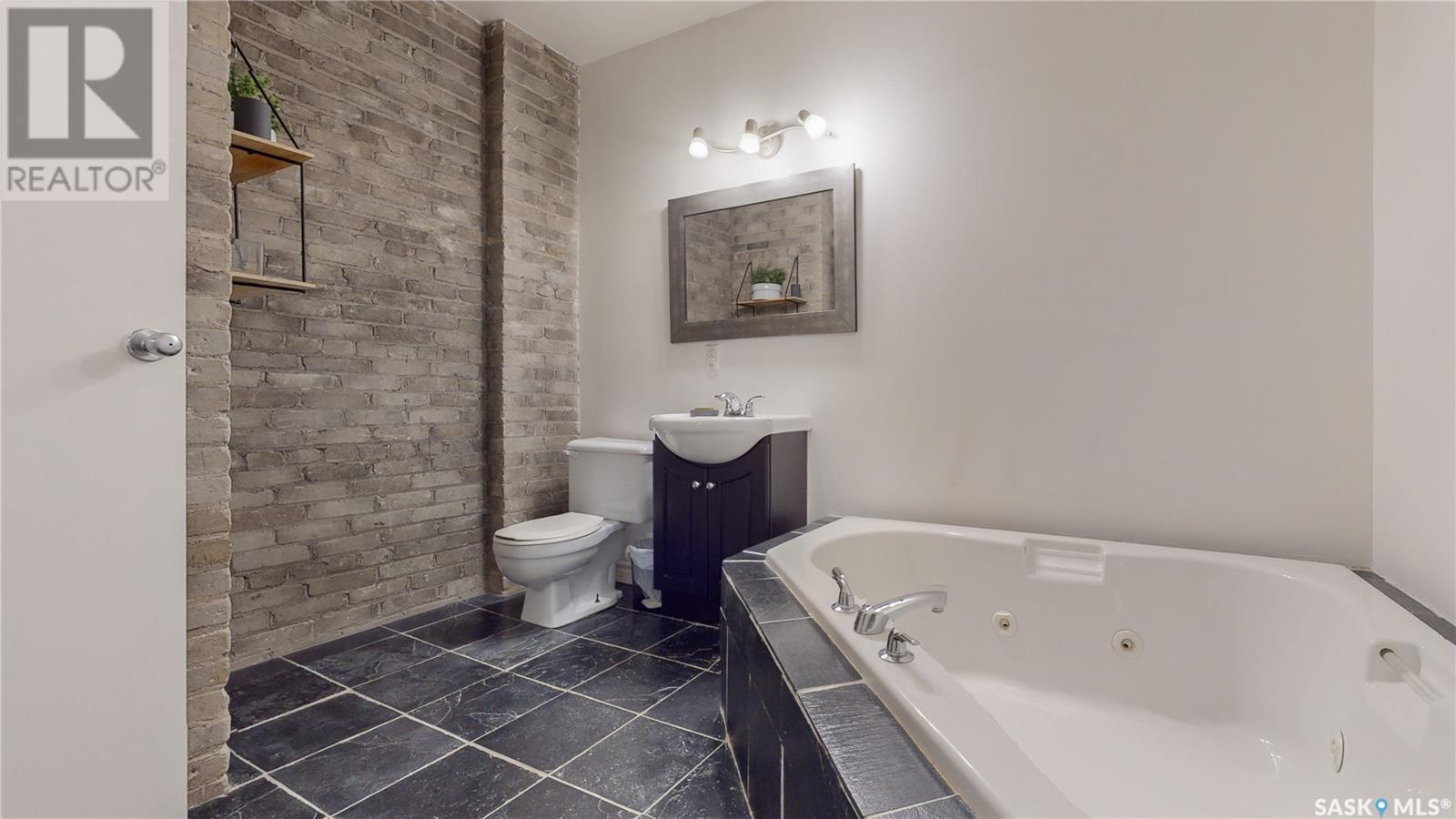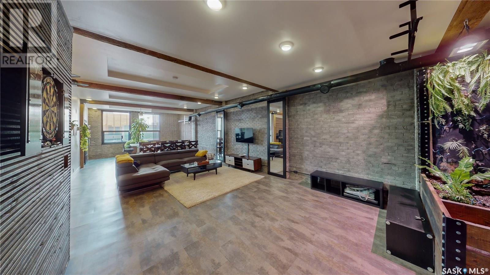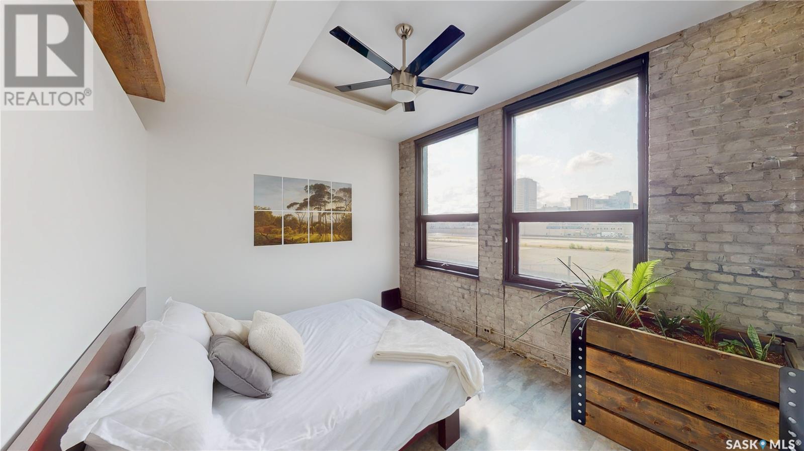 Welcome to unit 400 at 2128 Dewdney Ave in The Ackerman building! This 2 bed 3 bathroom, 1847 square foot fourth floor condo is located in Regina’s lively Warehouse district. You enter the fully furnished suite into the porch where a sitting area offers coat and shoe storage. One of the first things you see is a stunning vertical garden box with fully integrated lighting and watering system. Towards the back of the suite is the first bedroom with vinyl tile flooring, beautiful exposed brick and an auxiliary electrical heater. This bedroom also contains a dedicated entrance from the hallway. The 3 piece ensuite has a tile floor and a large corner jet tub. The main 3 piece bathroom is centrally located within the suite and has a tile shower, updated fixtures and a large vanity. The living room is open and bright with light filling the suite from large south facing windows. The original exposed beams and brick offer authentic warehouse condo feels. The kitchen has an abundance of cabinet storage. It's finished with concrete countertops, a waterfall butcher block, soft close cabinets/drawers, and LED under-lit floating shelves. New appliances include an induction cooktop with pot filler, stainless steel fridge, built in double oven, microwave and dishwasher. The laundry and utility room is neatly behind a door in the kitchen and includes the front load washer and dryer and has an updated gas furnace and water heater. The spacious dining area easily fits a large 8 person dining table. The office at the front of the unit is filled with light as the large windows look out to the cityscape. The primary bedroom is spacious enough for a king size bed and has two additional large south facing windows. The primary also contains a walk-in closet and a 3 piece ensuite with a large steam shower. Flexible possession date is available with option to continue executive rental ($2,350/mo) or renew Jan 1, 2024 (id:22211)