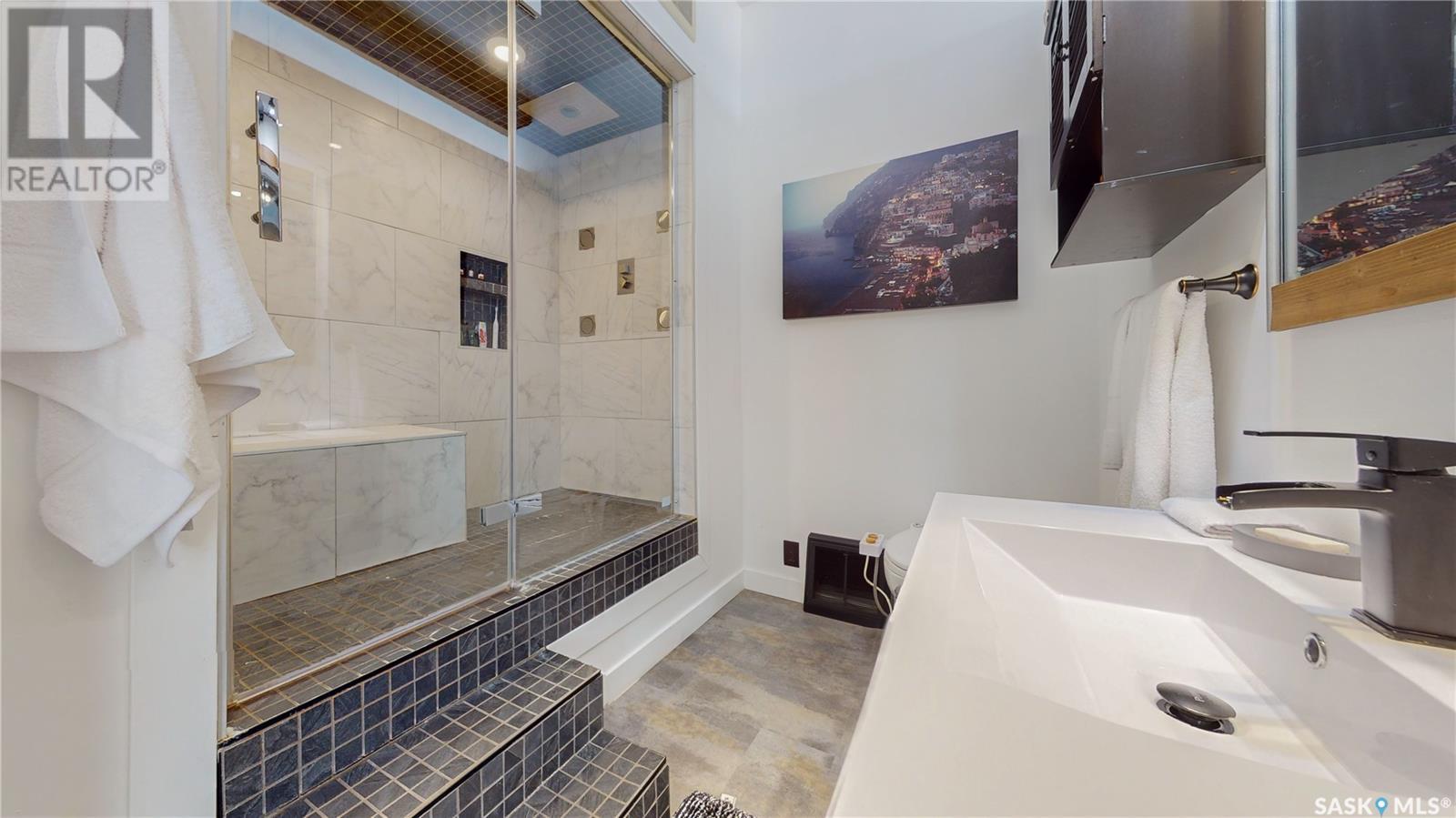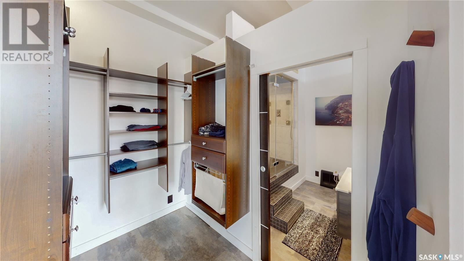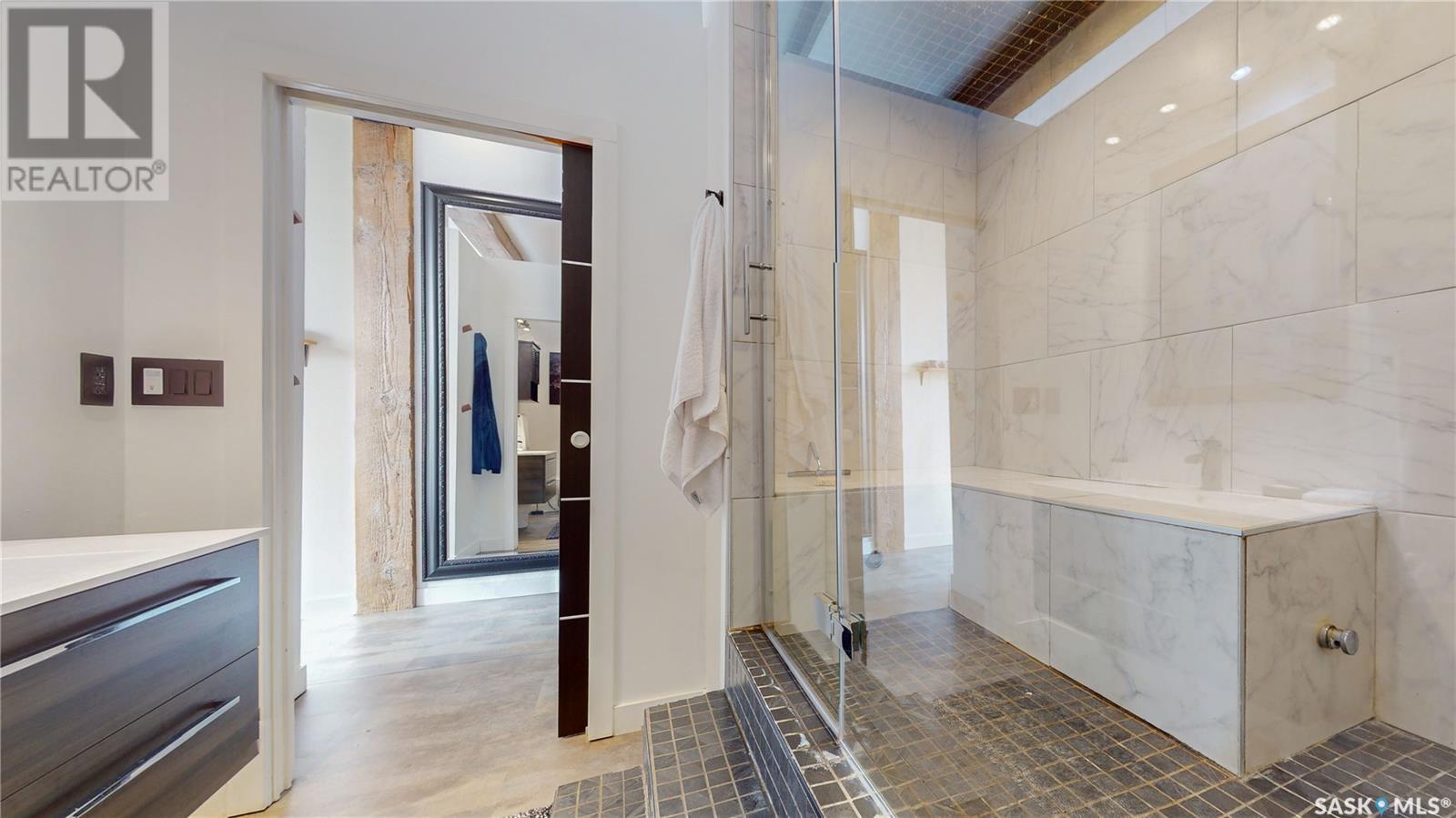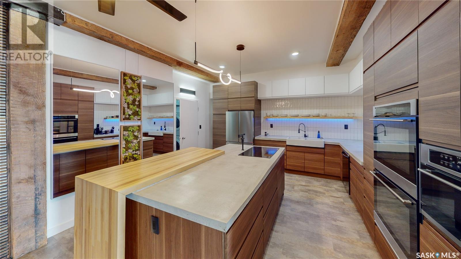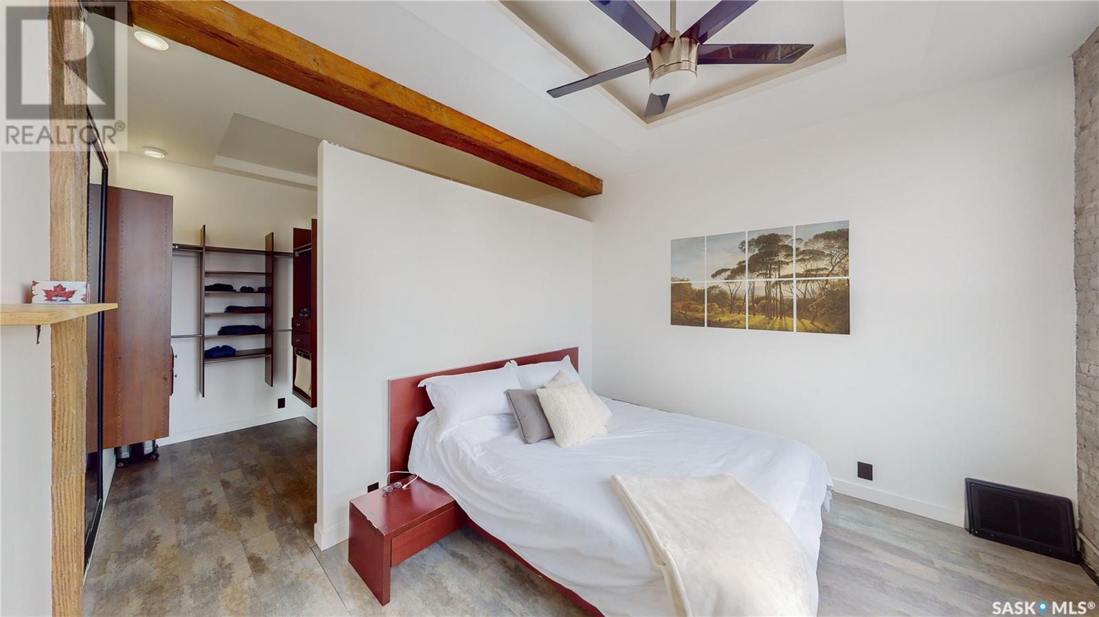 Welcome to unit 400 at 2128 Dewdney Ave in The Ackerman building! This 2 bed 3 bathroom, 1847 square foot fourth floor condo is located in Regina’s lively Warehouse district. You enter the fully furnished suite into the porch where a sitting area offers coat and shoe storage. One of the first things you see is a stunning vertical garden box with fully integrated lighting and watering system. Towards the back of the suite is the first bedroom with vinyl tile flooring, beautiful exposed brick and an auxiliary electrical heater. This bedroom also contains a dedicated entrance from the hallway. The 3 piece ensuite has a tile floor and a large corner jet tub. The main 3 piece bathroom is centrally located within the suite and has a tile shower, updated fixtures and a large vanity. The living room is open and bright with light filling the suite from large south facing windows. The original exposed beams and brick offer authentic warehouse condo feels. The kitchen has an abundance of cabinet storage. It's finished with concrete countertops, a waterfall butcher block, soft close cabinets/drawers, and LED under-lit floating shelves. New appliances include an induction cooktop with pot filler, stainless steel fridge, built in double oven, microwave and dishwasher. The laundry and utility room is neatly behind a door in the kitchen and includes the front load washer and dryer and has an updated gas furnace and water heater. The spacious dining area easily fits a large 8 person dining table. The office at the front of the unit is filled with light as the large windows look out to the cityscape. The primary bedroom is spacious enough for a king size bed and has two additional large south facing windows. The primary also contains a walk-in closet and a 3 piece ensuite with a large steam shower. Flexible possession date is available with option to continue executive rental ($2,350/mo) or renew Jan 1, 2024 (id:22211)