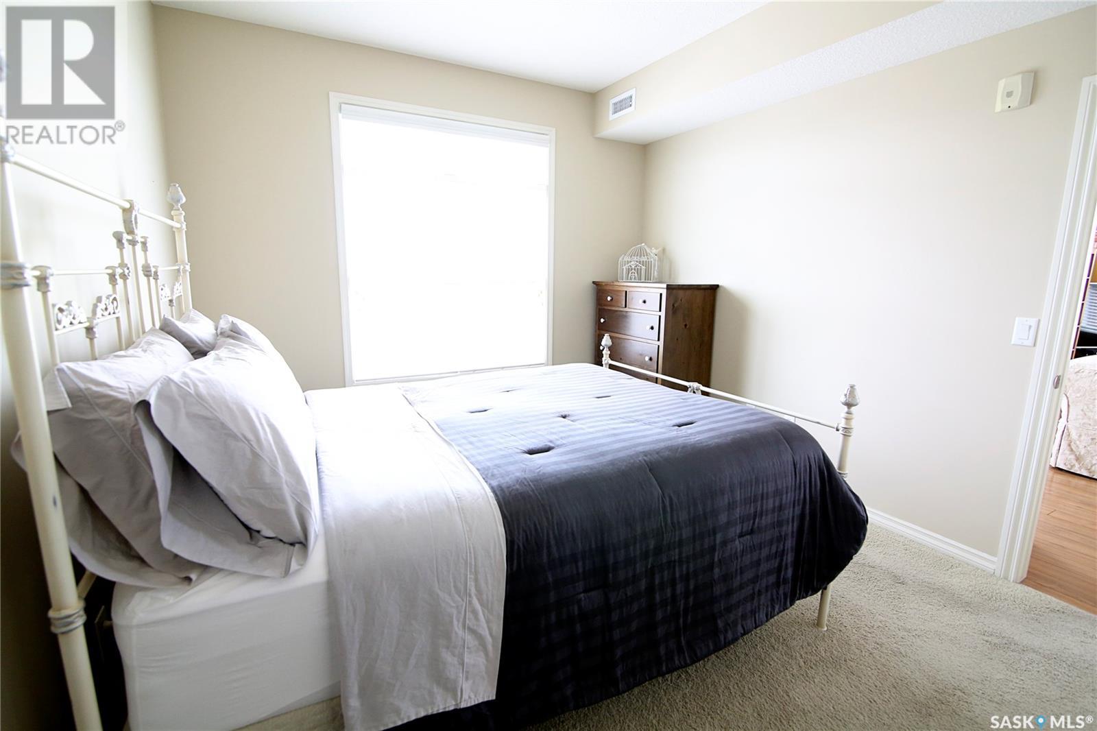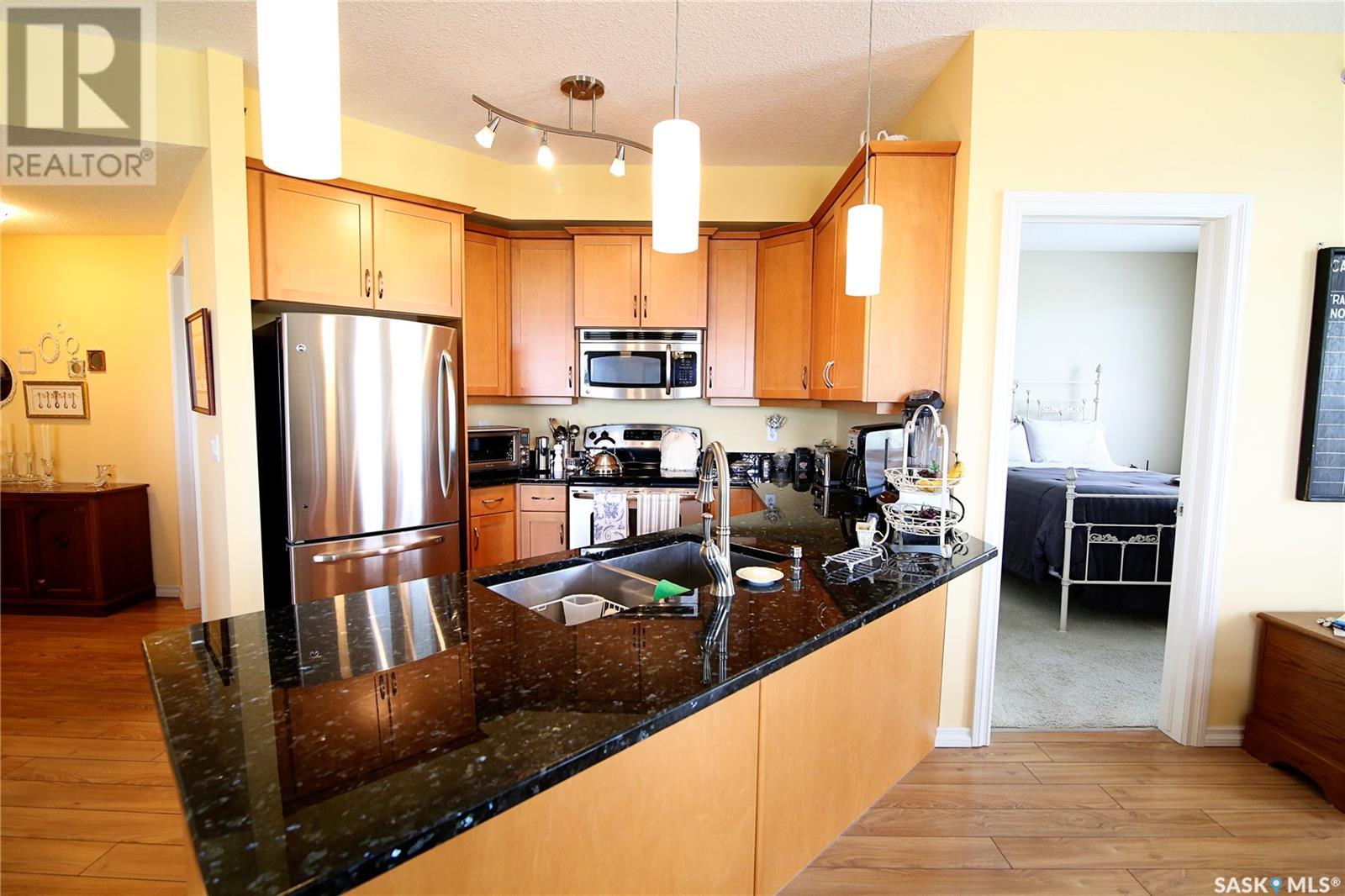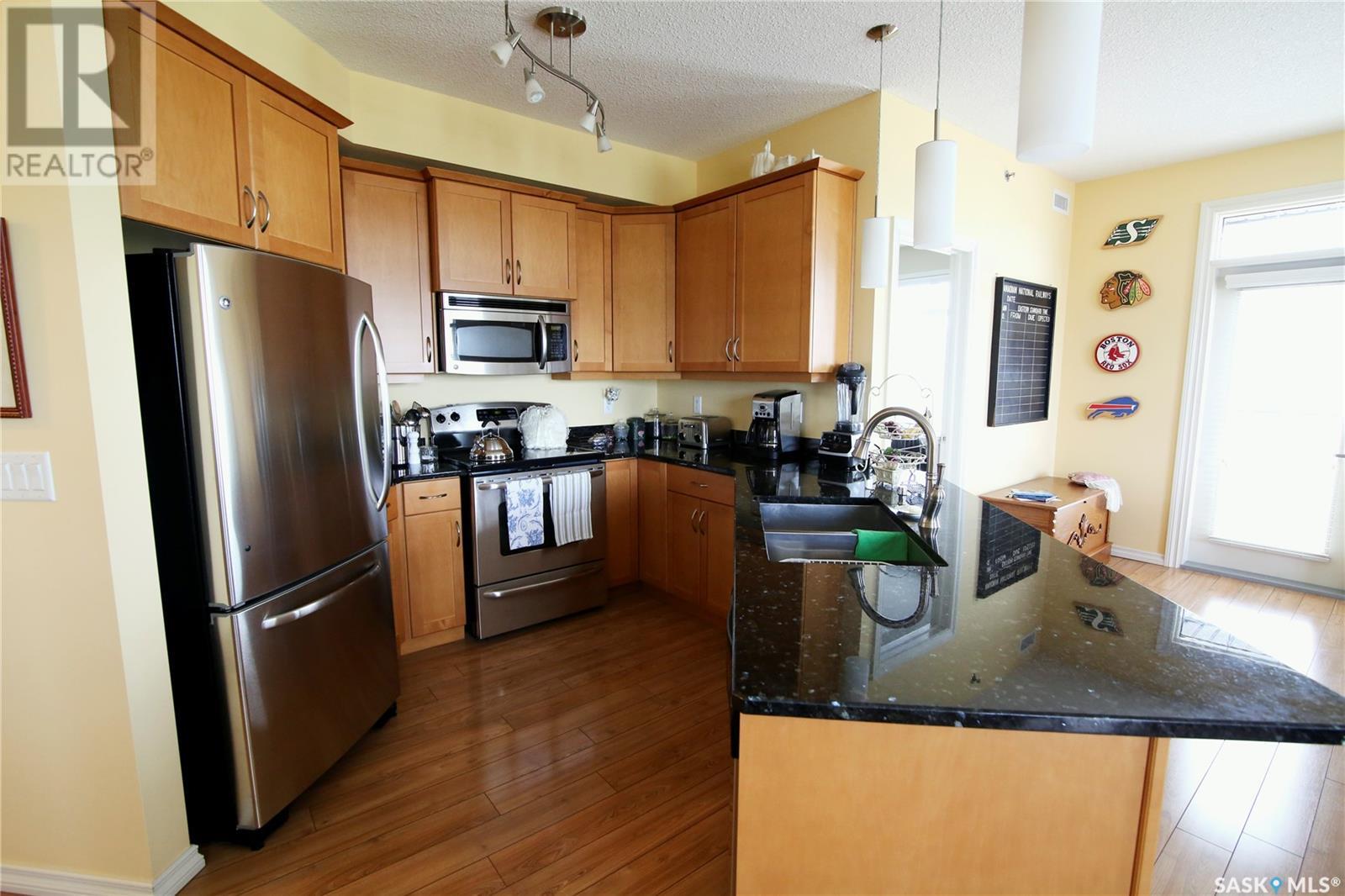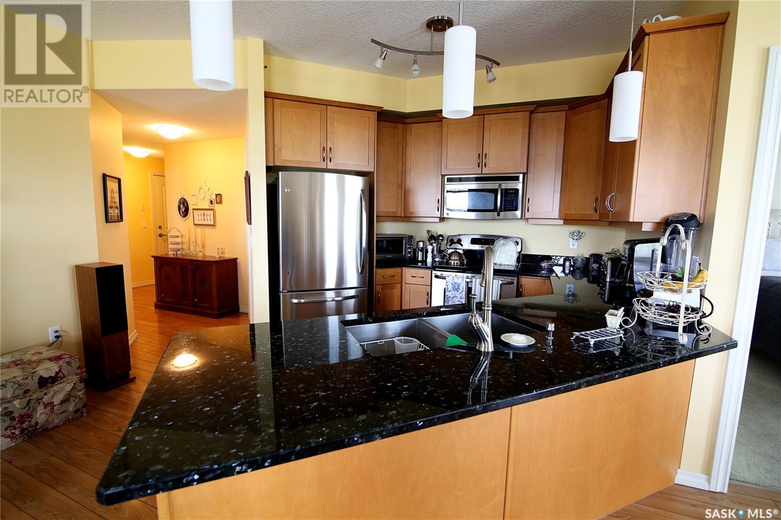 Wow! Are you looking for a great east end, top floor condo with underground parking? You've found it. This second owner home has been lovingly cared for and is ready and waiting for someone new to love it as well. This top floor, end unit is east facing and flooded with tons of natural light. Its super bright and sunny and very warm and inviting. There is a spacious foyer as well as a large laundry with room for extra storage. On one side is a large primary bedroom with its own deck with partial water views, as well as a large walk in closet and 3 pc ensuite. On the other end of this home is a good sized, 2nd bedroom with another walk in closet. The living space features a good sized kitchen with tons of maple cabinets and stunning black granite counters as well as a stainless steel full appliance package. The kitchen is open to a good sized diningroom and large livingroom with a garden door to the 2nd deck with a natural gas line for your grill. This complex has a great amenities/games room with a fantastic pool table. This suite comes with heated underground parking as well as a convenient storage locker. Riverbend Lakes is a great complex, close to all the east end shopping and restaurants. This homes owners have taken such great care of it and it truly needs to be seen to be appreciated. Don't miss out on this one! (id:22211)