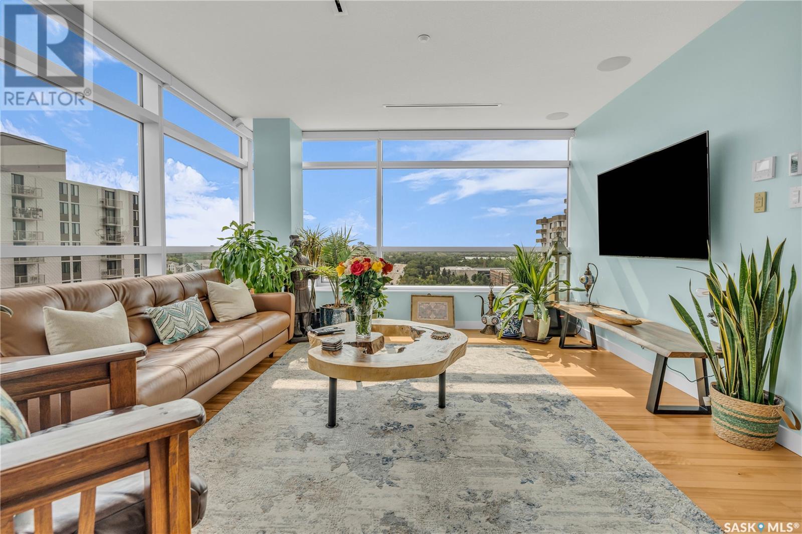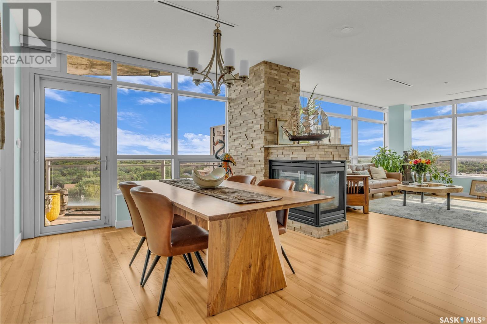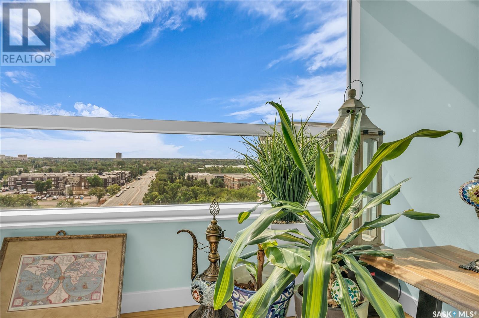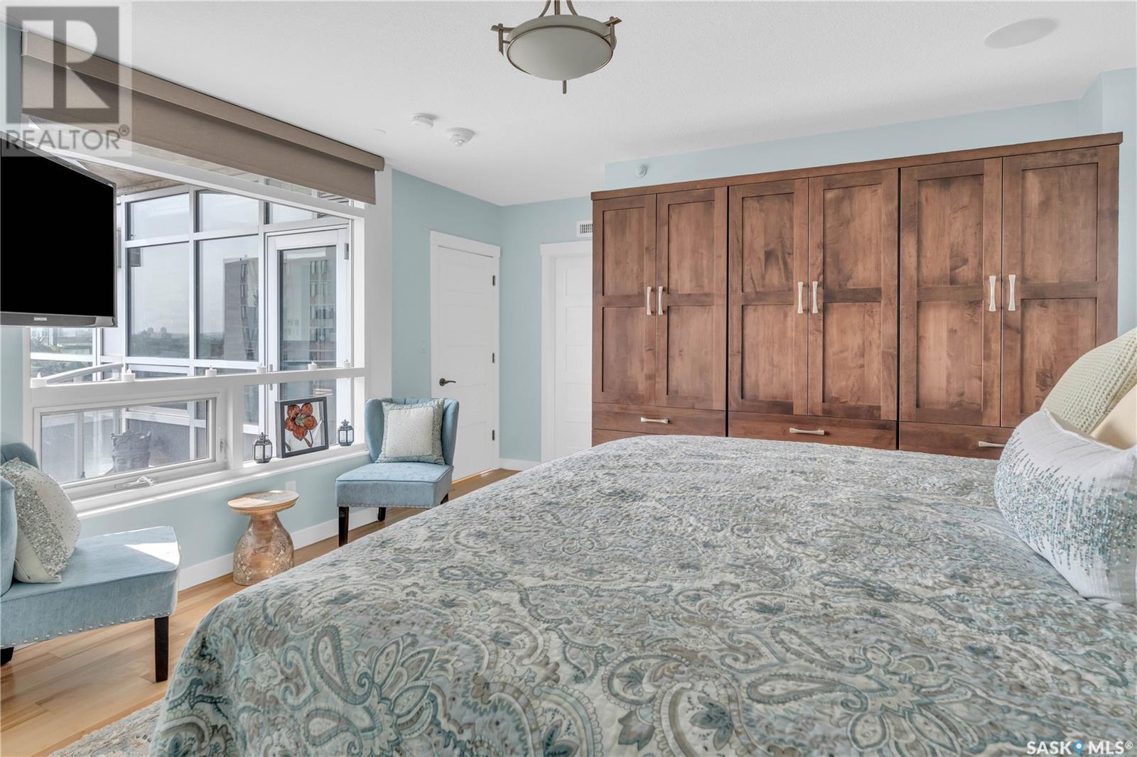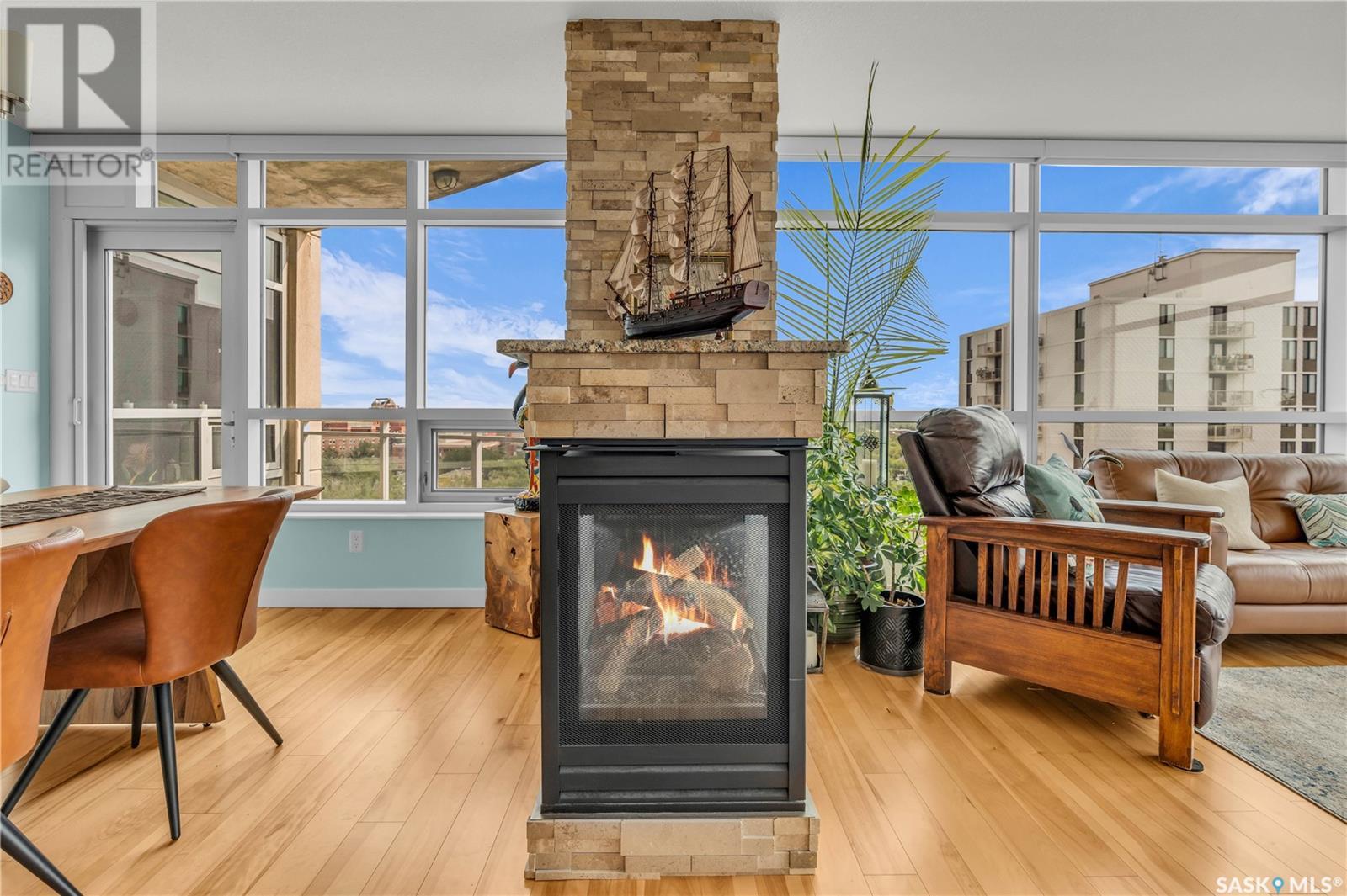 Welcome to 904 - 2300 Broad Street. This exceptional residence offers a unique living experience with stunning views of Wascana Lake and the beautifully treed old town. Enjoy the changing seasons from nearly floor-to-ceiling windows on three walls, without ever needing to pick up a leaf or shovel snow. Inside, the home impresses with blonde oak flooring and heated tile throughout. The chef’s kitchen features floor-to-ceiling cabinets, granite countertops, mahogany solid wood cabinetry, dual porcelain sinks, and high-end appliances. The master bedroom boasts a floor-to-ceiling window facing Wascana Park, a generous space, a walk-in closet, and mahogany built-in wardrobes. The luxurious ensuite bathroom includes a tiled shower with multiple shower heads, heated tile floors, a large granite countertop with dual sinks, and mahogany cabinets. Don’t miss the large soaker tub with a tile surround. The second bedroom, with two walls of floor-to-ceiling windows overlooking a century-old tree canopy, offers ample space and built-in mahogany wardrobes. The secondary bathroom features heated tile floors, granite countertops, and a corner shower. The laundry room is also elegantly designed with a granite countertop and mahogany cabinets. All blinds are remote-operated for automatic opening and closing, with blackout blinds in both bedrooms. The living space, the heart of this home, is enhanced by a sandstone three-sided fireplace and is surrounded by natural light. Built-in surround sound allows you to enjoy your favorite music or TV shows, whether you're relaxing in the soaker tub or in the living room. Additionally, an executive office/den is conveniently located just off the kitchen, featuring dual sliding doors. Comfort is further enhanced with an in-suite air exchange and humidity control system. The custom-tiled deck facing Wascana Park is perfect for enjoying your morning coffee while watching the sunrise. This property also includes two generous parking stalls! (id:22211)