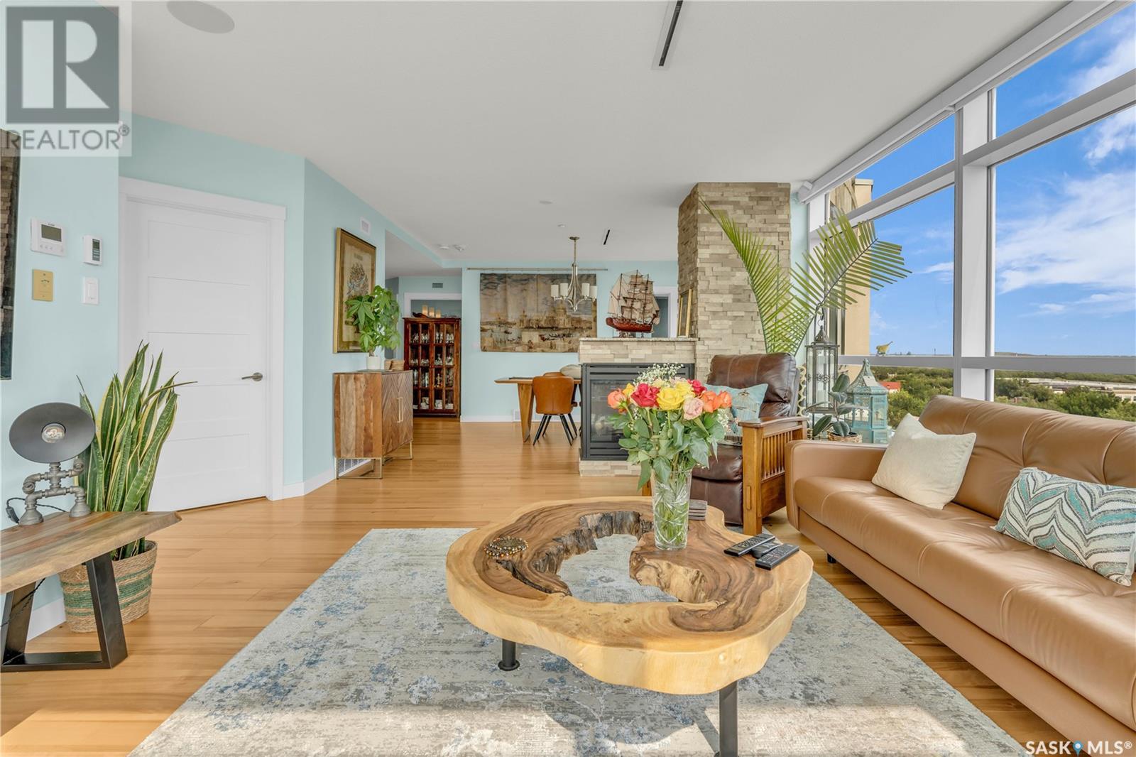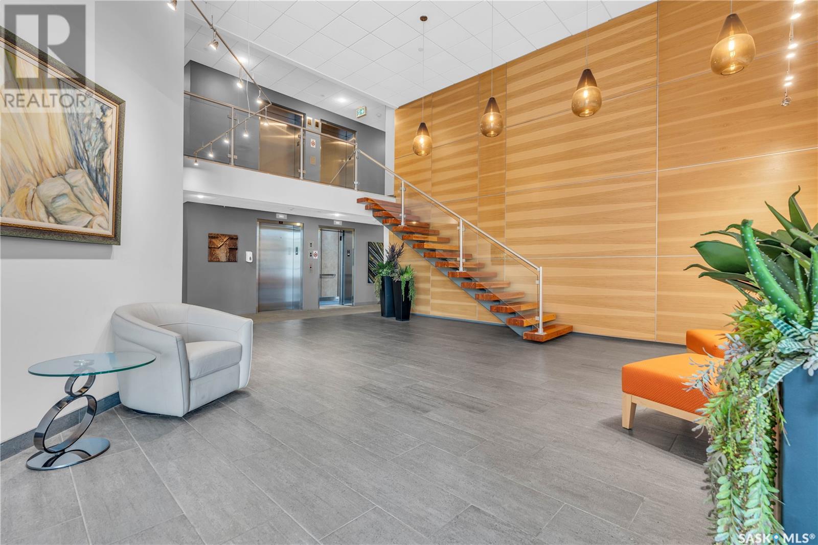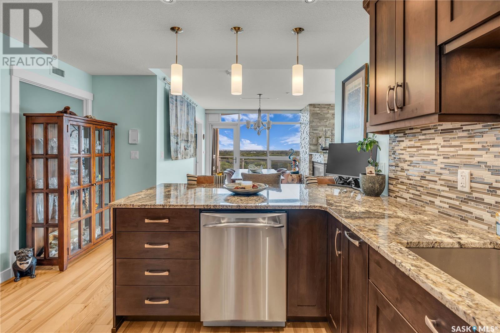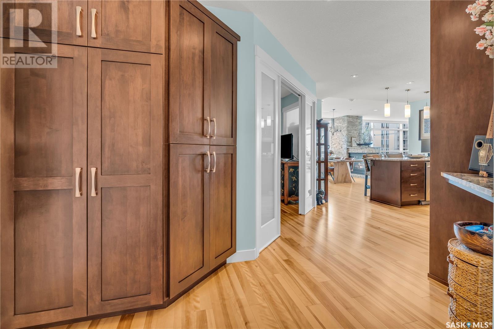 Welcome to 904 - 2300 Broad Street. This exceptional residence offers a unique living experience with stunning views of Wascana Lake and the beautifully treed old town. Enjoy the changing seasons from nearly floor-to-ceiling windows on three walls, without ever needing to pick up a leaf or shovel snow. Inside, the home impresses with blonde oak flooring and heated tile throughout. The chef’s kitchen features floor-to-ceiling cabinets, granite countertops, mahogany solid wood cabinetry, dual porcelain sinks, and high-end appliances. The master bedroom boasts a floor-to-ceiling window facing Wascana Park, a generous space, a walk-in closet, and mahogany built-in wardrobes. The luxurious ensuite bathroom includes a tiled shower with multiple shower heads, heated tile floors, a large granite countertop with dual sinks, and mahogany cabinets. Don’t miss the large soaker tub with a tile surround. The second bedroom, with two walls of floor-to-ceiling windows overlooking a century-old tree canopy, offers ample space and built-in mahogany wardrobes. The secondary bathroom features heated tile floors, granite countertops, and a corner shower. The laundry room is also elegantly designed with a granite countertop and mahogany cabinets. All blinds are remote-operated for automatic opening and closing, with blackout blinds in both bedrooms. The living space, the heart of this home, is enhanced by a sandstone three-sided fireplace and is surrounded by natural light. Built-in surround sound allows you to enjoy your favorite music or TV shows, whether you're relaxing in the soaker tub or in the living room. Additionally, an executive office/den is conveniently located just off the kitchen, featuring dual sliding doors. Comfort is further enhanced with an in-suite air exchange and humidity control system. The custom-tiled deck facing Wascana Park is perfect for enjoying your morning coffee while watching the sunrise. This property also includes two generous parking stalls! (id:22211)