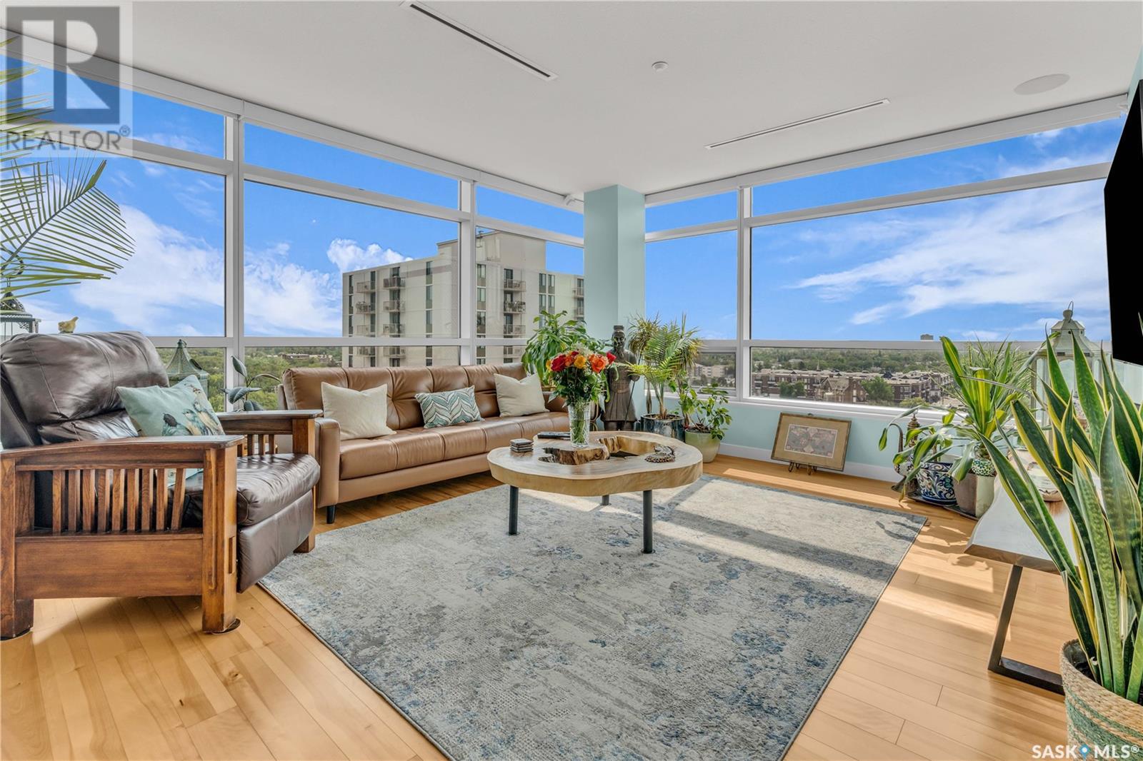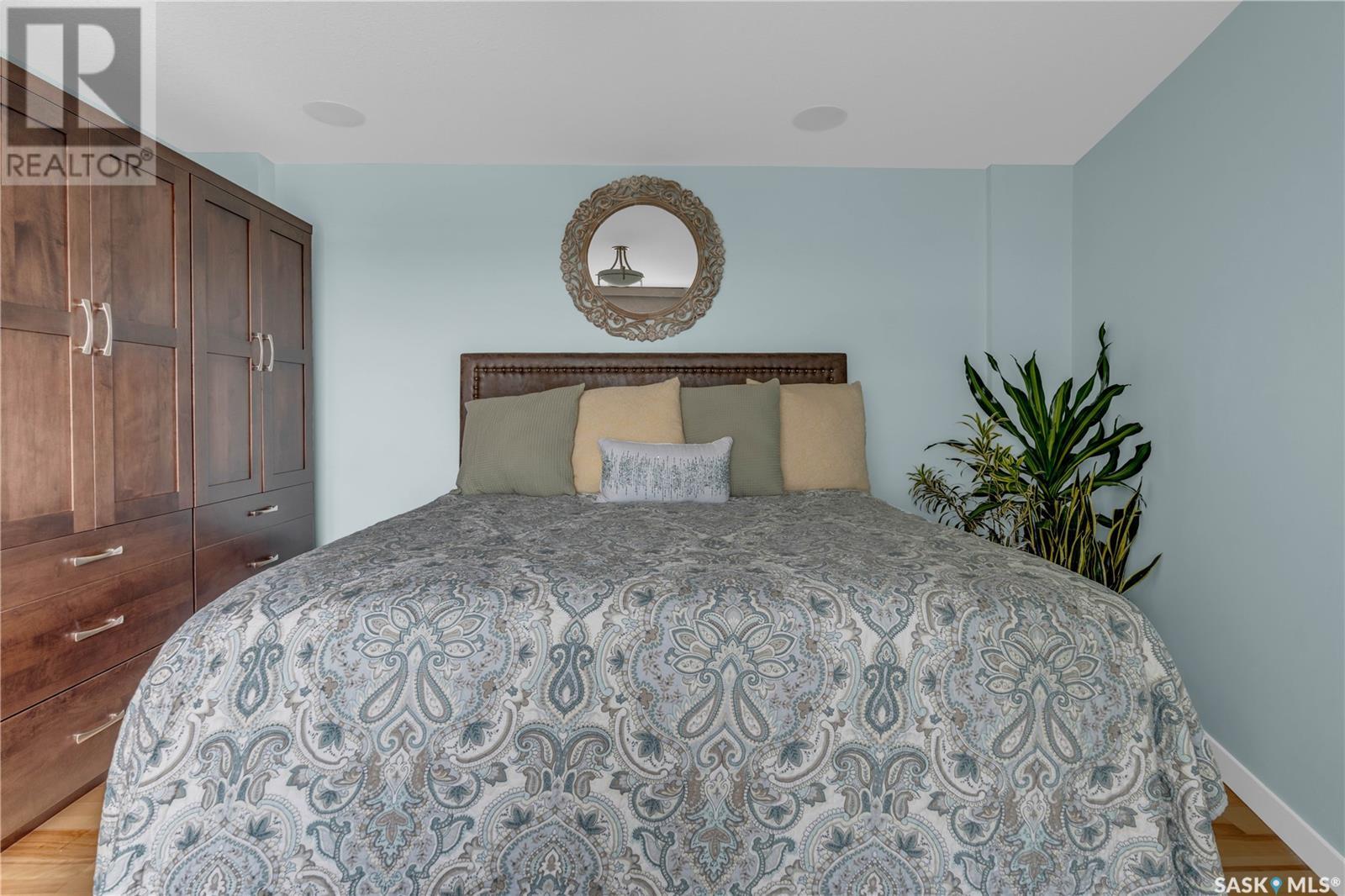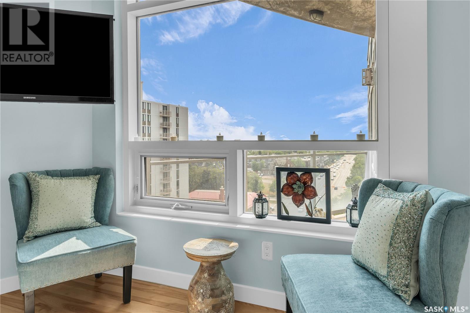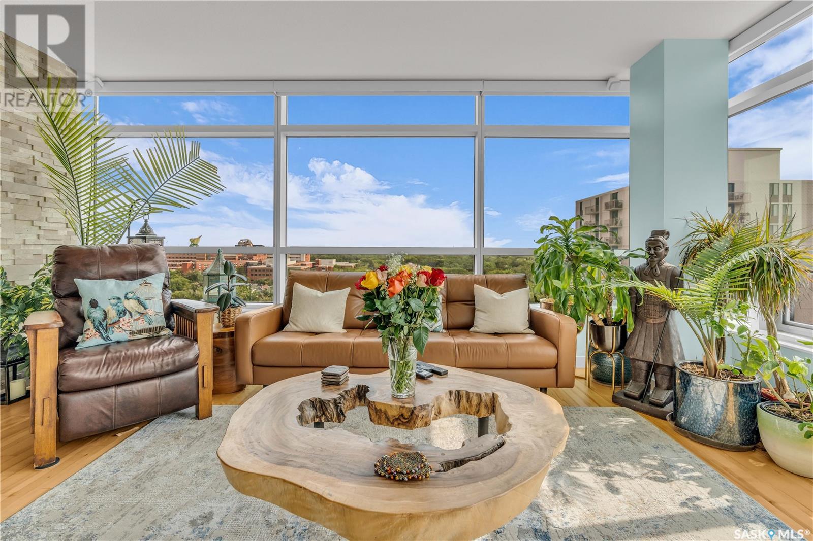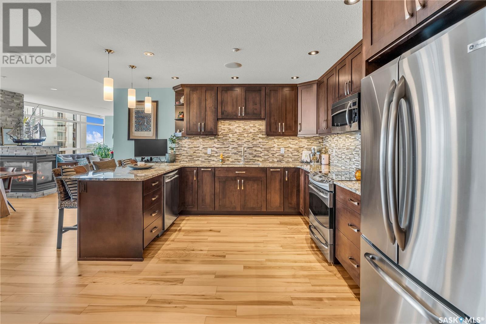 Welcome to 904 - 2300 Broad Street. This exceptional residence offers a unique living experience with stunning views of Wascana Lake and the beautifully treed old town. Enjoy the changing seasons from nearly floor-to-ceiling windows on three walls, without ever needing to pick up a leaf or shovel snow. Inside, the home impresses with blonde oak flooring and heated tile throughout. The chef’s kitchen features floor-to-ceiling cabinets, granite countertops, mahogany solid wood cabinetry, dual porcelain sinks, and high-end appliances. The master bedroom boasts a floor-to-ceiling window facing Wascana Park, a generous space, a walk-in closet, and mahogany built-in wardrobes. The luxurious ensuite bathroom includes a tiled shower with multiple shower heads, heated tile floors, a large granite countertop with dual sinks, and mahogany cabinets. Don’t miss the large soaker tub with a tile surround. The second bedroom, with two walls of floor-to-ceiling windows overlooking a century-old tree canopy, offers ample space and built-in mahogany wardrobes. The secondary bathroom features heated tile floors, granite countertops, and a corner shower. The laundry room is also elegantly designed with a granite countertop and mahogany cabinets. All blinds are remote-operated for automatic opening and closing, with blackout blinds in both bedrooms. The living space, the heart of this home, is enhanced by a sandstone three-sided fireplace and is surrounded by natural light. Built-in surround sound allows you to enjoy your favorite music or TV shows, whether you're relaxing in the soaker tub or in the living room. Additionally, an executive office/den is conveniently located just off the kitchen, featuring dual sliding doors. Comfort is further enhanced with an in-suite air exchange and humidity control system. The custom-tiled deck facing Wascana Park is perfect for enjoying your morning coffee while watching the sunrise. This property also includes two generous parking stalls! (id:22211)