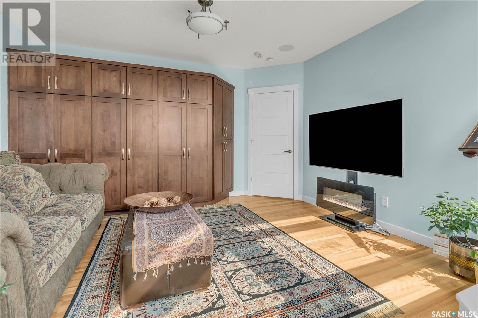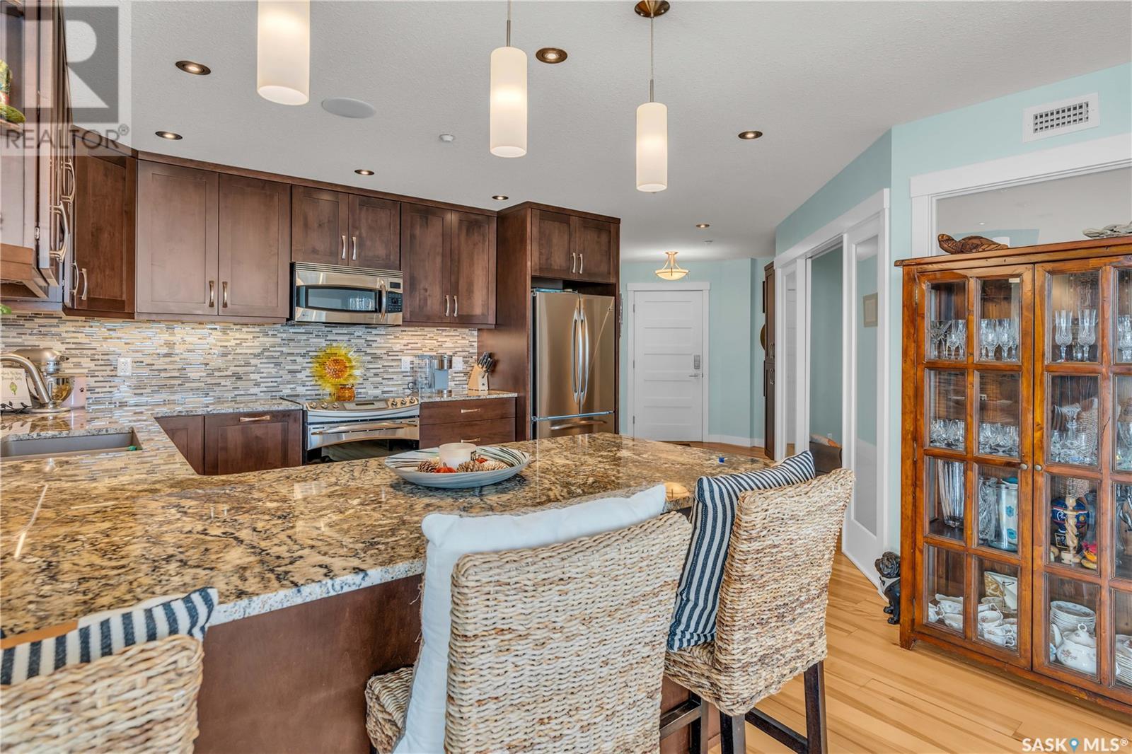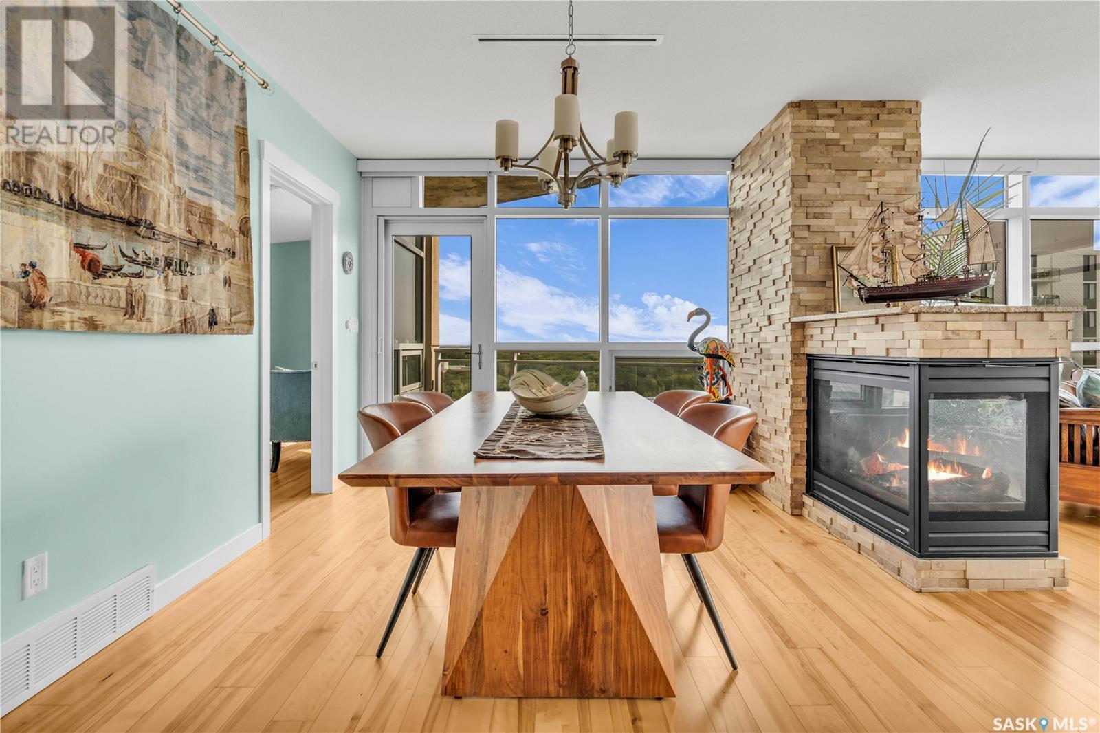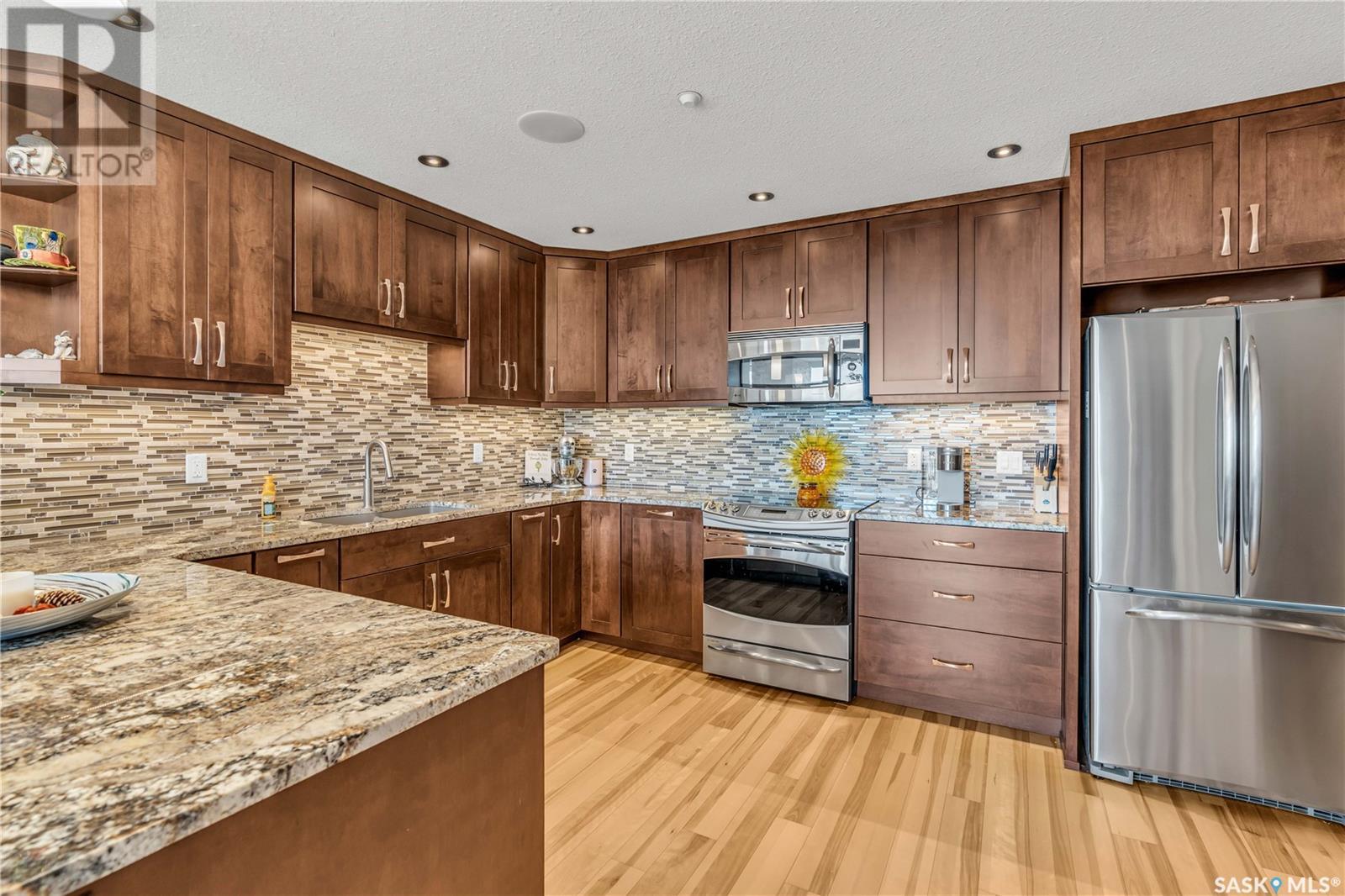 Welcome to 904 - 2300 Broad Street. This exceptional residence offers a unique living experience with stunning views of Wascana Lake and the beautifully treed old town. Enjoy the changing seasons from nearly floor-to-ceiling windows on three walls, without ever needing to pick up a leaf or shovel snow. Inside, the home impresses with blonde oak flooring and heated tile throughout. The chef’s kitchen features floor-to-ceiling cabinets, granite countertops, mahogany solid wood cabinetry, dual porcelain sinks, and high-end appliances. The master bedroom boasts a floor-to-ceiling window facing Wascana Park, a generous space, a walk-in closet, and mahogany built-in wardrobes. The luxurious ensuite bathroom includes a tiled shower with multiple shower heads, heated tile floors, a large granite countertop with dual sinks, and mahogany cabinets. Don’t miss the large soaker tub with a tile surround. The second bedroom, with two walls of floor-to-ceiling windows overlooking a century-old tree canopy, offers ample space and built-in mahogany wardrobes. The secondary bathroom features heated tile floors, granite countertops, and a corner shower. The laundry room is also elegantly designed with a granite countertop and mahogany cabinets. All blinds are remote-operated for automatic opening and closing, with blackout blinds in both bedrooms. The living space, the heart of this home, is enhanced by a sandstone three-sided fireplace and is surrounded by natural light. Built-in surround sound allows you to enjoy your favorite music or TV shows, whether you're relaxing in the soaker tub or in the living room. Additionally, an executive office/den is conveniently located just off the kitchen, featuring dual sliding doors. Comfort is further enhanced with an in-suite air exchange and humidity control system. The custom-tiled deck facing Wascana Park is perfect for enjoying your morning coffee while watching the sunrise. This property also includes two generous parking stalls! (id:22211)