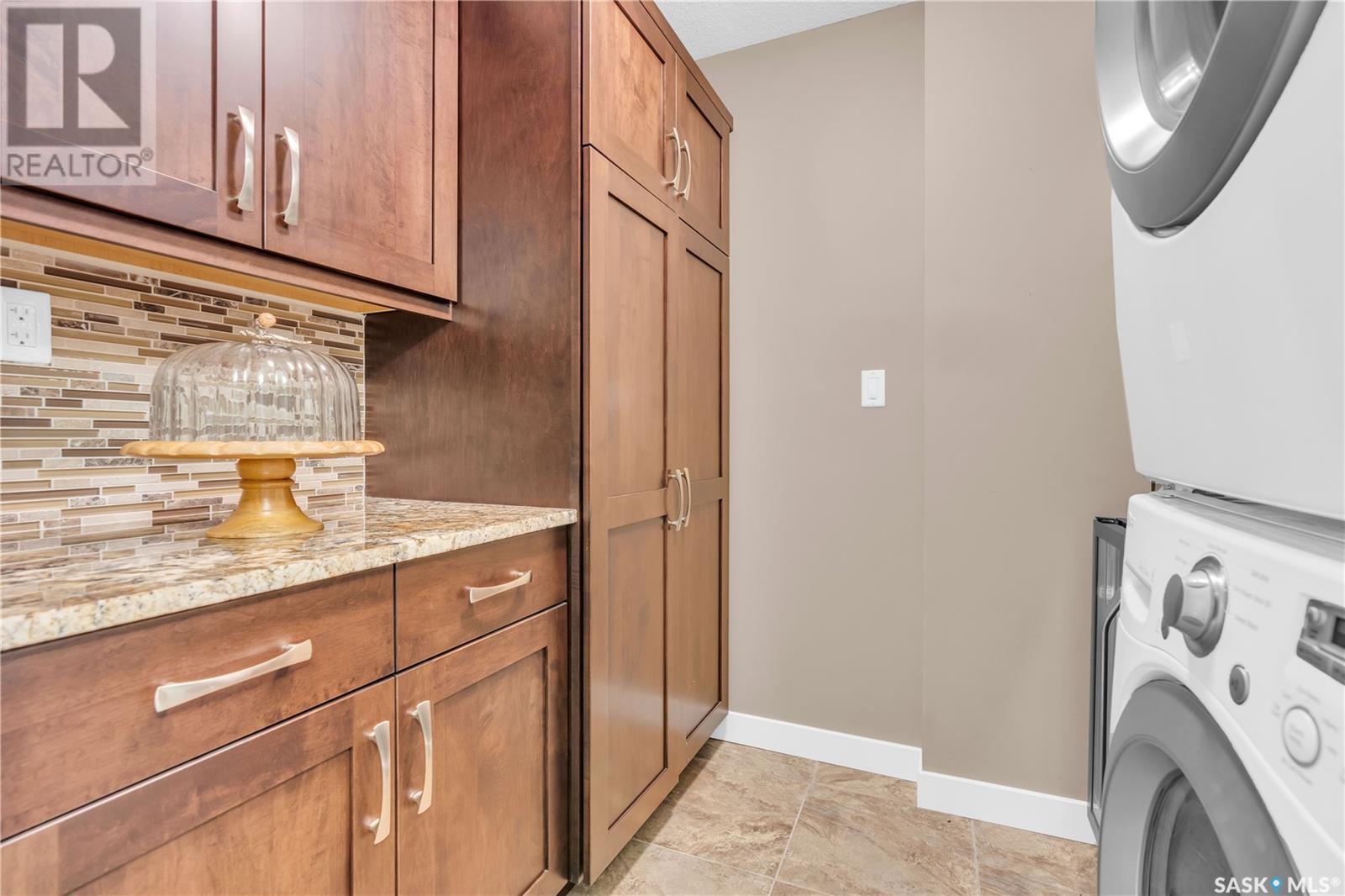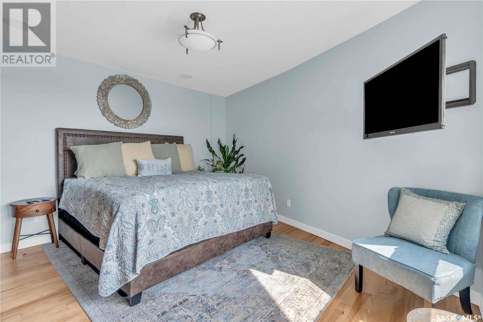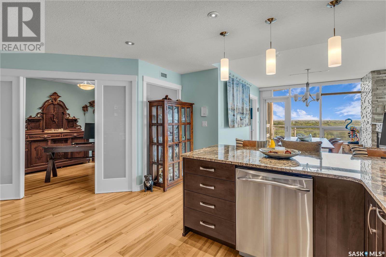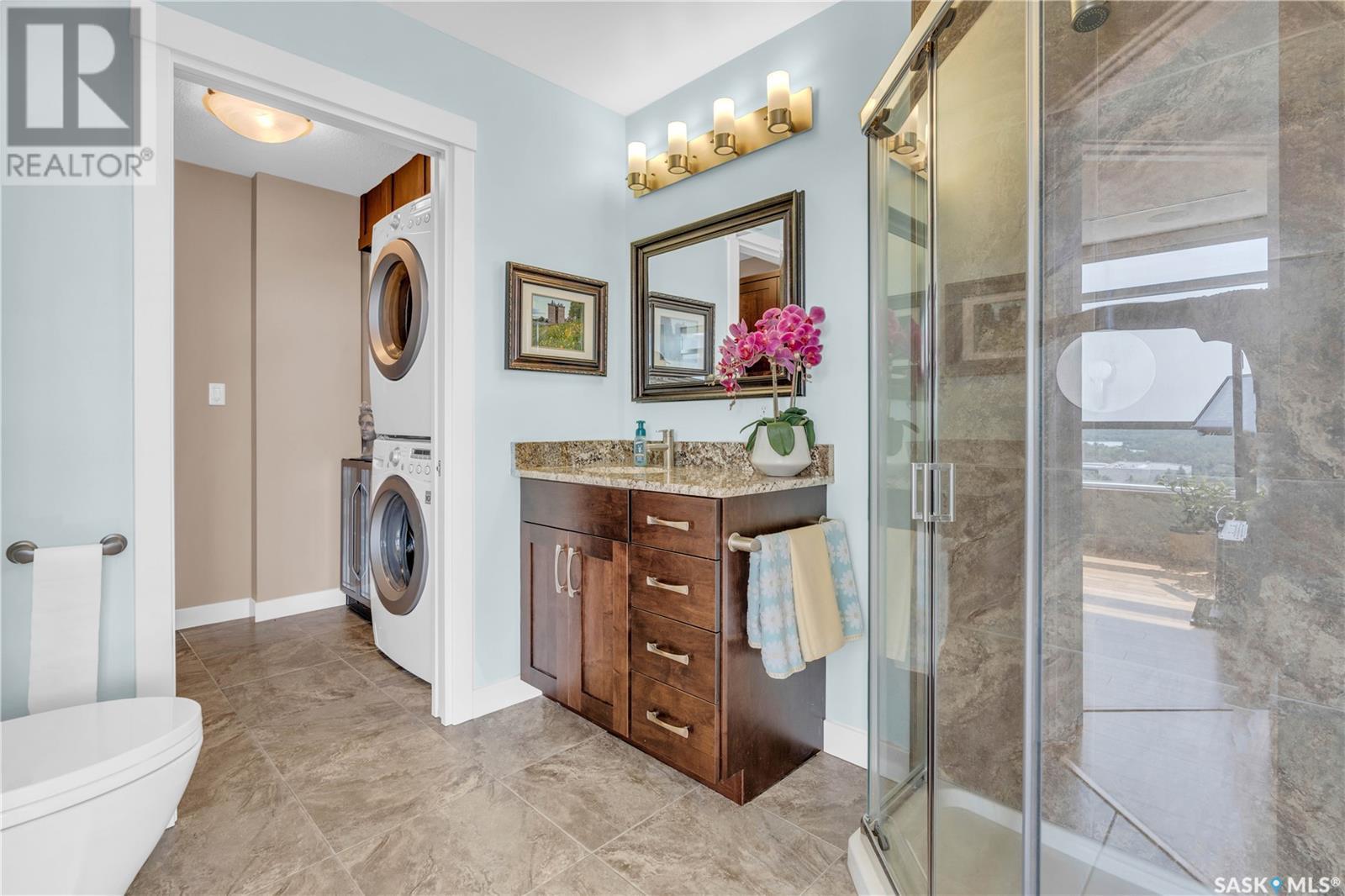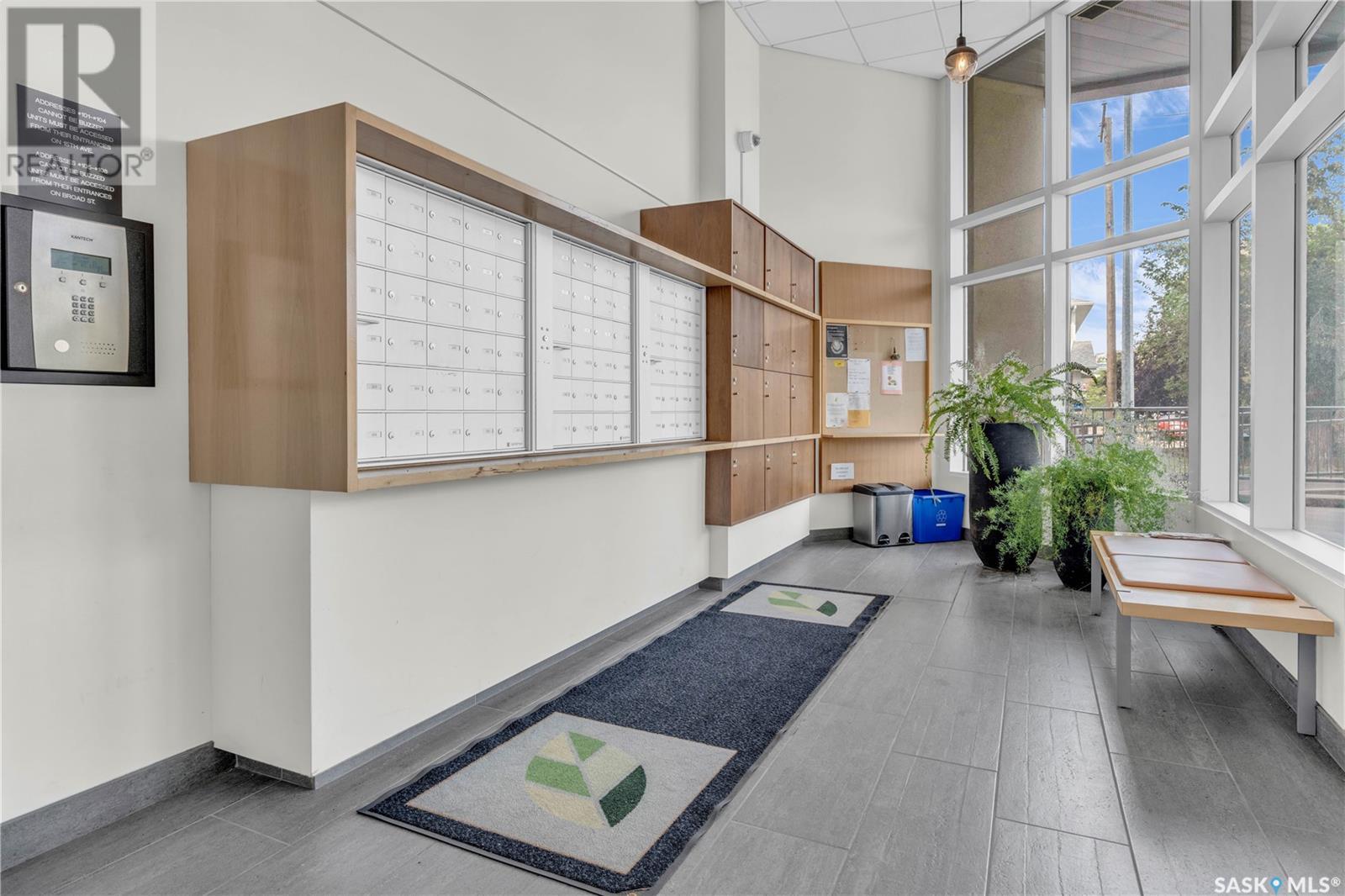 Welcome to 904 - 2300 Broad Street. This exceptional residence offers a unique living experience with stunning views of Wascana Lake and the beautifully treed old town. Enjoy the changing seasons from nearly floor-to-ceiling windows on three walls, without ever needing to pick up a leaf or shovel snow. Inside, the home impresses with blonde oak flooring and heated tile throughout. The chef’s kitchen features floor-to-ceiling cabinets, granite countertops, mahogany solid wood cabinetry, dual porcelain sinks, and high-end appliances. The master bedroom boasts a floor-to-ceiling window facing Wascana Park, a generous space, a walk-in closet, and mahogany built-in wardrobes. The luxurious ensuite bathroom includes a tiled shower with multiple shower heads, heated tile floors, a large granite countertop with dual sinks, and mahogany cabinets. Don’t miss the large soaker tub with a tile surround. The second bedroom, with two walls of floor-to-ceiling windows overlooking a century-old tree canopy, offers ample space and built-in mahogany wardrobes. The secondary bathroom features heated tile floors, granite countertops, and a corner shower. The laundry room is also elegantly designed with a granite countertop and mahogany cabinets. All blinds are remote-operated for automatic opening and closing, with blackout blinds in both bedrooms. The living space, the heart of this home, is enhanced by a sandstone three-sided fireplace and is surrounded by natural light. Built-in surround sound allows you to enjoy your favorite music or TV shows, whether you're relaxing in the soaker tub or in the living room. Additionally, an executive office/den is conveniently located just off the kitchen, featuring dual sliding doors. Comfort is further enhanced with an in-suite air exchange and humidity control system. The custom-tiled deck facing Wascana Park is perfect for enjoying your morning coffee while watching the sunrise. This property also includes two generous parking stalls! (id:22211)