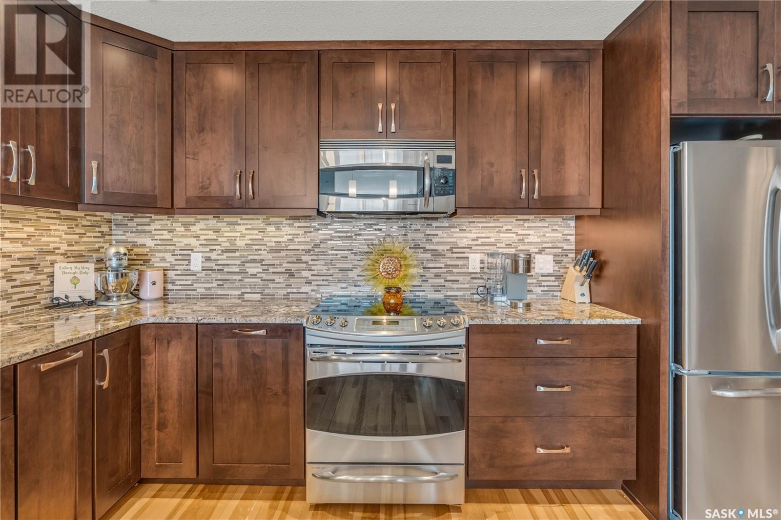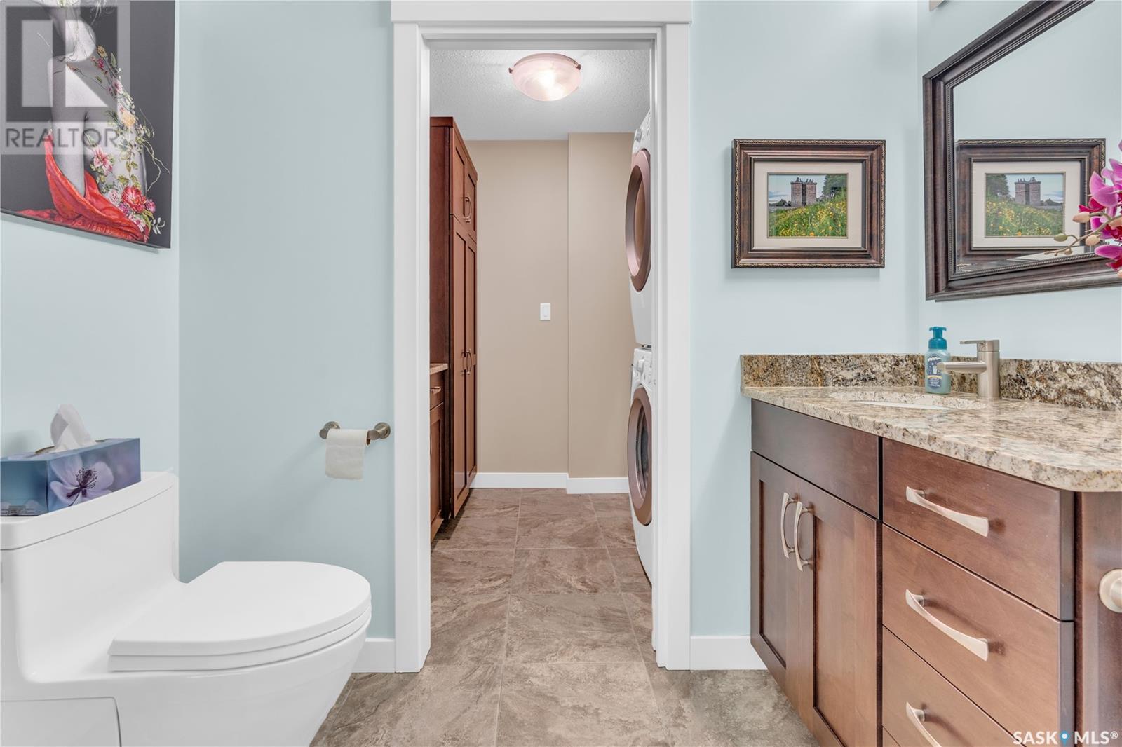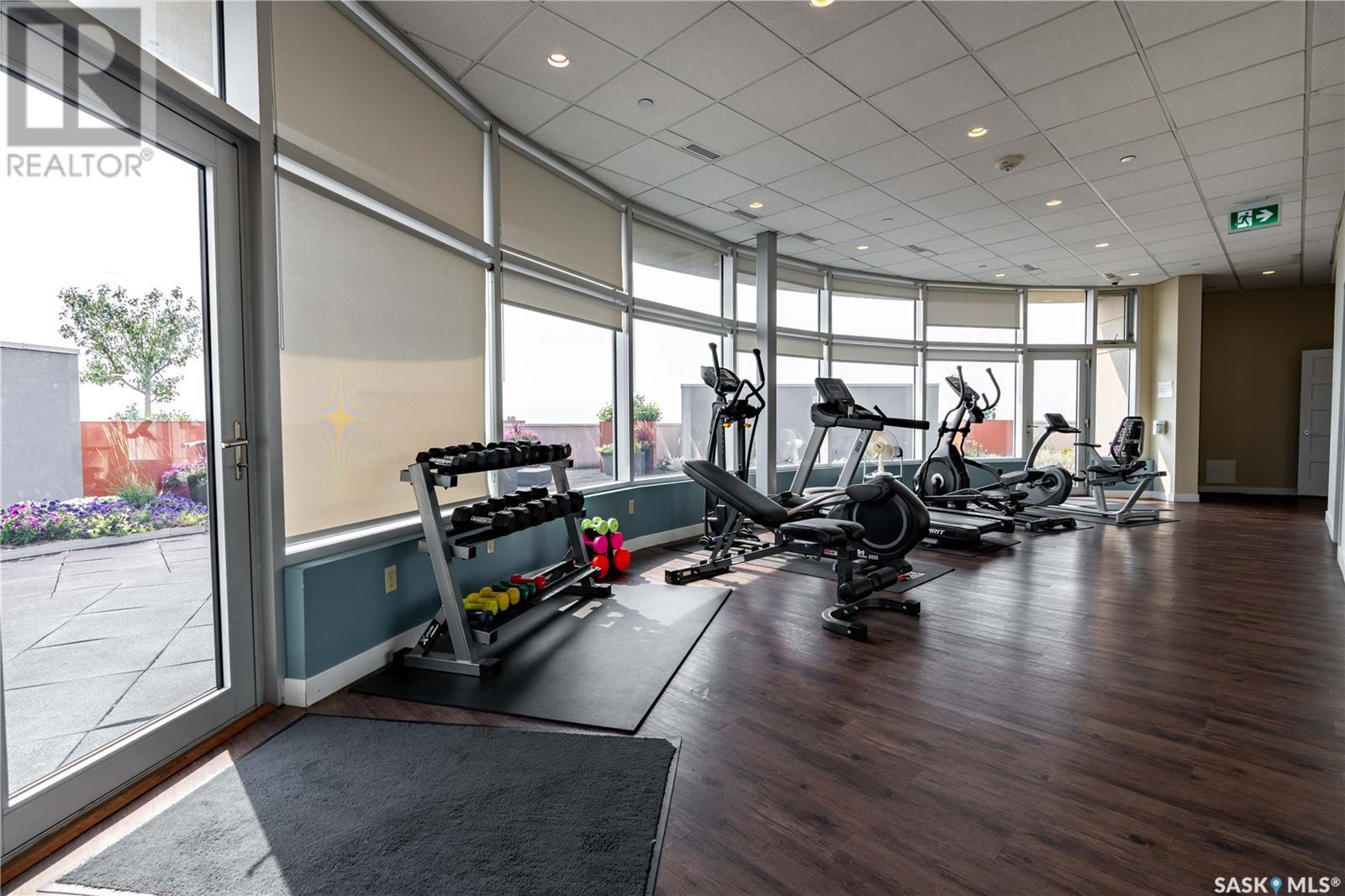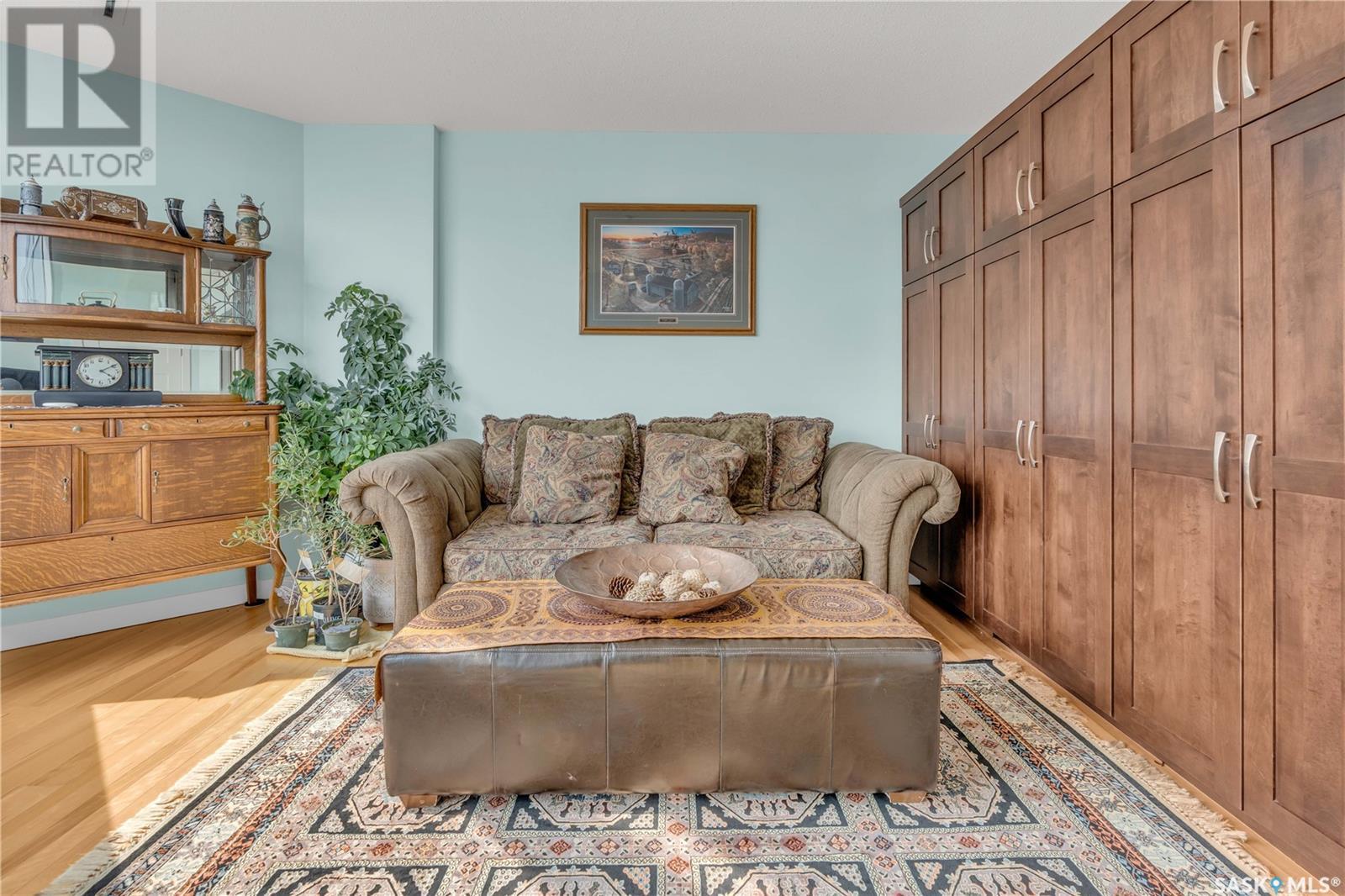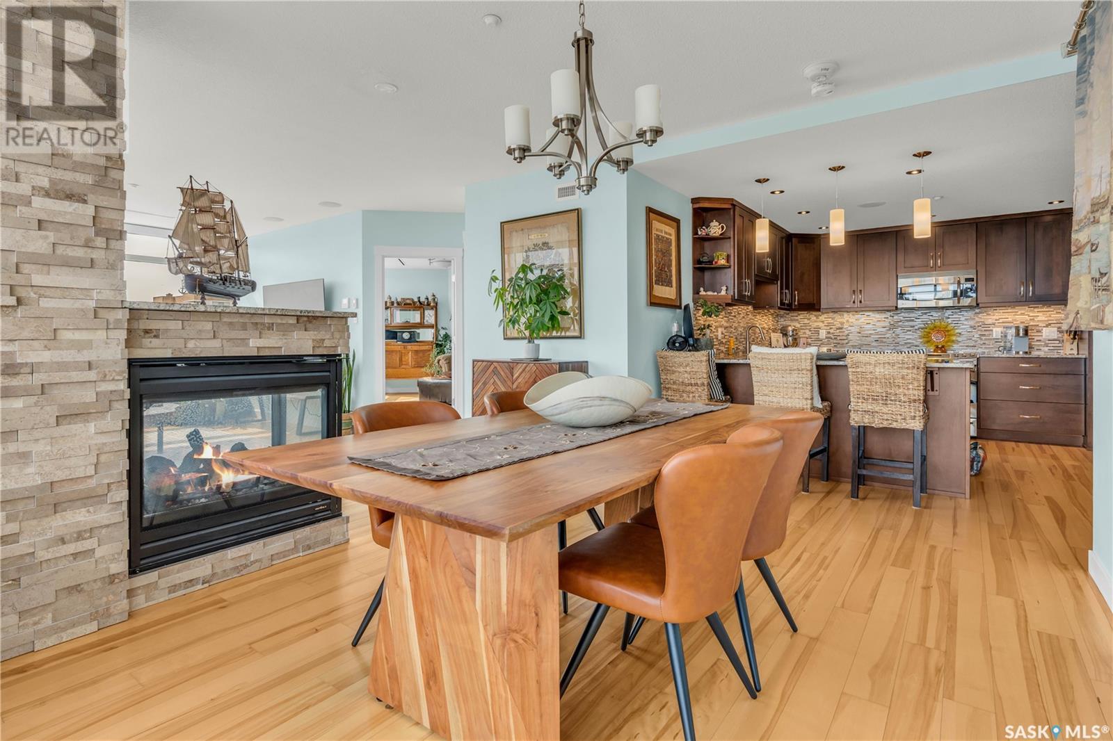 Welcome to 904 - 2300 Broad Street. This exceptional residence offers a unique living experience with stunning views of Wascana Lake and the beautifully treed old town. Enjoy the changing seasons from nearly floor-to-ceiling windows on three walls, without ever needing to pick up a leaf or shovel snow. Inside, the home impresses with blonde oak flooring and heated tile throughout. The chef’s kitchen features floor-to-ceiling cabinets, granite countertops, mahogany solid wood cabinetry, dual porcelain sinks, and high-end appliances. The master bedroom boasts a floor-to-ceiling window facing Wascana Park, a generous space, a walk-in closet, and mahogany built-in wardrobes. The luxurious ensuite bathroom includes a tiled shower with multiple shower heads, heated tile floors, a large granite countertop with dual sinks, and mahogany cabinets. Don’t miss the large soaker tub with a tile surround. The second bedroom, with two walls of floor-to-ceiling windows overlooking a century-old tree canopy, offers ample space and built-in mahogany wardrobes. The secondary bathroom features heated tile floors, granite countertops, and a corner shower. The laundry room is also elegantly designed with a granite countertop and mahogany cabinets. All blinds are remote-operated for automatic opening and closing, with blackout blinds in both bedrooms. The living space, the heart of this home, is enhanced by a sandstone three-sided fireplace and is surrounded by natural light. Built-in surround sound allows you to enjoy your favorite music or TV shows, whether you're relaxing in the soaker tub or in the living room. Additionally, an executive office/den is conveniently located just off the kitchen, featuring dual sliding doors. Comfort is further enhanced with an in-suite air exchange and humidity control system. The custom-tiled deck facing Wascana Park is perfect for enjoying your morning coffee while watching the sunrise. This property also includes two generous parking stalls! (id:22211)