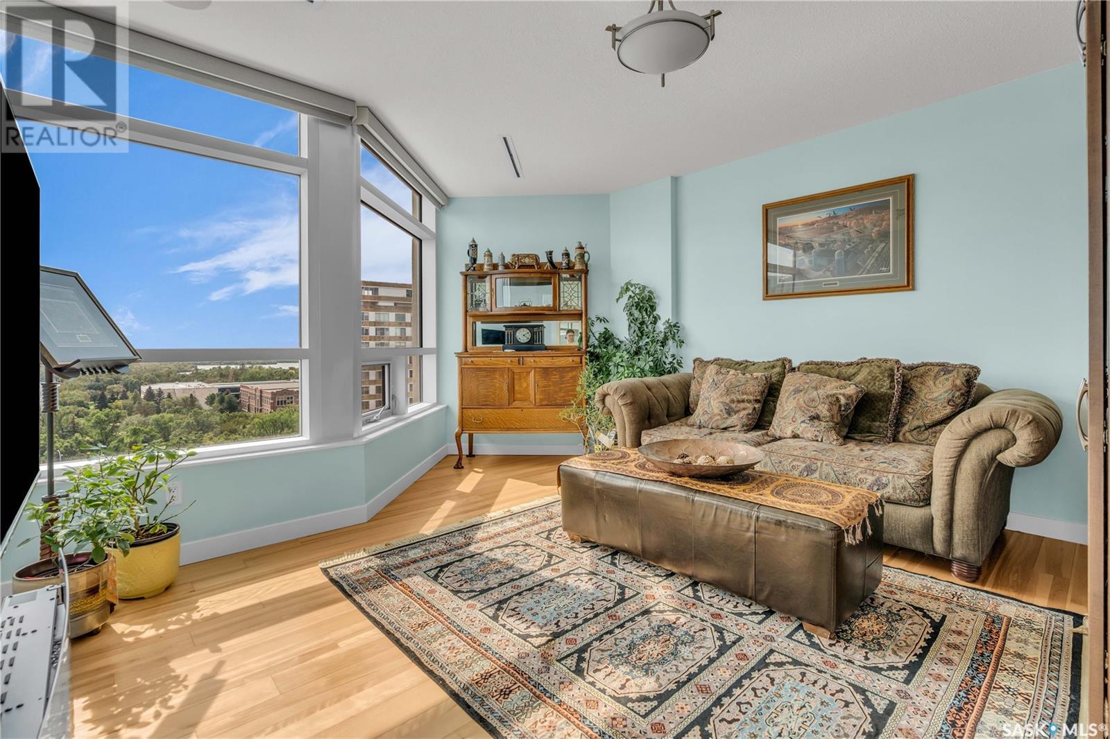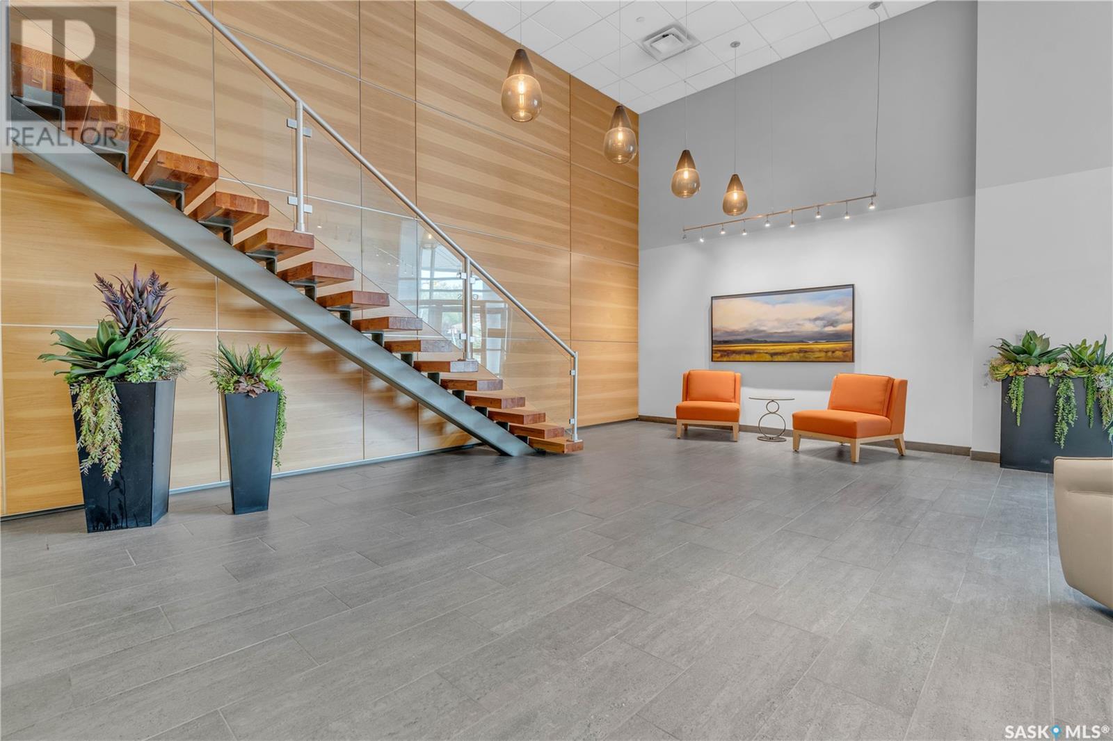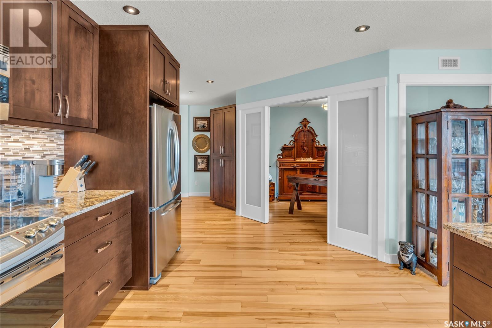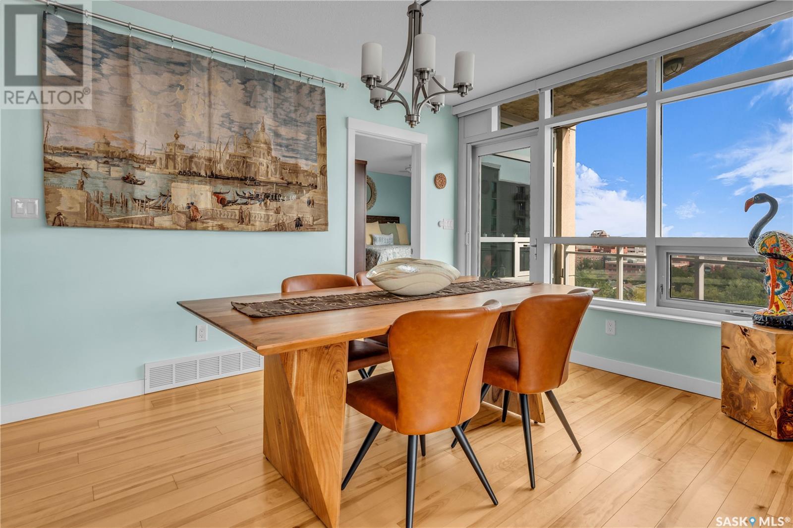 Welcome to 904 - 2300 Broad Street. This exceptional residence offers a unique living experience with stunning views of Wascana Lake and the beautifully treed old town. Enjoy the changing seasons from nearly floor-to-ceiling windows on three walls, without ever needing to pick up a leaf or shovel snow. Inside, the home impresses with blonde oak flooring and heated tile throughout. The chef’s kitchen features floor-to-ceiling cabinets, granite countertops, mahogany solid wood cabinetry, dual porcelain sinks, and high-end appliances. The master bedroom boasts a floor-to-ceiling window facing Wascana Park, a generous space, a walk-in closet, and mahogany built-in wardrobes. The luxurious ensuite bathroom includes a tiled shower with multiple shower heads, heated tile floors, a large granite countertop with dual sinks, and mahogany cabinets. Don’t miss the large soaker tub with a tile surround. The second bedroom, with two walls of floor-to-ceiling windows overlooking a century-old tree canopy, offers ample space and built-in mahogany wardrobes. The secondary bathroom features heated tile floors, granite countertops, and a corner shower. The laundry room is also elegantly designed with a granite countertop and mahogany cabinets. All blinds are remote-operated for automatic opening and closing, with blackout blinds in both bedrooms. The living space, the heart of this home, is enhanced by a sandstone three-sided fireplace and is surrounded by natural light. Built-in surround sound allows you to enjoy your favorite music or TV shows, whether you're relaxing in the soaker tub or in the living room. Additionally, an executive office/den is conveniently located just off the kitchen, featuring dual sliding doors. Comfort is further enhanced with an in-suite air exchange and humidity control system. The custom-tiled deck facing Wascana Park is perfect for enjoying your morning coffee while watching the sunrise. This property also includes two generous parking stalls! (id:22211)