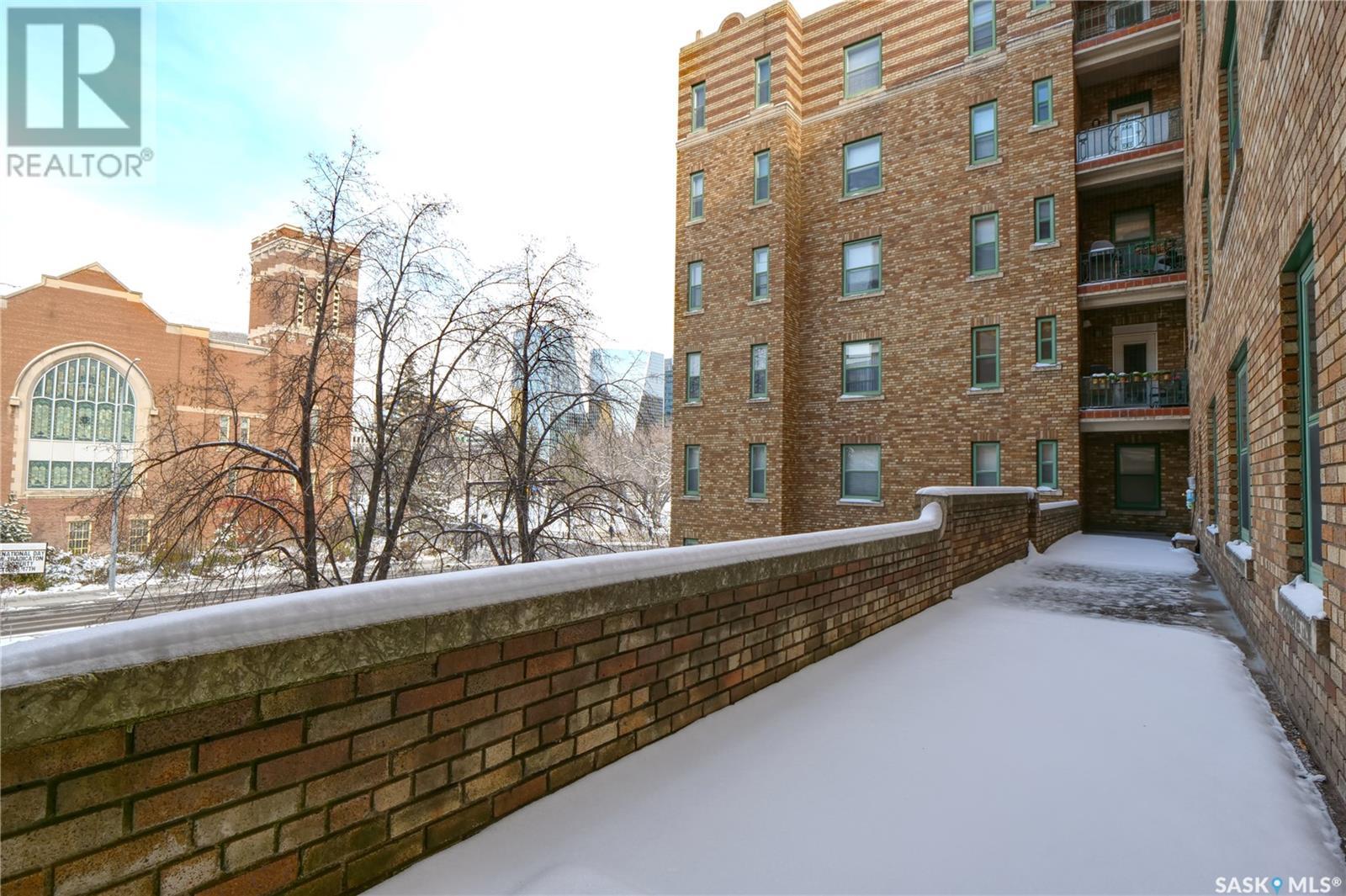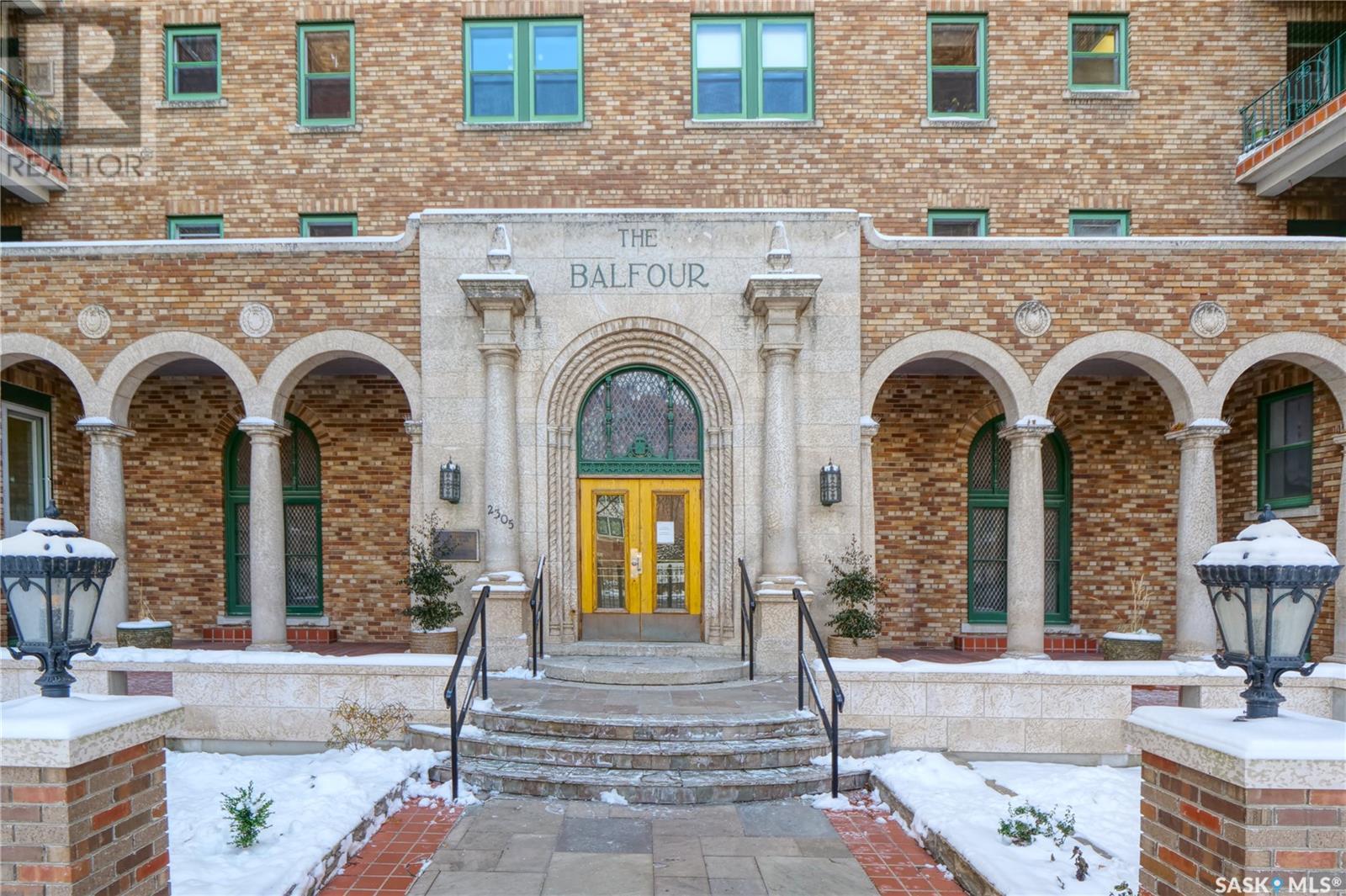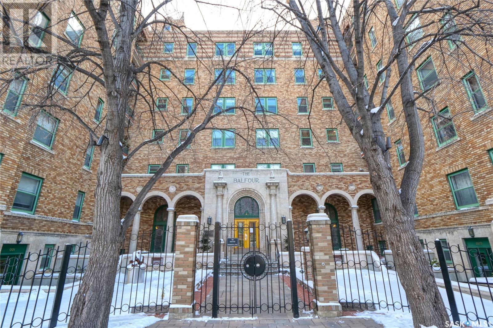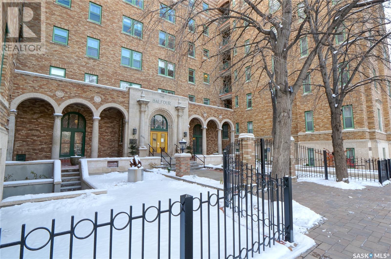 Welcome to The Balfour – an exceptional, historic art deco building in the heart of the city! The building's main gates open onto a manicured courtyard; a grand entrance and lobby; leading to the west wing where the elevator/staircase take you to the 2nd floor. Now,....the wow! Inside the condo, a sanctuary – bright, spacious living room (gorgeous hardwood floors, 12' ceilings, lg. windows), a perfectly designed galley kitchen (updated maple cabinetry, stainless appliances), a lovely bedroom, and a full updated bath (you’ll love the tiles!) presented with on-trend elements perfect for discerning Buyers! Life at the Balfour offers a large common area and outdoor patio w. gas BBQ (also available for rentals so entertain your guests in style); basement laundry, bike storage, storage locker, rental parking, beautifully maintained original style throughout! Great location: across from Victoria Park, downtown shops/dining/entertainment. Condo fees include: heat, water, reserve fund, exterior & interior maintenance, onsite building manager, landscaping, common insurance & more. Words fail to describe the ambiance of this must-see property. (id:22211)