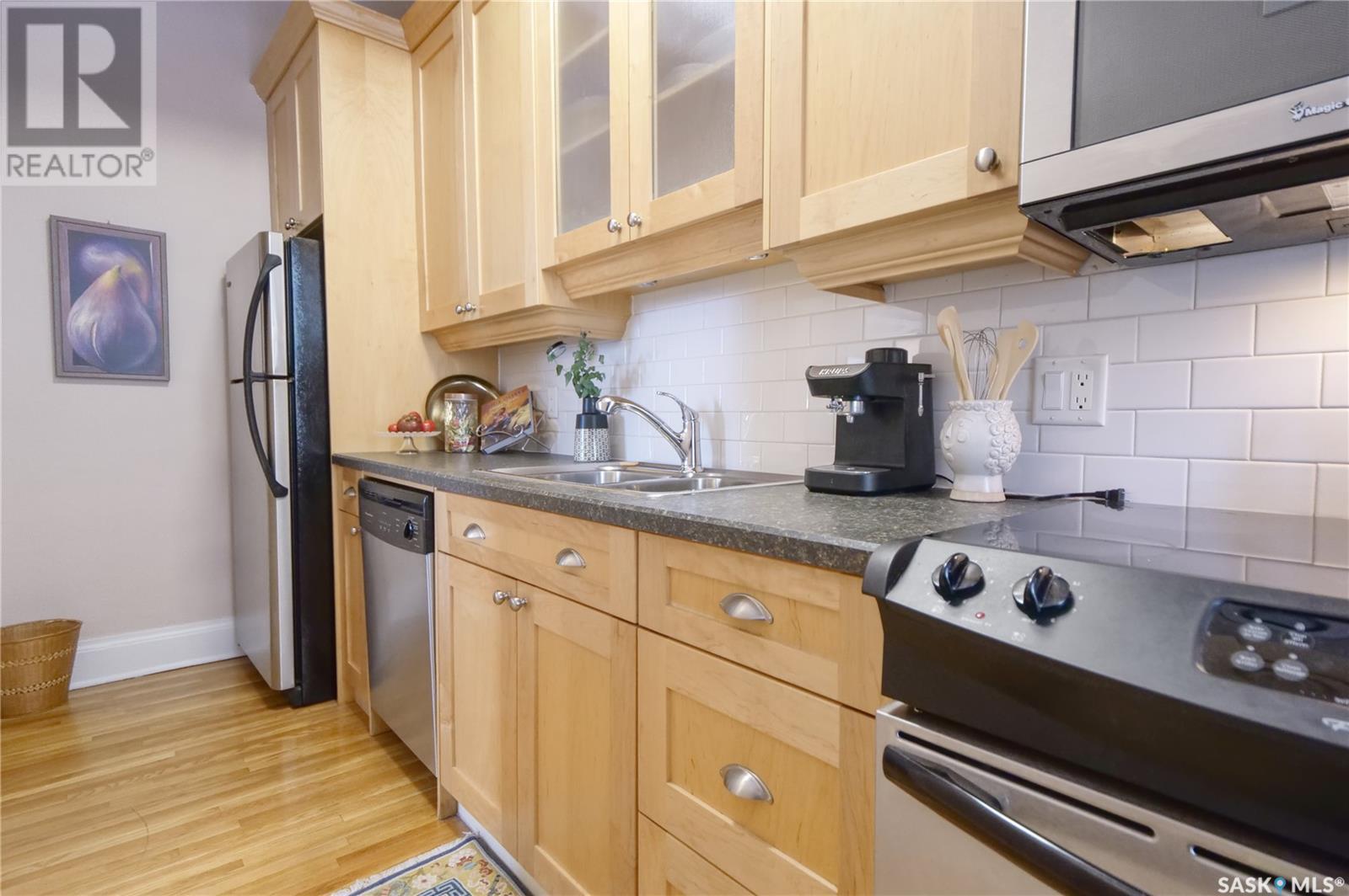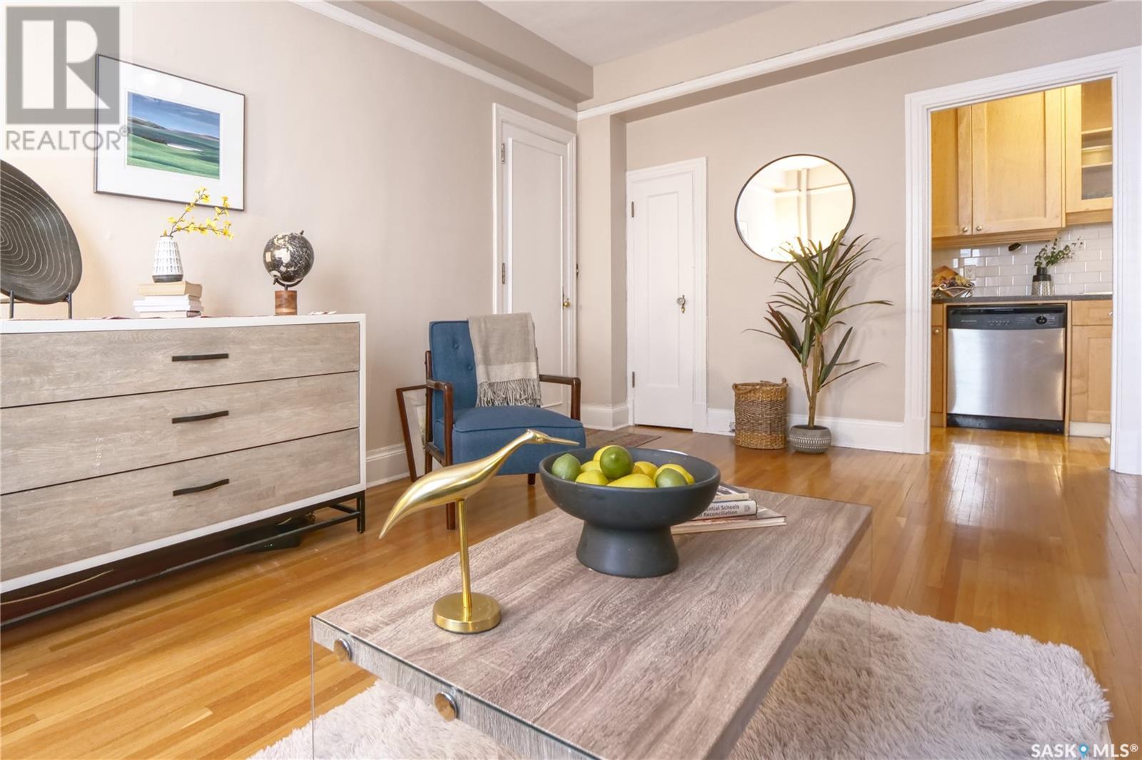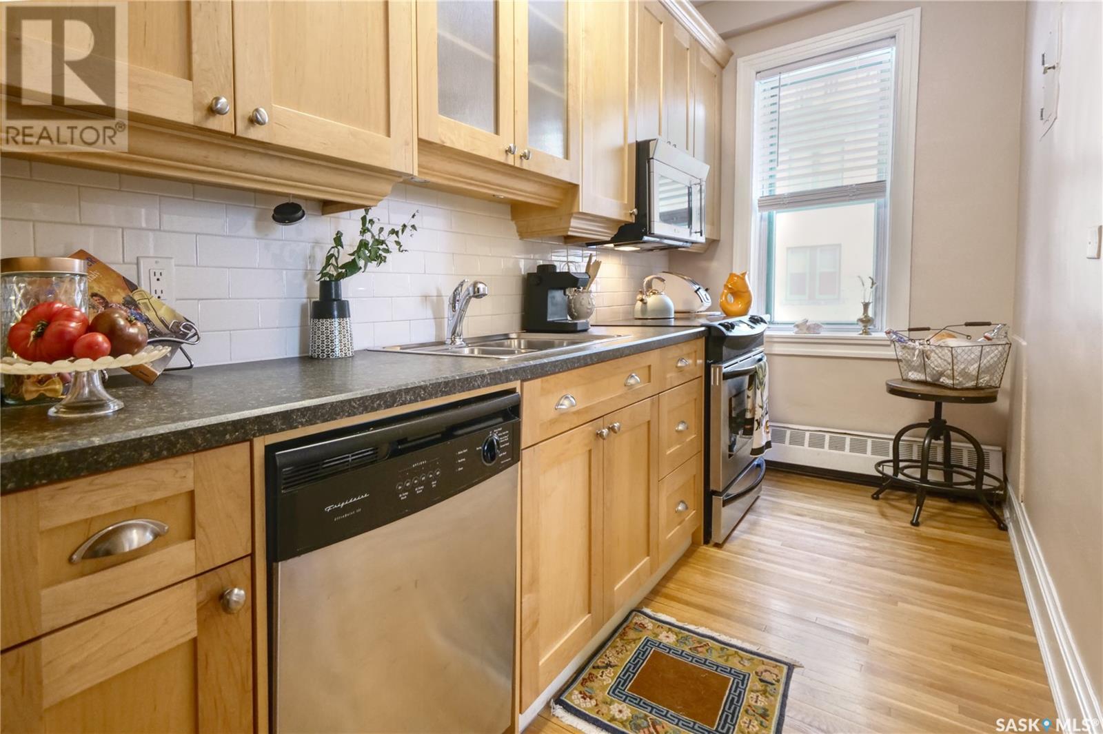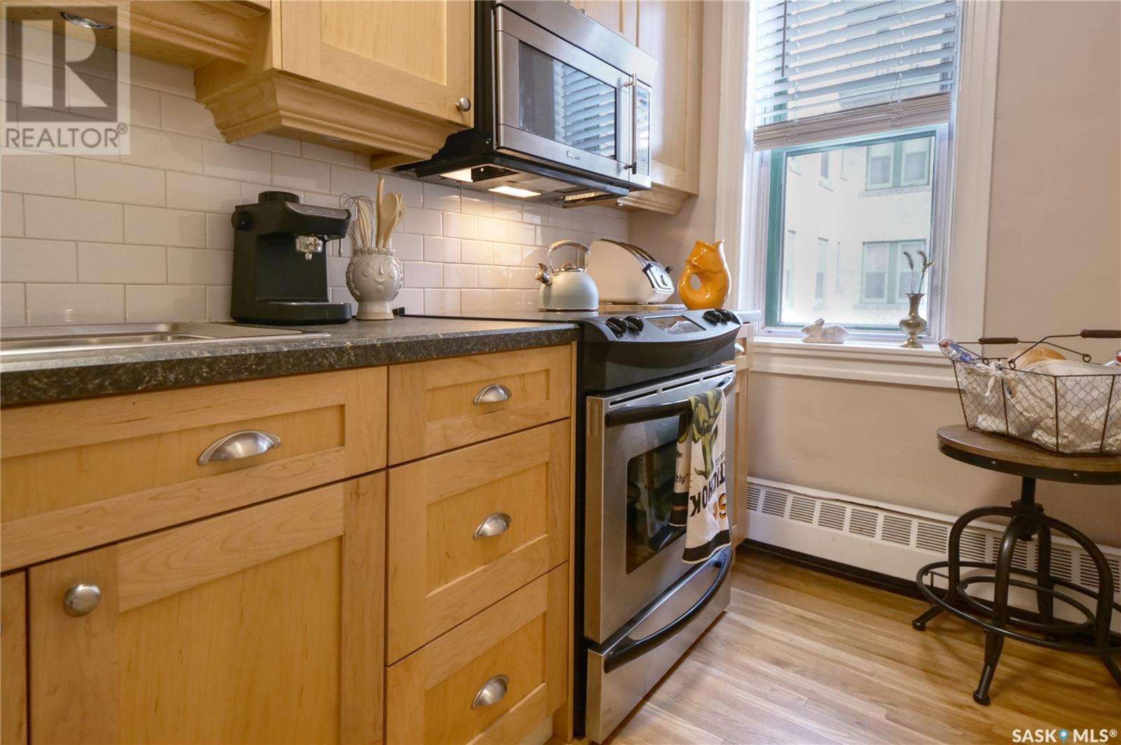 Welcome to The Balfour – an exceptional, historic art deco building in the heart of the city! The building's main gates open onto a manicured courtyard; a grand entrance and lobby; leading to the west wing where the elevator/staircase take you to the 2nd floor. Now,....the wow! Inside the condo, a sanctuary – bright, spacious living room (gorgeous hardwood floors, 12' ceilings, lg. windows), a perfectly designed galley kitchen (updated maple cabinetry, stainless appliances), a lovely bedroom, and a full updated bath (you’ll love the tiles!) presented with on-trend elements perfect for discerning Buyers! Life at the Balfour offers a large common area and outdoor patio w. gas BBQ (also available for rentals so entertain your guests in style); basement laundry, bike storage, storage locker, rental parking, beautifully maintained original style throughout! Great location: across from Victoria Park, downtown shops/dining/entertainment. Condo fees include: heat, water, reserve fund, exterior & interior maintenance, onsite building manager, landscaping, common insurance & more. Words fail to describe the ambiance of this must-see property. (id:22211)