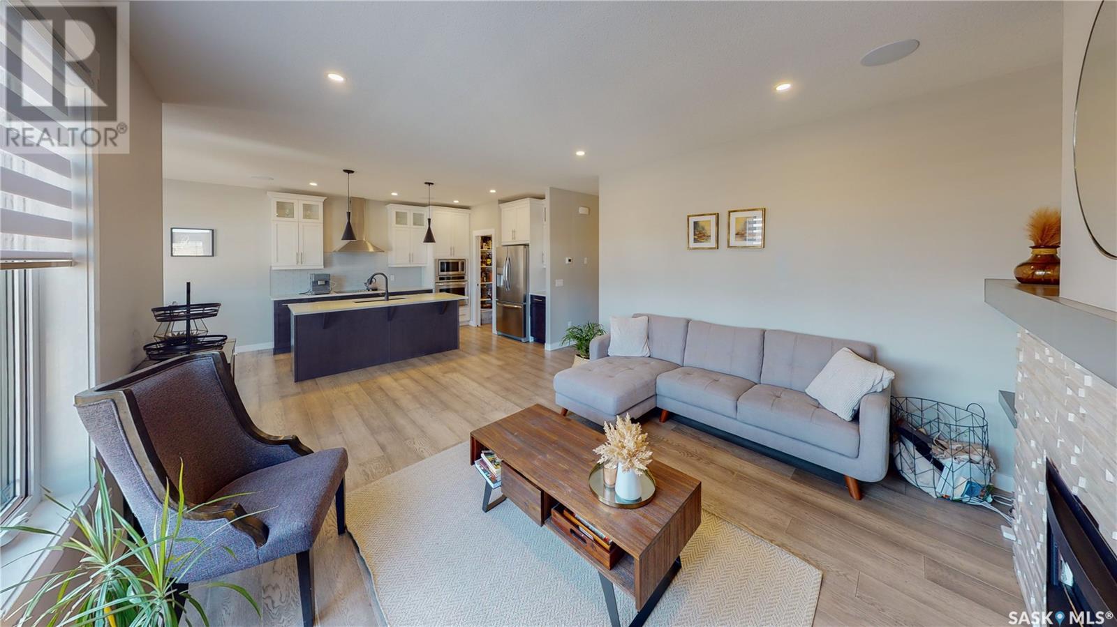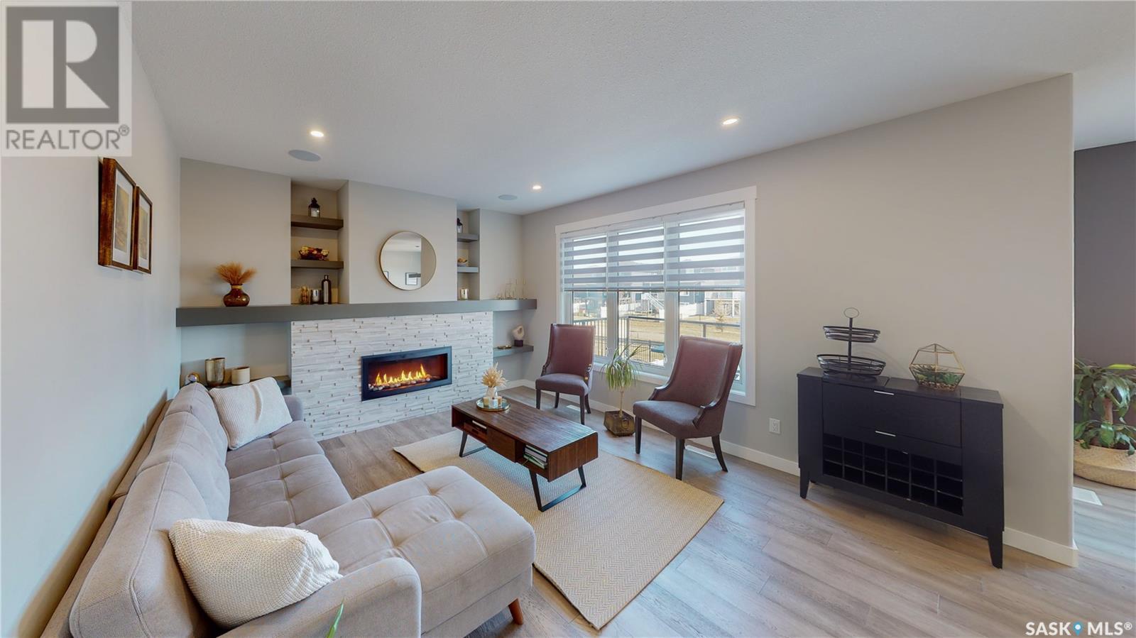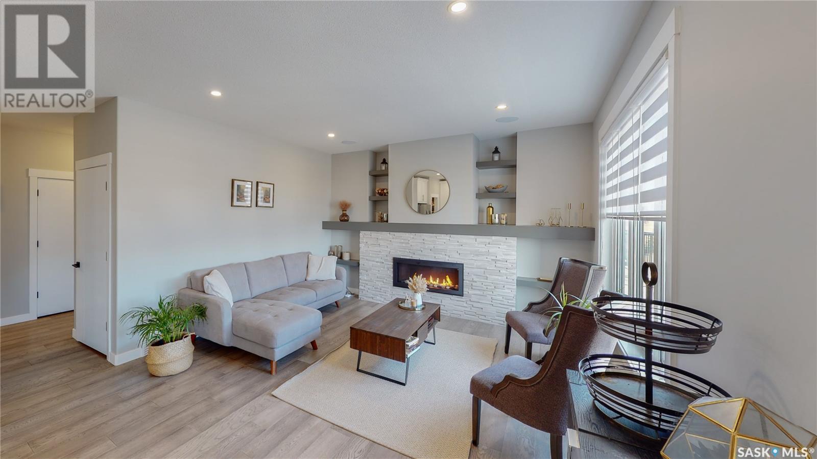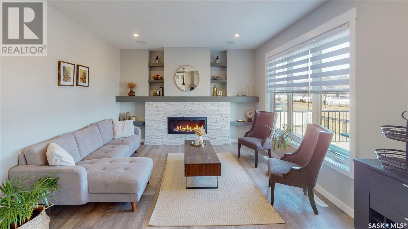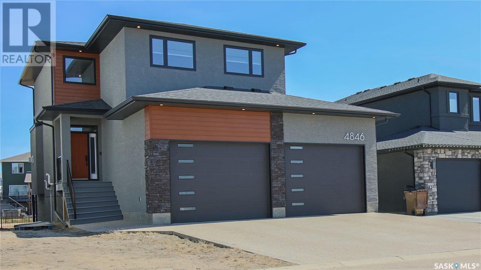 Looking for a beautifully crafted walk-out two-story home backing a walking path? Welcome to 4846 Greenview Cres E. in the very desirable neighborhood of the Greens On Gardiner. This Deveraux home built in 2018 generously offers 1918 sq ft (plus the basement) & is overflowing with space, warm natural light from the east exposure, & offers 5 bedrooms, 4 bathrooms, a bonus room, an oversized dbe garage & more! Upon entry, the foyer welcomes you into a large living room where a gas fireplace w’ stacked stone highlights a beautiful mantle, modern shelving & spacious design paired with the h-wood flooring. The area naturally opens to a lovely dining area with access to the patio. The kitchen offers quartz counters, upgraded cabinets, plenty of counter space, an eat-up island, & a walk-thru pantry that leads to a tiled mudroom w’ built-in cabinets (direct entry to garage). Completing the main floor is a 2 pc bath. Heading upstairs, the bonus room is such a versatile room – make it a playroom, a den, or simply stated - another sitting area to relax as you enjoy the beautiful sunshine. The primary bedroom is wonderfully designed with a walk thru closet leading to a spa-like ensuite with a soaker tub, shower, double quartz vanity & tiled flooring. Two additional bedrooms, another tiled full bath & an upstairs laundry room complete the 2nd level. The walk-out basement is fully developed with 2 more bedrooms, another full bath, a rec room, & utility/storage areas. The yard is open for your own ideas – plenty of room for a pool, trampoline, play structure, etc. It is partially fenced & backs the walking path that leads directly to the school & park area – fabulous for children to safely walk on their own. The location is superb - close to the popular & growing Acre 21 development featuring a grocery store, pharmacy, shopping, restaurants, clinics, & more! Walk for a coffee & enjoy all the paths & parks. Contact the sales professional to learn more. Immediate possession avail. (id:22211)