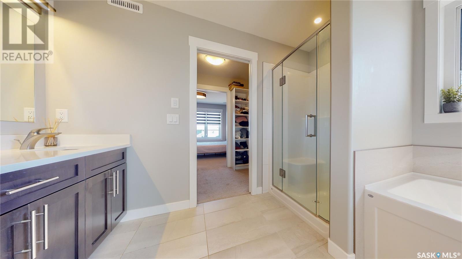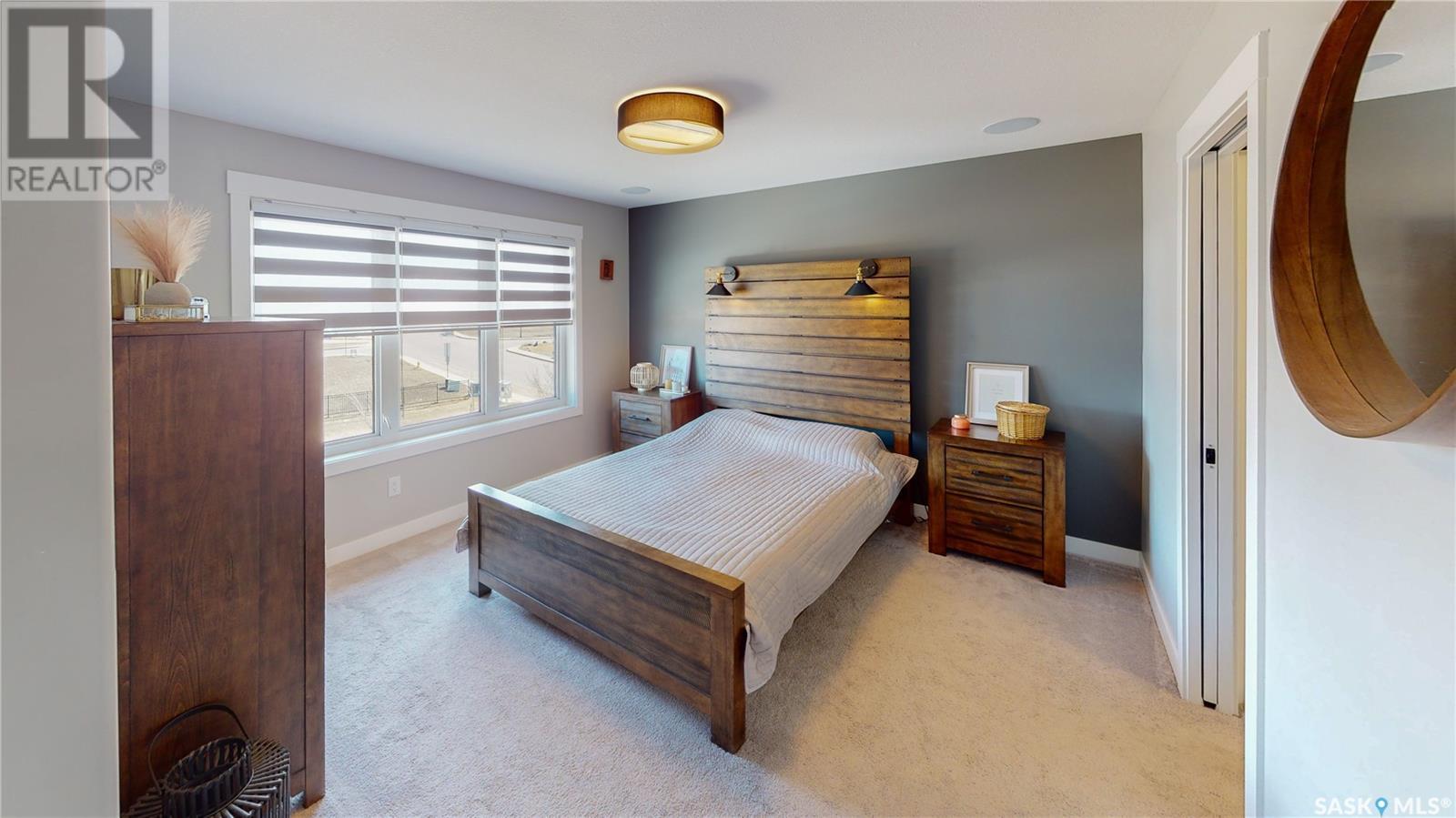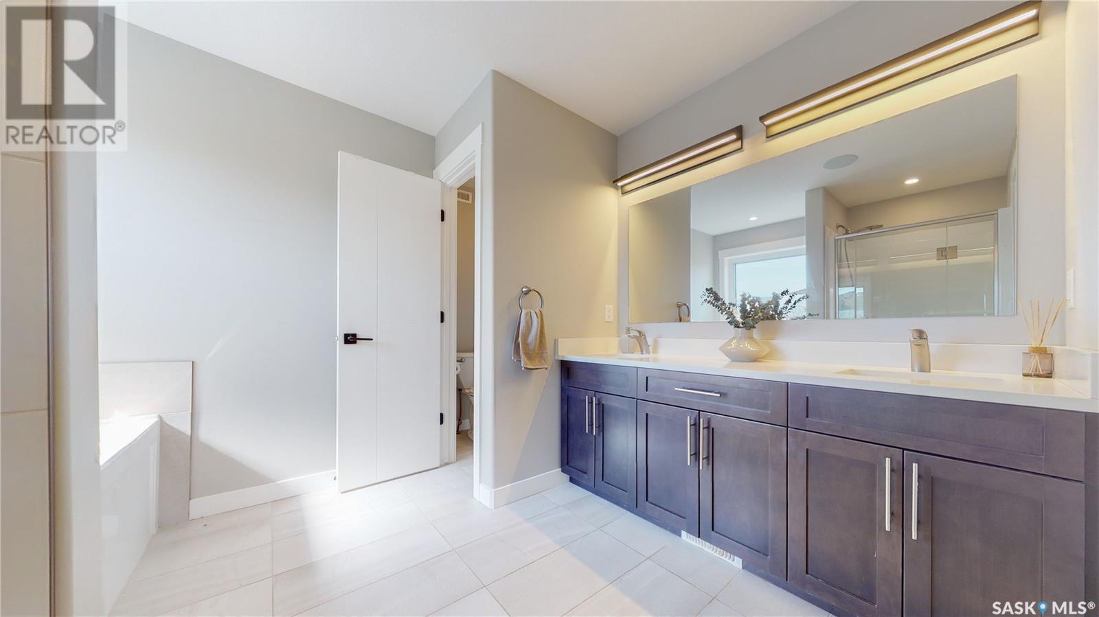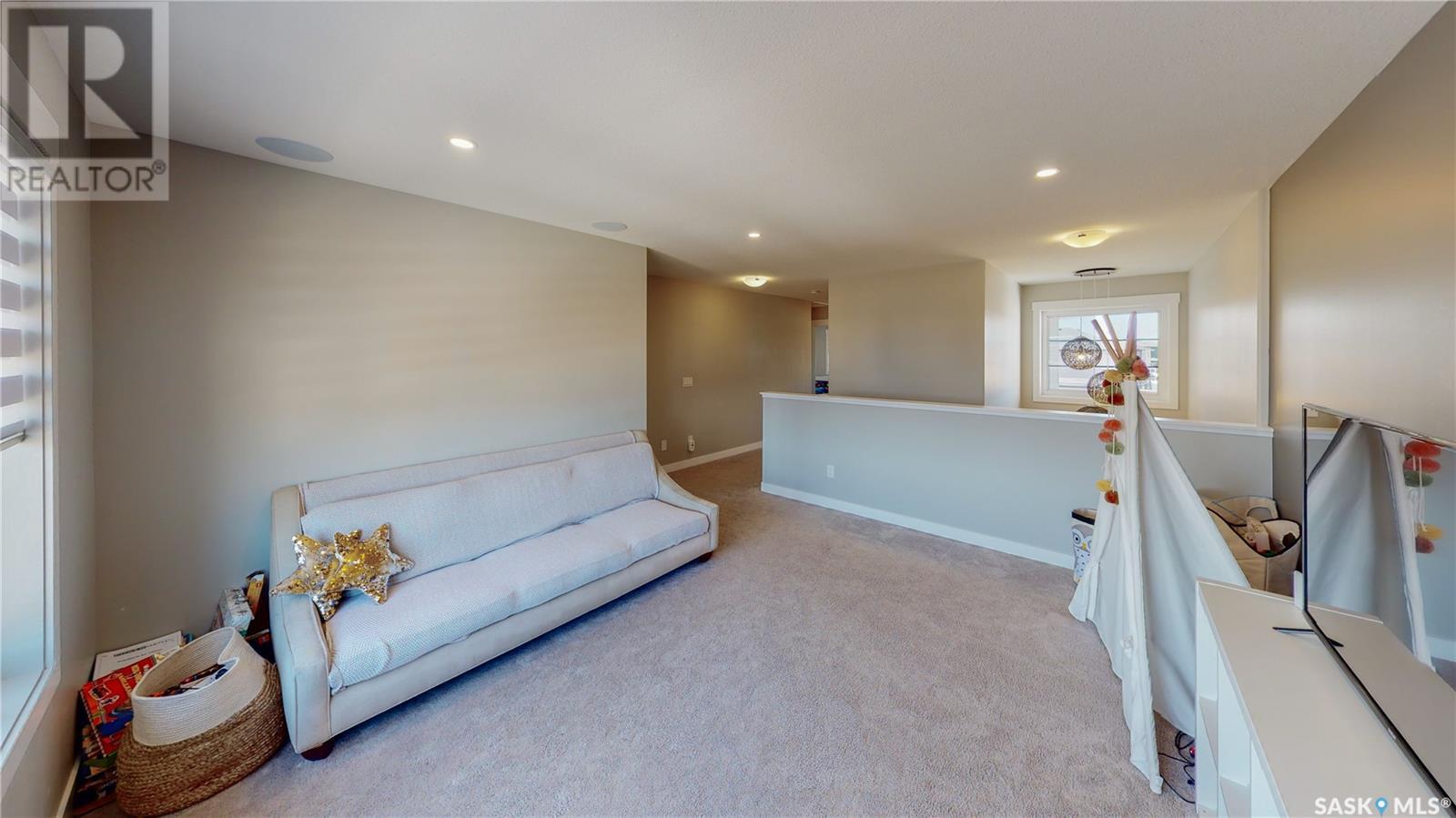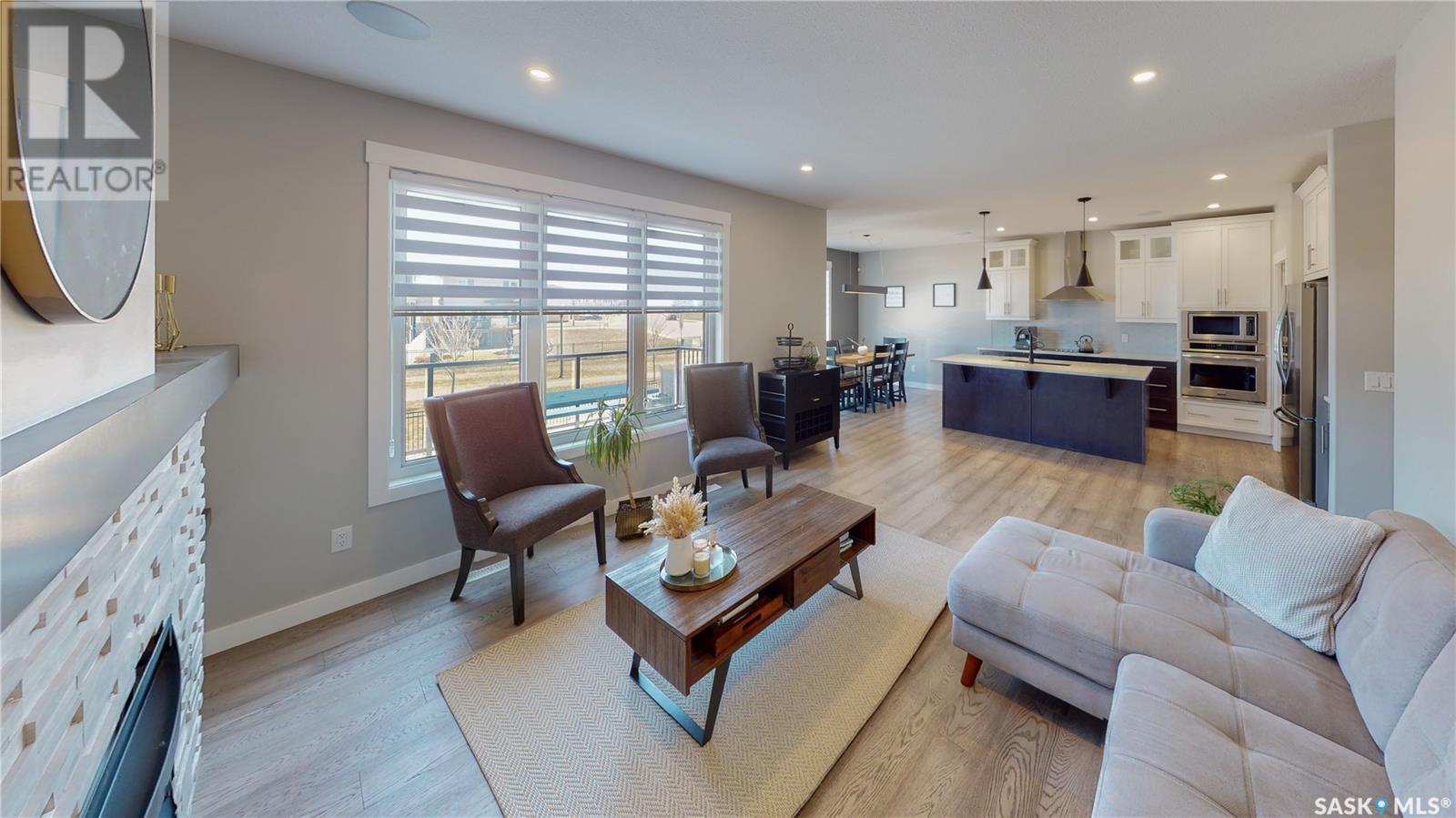 Looking for a beautifully crafted walk-out two-story home backing a walking path? Welcome to 4846 Greenview Cres E. in the very desirable neighborhood of the Greens On Gardiner. This Deveraux home built in 2018 generously offers 1918 sq ft (plus the basement) & is overflowing with space, warm natural light from the east exposure, & offers 5 bedrooms, 4 bathrooms, a bonus room, an oversized dbe garage & more! Upon entry, the foyer welcomes you into a large living room where a gas fireplace w’ stacked stone highlights a beautiful mantle, modern shelving & spacious design paired with the h-wood flooring. The area naturally opens to a lovely dining area with access to the patio. The kitchen offers quartz counters, upgraded cabinets, plenty of counter space, an eat-up island, & a walk-thru pantry that leads to a tiled mudroom w’ built-in cabinets (direct entry to garage). Completing the main floor is a 2 pc bath. Heading upstairs, the bonus room is such a versatile room – make it a playroom, a den, or simply stated - another sitting area to relax as you enjoy the beautiful sunshine. The primary bedroom is wonderfully designed with a walk thru closet leading to a spa-like ensuite with a soaker tub, shower, double quartz vanity & tiled flooring. Two additional bedrooms, another tiled full bath & an upstairs laundry room complete the 2nd level. The walk-out basement is fully developed with 2 more bedrooms, another full bath, a rec room, & utility/storage areas. The yard is open for your own ideas – plenty of room for a pool, trampoline, play structure, etc. It is partially fenced & backs the walking path that leads directly to the school & park area – fabulous for children to safely walk on their own. The location is superb - close to the popular & growing Acre 21 development featuring a grocery store, pharmacy, shopping, restaurants, clinics, & more! Walk for a coffee & enjoy all the paths & parks. Contact the sales professional to learn more. Immediate possession avail. (id:22211)