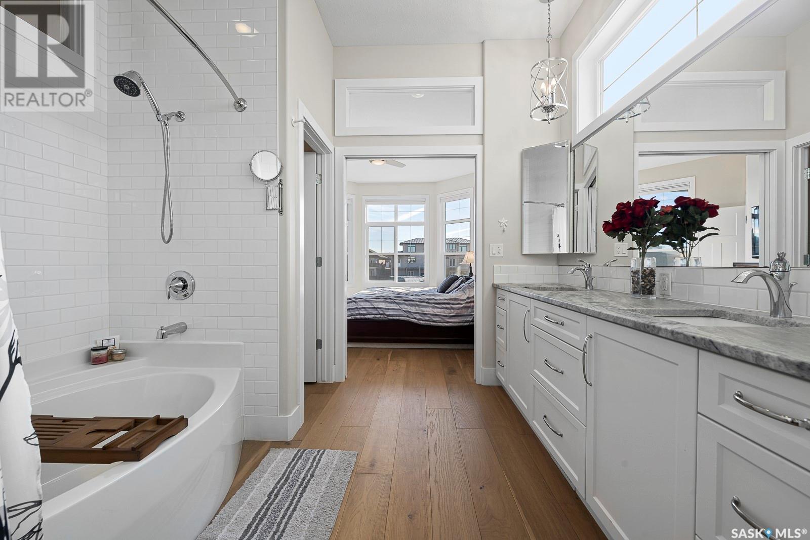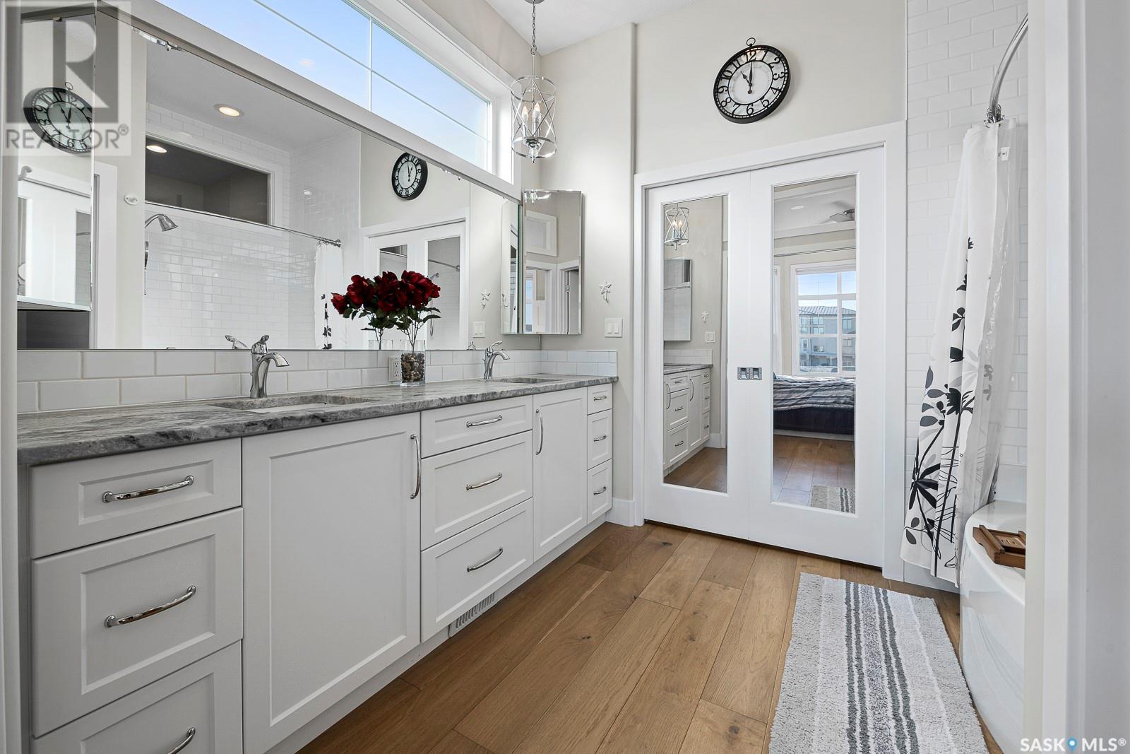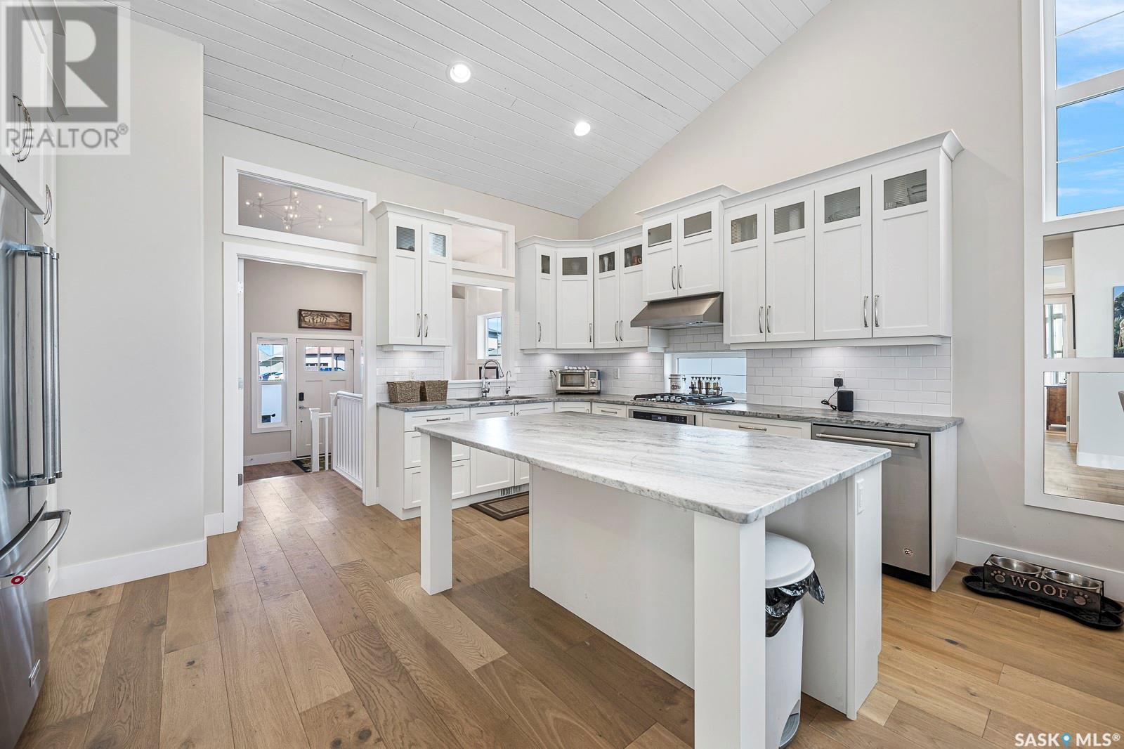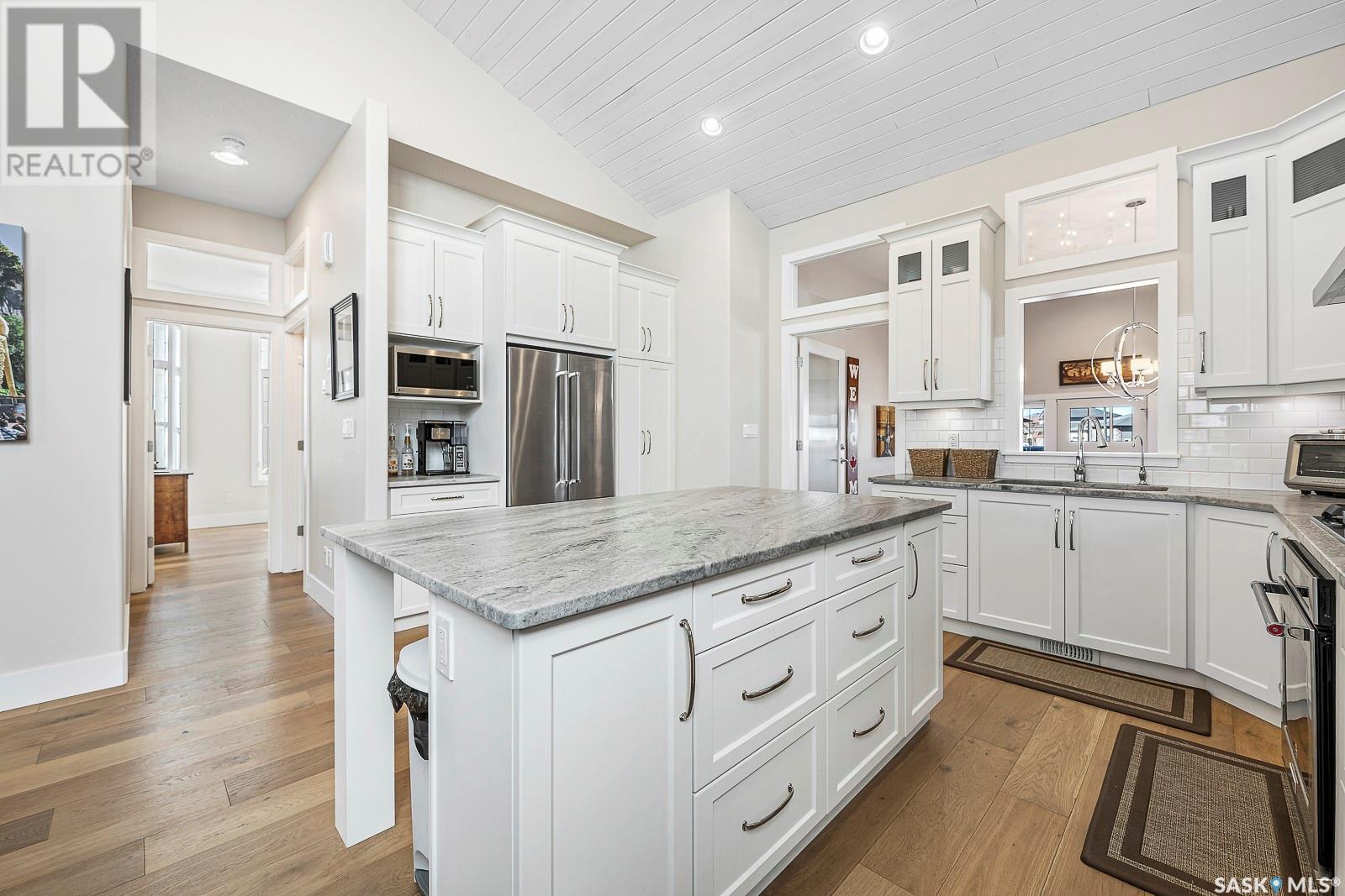 This spectacular executive walkout backing a greenspace with amazing walking paths may be the one you have been waiting for. As you pull up to this 4 bedroom, 4 bathroom home you will be impressed by the curb appeal. Beautiful maintenance free stone and siding exterior with custom shutters, extended exposed aggregate driveway allows for extra parking or for an RV. As you enter this stunning home you are greeted with a covered composite deck that leads to the large bright foyer with direct entry to the double attached garage which has recently been fully insulated, boarded, and mudded. The main floor is bright and features 10.5’ ceilings throughout the main floor and vaulted to 15’ with pine white shiplap. The amazing kitchen will not disappoint with custom white shaker cabinetry with soft-close drawers/doors, large island, granite countertops, and stainless steel appliances. The kitchen is open to the nice size dining area and great room which includes a gas fireplace and has access to the screened-in deck perfect for entertaining or having that morning coffee with the beautiful park views. The primary bedroom is a nice size and has amazing windows to capture the sunrise and also features a 5pc ensuite, with dual sink vanity. To complete the primary bedroom we can’t forget about the large walk-in closet with custom built-ins and leads to the main floor laundry area. To finish off the main floor you will find a 2nd bedroom along with a 3pc bathroom and separate nook that has previously been used for both a dressing room and currently an office. The fabulous basement has 9’ ceilings, large rec room, and includes a 2nd gas fireplace. You will also find 2 good-sized bedrooms, wet bar/kitchenette, separate water closet and a 4pc bathroom. The utility room has option for laundry and comes with an on-demand water heater. Off of the rec room, you will find access to your large patio area and beautifully landscaped fenced yard with artificial turf and landscaping stone. (id:22211)