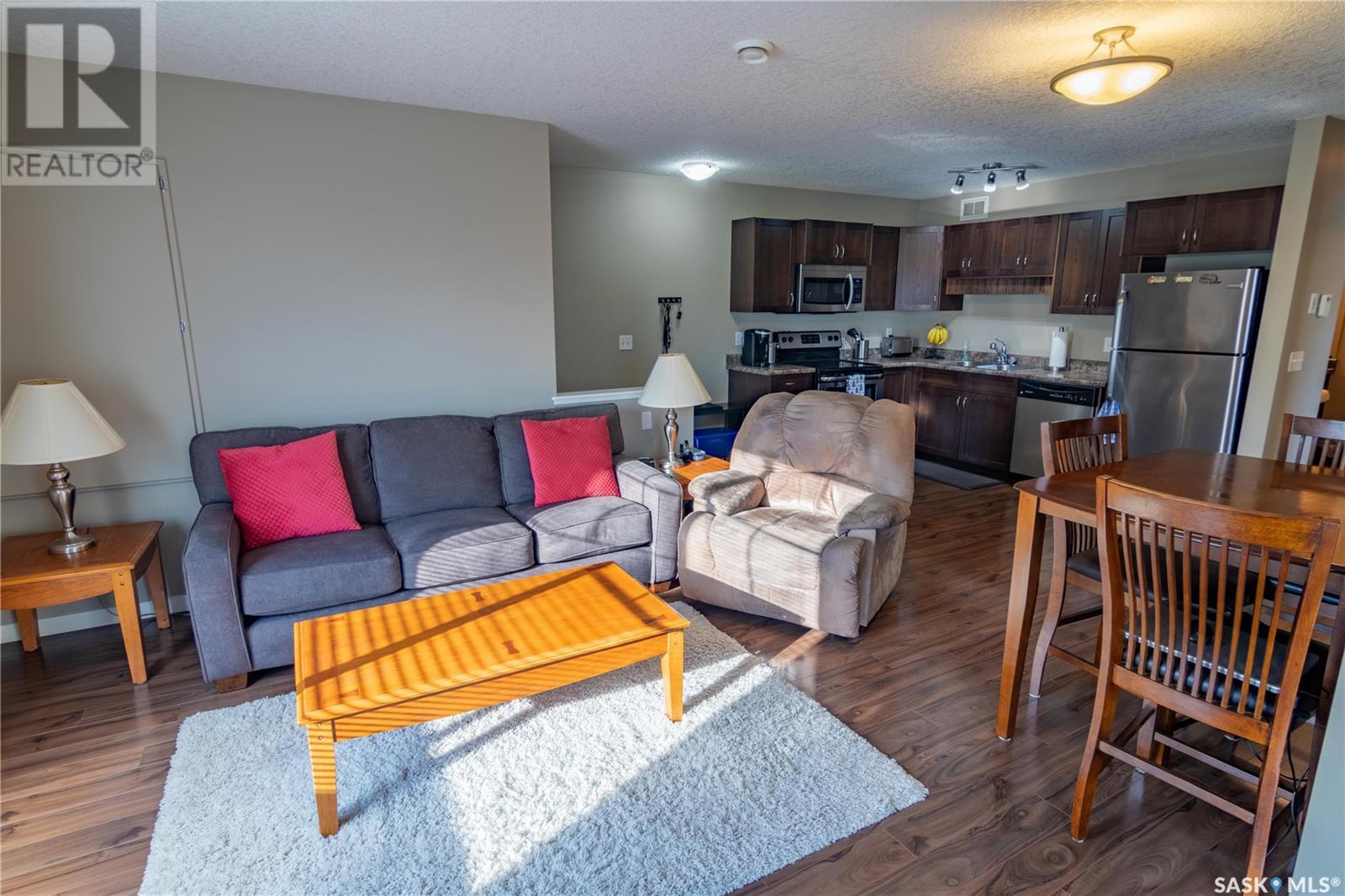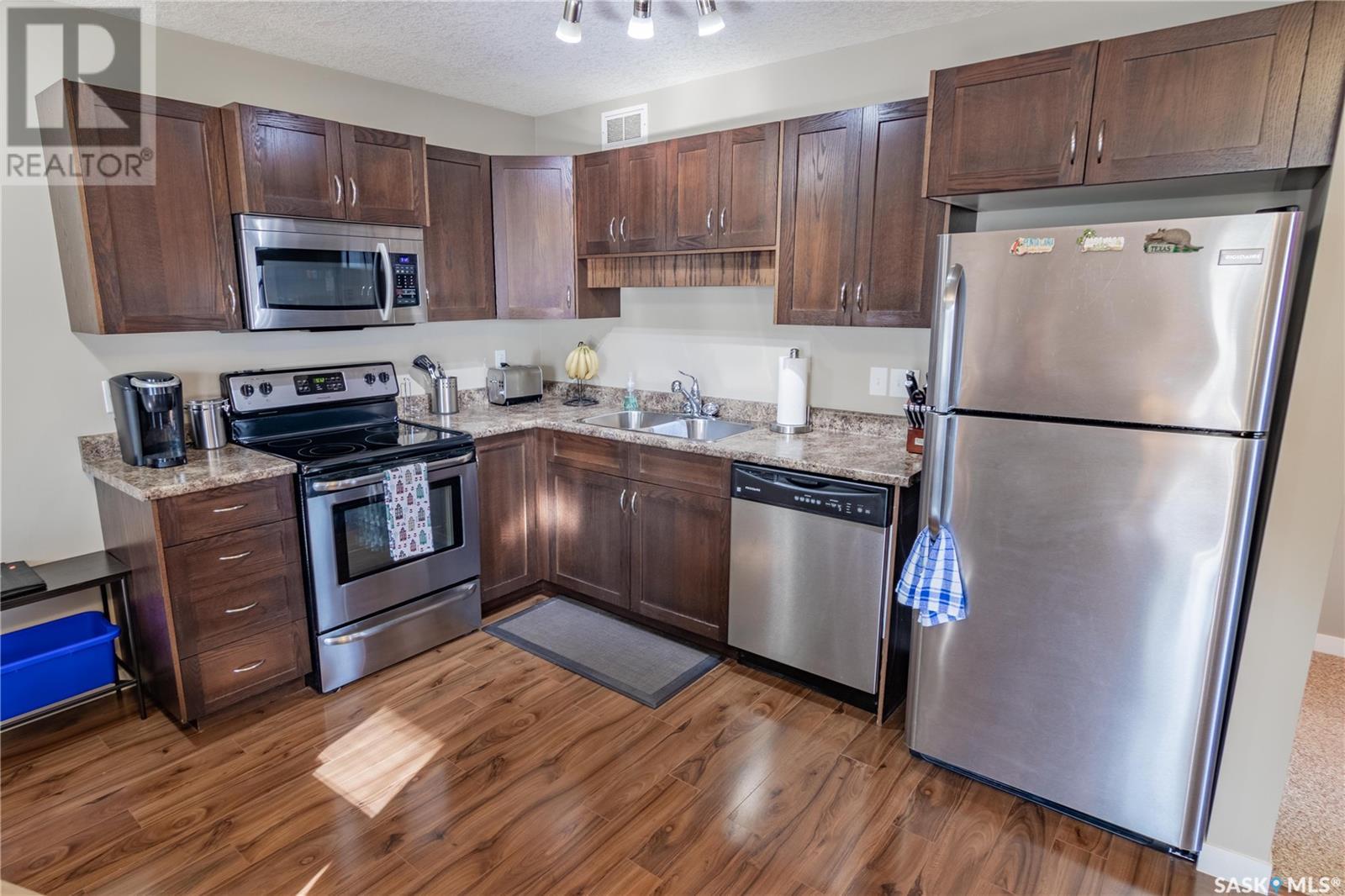 Welcome to #30-5545 Blake Crescent in Lakeridge Addition! This 2 bedroom, 1 bath upper level condo is a pleasure to show and in great condition. Enjoy the open concept kitchen/dining/living room areas with laminate flooring and the SW facing balcony is perfect to watch the sunset at the end of your day! The kitchen features upgraded cappuccino cabinets and SS appliances. You will love all the natural bright light this unit gets during the daytime. There are two nice size bedrooms, a full bath as well as in suite laundry, a tankless water heater and in floor heat throughout this condo. A move-in ready home that includes your very own titled parking spot and low condo fees, what more could you ask for? Call S/P or your real estate agent to book your showing today! (id:22211)
