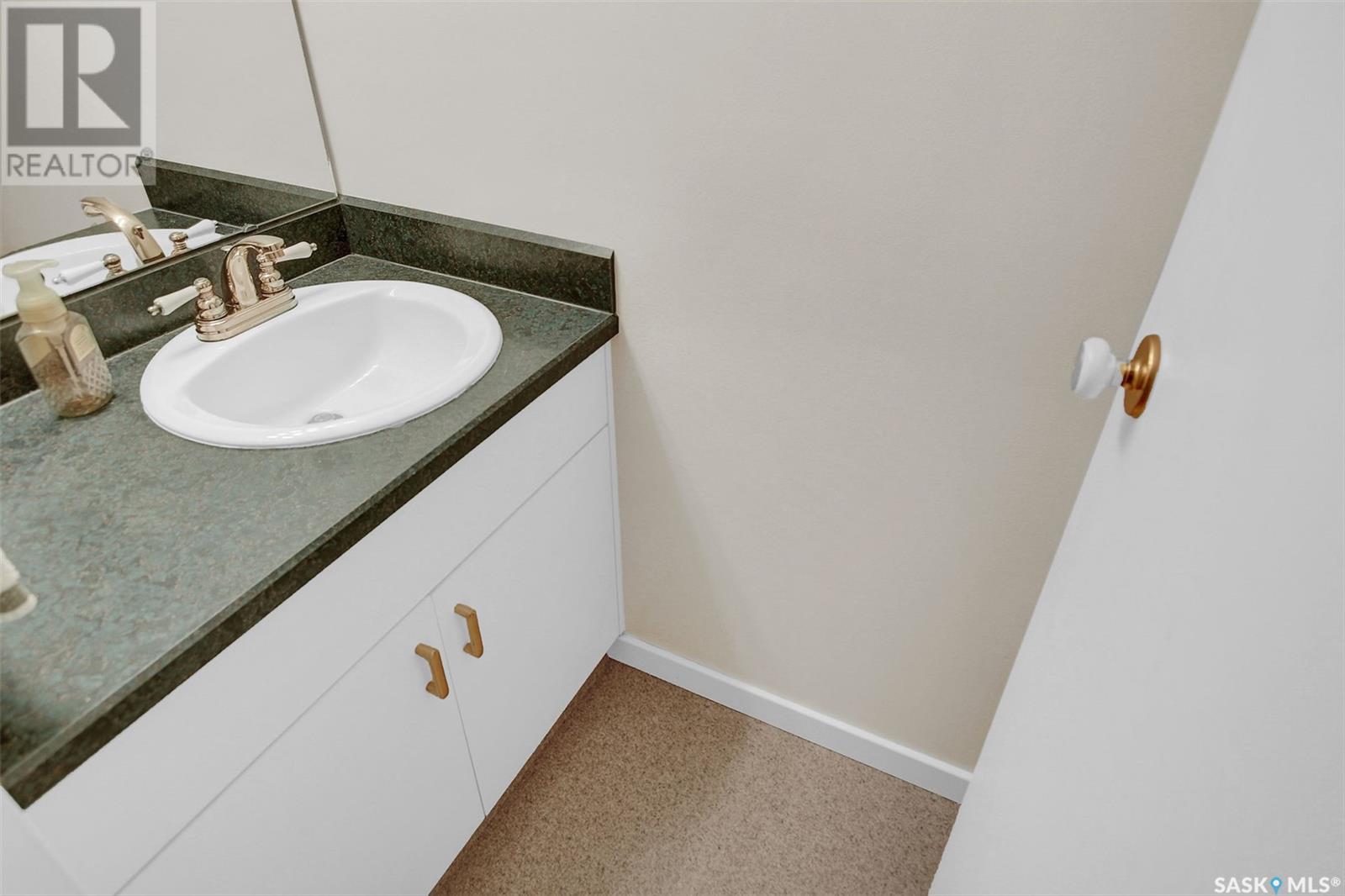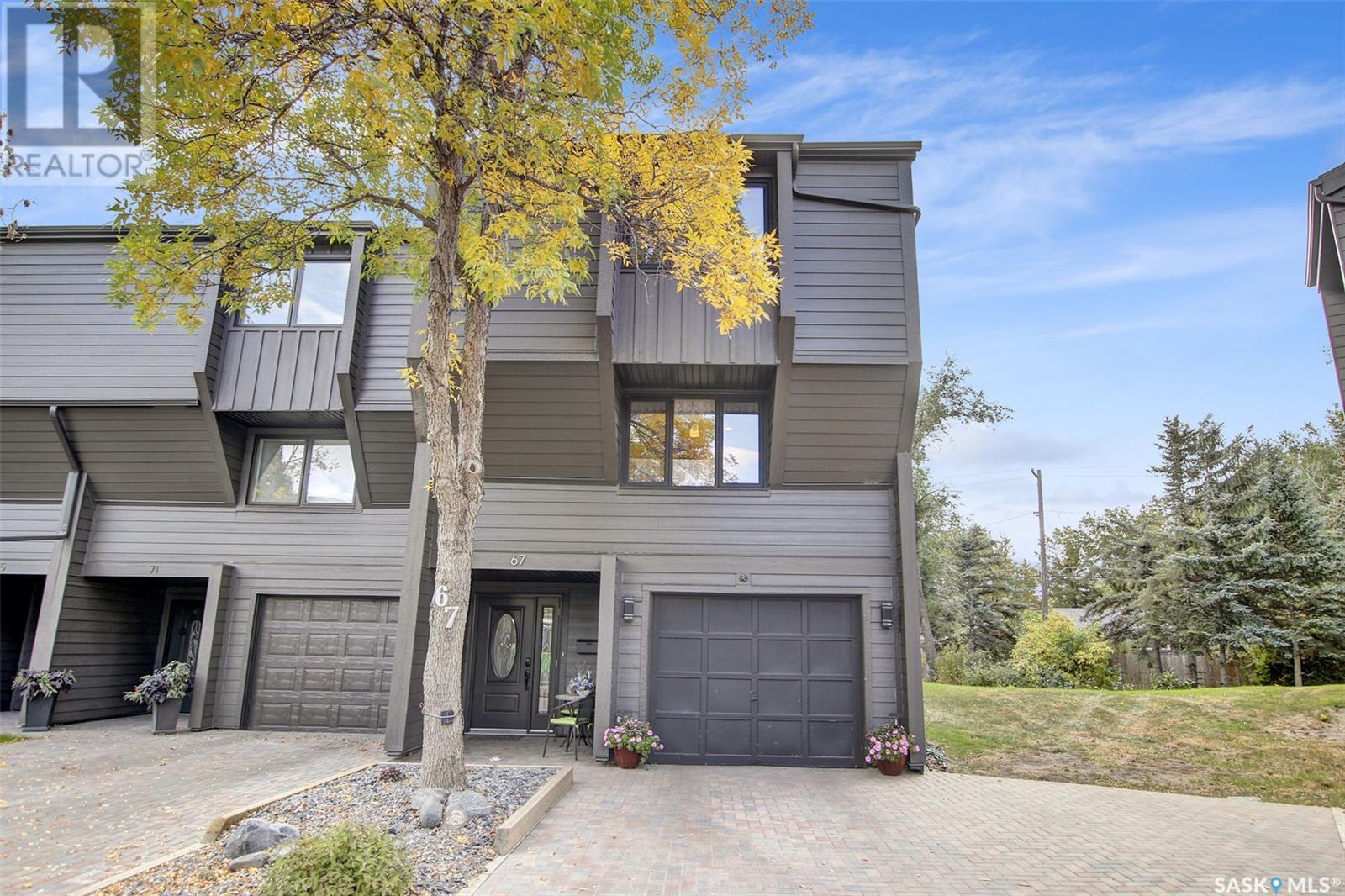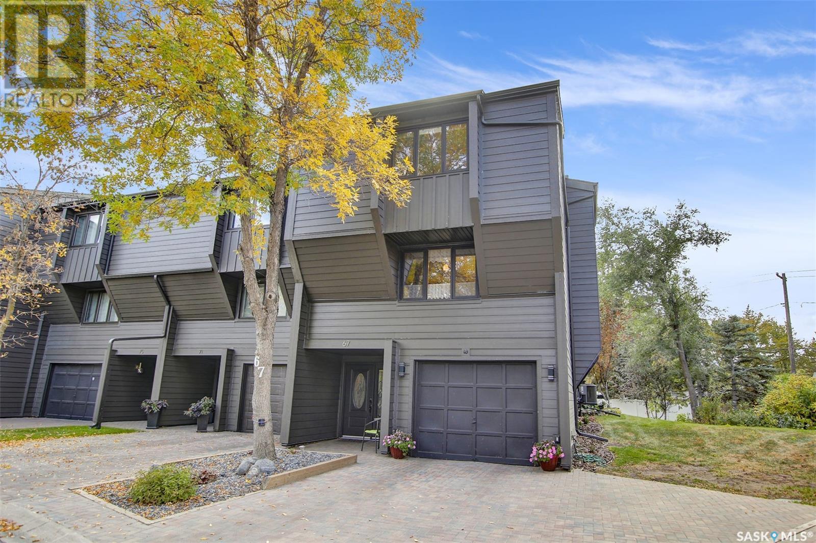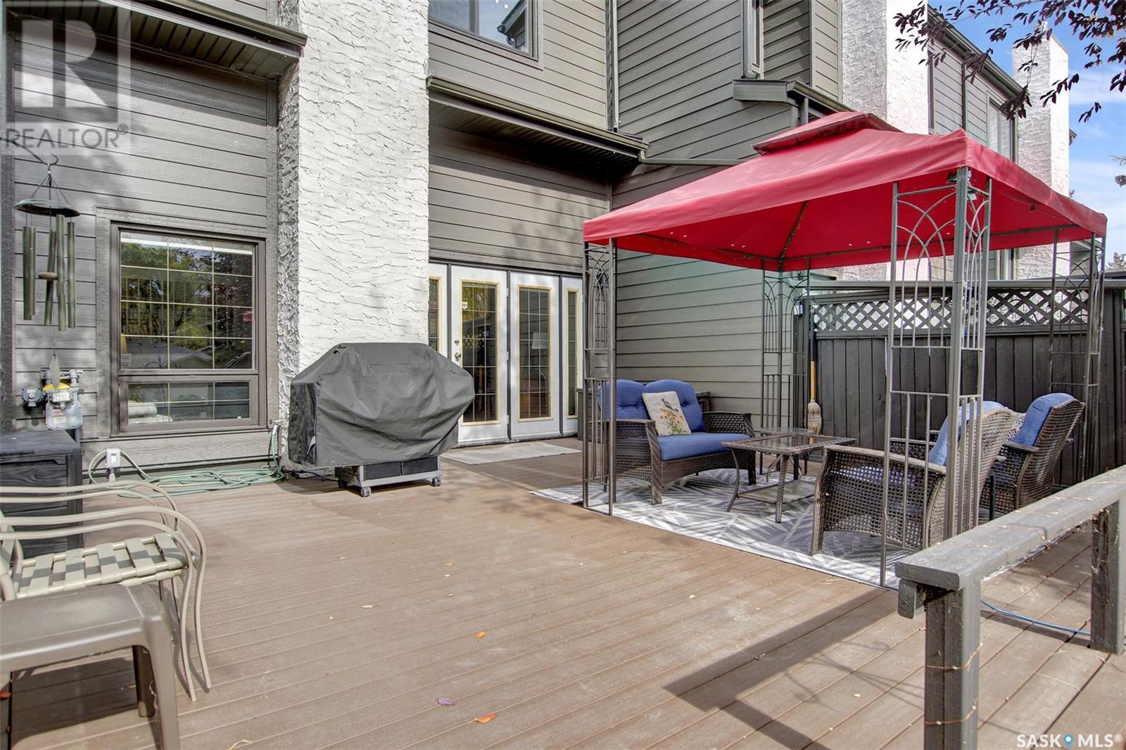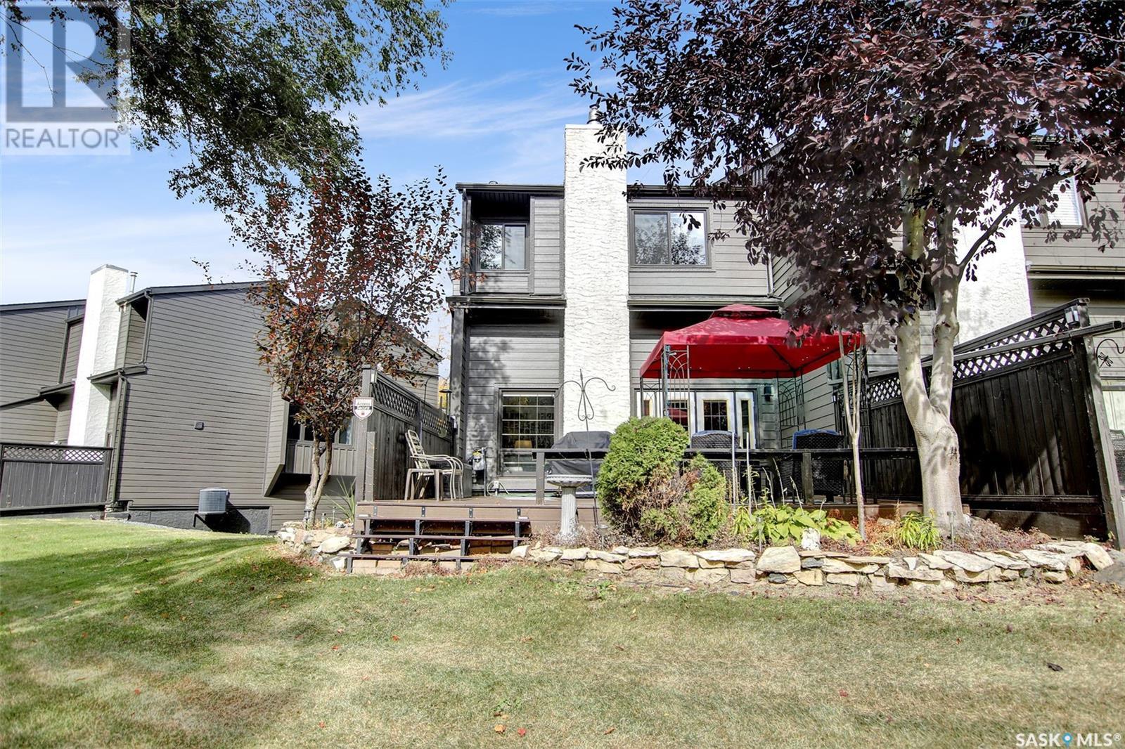 Click on the reel at the top to watch the virtual tour. Don’t miss the opportunity to own this end unit condo offering great natural light located in desirable Quincy Greene. Front entry has heated floor & direct entry to garage. Main floor living room with sunny south exposure, 12-foot ceiling, gas fireplace & garden door to a deck. The second level offers large dining room with hardwood floor & large SW facing window. Kitchen overlooks the private front road & offers an abundance of cabinets & counter space at both ends of the room. Large pantry or linen closet & a two-piece bathroom complete this level. The third level features a bonus room with a window for natural light, 2 secondary bedrooms, French doors to primary bedroom which can accommodate a king size bed plus room to spare with access to the walk-in closet (cabinet with deep drawers), shower stall plus washer & dryer & access to the four-piece main bathroom. (jetted tub not working). Basement is insulated & drywalled with great storage including six deep storage lockers and a second shower. Most windows replaced with PVC. Single attached garage, drywalled with a garage door opener. Interlocking brick double driveway. Private back yard with a no maintenance composite deck, permanent gazebo and natural gas hookup for a barbeque. Backing onto a well treed greenspace. Complex includes outdoor pool, tennis court, and playground. Located across from the swimming pool, lending library & visitor parking. Great Hillsdale location with close proximity to U. of R., Wascana Park, Conexus Art Centre, Sask Polytech, McKenzie Art Gallery, restaurants, shopping and all other south end amenities. NOTE: Complex is under construction with the last few buildings receiving new insulation & composite siding (id:22211)