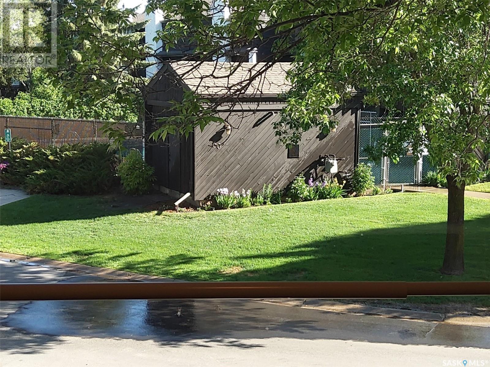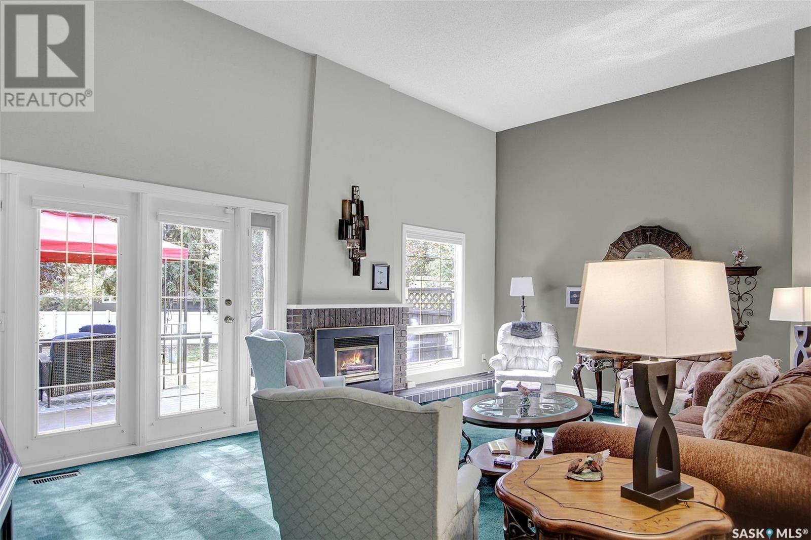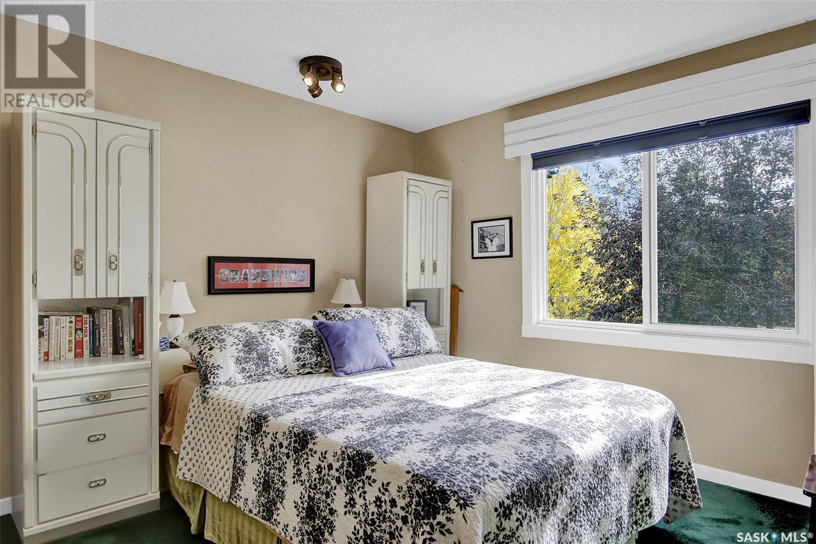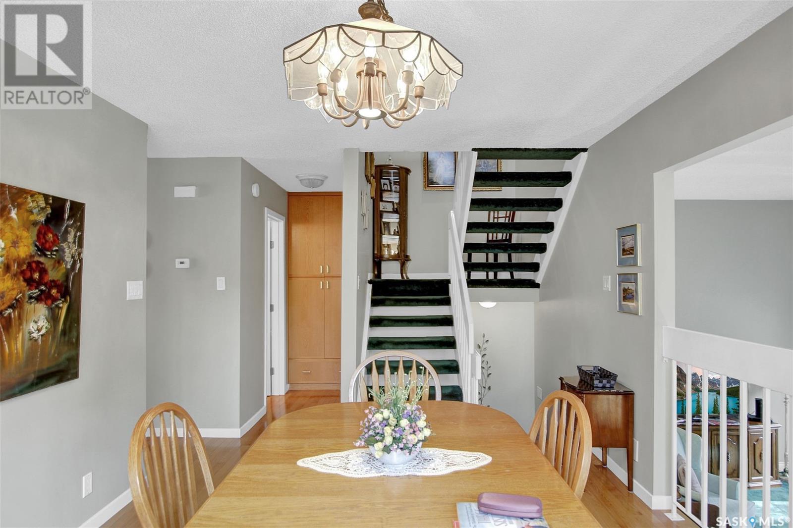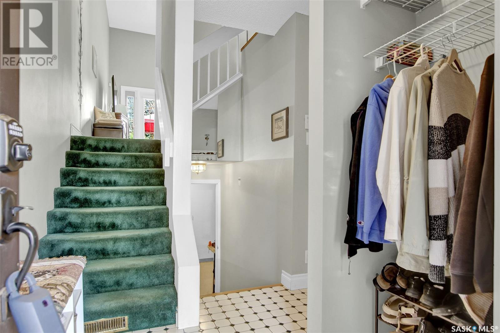 Click on the reel at the top to watch the virtual tour. Don’t miss the opportunity to own this end unit condo offering great natural light located in desirable Quincy Greene. Front entry has heated floor & direct entry to garage. Main floor living room with sunny south exposure, 12-foot ceiling, gas fireplace & garden door to a deck. The second level offers large dining room with hardwood floor & large SW facing window. Kitchen overlooks the private front road & offers an abundance of cabinets & counter space at both ends of the room. Large pantry or linen closet & a two-piece bathroom complete this level. The third level features a bonus room with a window for natural light, 2 secondary bedrooms, French doors to primary bedroom which can accommodate a king size bed plus room to spare with access to the walk-in closet (cabinet with deep drawers), shower stall plus washer & dryer & access to the four-piece main bathroom. (jetted tub not working). Basement is insulated & drywalled with great storage including six deep storage lockers and a second shower. Most windows replaced with PVC. Single attached garage, drywalled with a garage door opener. Interlocking brick double driveway. Private back yard with a no maintenance composite deck, permanent gazebo and natural gas hookup for a barbeque. Backing onto a well treed greenspace. Complex includes outdoor pool, tennis court, and playground. Located across from the swimming pool, lending library & visitor parking. Great Hillsdale location with close proximity to U. of R., Wascana Park, Conexus Art Centre, Sask Polytech, McKenzie Art Gallery, restaurants, shopping and all other south end amenities. NOTE: Complex is under construction with the last few buildings receiving new insulation & composite siding (id:22211)