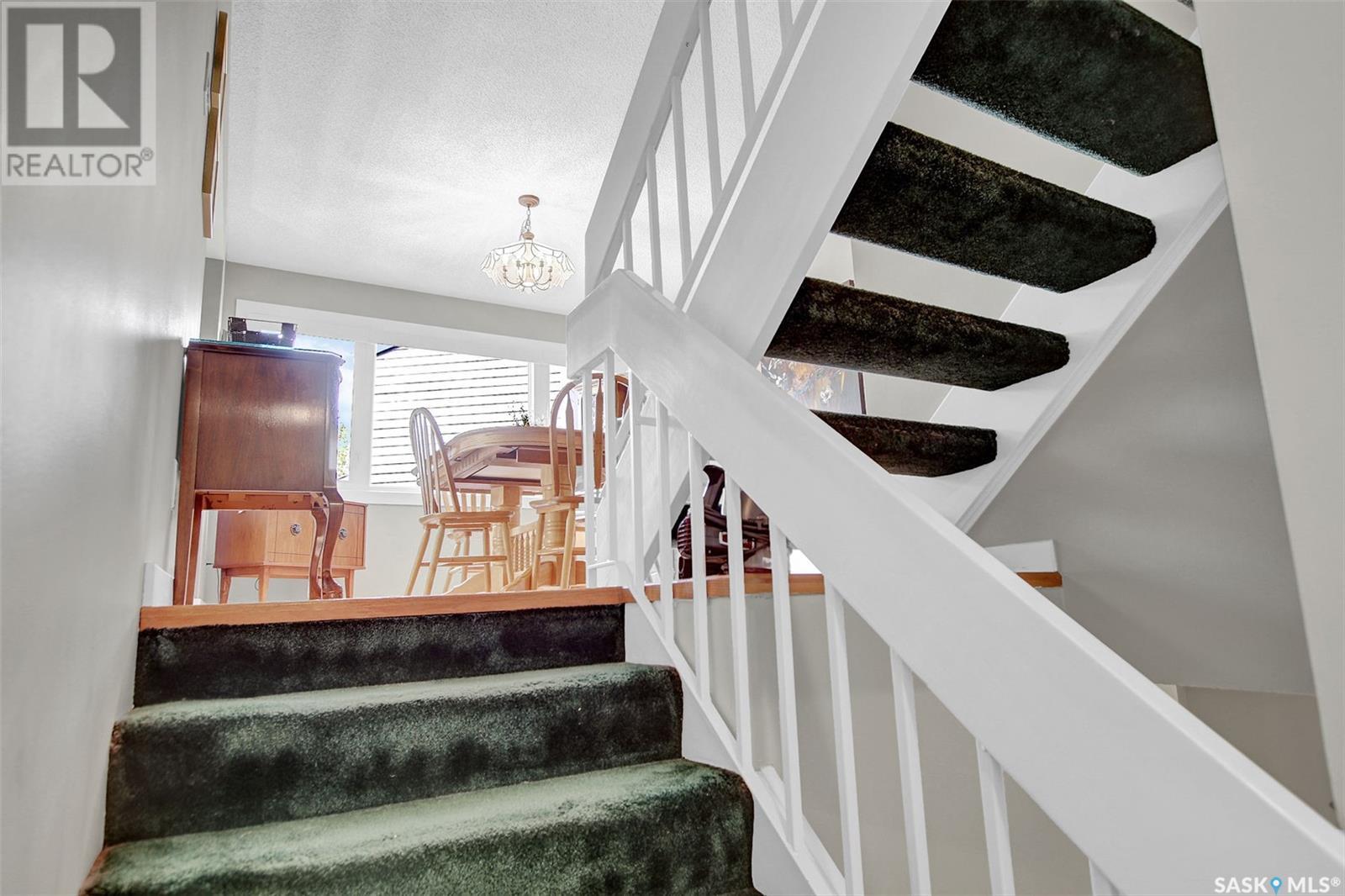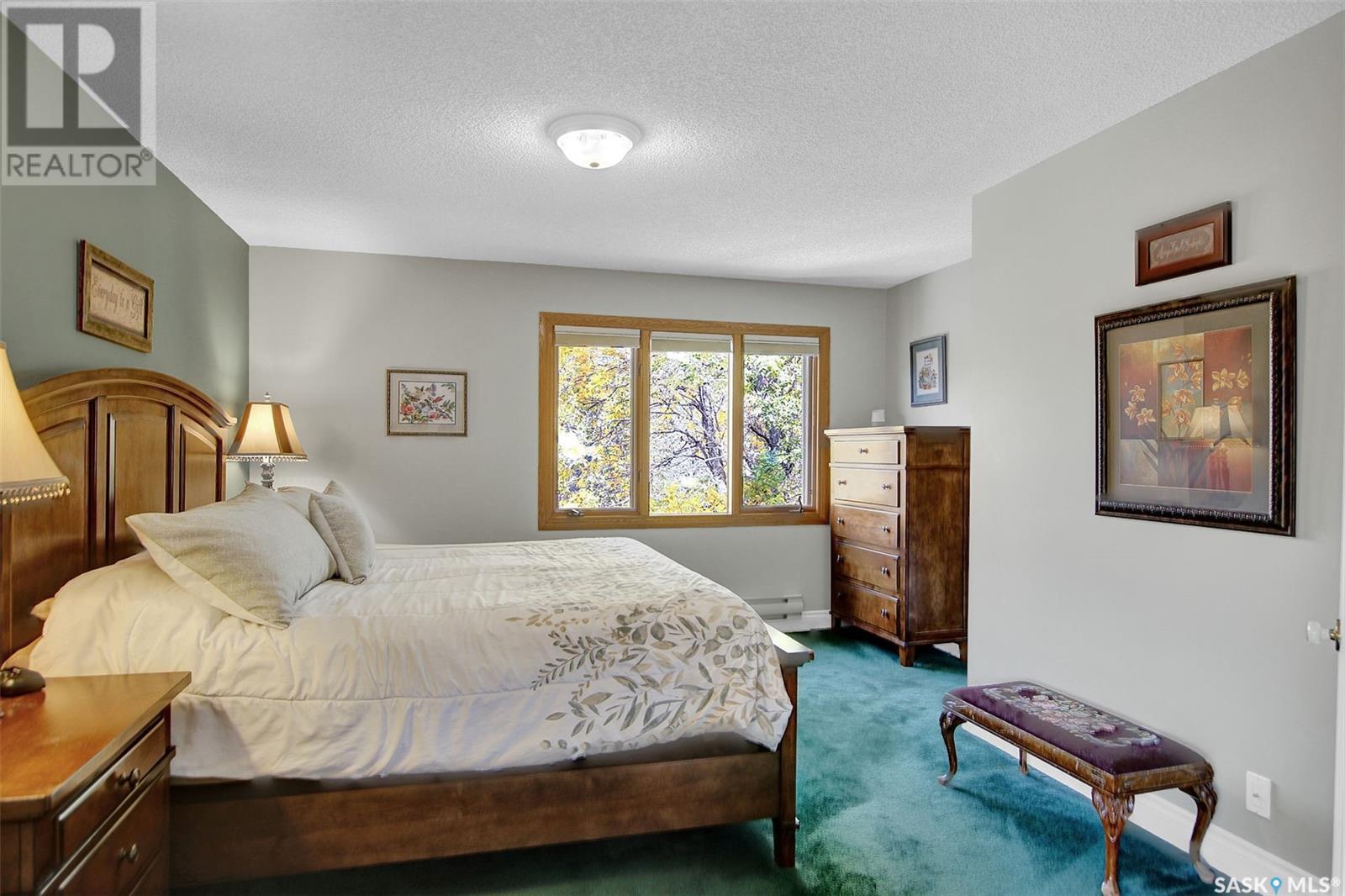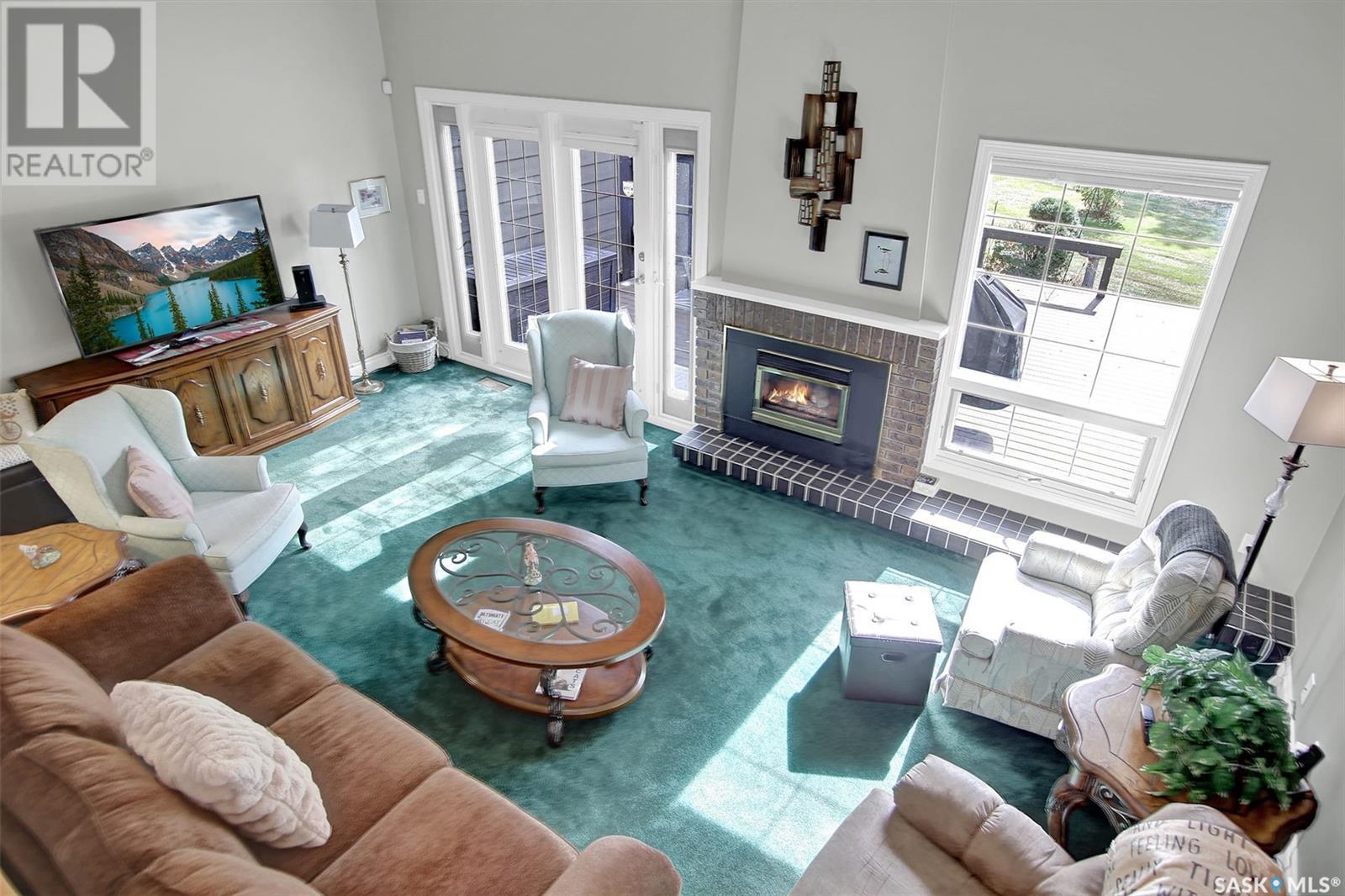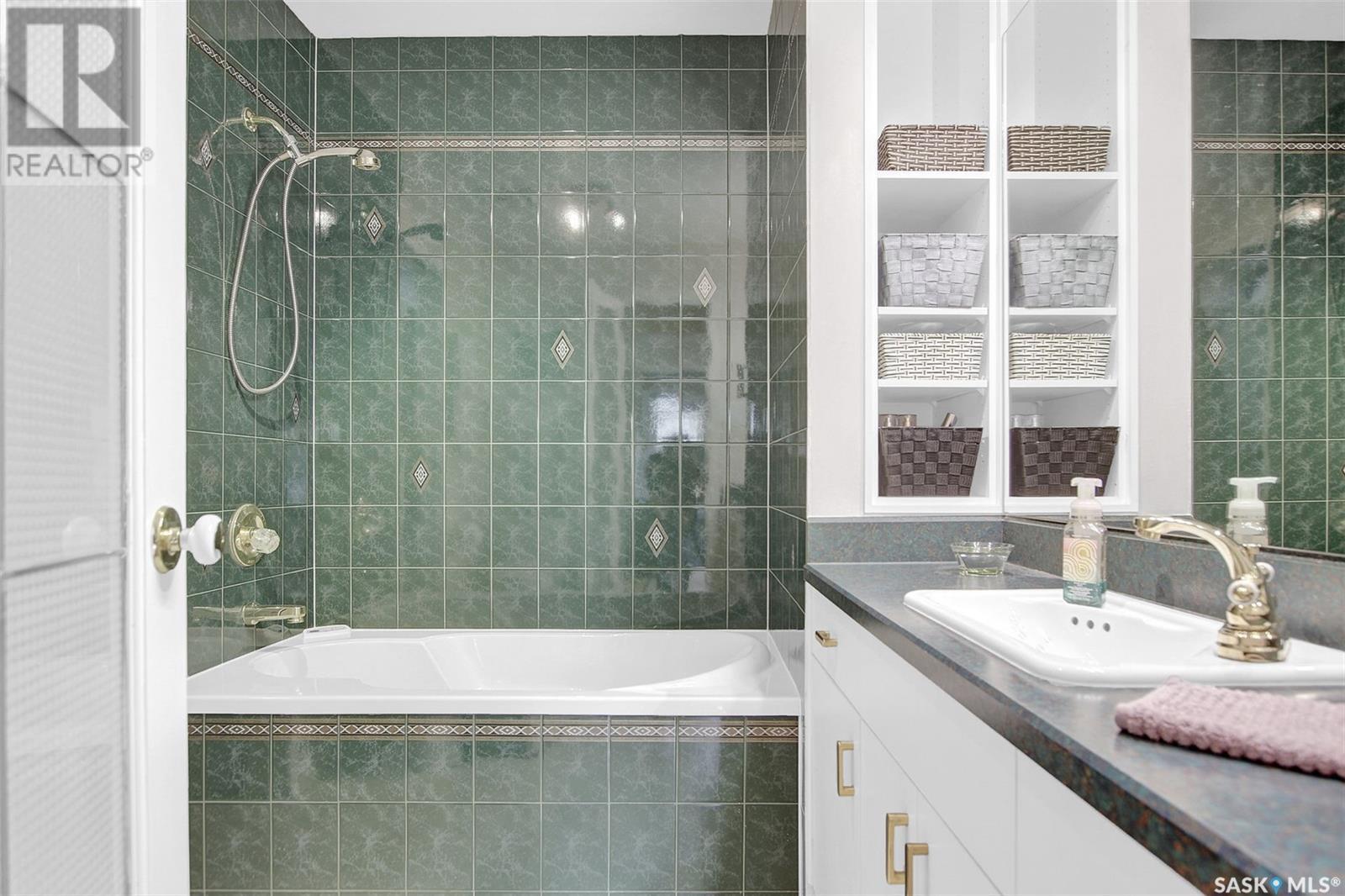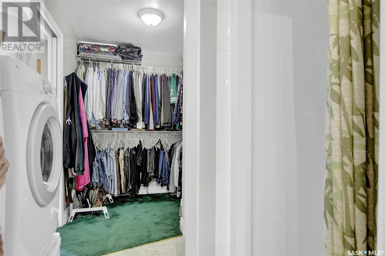 Click on the reel at the top to watch the virtual tour. Don’t miss the opportunity to own this end unit condo offering great natural light located in desirable Quincy Greene. Front entry has heated floor & direct entry to garage. Main floor living room with sunny south exposure, 12-foot ceiling, gas fireplace & garden door to a deck. The second level offers large dining room with hardwood floor & large SW facing window. Kitchen overlooks the private front road & offers an abundance of cabinets & counter space at both ends of the room. Large pantry or linen closet & a two-piece bathroom complete this level. The third level features a bonus room with a window for natural light, 2 secondary bedrooms, French doors to primary bedroom which can accommodate a king size bed plus room to spare with access to the walk-in closet (cabinet with deep drawers), shower stall plus washer & dryer & access to the four-piece main bathroom. (jetted tub not working). Basement is insulated & drywalled with great storage including six deep storage lockers and a second shower. Most windows replaced with PVC. Single attached garage, drywalled with a garage door opener. Interlocking brick double driveway. Private back yard with a no maintenance composite deck, permanent gazebo and natural gas hookup for a barbeque. Backing onto a well treed greenspace. Complex includes outdoor pool, tennis court, and playground. Located across from the swimming pool, lending library & visitor parking. Great Hillsdale location with close proximity to U. of R., Wascana Park, Conexus Art Centre, Sask Polytech, McKenzie Art Gallery, restaurants, shopping and all other south end amenities. NOTE: Complex is under construction with the last few buildings receiving new insulation & composite siding (id:22211)