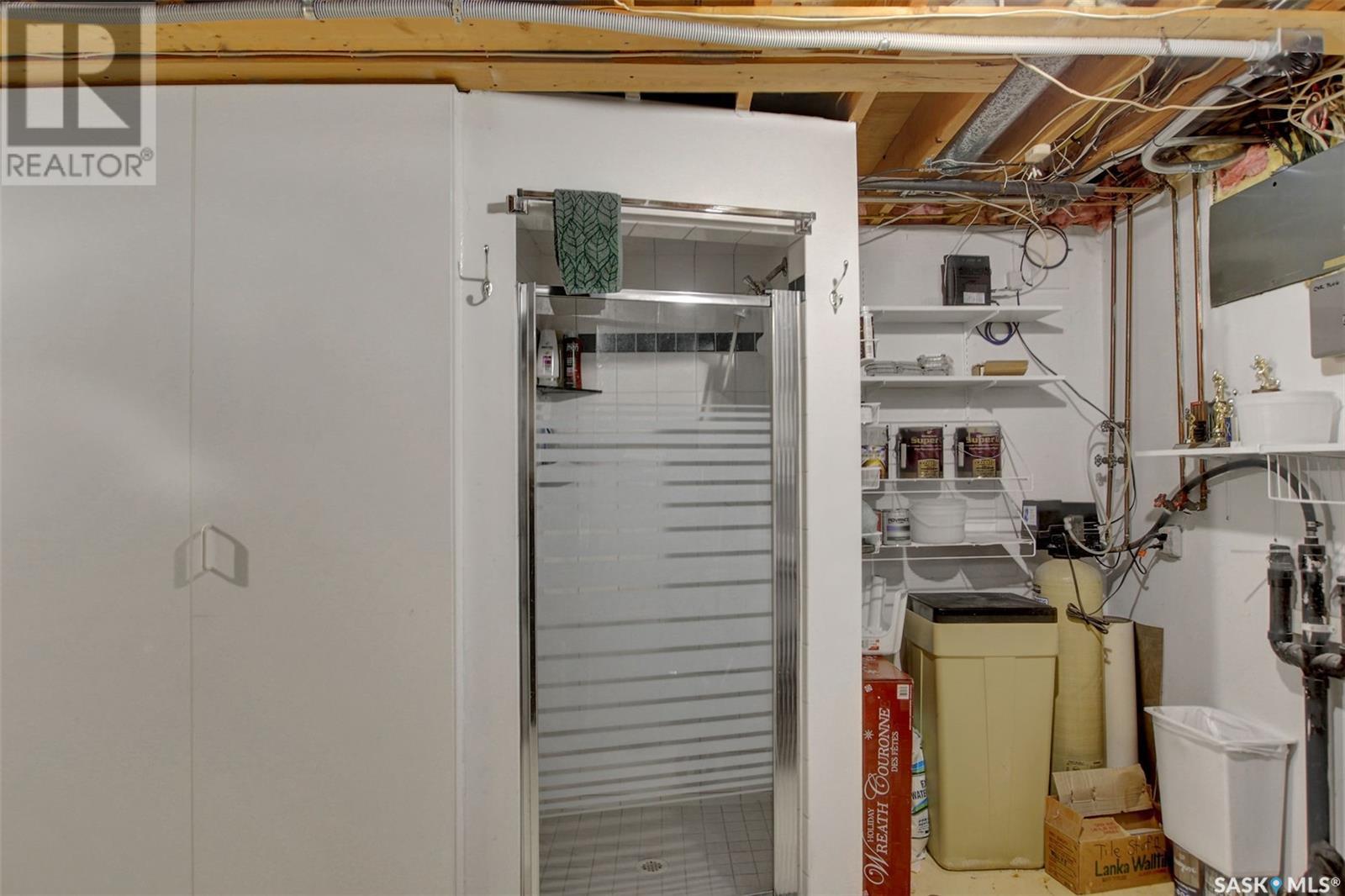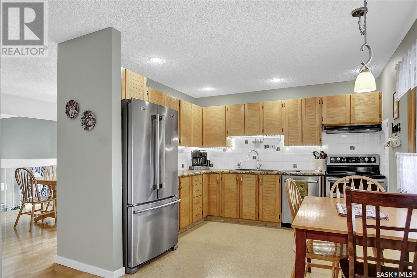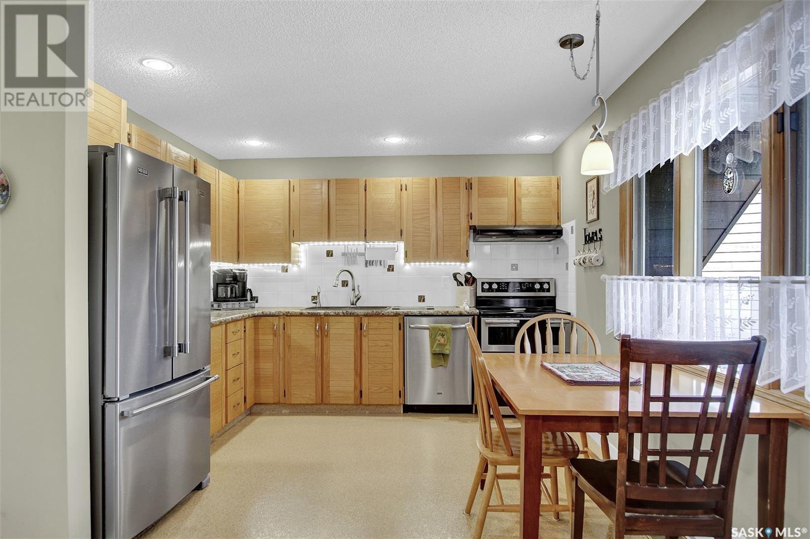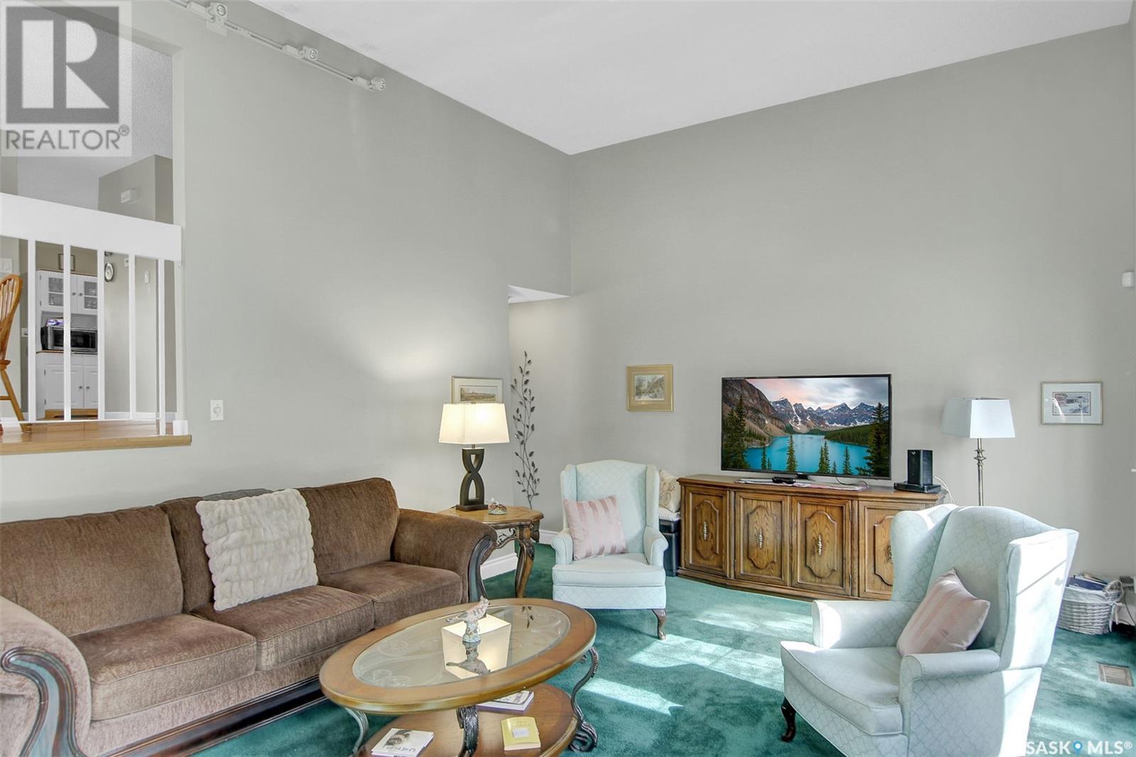 Click on the reel at the top to watch the virtual tour. Don’t miss the opportunity to own this end unit condo offering great natural light located in desirable Quincy Greene. Front entry has heated floor & direct entry to garage. Main floor living room with sunny south exposure, 12-foot ceiling, gas fireplace & garden door to a deck. The second level offers large dining room with hardwood floor & large SW facing window. Kitchen overlooks the private front road & offers an abundance of cabinets & counter space at both ends of the room. Large pantry or linen closet & a two-piece bathroom complete this level. The third level features a bonus room with a window for natural light, 2 secondary bedrooms, French doors to primary bedroom which can accommodate a king size bed plus room to spare with access to the walk-in closet (cabinet with deep drawers), shower stall plus washer & dryer & access to the four-piece main bathroom. (jetted tub not working). Basement is insulated & drywalled with great storage including six deep storage lockers and a second shower. Most windows replaced with PVC. Single attached garage, drywalled with a garage door opener. Interlocking brick double driveway. Private back yard with a no maintenance composite deck, permanent gazebo and natural gas hookup for a barbeque. Backing onto a well treed greenspace. Complex includes outdoor pool, tennis court, and playground. Located across from the swimming pool, lending library & visitor parking. Great Hillsdale location with close proximity to U. of R., Wascana Park, Conexus Art Centre, Sask Polytech, McKenzie Art Gallery, restaurants, shopping and all other south end amenities. NOTE: Complex is under construction with the last few buildings receiving new insulation & composite siding (id:22211)
