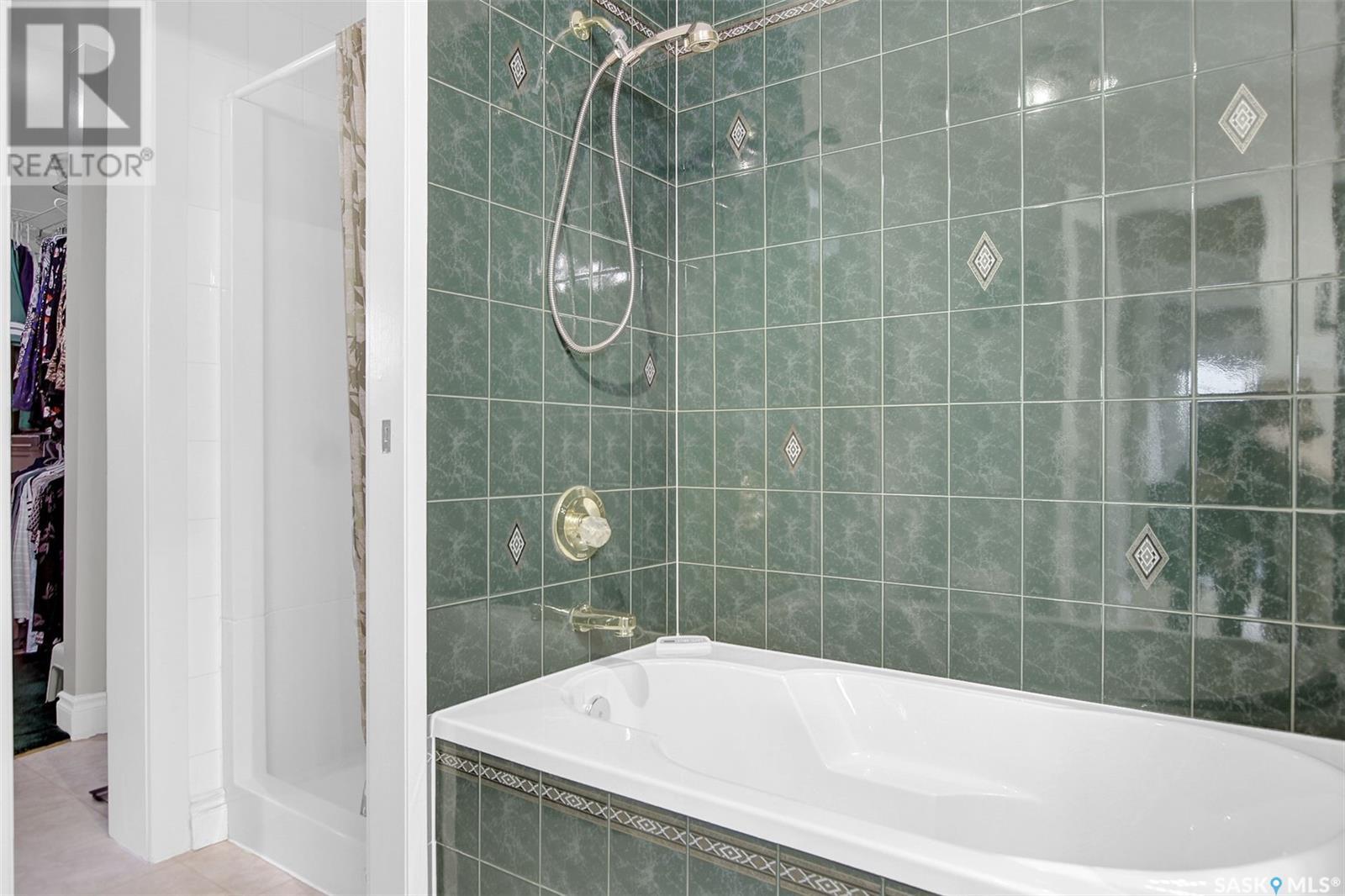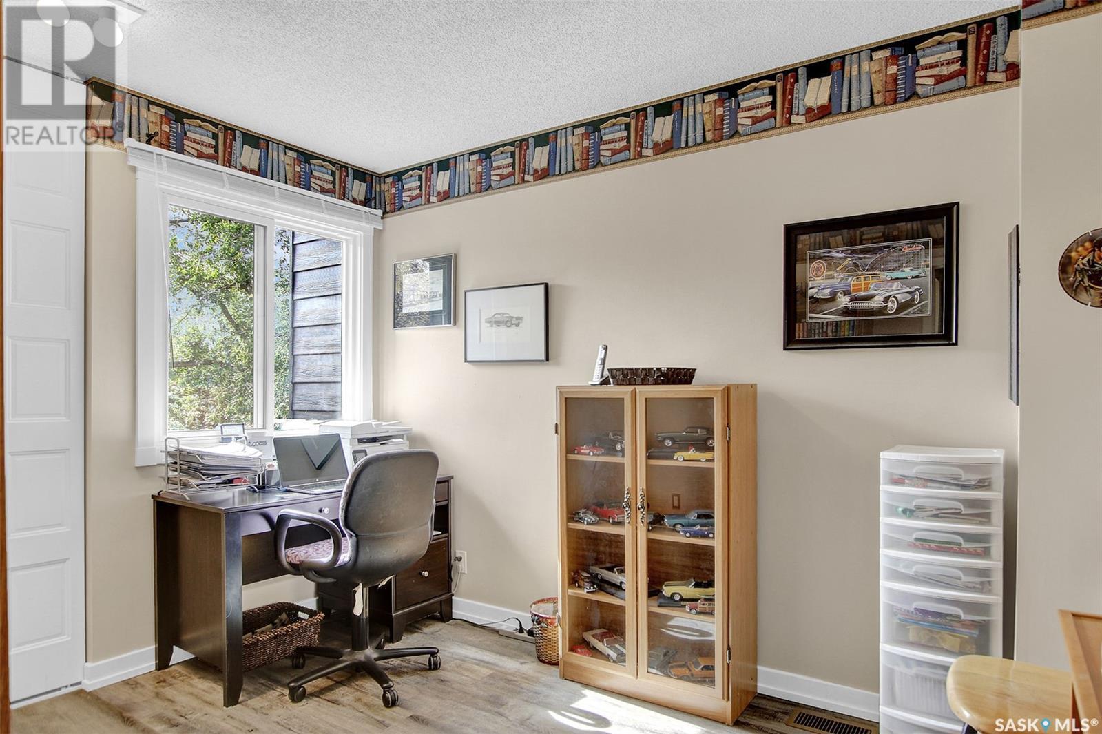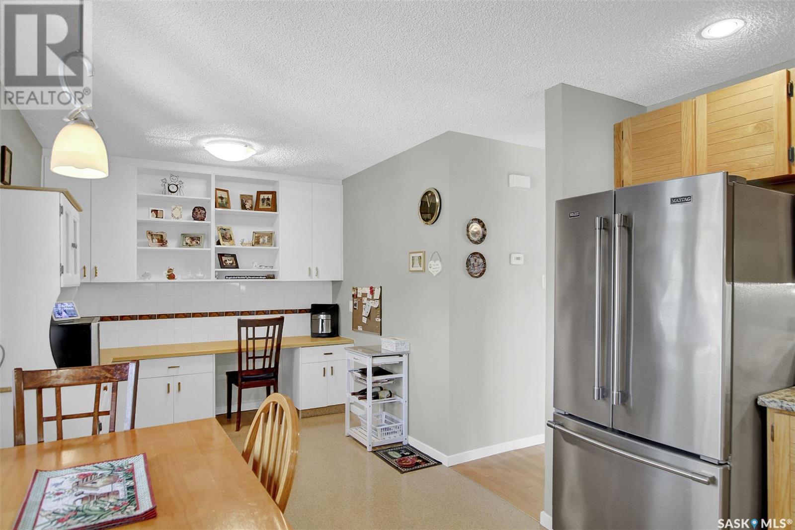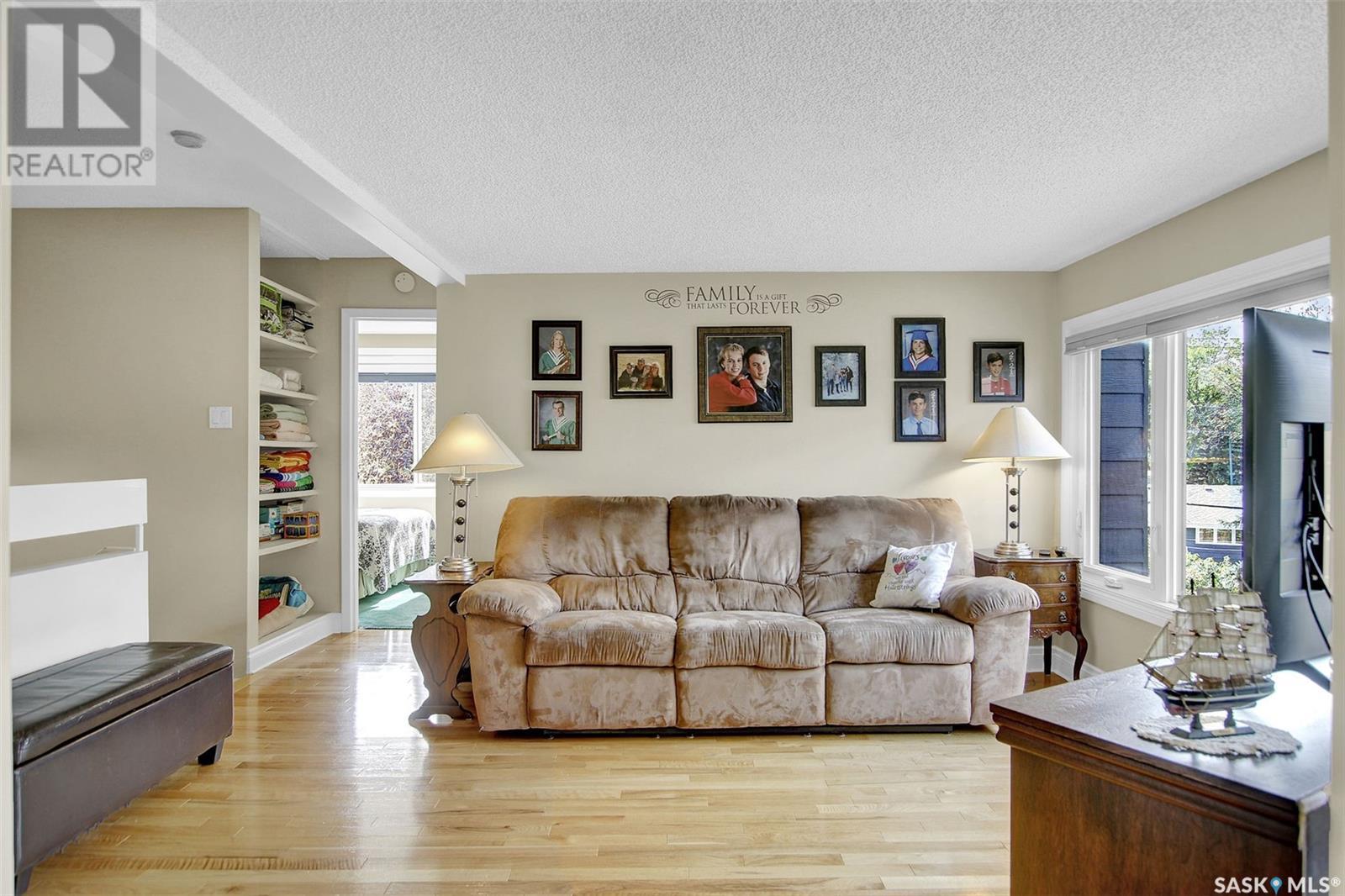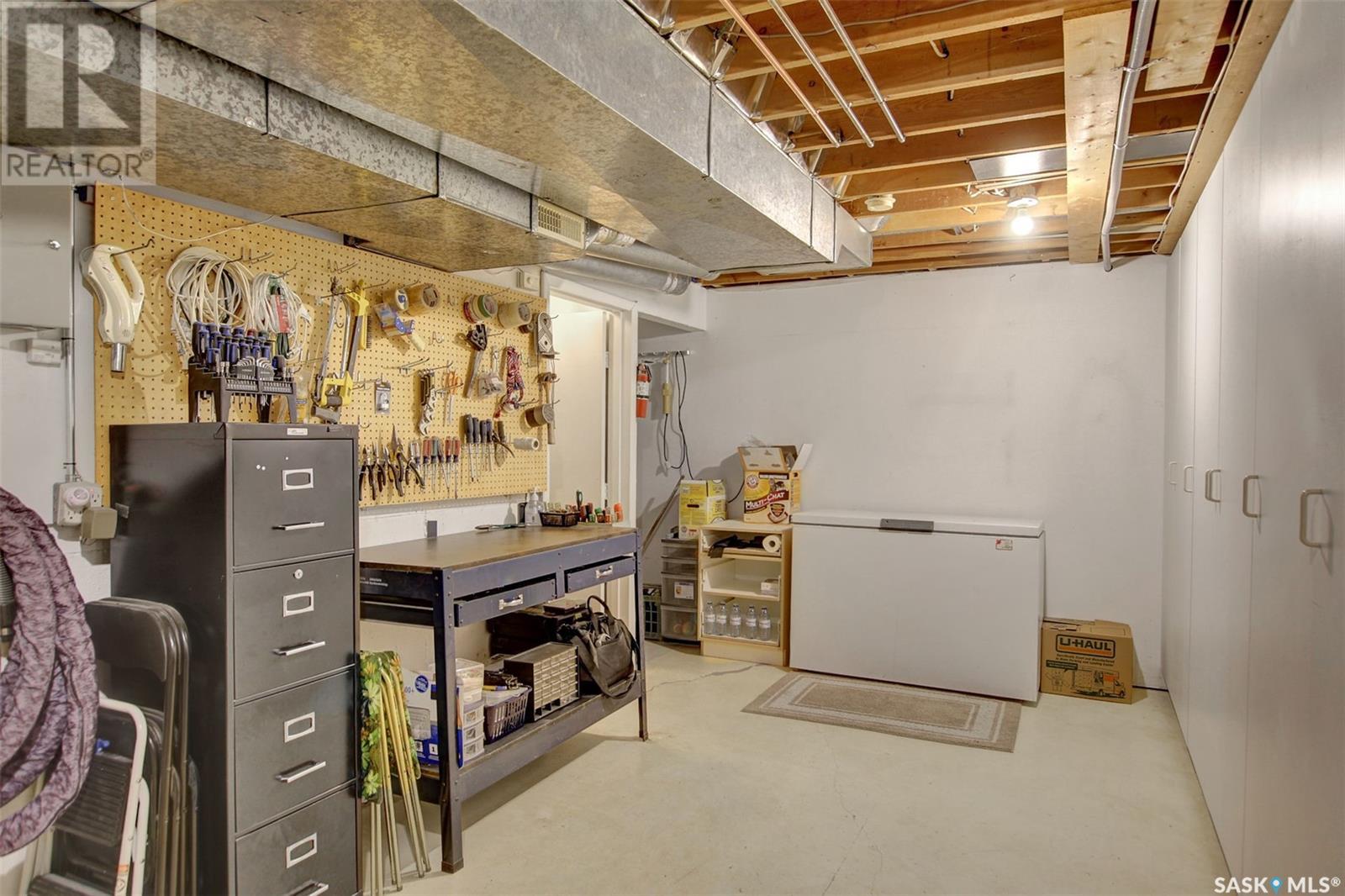 Click on the reel at the top to watch the virtual tour. Don’t miss the opportunity to own this end unit condo offering great natural light located in desirable Quincy Greene. Front entry has heated floor & direct entry to garage. Main floor living room with sunny south exposure, 12-foot ceiling, gas fireplace & garden door to a deck. The second level offers large dining room with hardwood floor & large SW facing window. Kitchen overlooks the private front road & offers an abundance of cabinets & counter space at both ends of the room. Large pantry or linen closet & a two-piece bathroom complete this level. The third level features a bonus room with a window for natural light, 2 secondary bedrooms, French doors to primary bedroom which can accommodate a king size bed plus room to spare with access to the walk-in closet (cabinet with deep drawers), shower stall plus washer & dryer & access to the four-piece main bathroom. (jetted tub not working). Basement is insulated & drywalled with great storage including six deep storage lockers and a second shower. Most windows replaced with PVC. Single attached garage, drywalled with a garage door opener. Interlocking brick double driveway. Private back yard with a no maintenance composite deck, permanent gazebo and natural gas hookup for a barbeque. Backing onto a well treed greenspace. Complex includes outdoor pool, tennis court, and playground. Located across from the swimming pool, lending library & visitor parking. Great Hillsdale location with close proximity to U. of R., Wascana Park, Conexus Art Centre, Sask Polytech, McKenzie Art Gallery, restaurants, shopping and all other south end amenities. NOTE: Complex is under construction with the last few buildings receiving new insulation & composite siding (id:22211)