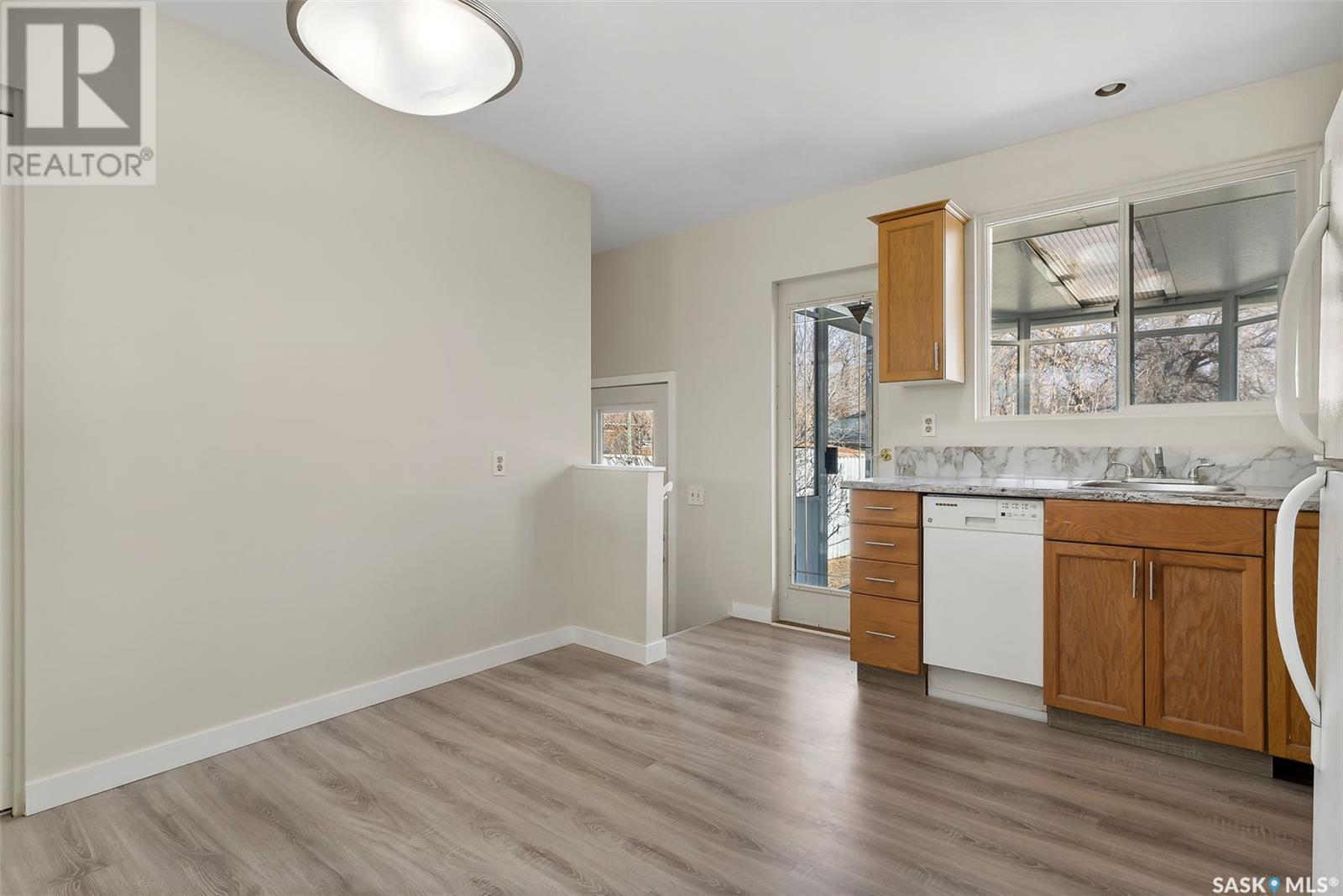 UPDATED 3 BED, 2 BATH BUNGALOW ON A BAY IN UPLANDS! Welcome to this well laid out and updated bungalow. Enter to a big bright living room to an updated eat in kitchen with newer oak cabinets, counters a good size pantry, sun tunnel and pass thru to living room. The flooring on both levels features new durable laminate, new baseboards and updated windows to most of the main floor. The main floor is complete with 3 bedrooms, a main 4 pce bath and garden doors from the kitchen to an east facing 10x10 enclosed sunroom. The new basement development includes a drop ceiling, new doors, flooring and an updated 3 pce bath. The large laundry utility room also includes a newer hi eff furnace and A/C. The exterior boasts newer exterior doors, low maintenance siding, new shingles, a fenced yard and 2 sheds. Good potential for garage (backs alley), basement suite (separate entrance) and 4th bedroom (den needs egress window). Super bay location is close to schools parks and north albert amenities. Please call listing agent for more information or personal tour (id:22211)