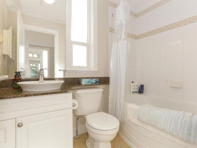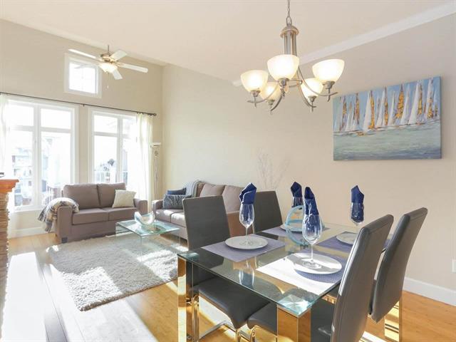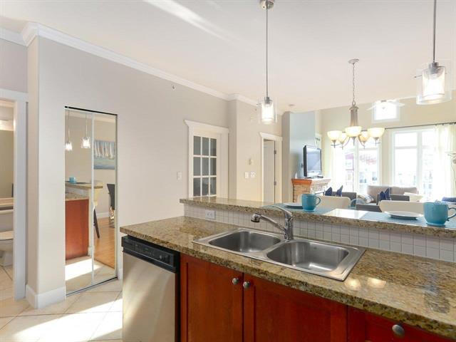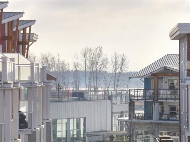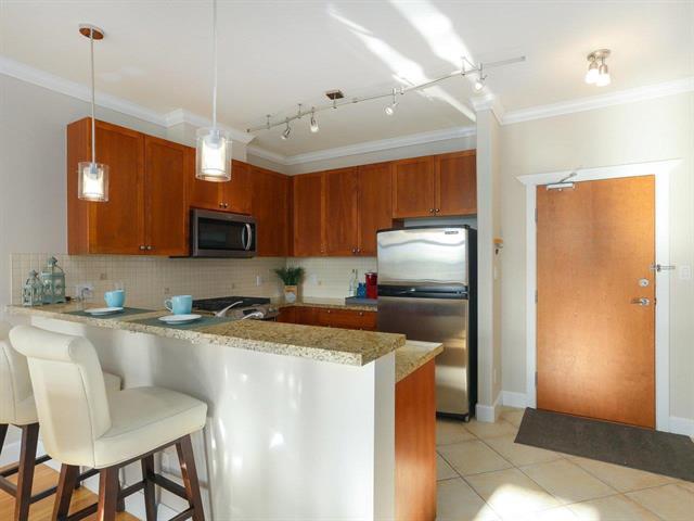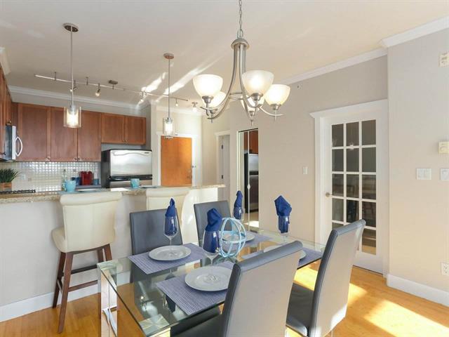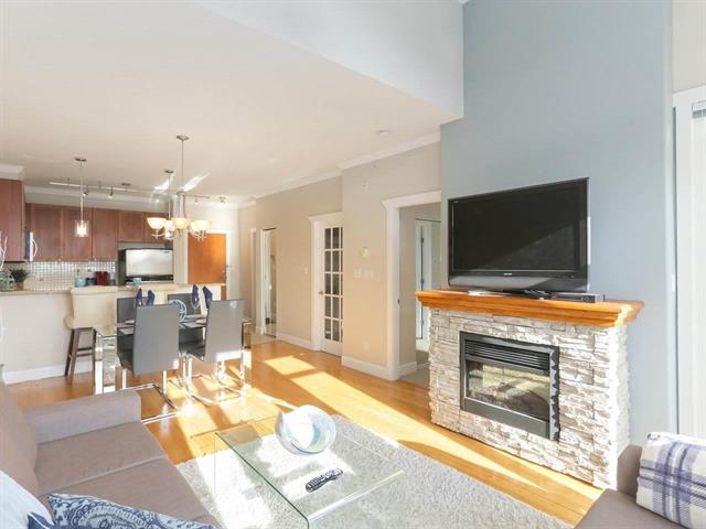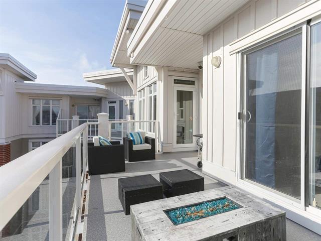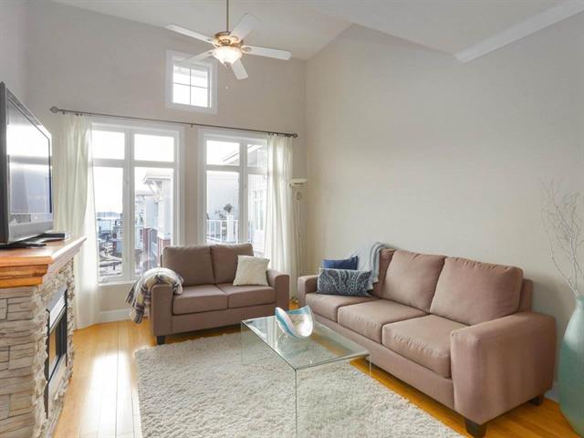 Welcome to this bright & spacious 762SF quiet courtyard facing Penthouse unit with 1 bdrm & den with 1.5 baths & make it your home. Enjoy the South facing partial river views from your bedroom, living room & the oversized balcony. 14' high vaulted ceiling in living area upgraded with real bamboo hardwood flooring. A modern kitchen comes with S/S appliances, gas stove/convection oven, granite breakfast bar & counters, shaker maple cabinets. A large master suite with an ensuite bath & a large closet. A den with ample space for study/office & storage. Upgraded light fixtures, designer paint & much more. Located in one of the most sought after complexes in Steveston “The Village”! Just steps from restaurants, parks, boardwalks and everything Steveston has to offer!