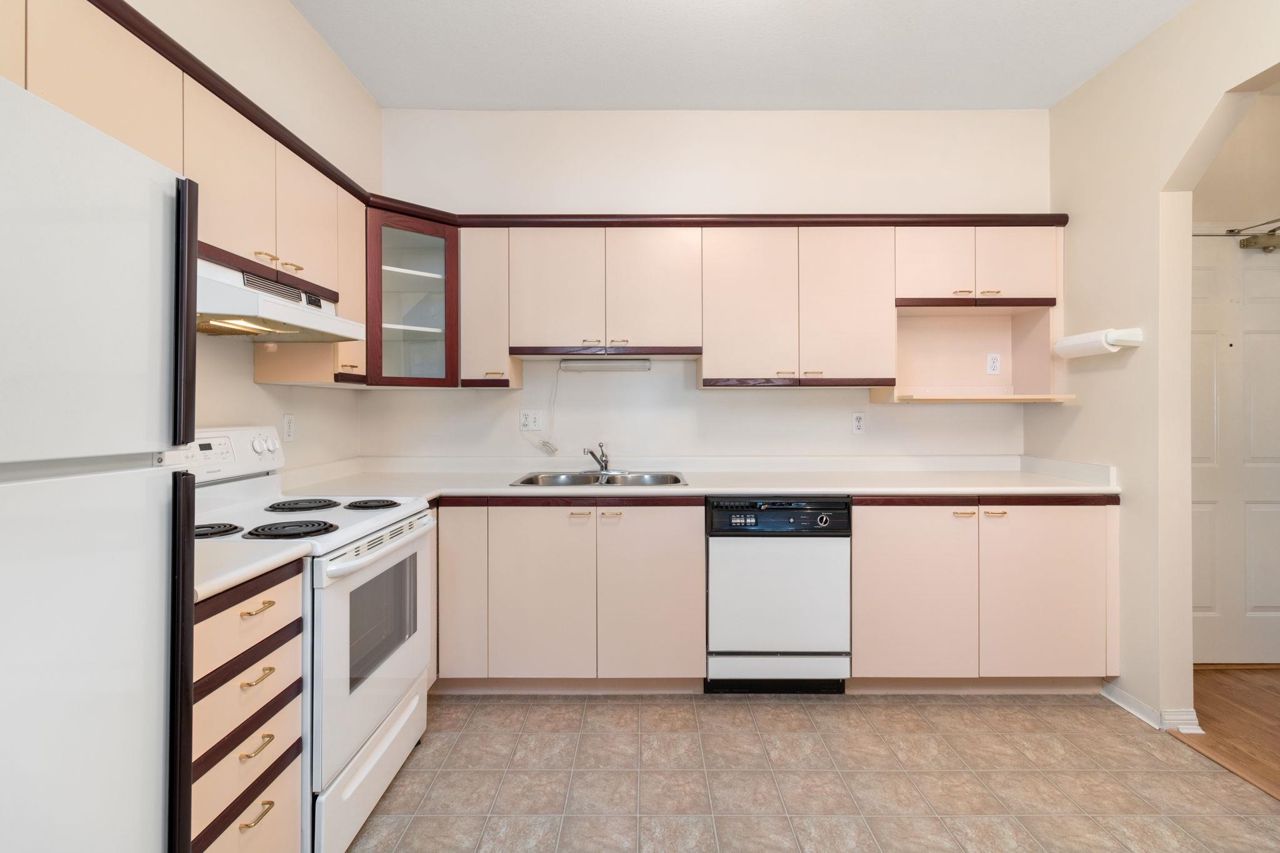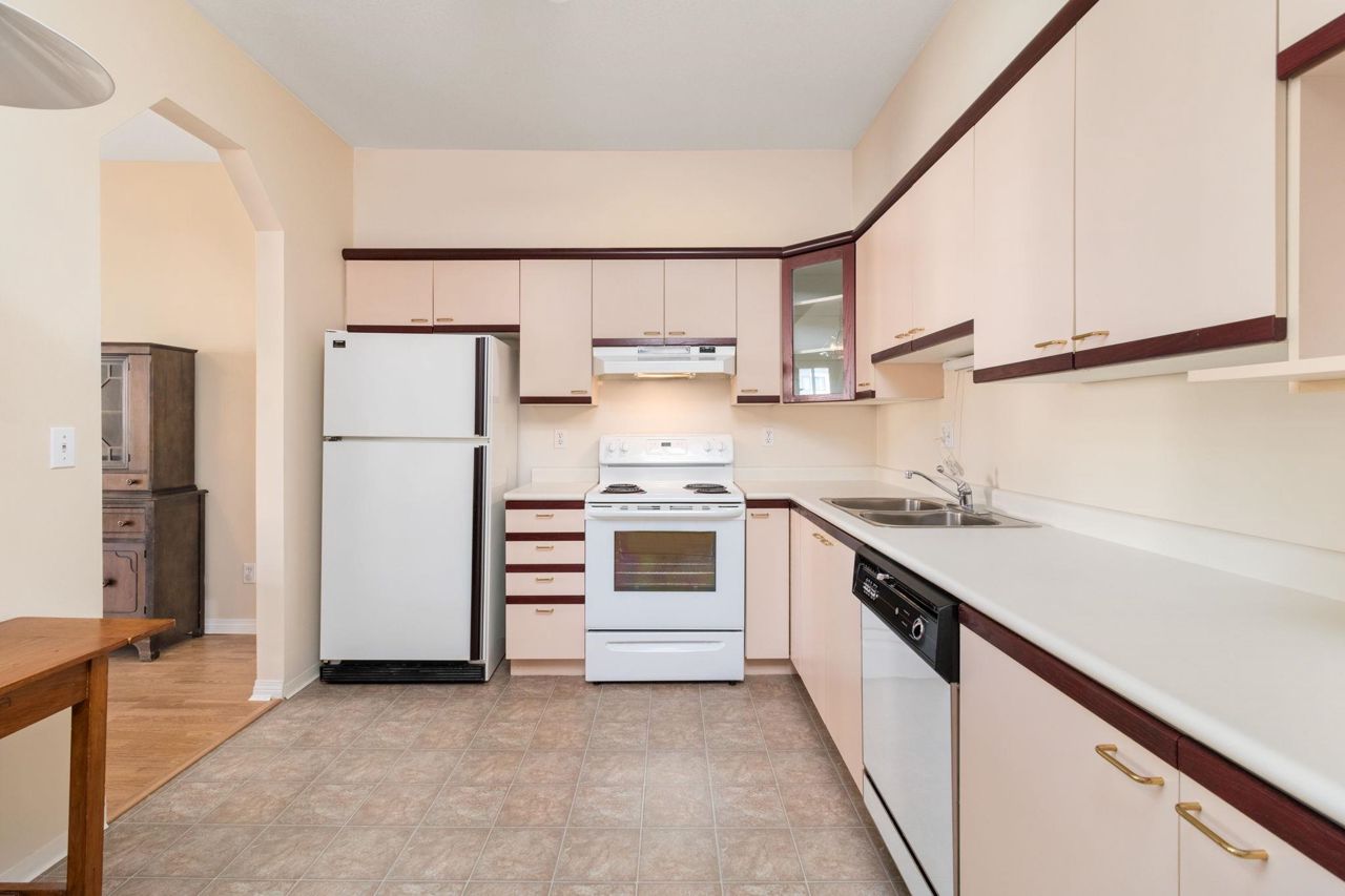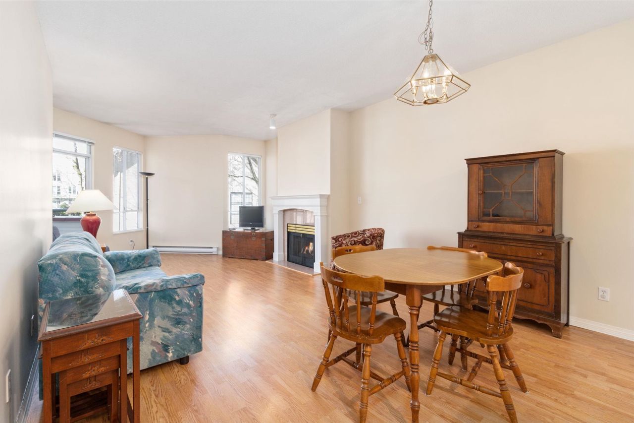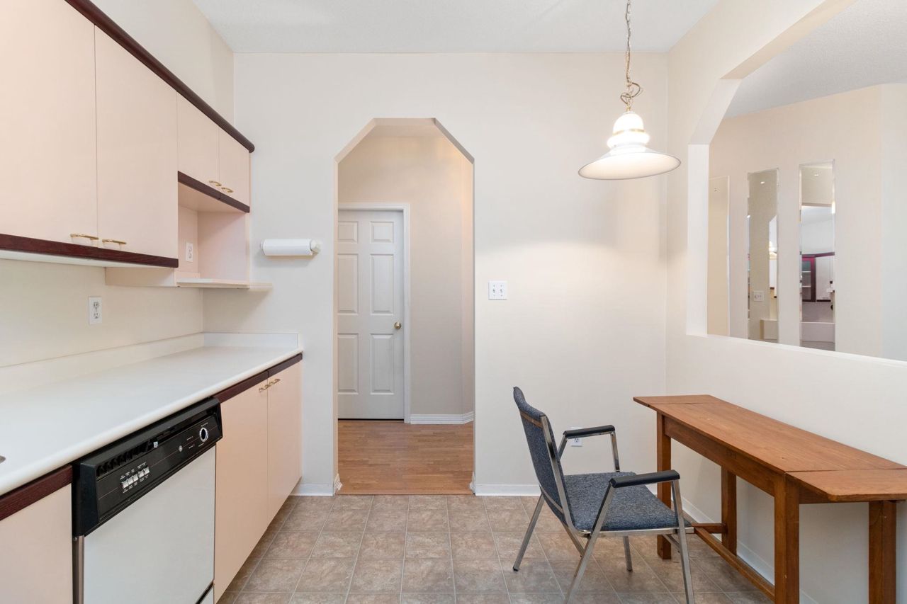 Beautiful home in WINDGATE ROYAL! two bedrooms/two baths (above the ground!), offering approx. 1180 sq. ft. of bright and spacious living area, huge windows with lots of natural light, 9 foot ceilings throughout. Both living room and master bedroom doors lead to a private and serene west facing balcony facing mature trees. Spacious kitchen with its own eating area and ample kitchen cabinets. Beautifully updated with laminate flooring throughout, warm neutral paint, blinds, newer flooring in kitchen, bathrooms and hallway. It comes with gas fireplace, in-suite laundry, 1 secured parking and a locker. Only steps to shops, all levels of schools and transit. Choice building in prime location! Come and visit Open House on Sat, 2-4 pm.
