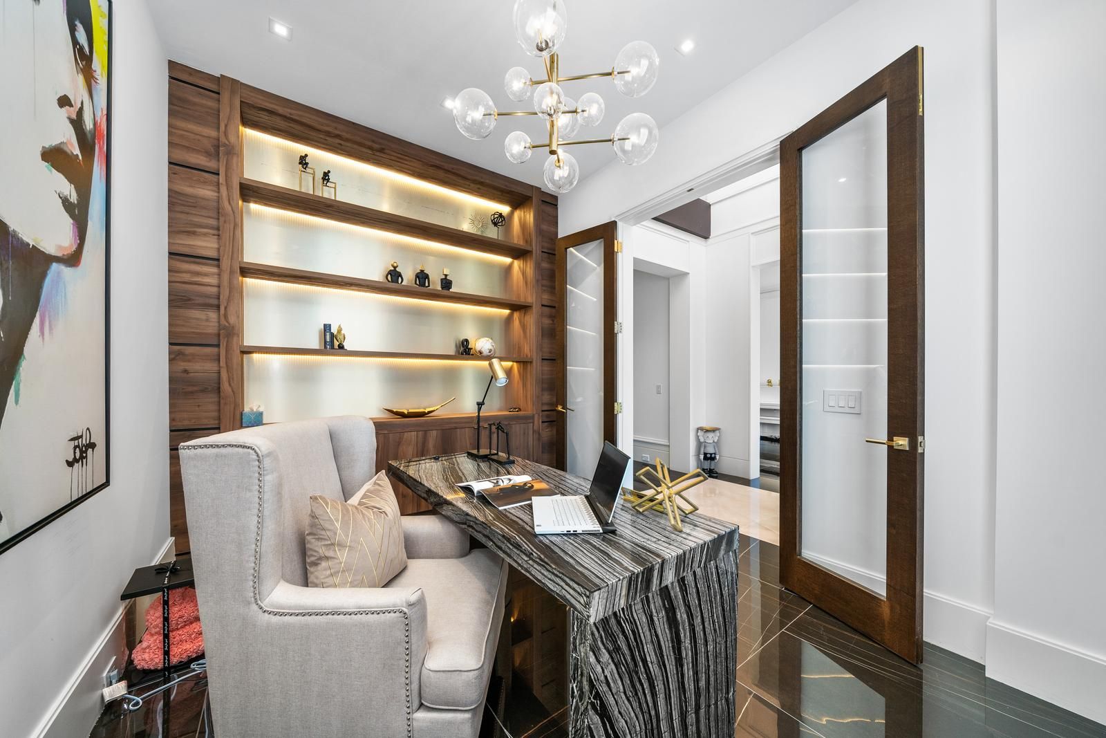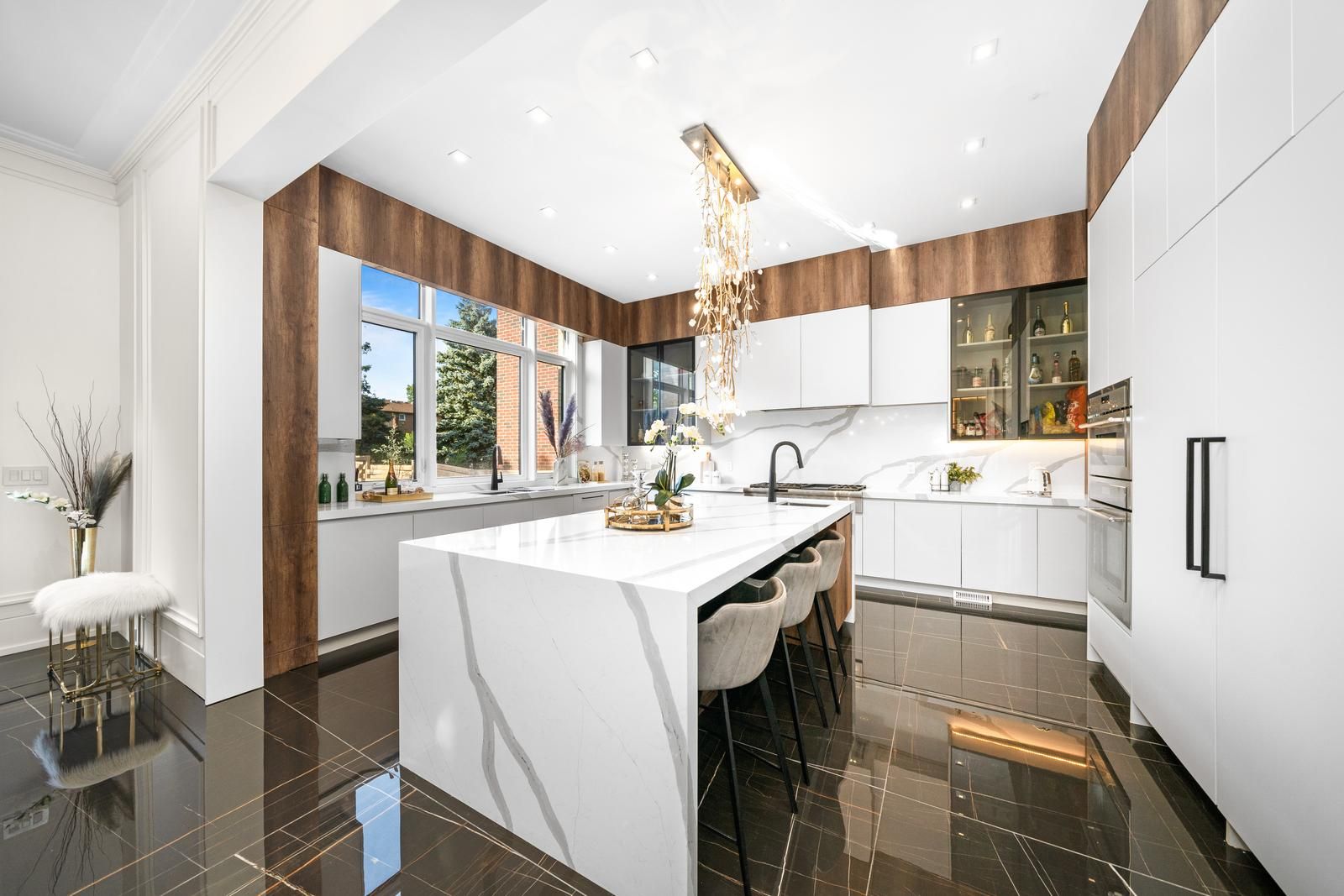 stlye W/spacious principle rm. The chef inspired gourmet kitchen presents quartz countertops, custom cabinetry, waterfall