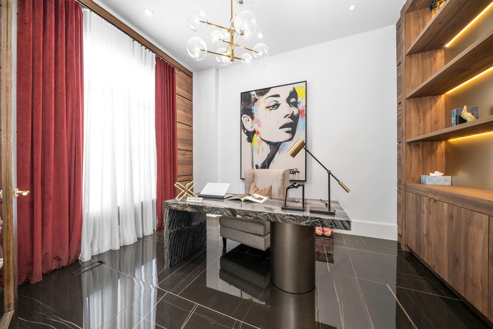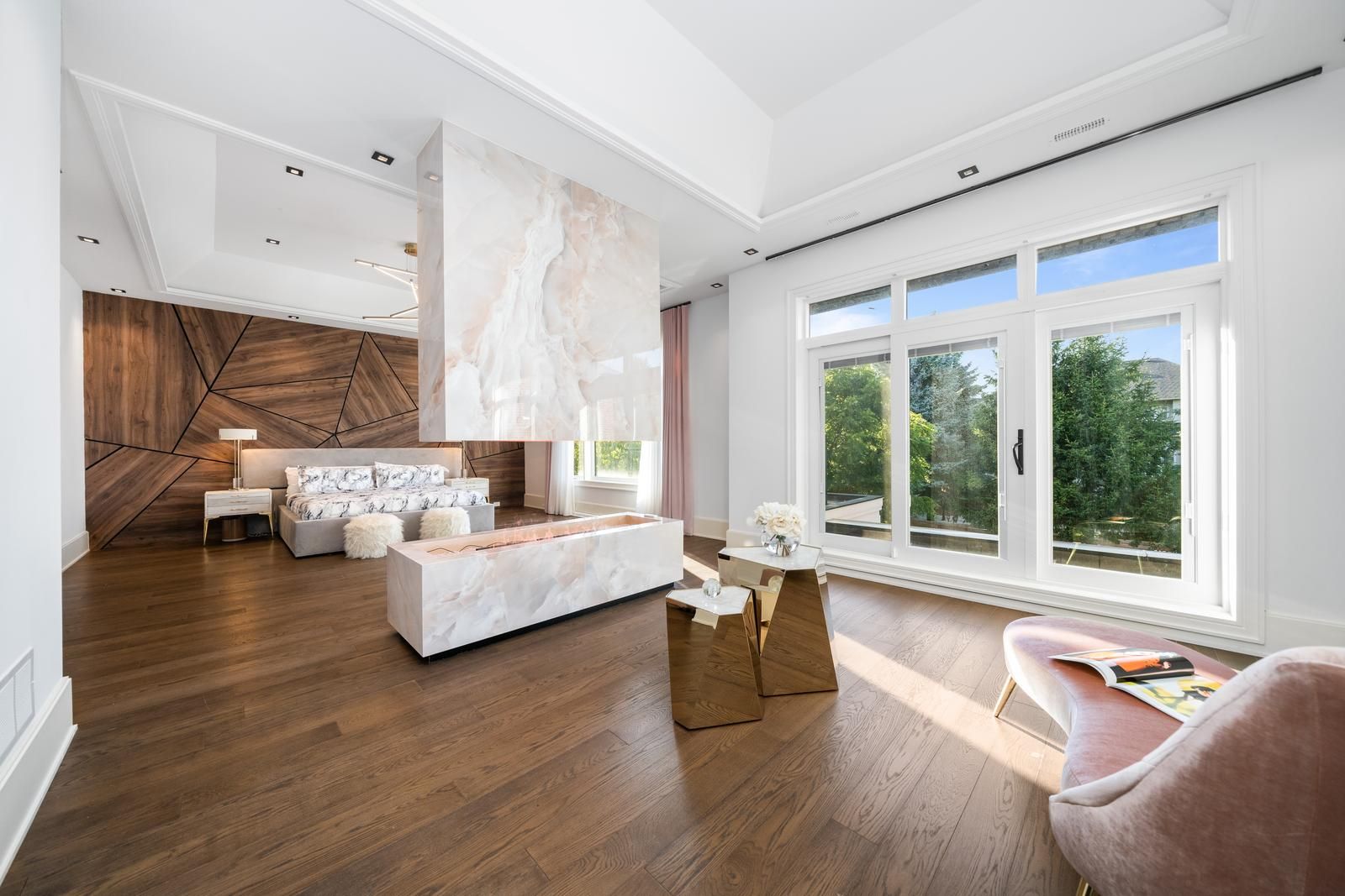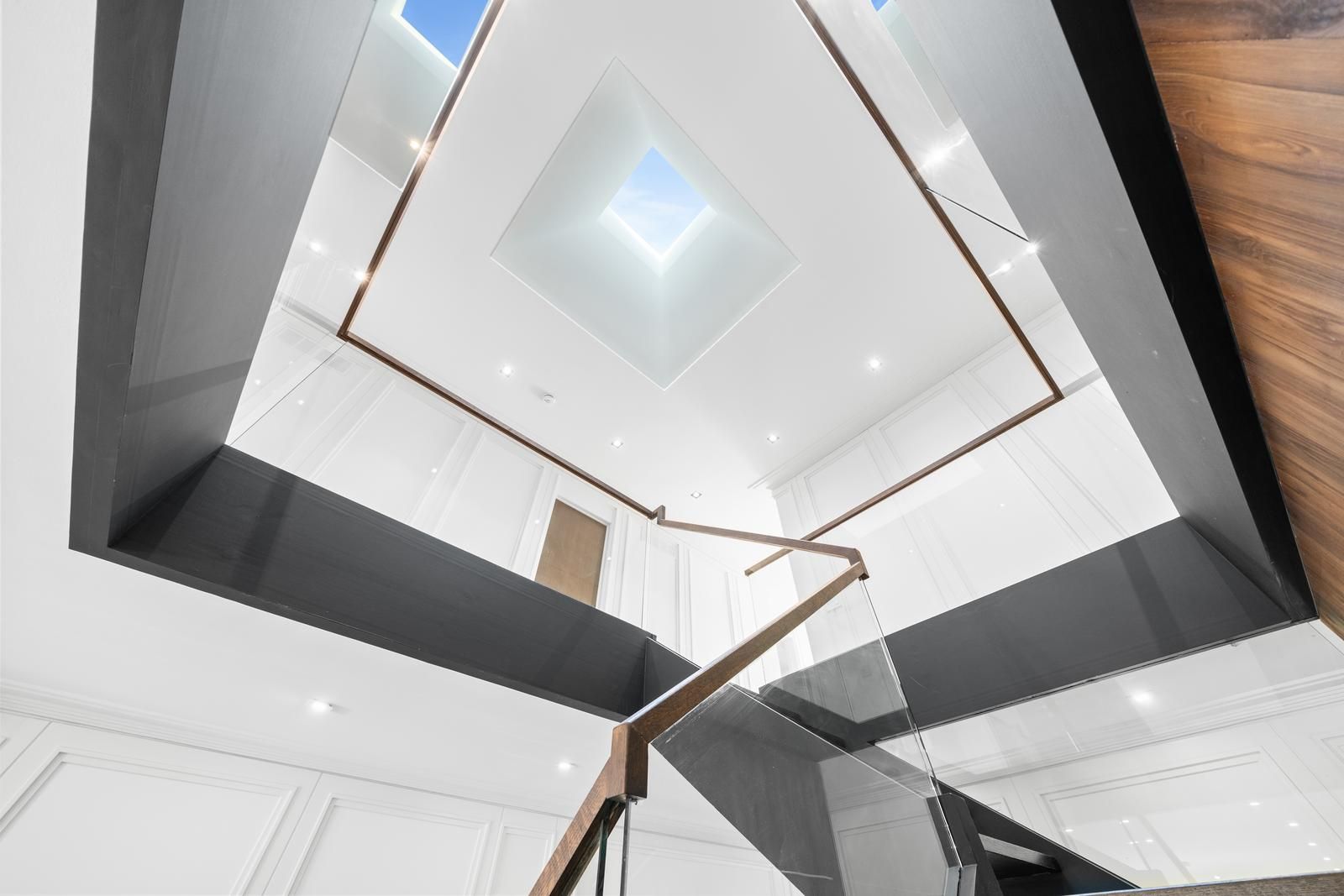 wall,crown moulding,flr to ceil firplaces,bay wdws,skylights,top notch lightings,floating glass stairase.Fully landscaped