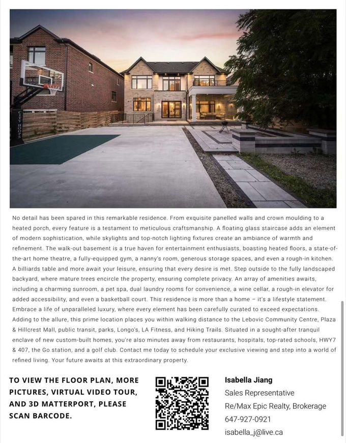 优越的位置使您步行即可到达Lebovic社区中心、广场、Hillcrest购物中心、公共交通、公园、Longo's超市、LA Fitness健身中心等。坐落在幽静的新定制住宅小区,数分钟车程至餐厅、医院、学校、HWY7和407高速公路、GO火车站以及高尔夫俱乐部仅数分钟车程。