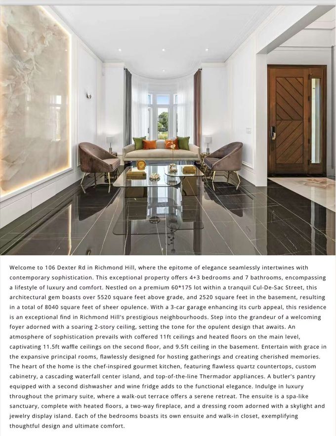 当卓越典雅与现代风尚交相辉映!这座定制豪宅拥有超过5520+2520平方英尺的奢华生活空间,融汇卓越工艺,坐落在一个60*175英尺的顶级地块上,位于宁静的close end街区。三车库,进入宽敞的门厅,高耸的双层天花吊顶营造出豪华设计的氛围。全部加热的主楼层拥有11英尺的coffered ceiling天花板,二楼有11.5英尺的挑高天花板,地下室有9.5英尺的天花板。宽敞的宴客厅。家庭的核心是厨师级别的美食厨房,配有无瑕的石英台面、定制橱柜、瀑布中央岛屿和顶级的Thermador电器。备餐间配备第二台洗碗机和葡萄酒冰箱,功能与优雅并存。主套房奢华至极,走出式露台,双向壁炉和带天窗和珠宝展示岛的更衣室,宛如水疗般的厕所。地上4个房间。每间卧室都设有独立套间和步入式衣橱,体现周到设计和极致舒适。从精美的镶板墙壁和皇冠molding到加热门廊,每个特色都见证了精湛的工艺。悬浮式玻璃楼梯增添了现代精致感,而天窗和高级照明设备营造出温馨高雅的氛围。