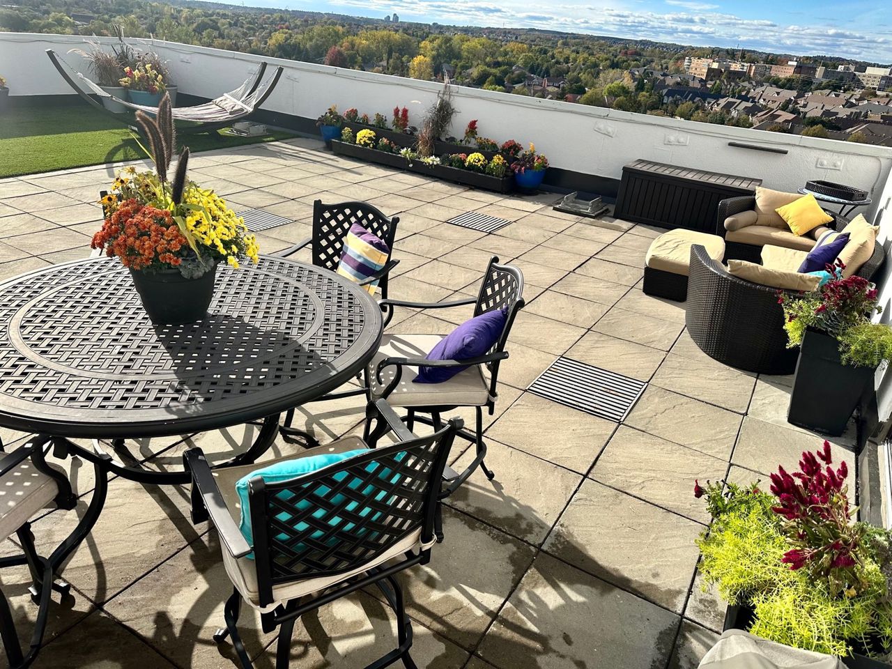 Stunningly Bright Luxury Penthouse Condo At Dynasty II. Renovated Professionally With Tasteful Finishes, 1 Plus Den Open Layout (Can Be Converted back to 2nd Bedroom), Solarium Style Skylight Windows Bring in Incredible Natural Light. 2 Full Spa Like Washrooms. Huge Spectacular Terrace With Unobstructed Panoramic South-West CN Tower View 1200+ Square ft of Outdoor Space!. Enjoy Open Concept, High-End Kitchen Granite Counters and Limestone Tile Backsplash, Safe and Quiet, Security Gated Complex. Tandem Underground Parking For 2 Full Size Cars. Fantastic Amenities and Parklike Outdoor Space to Enjoy. Prestigious Richmond Hill Location Close to highways Shopping, Restaurants and Great Schools.Indoor Pool, Hot Tub, Sauna, Full Gym, Games Room, Billiards, Tennis & Squash Courts, Golf Room, Party/Meeting Rm, 24 Hour Security, Outdoor BBQs and Park Like Spaces to Enjoy.