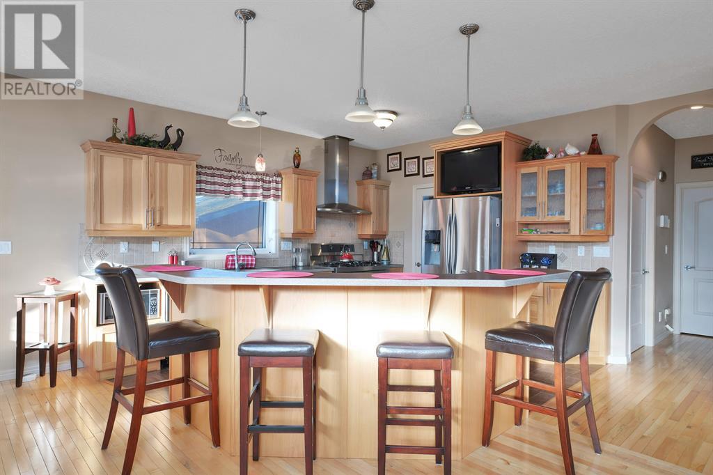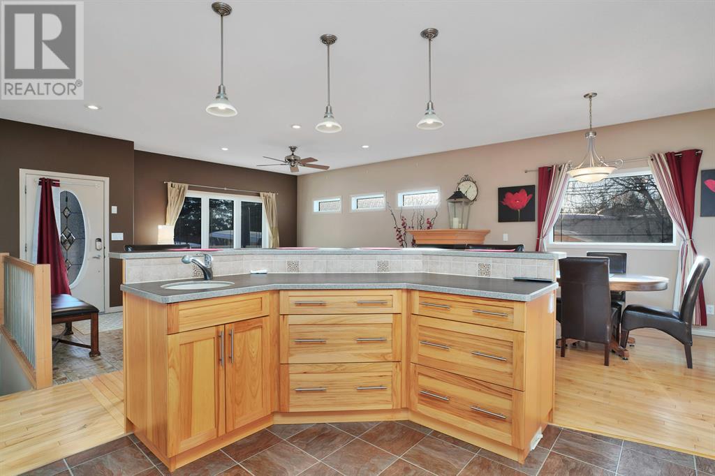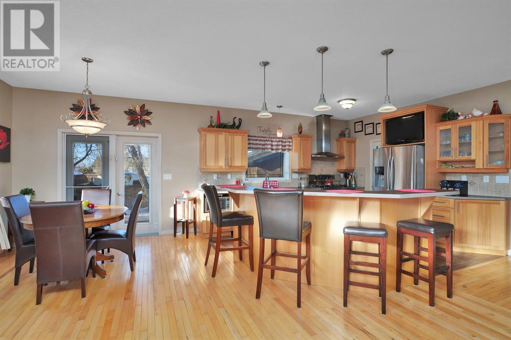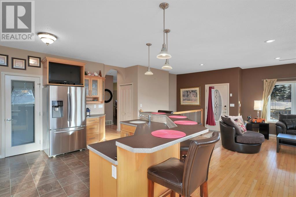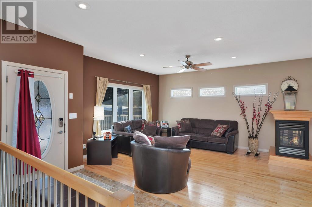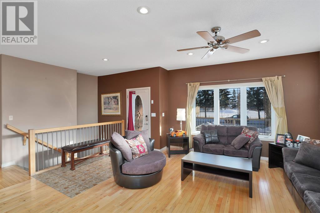Are you wanting the IDEAL Home in a Friendly, Rural Community to raise your Family in? This beautiful 4 bed, 3 bath home has it all! Located on an extra large lot within walking distance to many of Rimbey's amenities including a variety of restaurants, shopping, schools, swimming pool, community centre and hospital. This home is situated right across from a large playground so not only will you not have neighbouring houses across the street but you can watch the kids run off some energy while relaxing on your own covered porch. As you enter the home you will find that every detail to living in style and comfort has been thought of throughout every level. The spacious, open concept main floor includes a comfortable living room partially seperated from the dining room by a free-standing gas fireplace. A large, raised island has plenty of room for sitting and keeping the cook company and even has an additional sink/garburetor. Tons of cupboard space, a main sink/garburetor, high quality appliances, gorgeous gas stove and huge walk-in pantry make this kitchen every family chef's dream! Patio doors leading to the 2 tiered back deck add to your culinary options with plenty of room for the BBQ expert. The remainder of the main floor consists of a bedroom (office), 4 pc bath and spacious laundry room with a handy, fold down ironing board, impressive amount of storage cabinets (so much storage in this home!) that is conveniently located with access to the attached 2 car garage. Upstairs you will find your own private retreat in the massive primary bedroom with its' sizable walk-in closet and 4pc ensuite complete with his and her sinks and a steam shower with extra jets. There's even a handy 'over the stairs' storage cubby for your luggage etc. Downstairs you will find a huge rec room, 2 more good sized bedrooms, a 4pc bathroom, the utility room and a den (currently home to a tanning bed). The backyard is fenced, private and has a firepit area as well as a heate d 24' x 24' detached garage with 16' door and back alley access. Did we mention that the lot is large enough to accomodate plenty of RV parking to the west of the home? Low maintenance landscaping adds to the warm feel of this home that was designed to be lived in and loved! (id:22211)