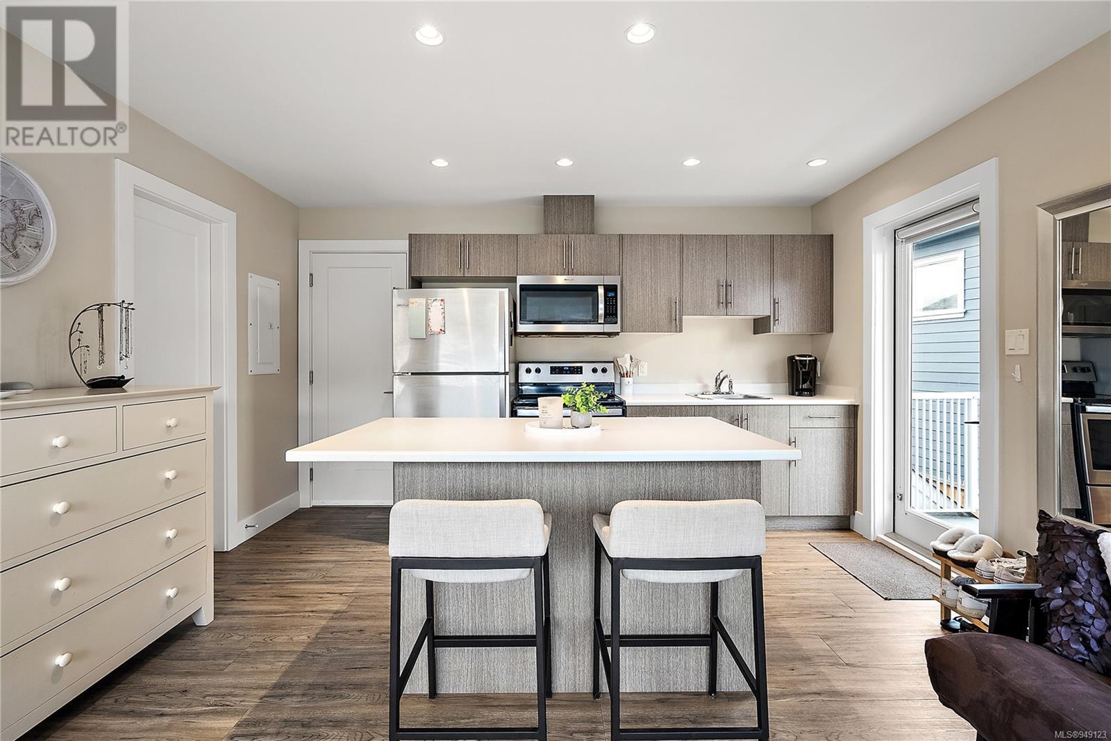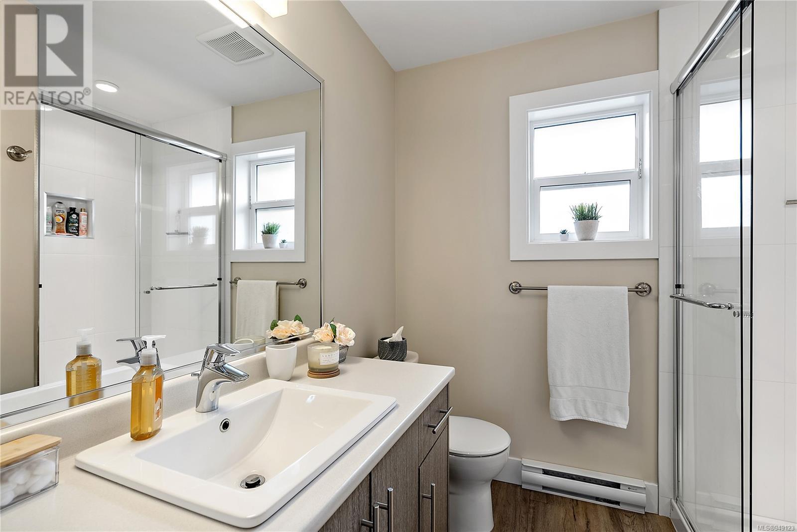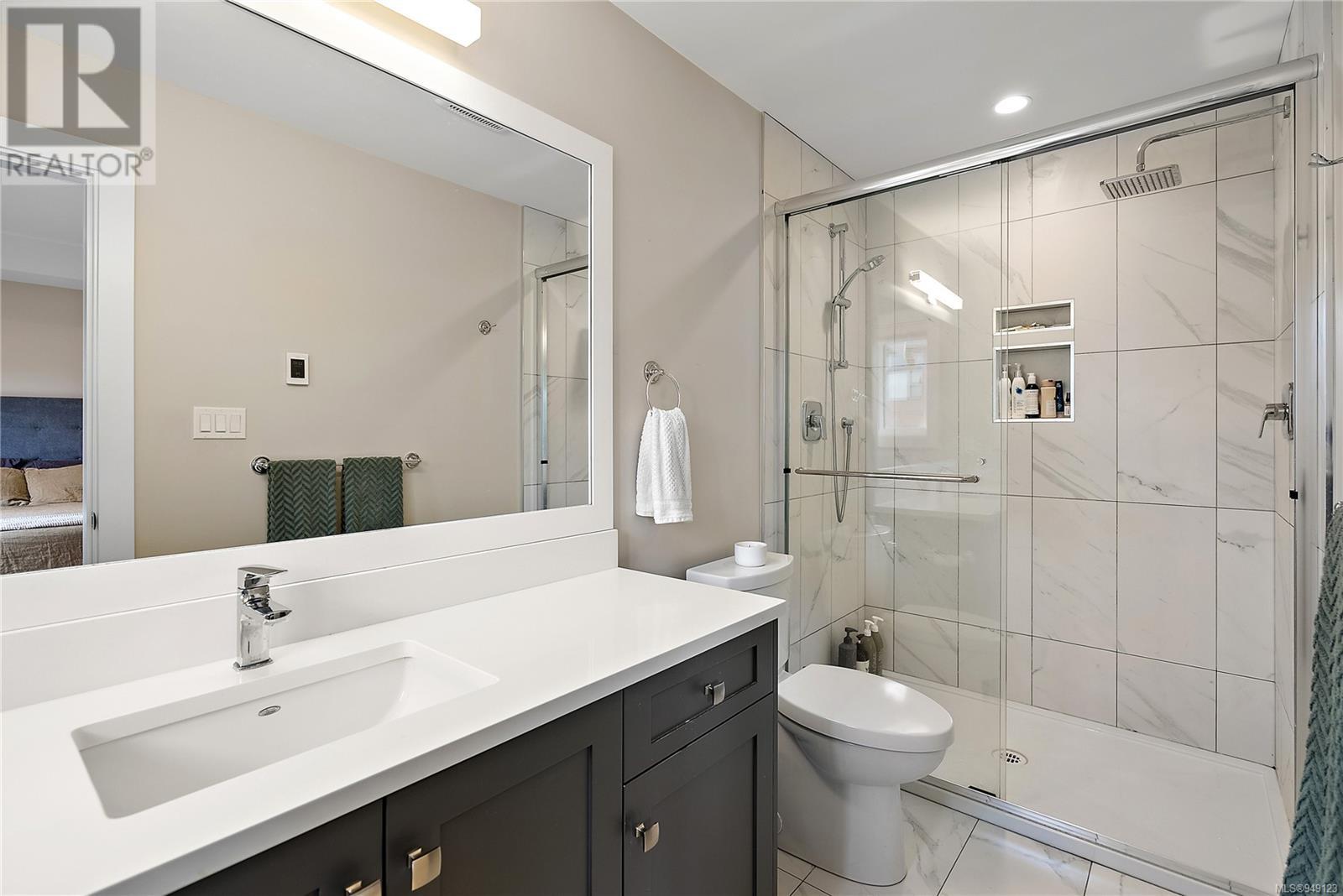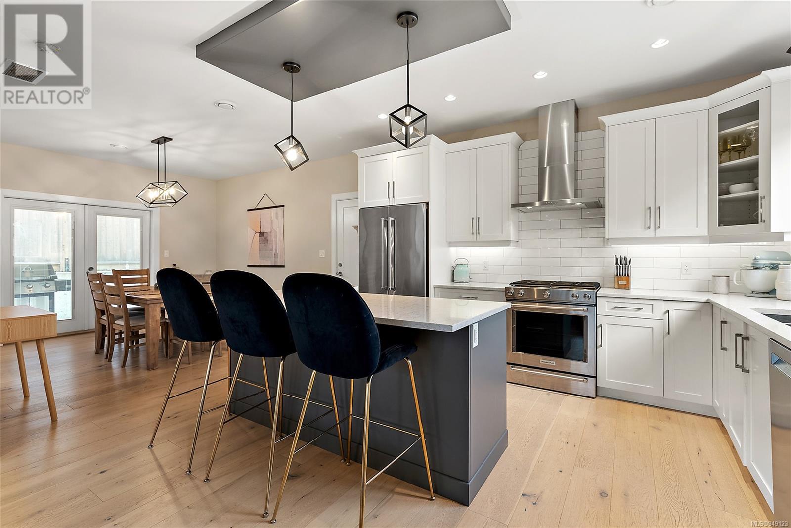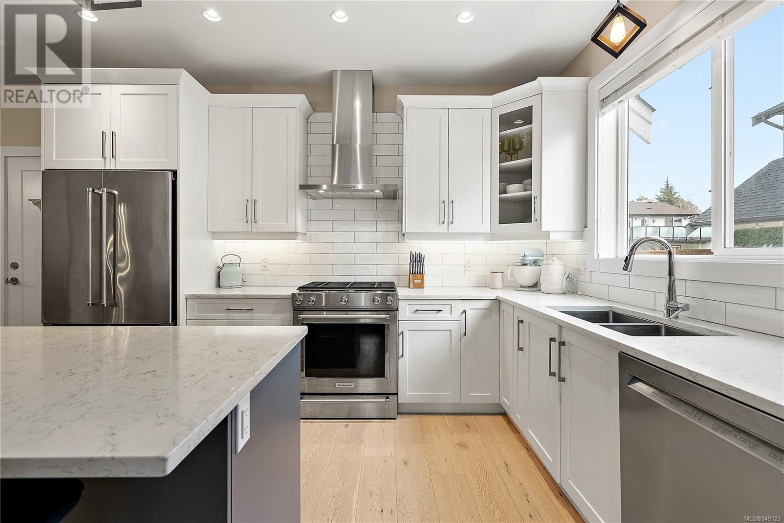 Located on a quiet culdesac in Saanich East, amongst beautiful brand new homes, awaits this stunning 2019 built 3 bed, 4 bath home with separate legal above garage bachelor suite. Boasting open concept living on the main level, with a spacious living room, dreamy kitchen with gorgeous quartz countertops, gas cook top, SS KitchenAid appliances, and dining room with double French doors to the patio. This lovely family home offers 3 bedrooms and 2 bathrooms upstairs with an adjoining, above garage bachelor suite complete with 3 pc bathroom, kitchen, separate laundry and its own separate entrance. Other amazing features include beautiful hard wood flooring, 9' ceilings, heated flooring in the ensuite, large laundry room, a double car garage, full landscaped yard with irrigation, heat pump, tankless gas hot water, and a very energy efficient home! This is your chance to own in the highly desirable, very central area of high Quadra - close to all amenities! (id:22211)