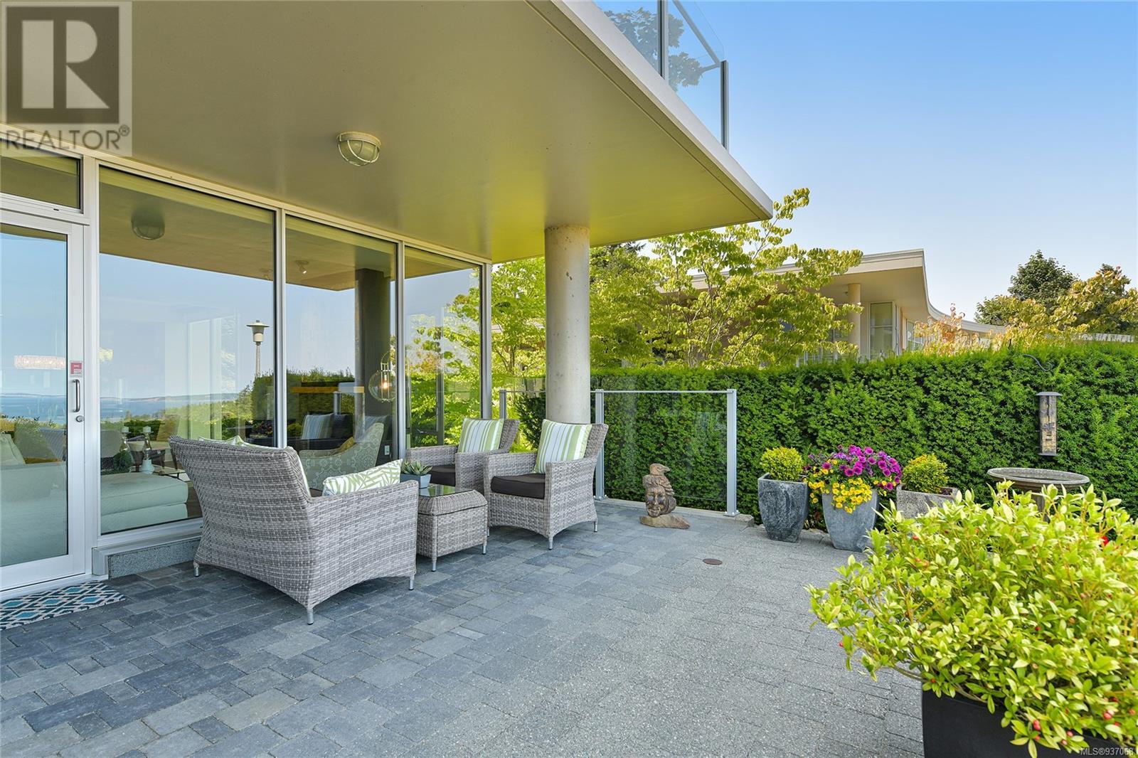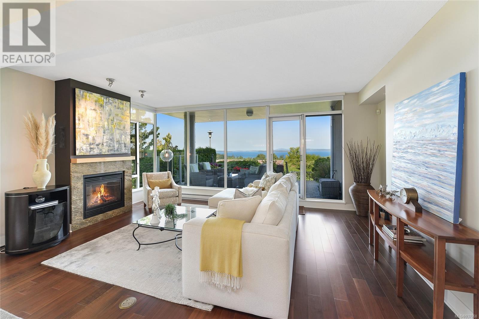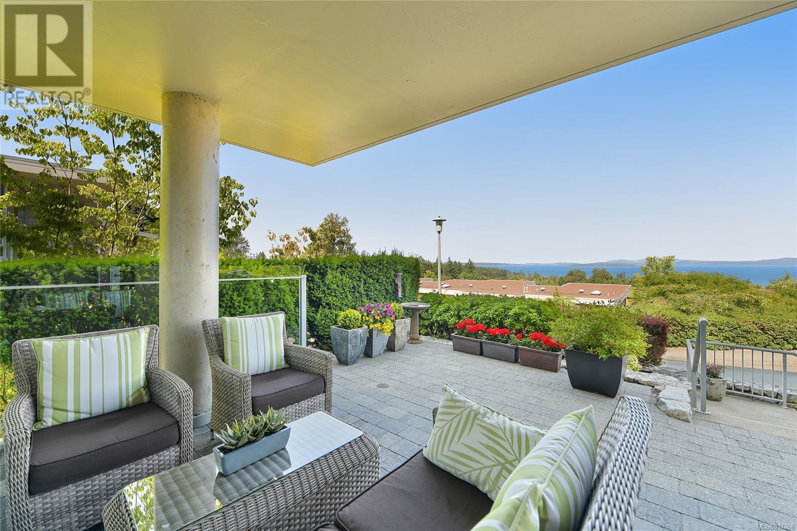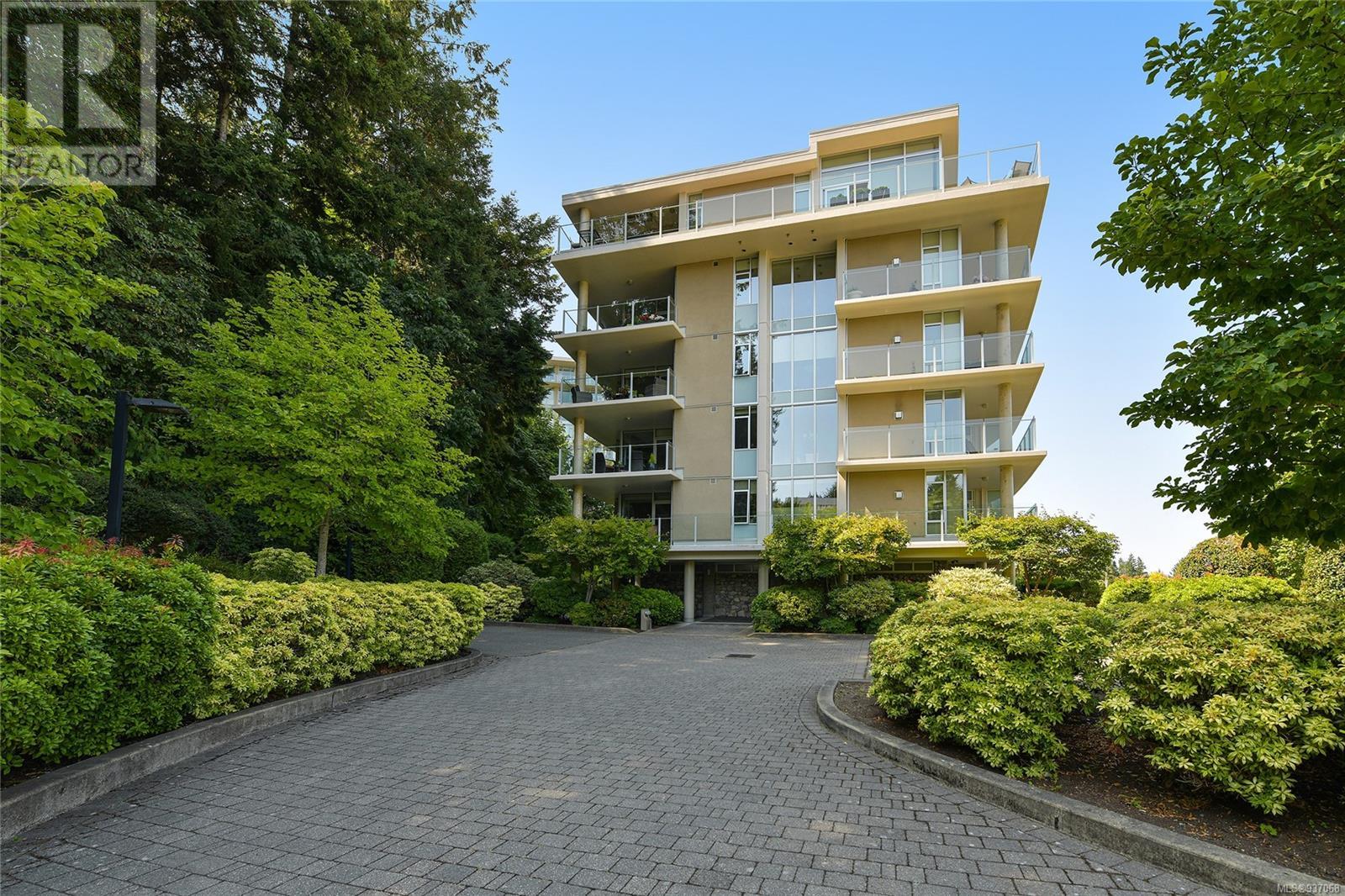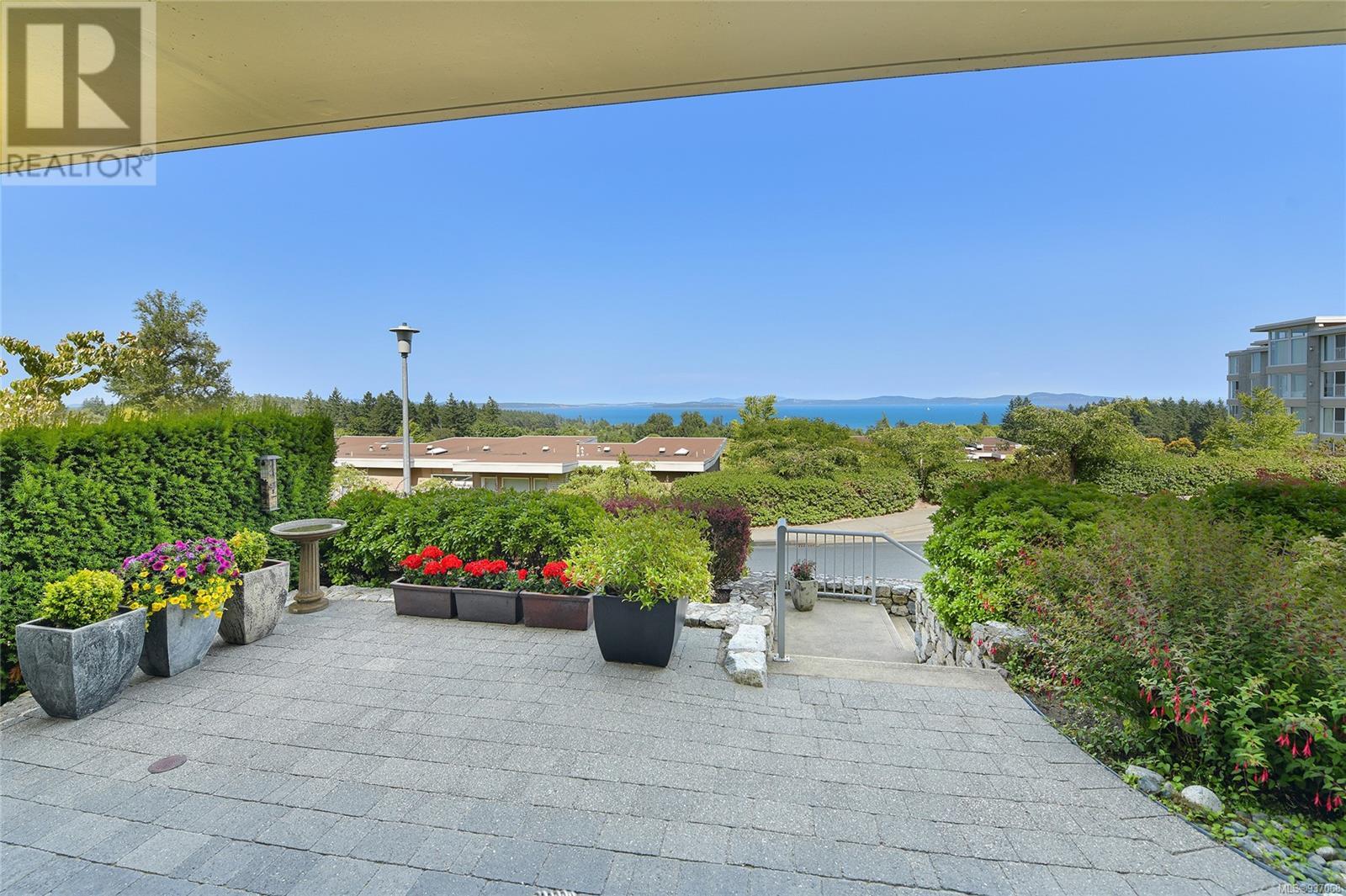 SAYWARD HILL offers Victoria's best VIEWS & LIFESTYLE, overlooking world-class golf at Cordova Bay, sandy beaches, walking/biking trails, shops at Mattick's Farm all nearby. This premiere, 2008 JAWL concrete/steel building is sought-after with its corner location, amazing natural light and walk-out view patios of 1100sf for true outdoor west coast living. An elegant home, meticulously maintained, fantastic layout with 1,773sf, feels more like a Townhouse with main level entry. Perfect for entertaining in the Chef's kitchen with KitchenAid s/steel appliances, 11' granite island, gas BBQ connection to dine alfresco capturing stunning views of Mt. Baker to the East or relax on the SW private treed view patio. The Primary retreat offers spa-styled ensuite, heated floors, soaker tub, over-sized walk-in closet leading to a separate laundry room. Media Room, Home Office/Pantry & separate Guest Bedroom/Bath make this an exceptional home. 2 secured parking stalls with EV Charging & storage too! (id:22211)