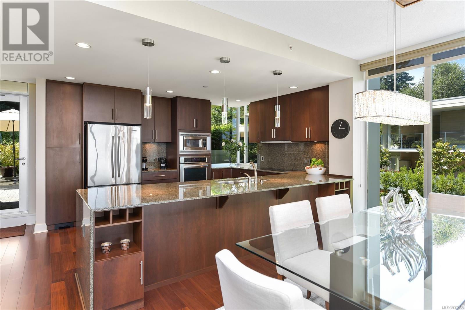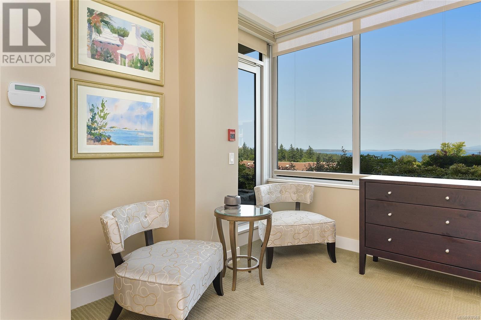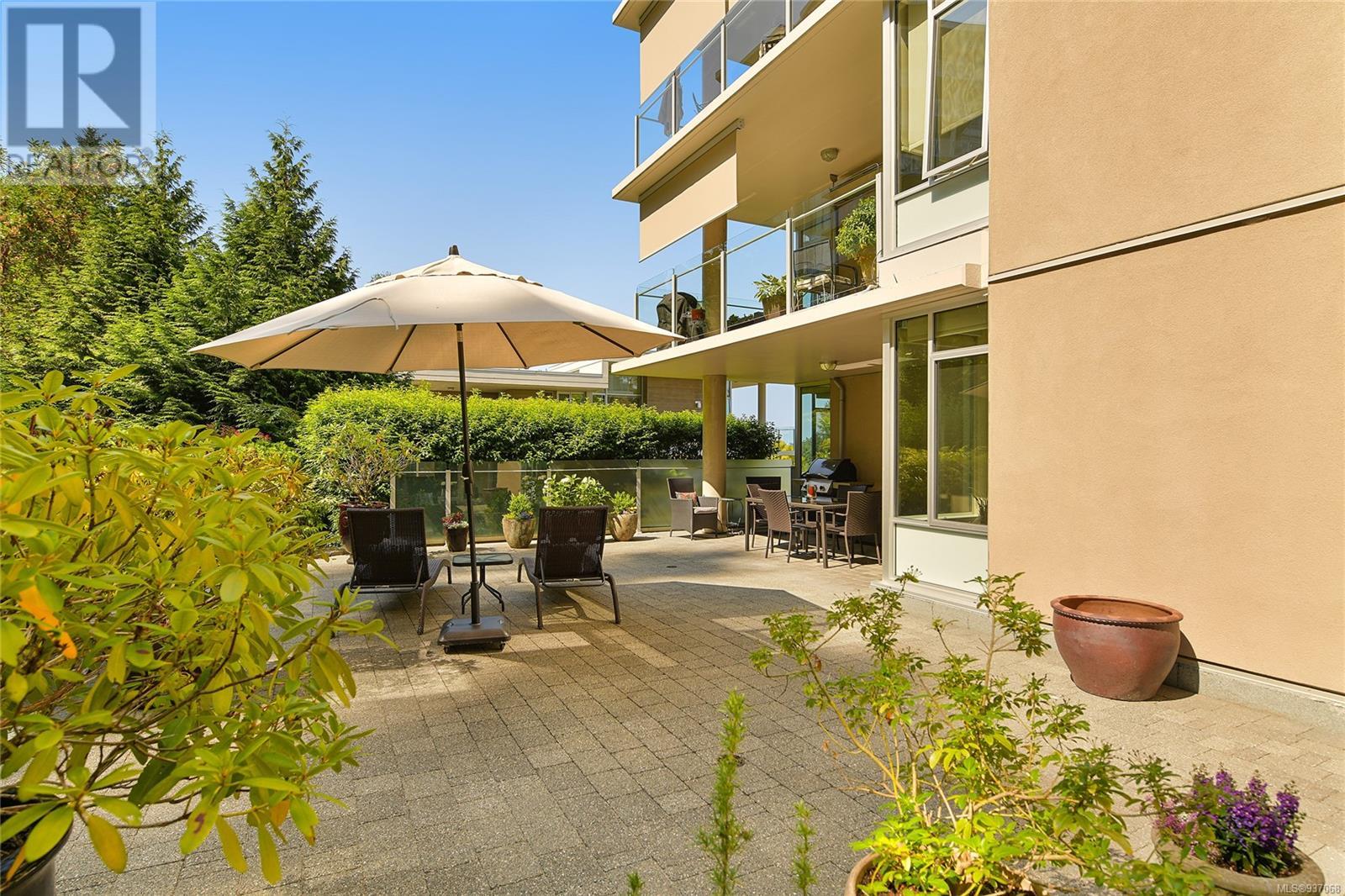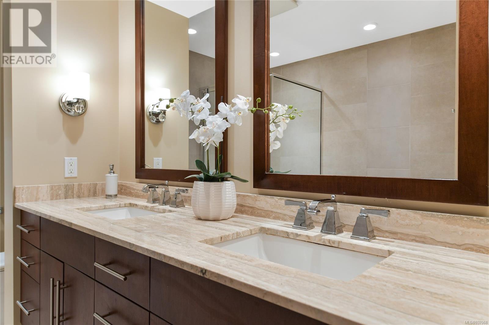 SAYWARD HILL offers Victoria's best VIEWS & LIFESTYLE, overlooking world-class golf at Cordova Bay, sandy beaches, walking/biking trails, shops at Mattick's Farm all nearby. This premiere, 2008 JAWL concrete/steel building is sought-after with its corner location, amazing natural light and walk-out view patios of 1100sf for true outdoor west coast living. An elegant home, meticulously maintained, fantastic layout with 1,773sf, feels more like a Townhouse with main level entry. Perfect for entertaining in the Chef's kitchen with KitchenAid s/steel appliances, 11' granite island, gas BBQ connection to dine alfresco capturing stunning views of Mt. Baker to the East or relax on the SW private treed view patio. The Primary retreat offers spa-styled ensuite, heated floors, soaker tub, over-sized walk-in closet leading to a separate laundry room. Media Room, Home Office/Pantry & separate Guest Bedroom/Bath make this an exceptional home. 2 secured parking stalls with EV Charging & storage too! (id:22211)