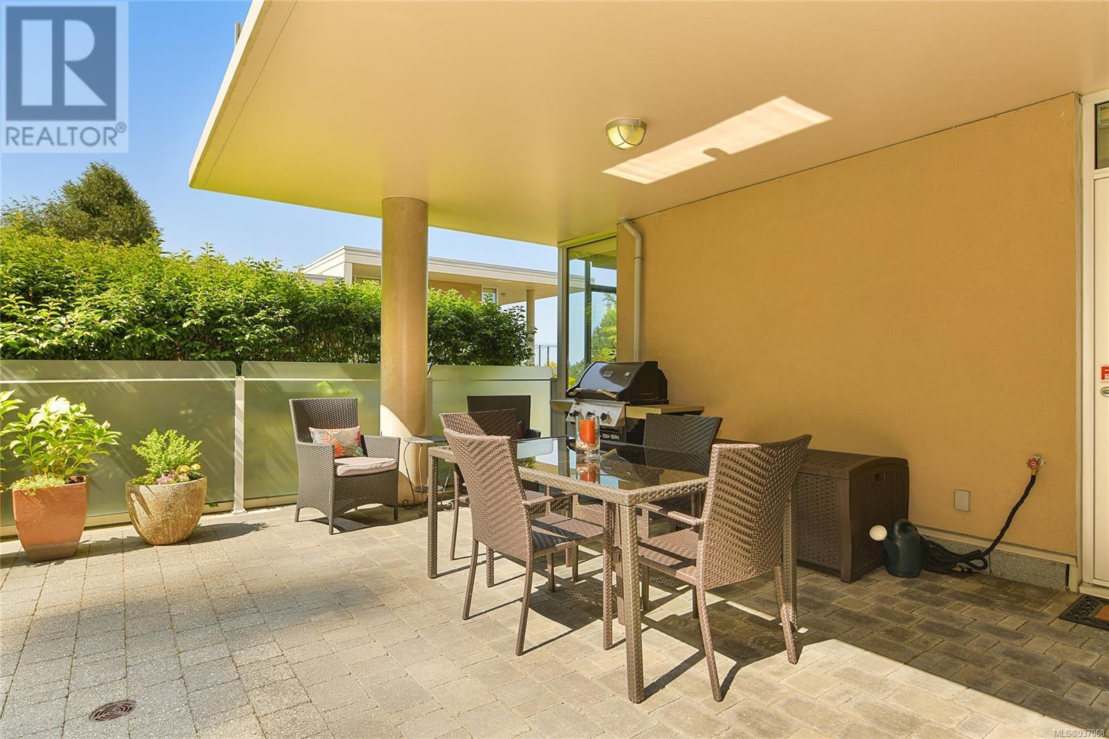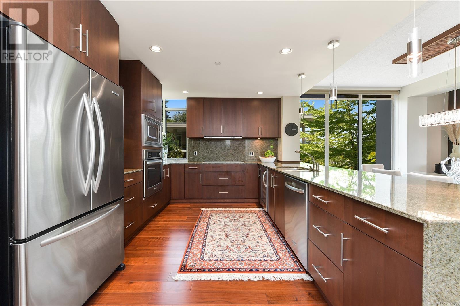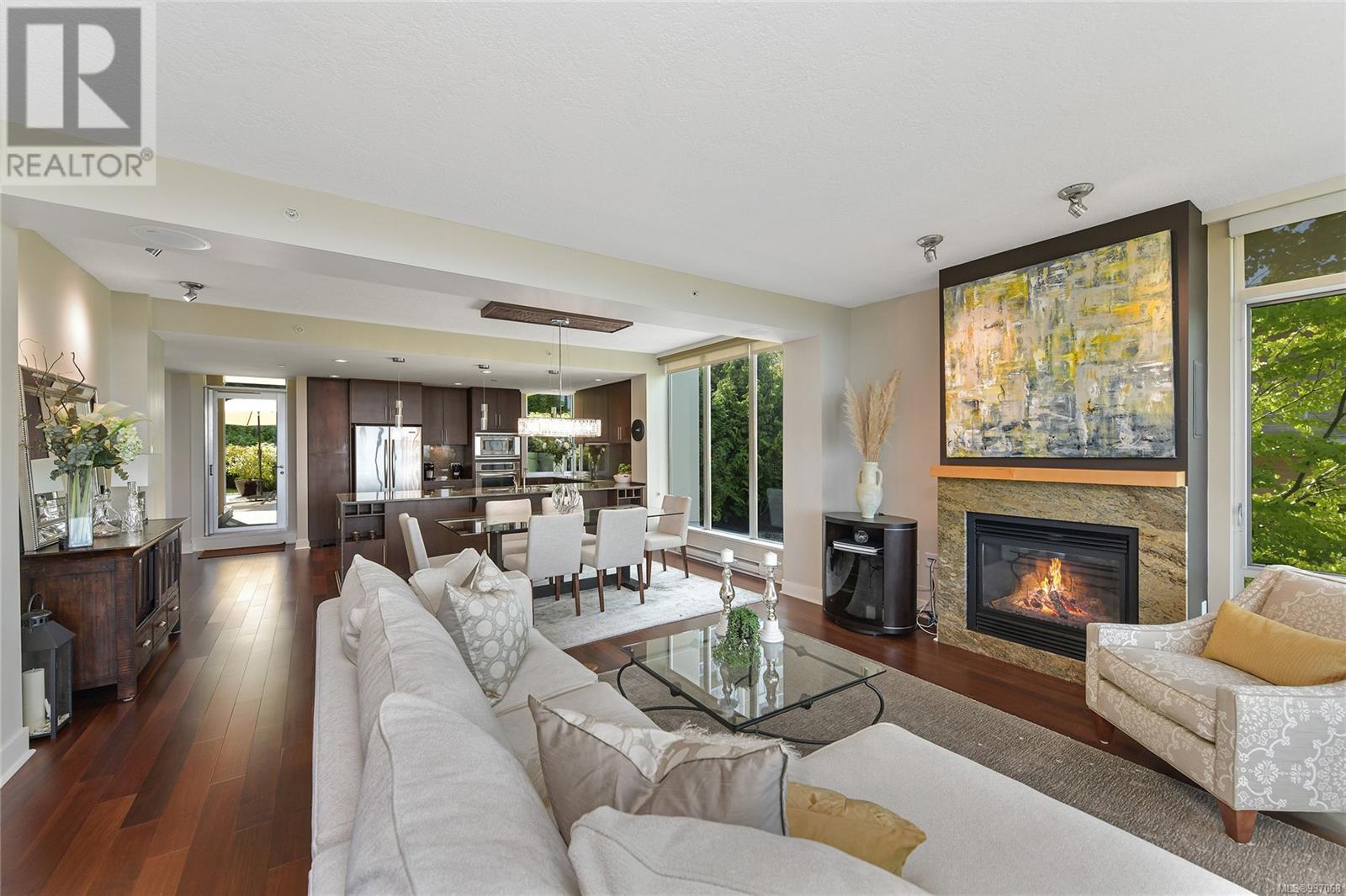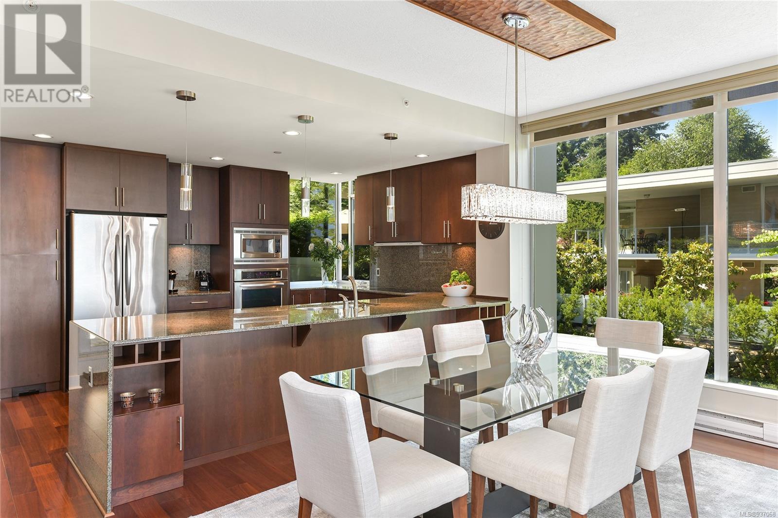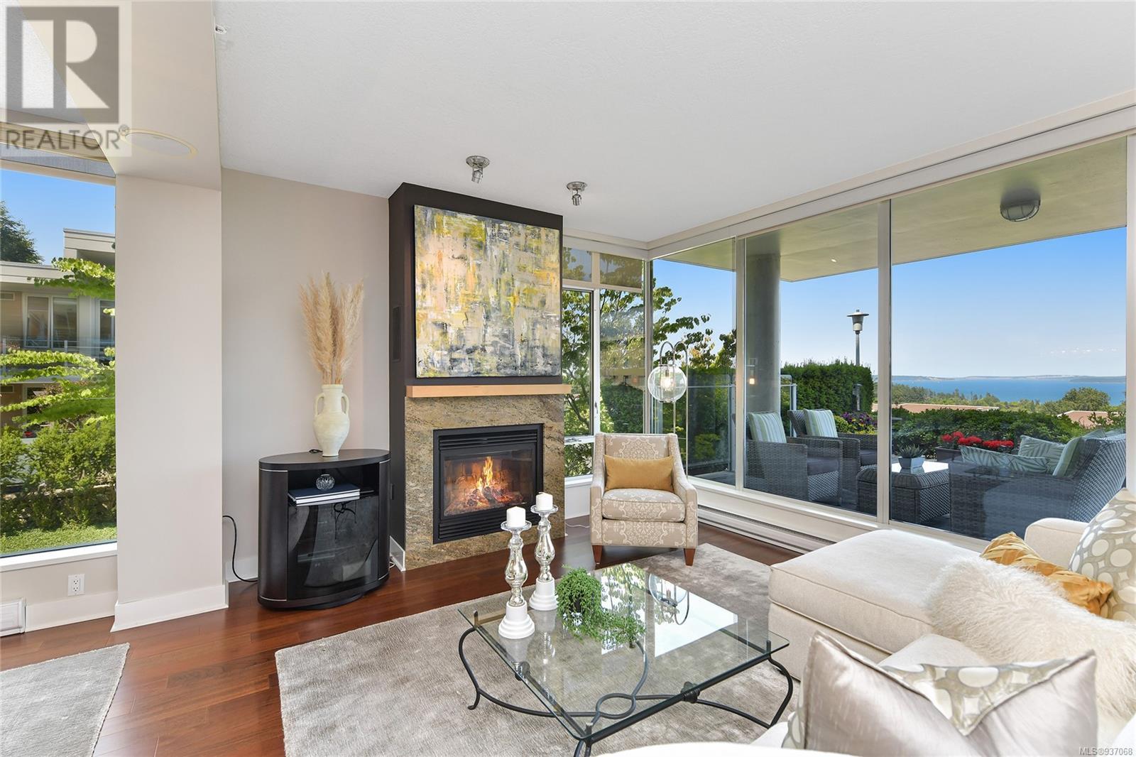 SAYWARD HILL offers Victoria's best VIEWS & LIFESTYLE, overlooking world-class golf at Cordova Bay, sandy beaches, walking/biking trails, shops at Mattick's Farm all nearby. This premiere, 2008 JAWL concrete/steel building is sought-after with its corner location, amazing natural light and walk-out view patios of 1100sf for true outdoor west coast living. An elegant home, meticulously maintained, fantastic layout with 1,773sf, feels more like a Townhouse with main level entry. Perfect for entertaining in the Chef's kitchen with KitchenAid s/steel appliances, 11' granite island, gas BBQ connection to dine alfresco capturing stunning views of Mt. Baker to the East or relax on the SW private treed view patio. The Primary retreat offers spa-styled ensuite, heated floors, soaker tub, over-sized walk-in closet leading to a separate laundry room. Media Room, Home Office/Pantry & separate Guest Bedroom/Bath make this an exceptional home. 2 secured parking stalls with EV Charging & storage too! (id:22211)