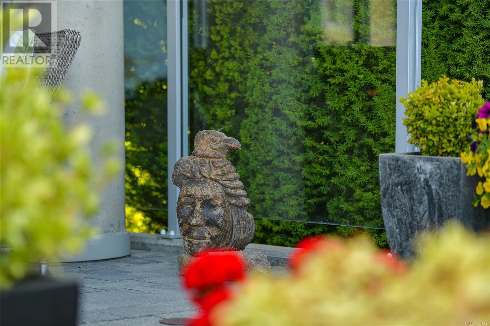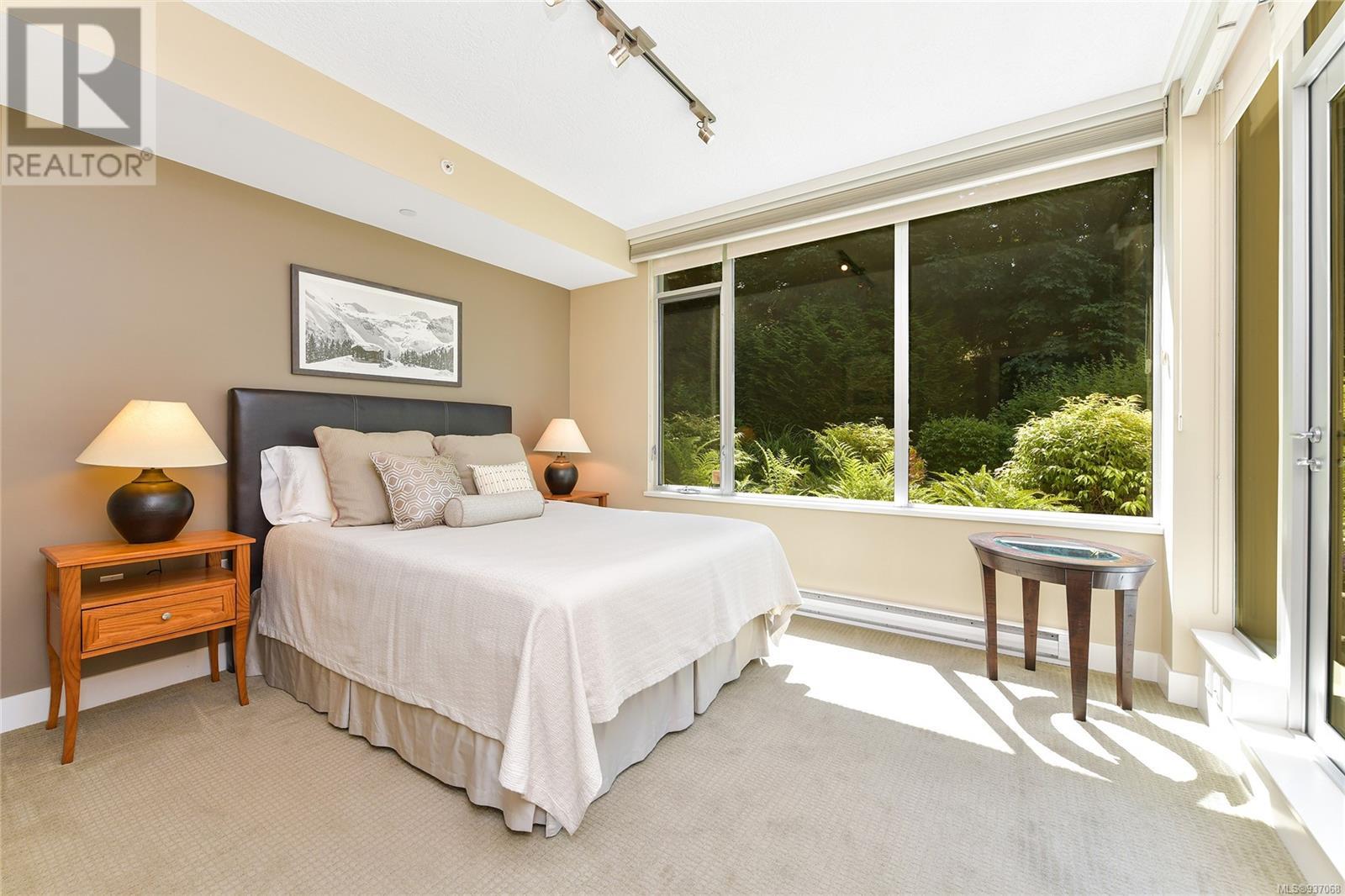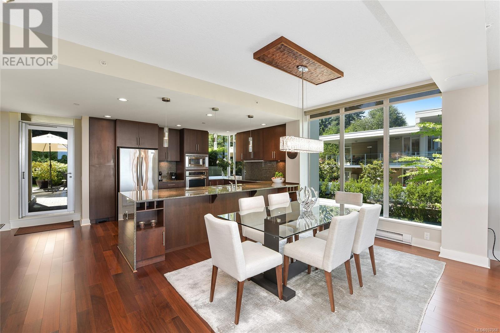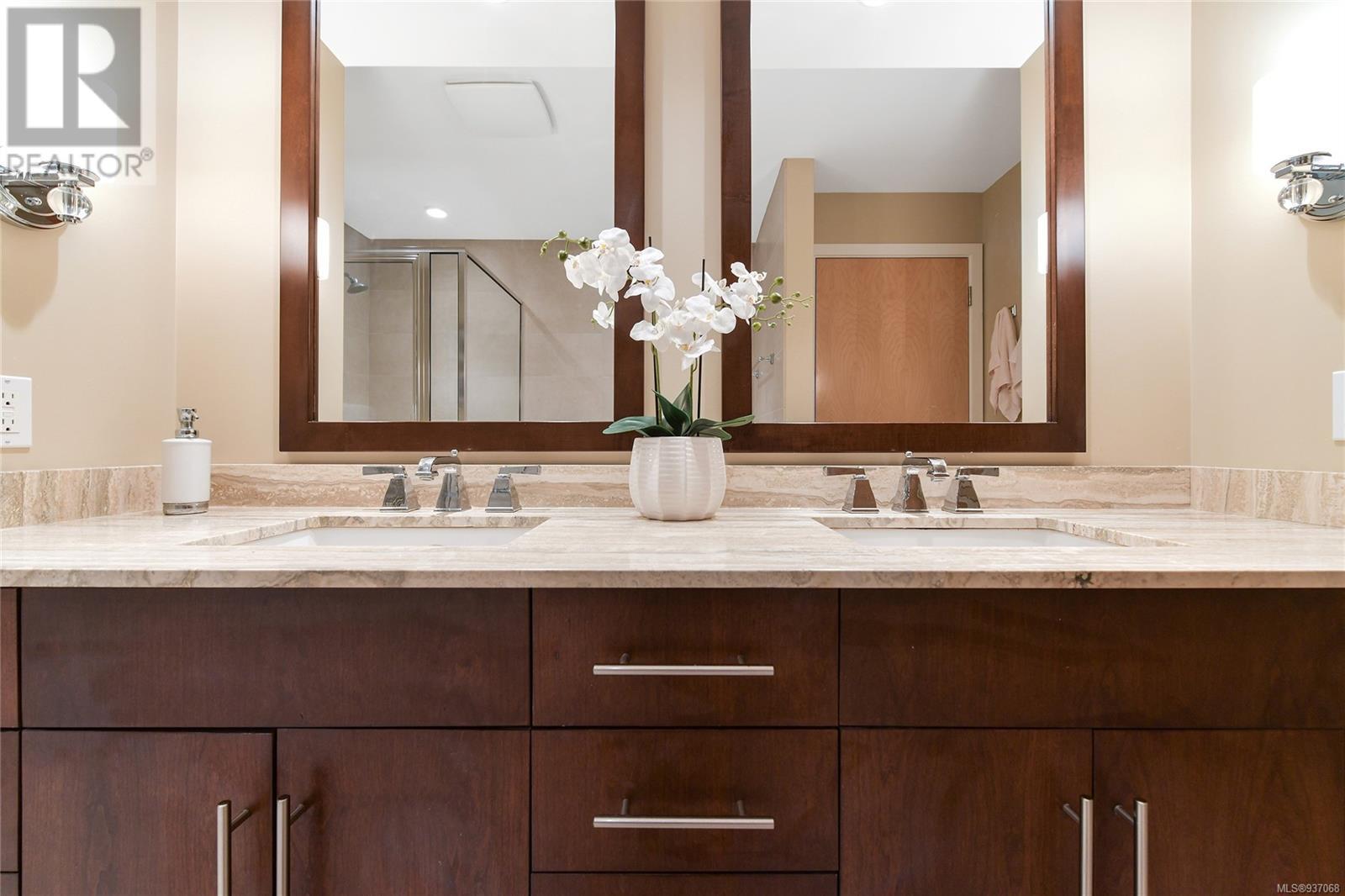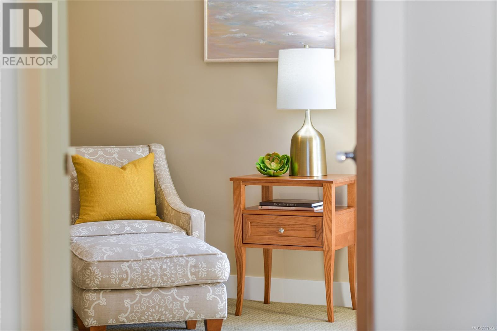 SAYWARD HILL offers Victoria's best VIEWS & LIFESTYLE, overlooking world-class golf at Cordova Bay, sandy beaches, walking/biking trails, shops at Mattick's Farm all nearby. This premiere, 2008 JAWL concrete/steel building is sought-after with its corner location, amazing natural light and walk-out view patios of 1100sf for true outdoor west coast living. An elegant home, meticulously maintained, fantastic layout with 1,773sf, feels more like a Townhouse with main level entry. Perfect for entertaining in the Chef's kitchen with KitchenAid s/steel appliances, 11' granite island, gas BBQ connection to dine alfresco capturing stunning views of Mt. Baker to the East or relax on the SW private treed view patio. The Primary retreat offers spa-styled ensuite, heated floors, soaker tub, over-sized walk-in closet leading to a separate laundry room. Media Room, Home Office/Pantry & separate Guest Bedroom/Bath make this an exceptional home. 2 secured parking stalls with EV Charging & storage too! (id:22211)