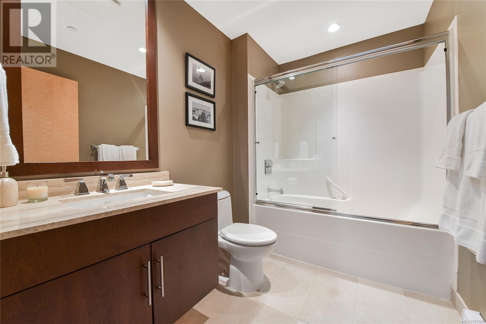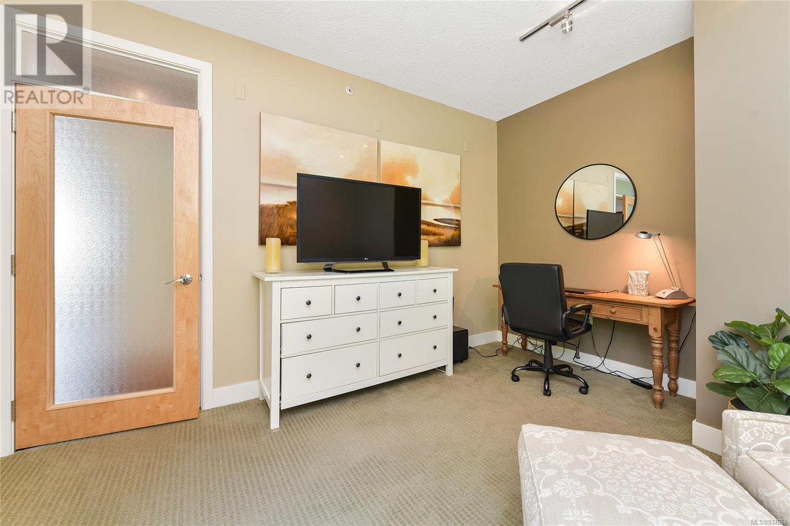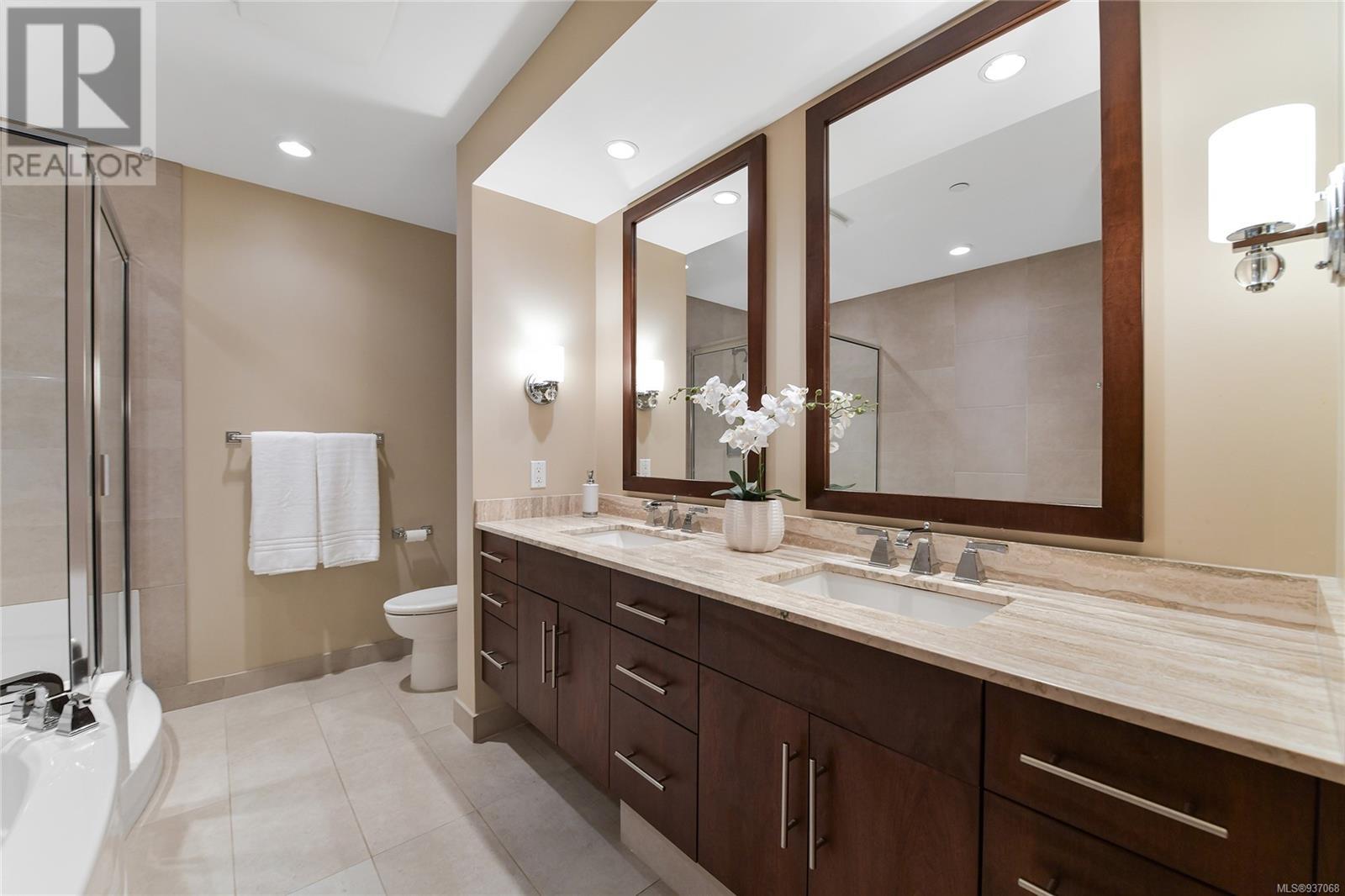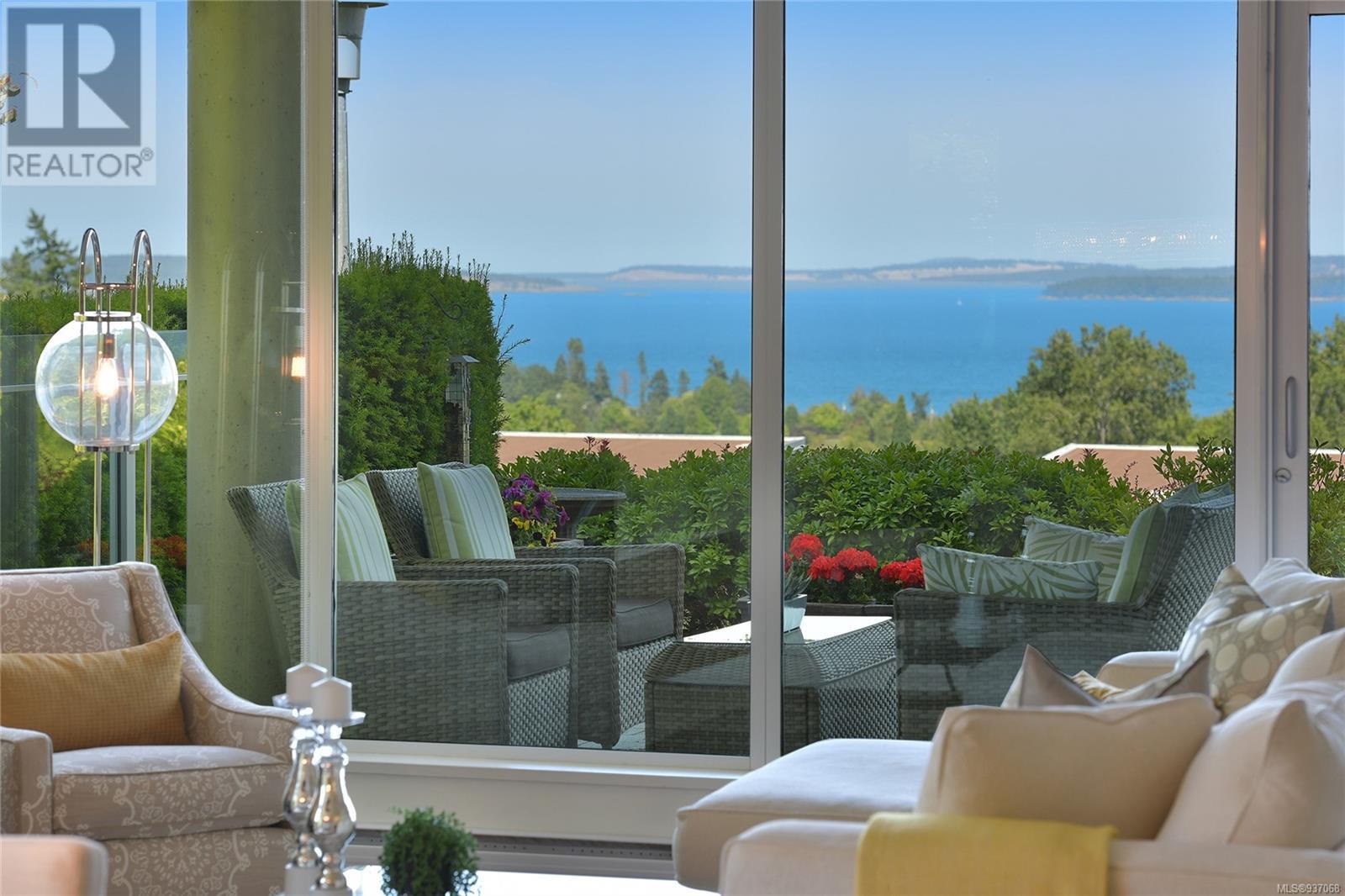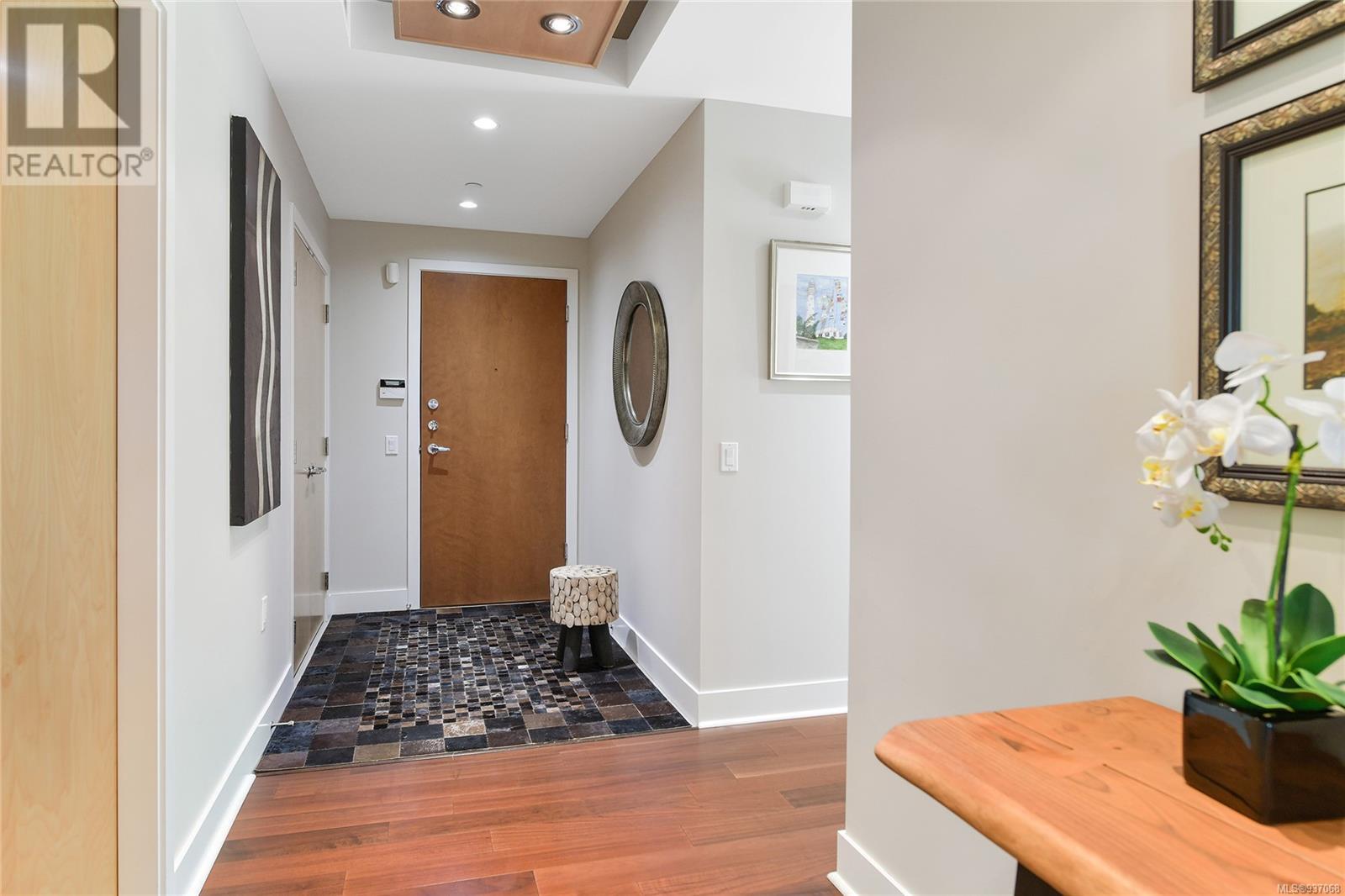 SAYWARD HILL offers Victoria's best VIEWS & LIFESTYLE, overlooking world-class golf at Cordova Bay, sandy beaches, walking/biking trails, shops at Mattick's Farm all nearby. This premiere, 2008 JAWL concrete/steel building is sought-after with its corner location, amazing natural light and walk-out view patios of 1100sf for true outdoor west coast living. An elegant home, meticulously maintained, fantastic layout with 1,773sf, feels more like a Townhouse with main level entry. Perfect for entertaining in the Chef's kitchen with KitchenAid s/steel appliances, 11' granite island, gas BBQ connection to dine alfresco capturing stunning views of Mt. Baker to the East or relax on the SW private treed view patio. The Primary retreat offers spa-styled ensuite, heated floors, soaker tub, over-sized walk-in closet leading to a separate laundry room. Media Room, Home Office/Pantry & separate Guest Bedroom/Bath make this an exceptional home. 2 secured parking stalls with EV Charging & storage too! (id:22211)