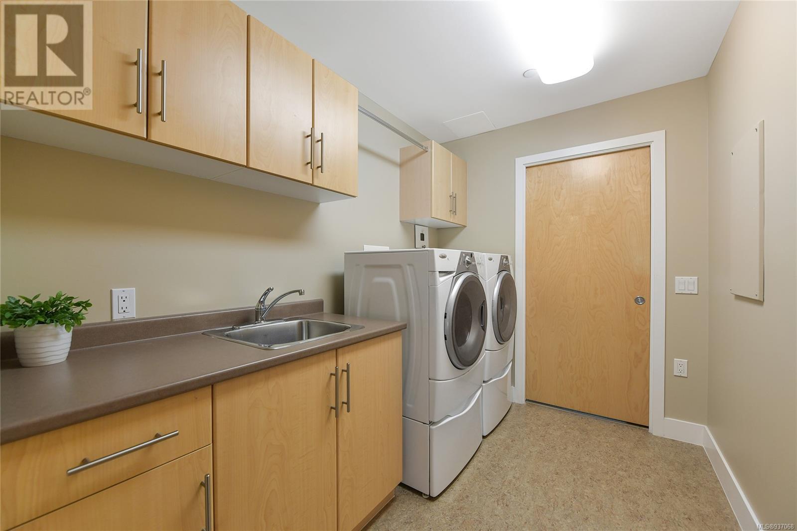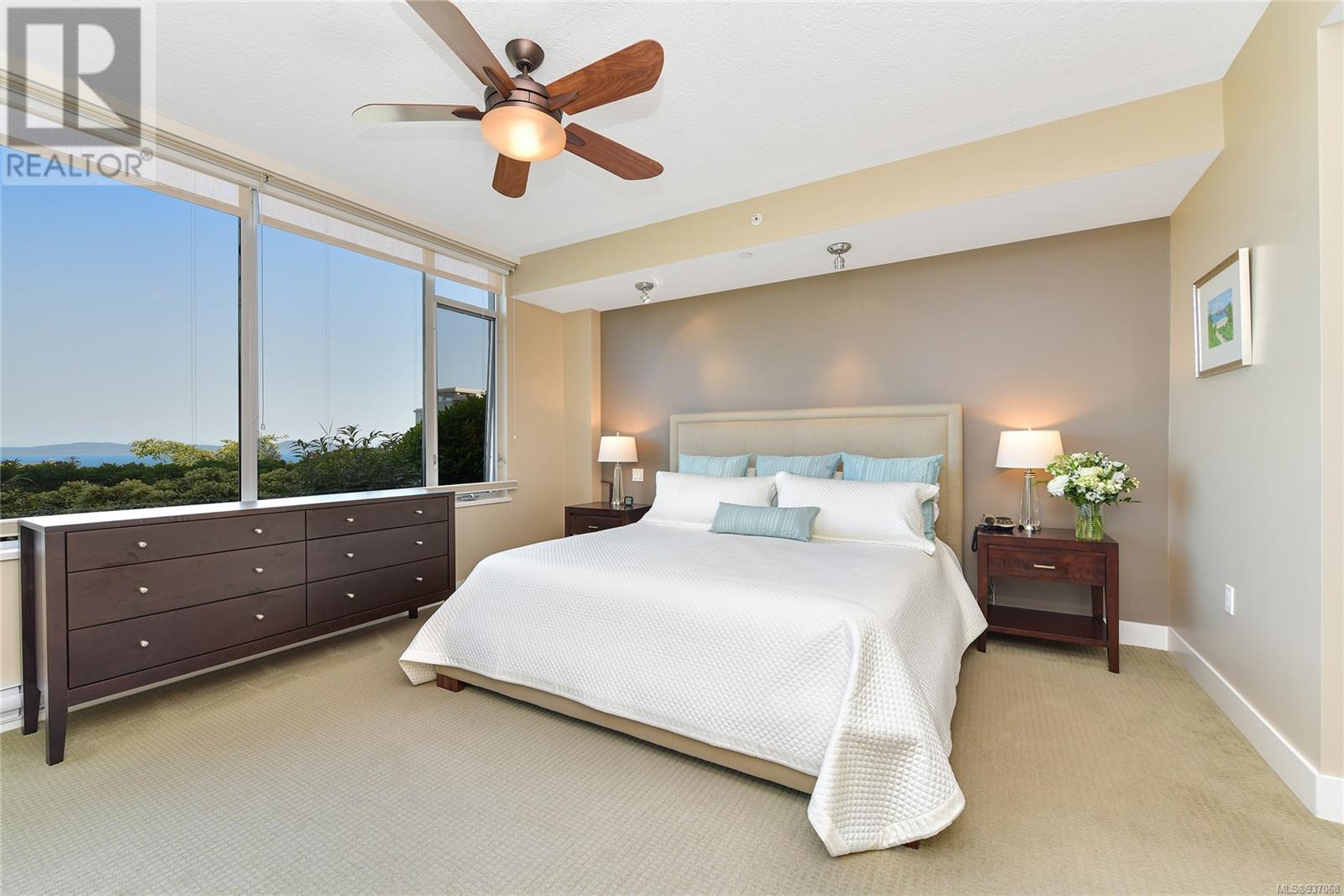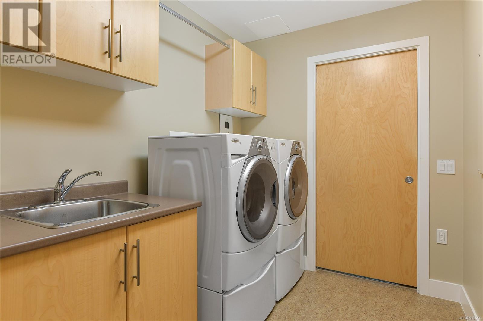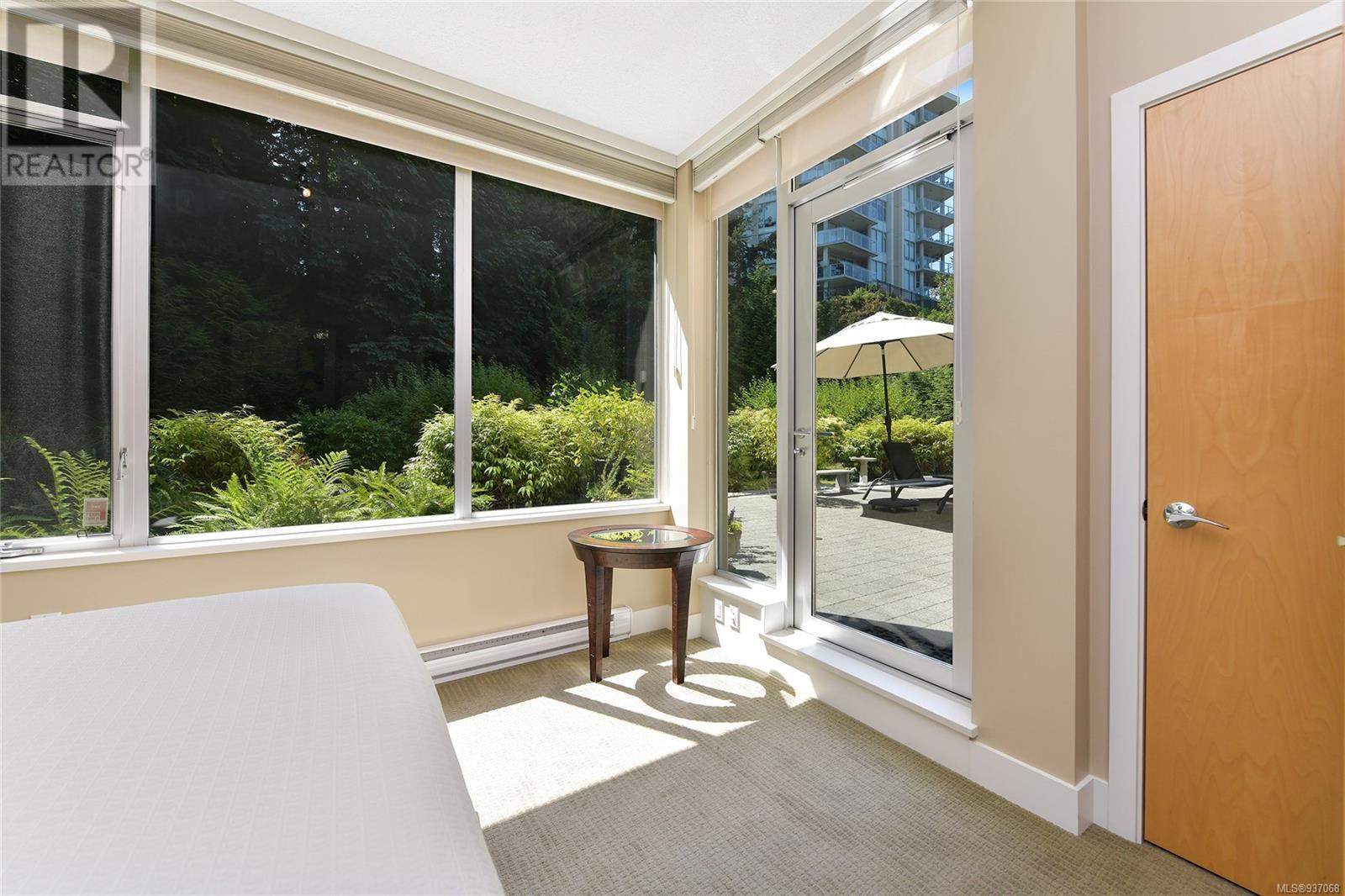 SAYWARD HILL offers Victoria's best VIEWS & LIFESTYLE, overlooking world-class golf at Cordova Bay, sandy beaches, walking/biking trails, shops at Mattick's Farm all nearby. This premiere, 2008 JAWL concrete/steel building is sought-after with its corner location, amazing natural light and walk-out view patios of 1100sf for true outdoor west coast living. An elegant home, meticulously maintained, fantastic layout with 1,773sf, feels more like a Townhouse with main level entry. Perfect for entertaining in the Chef's kitchen with KitchenAid s/steel appliances, 11' granite island, gas BBQ connection to dine alfresco capturing stunning views of Mt. Baker to the East or relax on the SW private treed view patio. The Primary retreat offers spa-styled ensuite, heated floors, soaker tub, over-sized walk-in closet leading to a separate laundry room. Media Room, Home Office/Pantry & separate Guest Bedroom/Bath make this an exceptional home. 2 secured parking stalls with EV Charging & storage too! (id:22211)