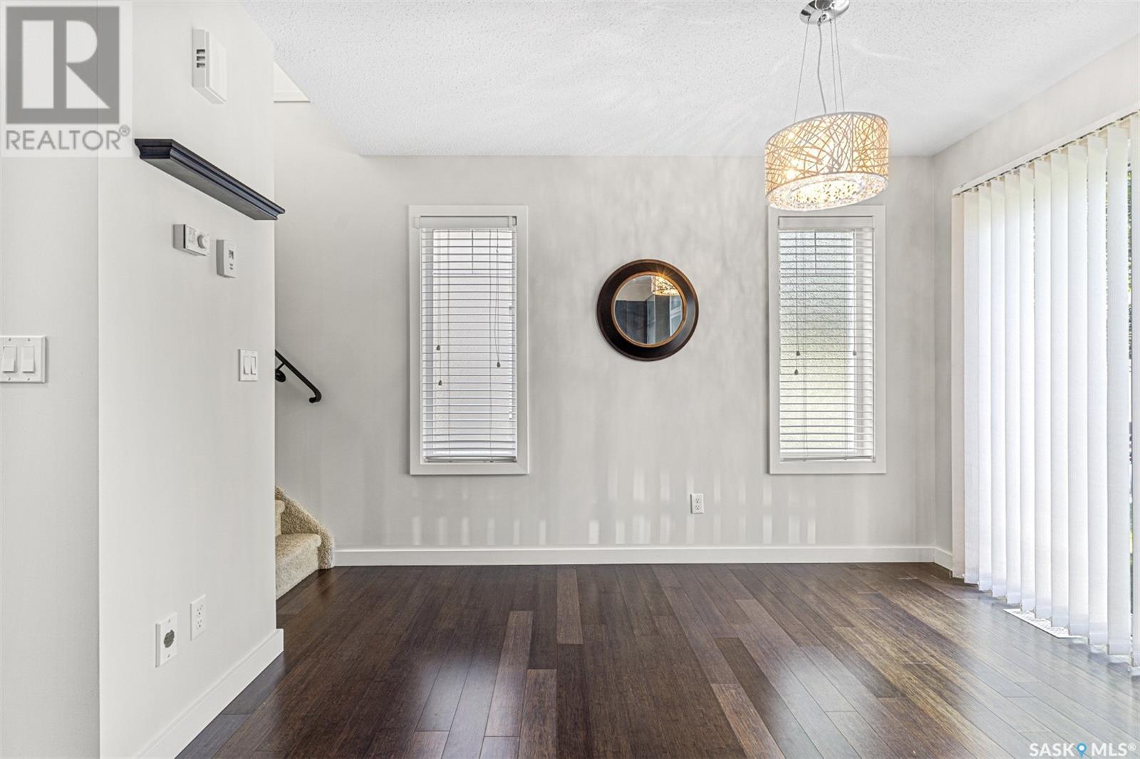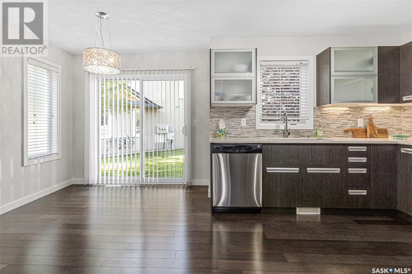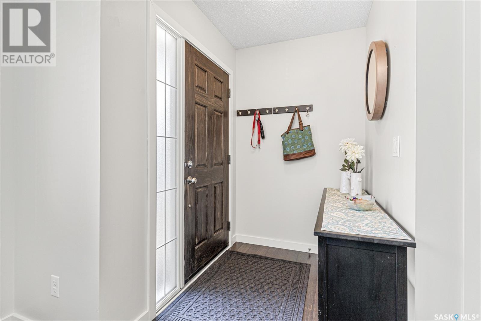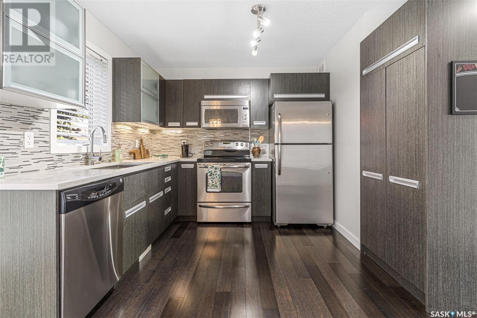 This meticulously maintained, bright three-bedroom, two bath townhouse is close to shopping, parks and schools and is an easy commute to most parts of Saskatoon. It comes with two electrified parking stalls right out front of the main door. The unit has quality finishes throughout including hardwood flooring on the main level, porcelain tile flooring in the bathrooms, and quartz counter tops in kitchen and baths. The kitchen has plenty of storage cabinets and glass doors onto the south facing patio. This well-maintained condo has many improvements including air conditioning (2014), washing machine (2016), over-the-range microwave (2018), toilets (2014), gas water heater (2022) and smoke/CM detectors (2023). Call your Realtor to view today! (id:22211)