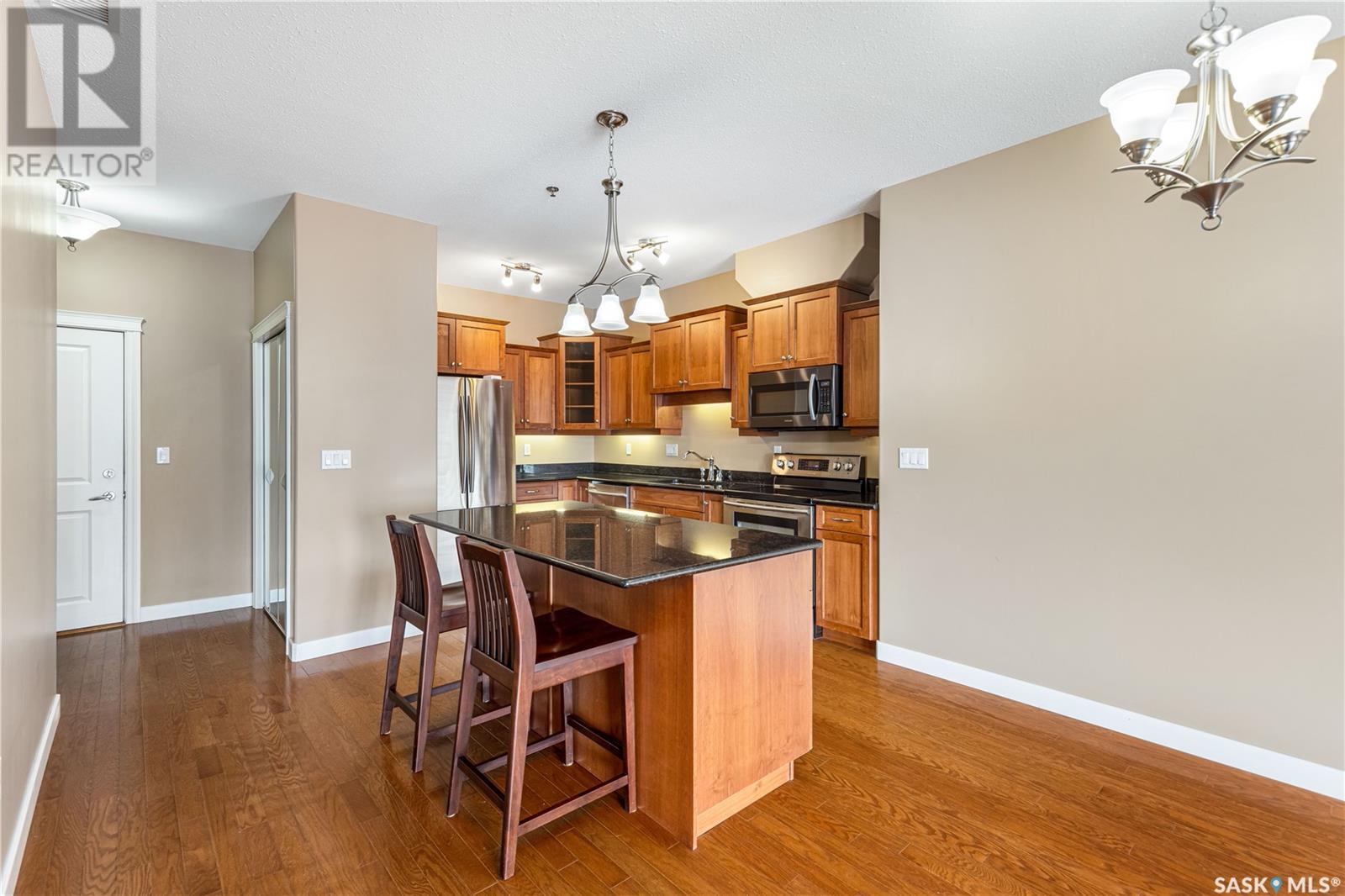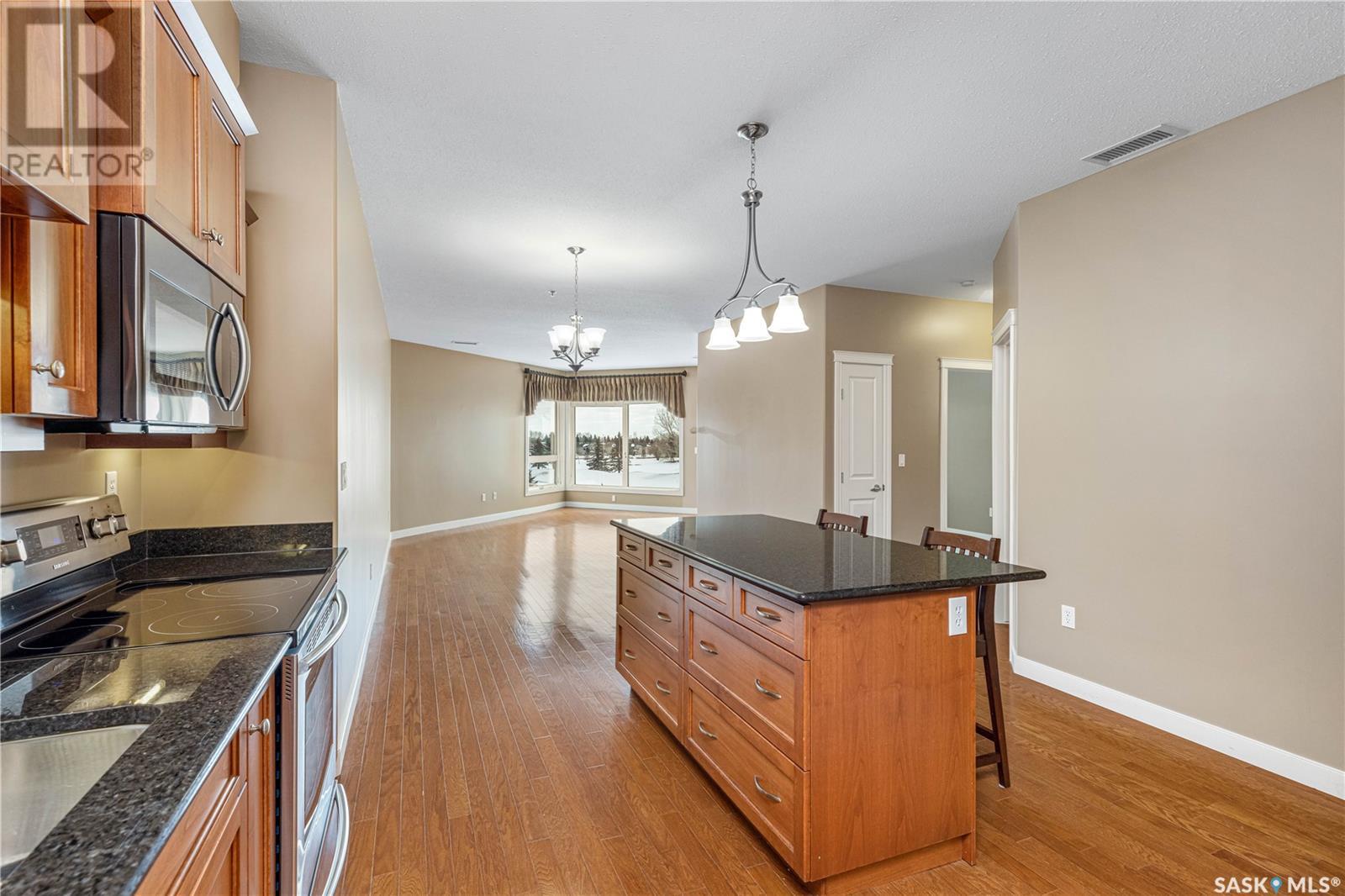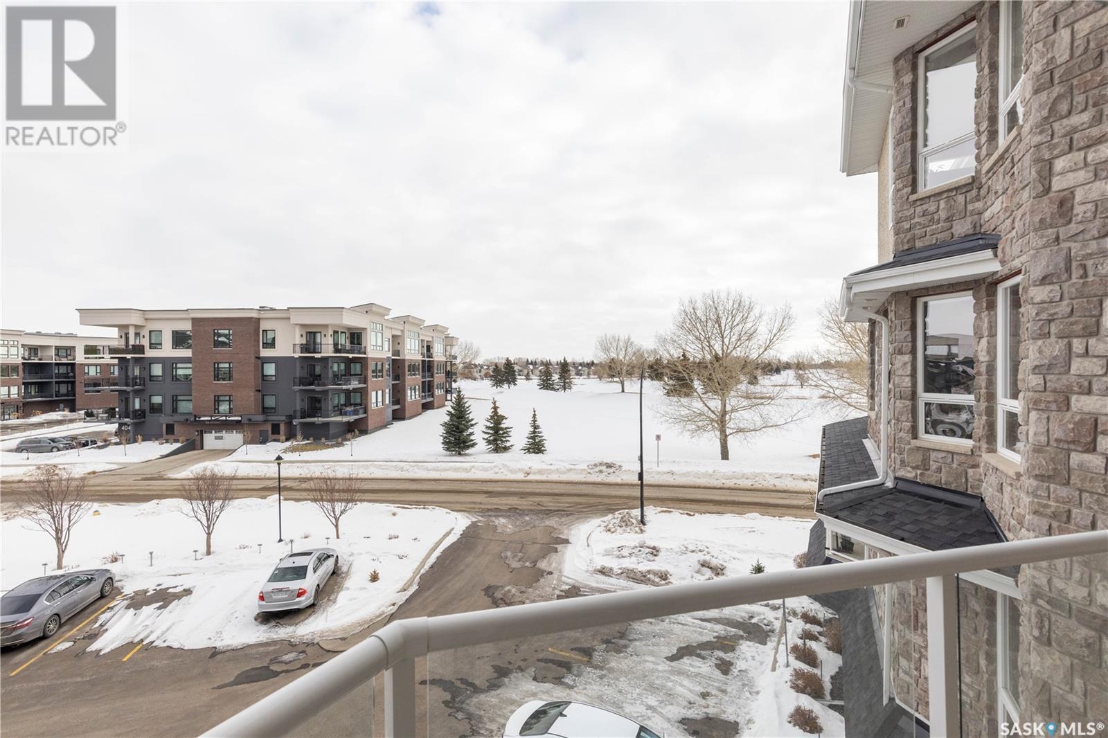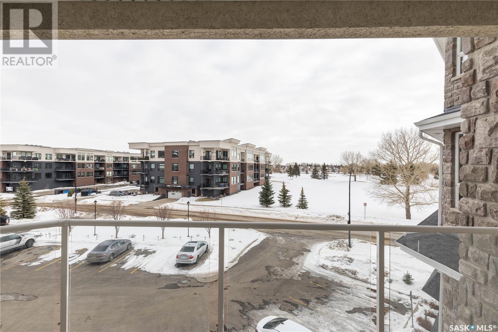Executive condo living in The Willows! This 3rd floor unit faces south for great natural light and views of Willows Golf Course! With over 1,300sqft of living space you'll enjoy spacious rooms, 9ft ceilings, in-floor heat and central air. The maple kitchen has a generous amount of cabinets, granite countertops, stainless appliances and a large island with seating! The open floor plan flows easily to the dining room and living room, with access to the covered balcony where you can take in the golf course view! The den is a great spot for home office or TV room, while the 2 bedrooms are both a nice size! The primary suite features a large walk-in closet and 3pc ensuite complete with oversized shower. 2 parking stall are included, one underground and one surface, as well as a storage room. This exclusive building boasts an amenities room, exercise room and is located just minutes from everything Stonebridge has to offer! (id:22211)