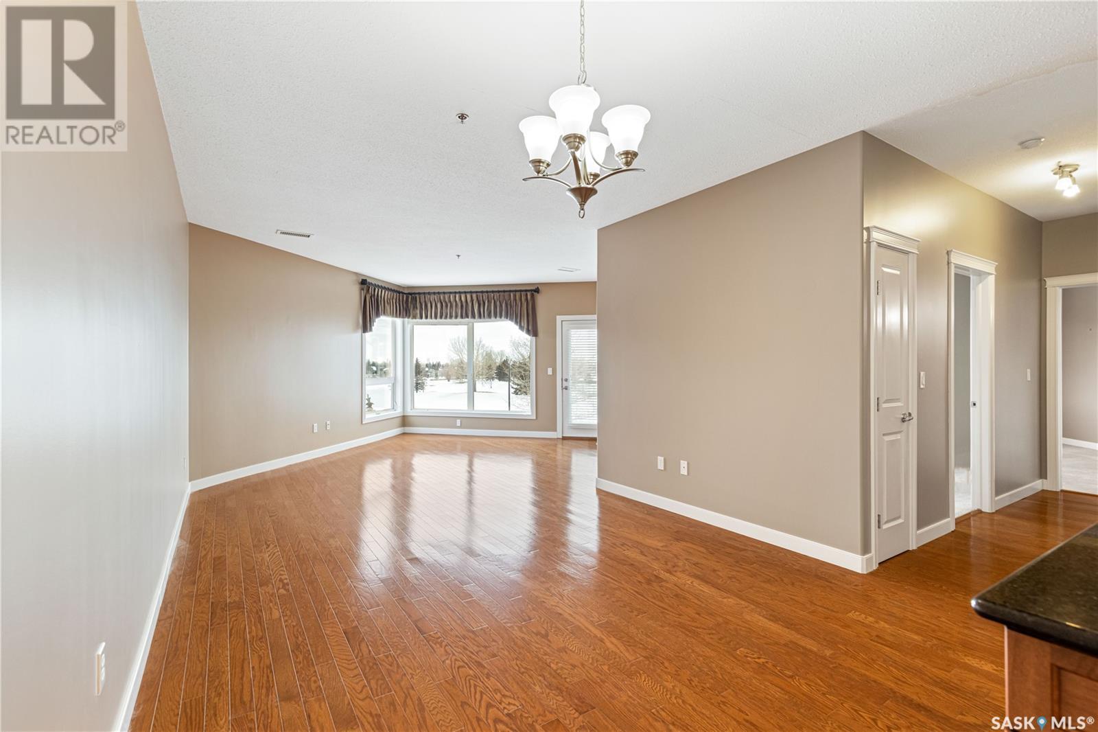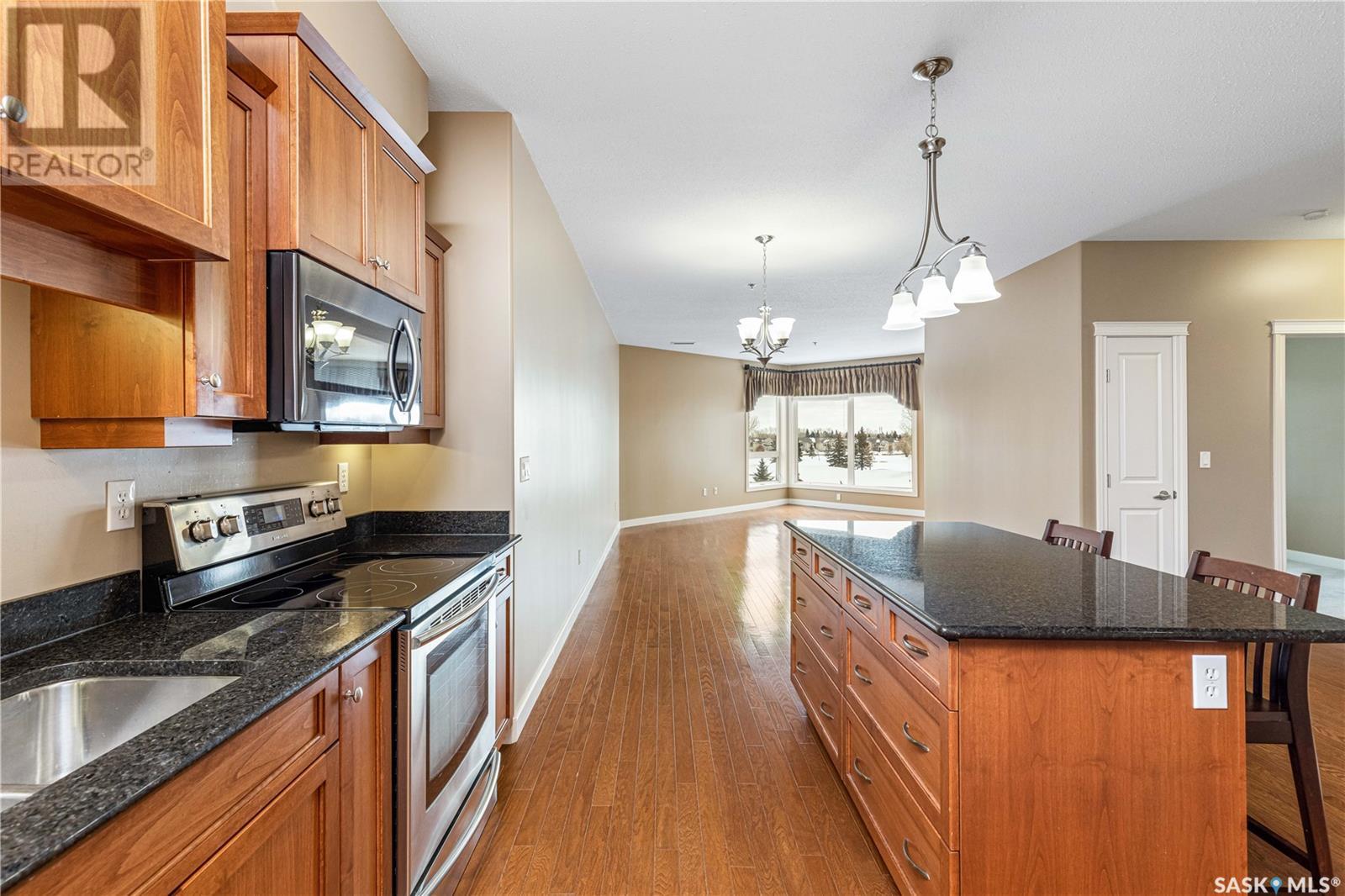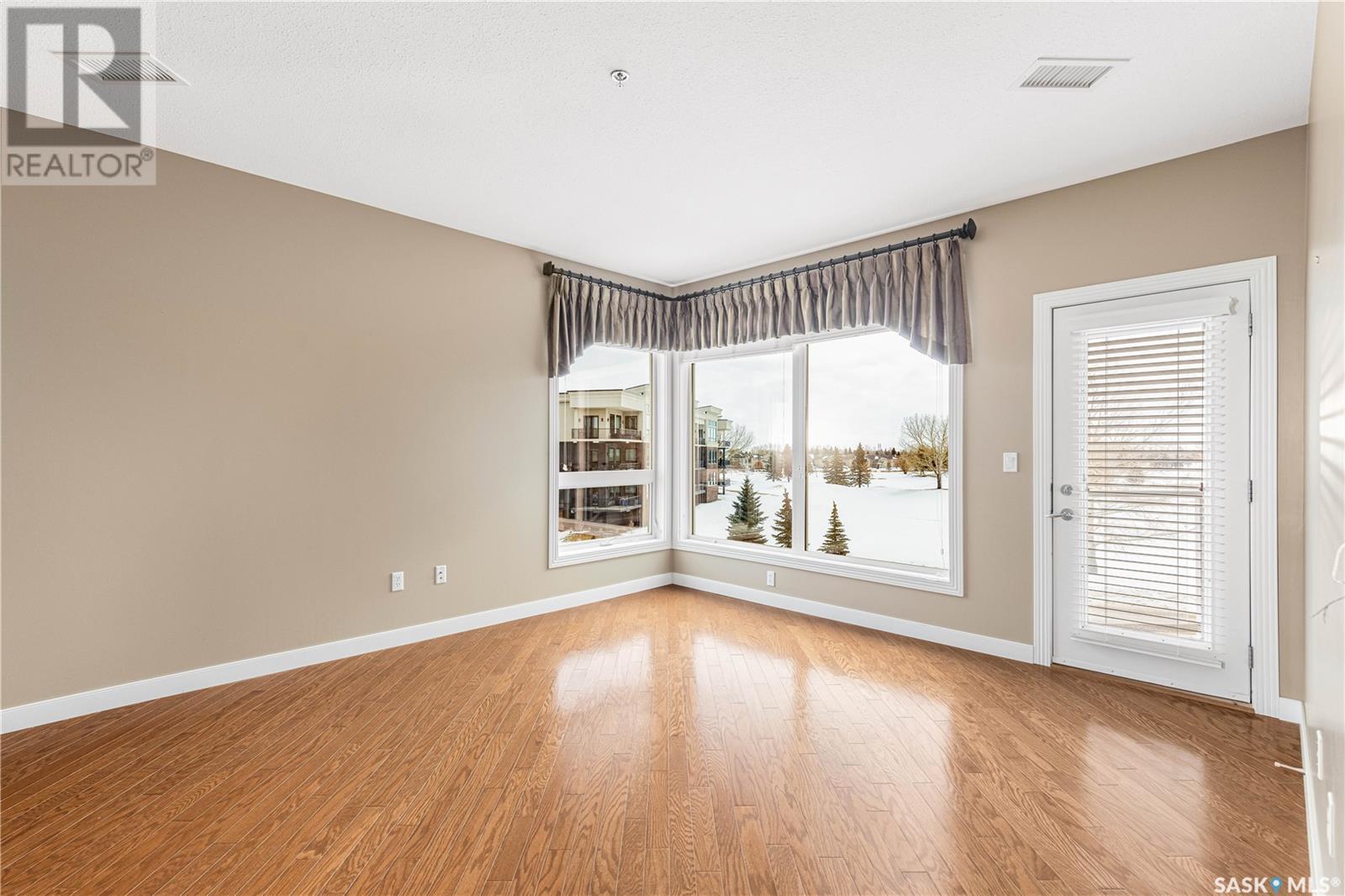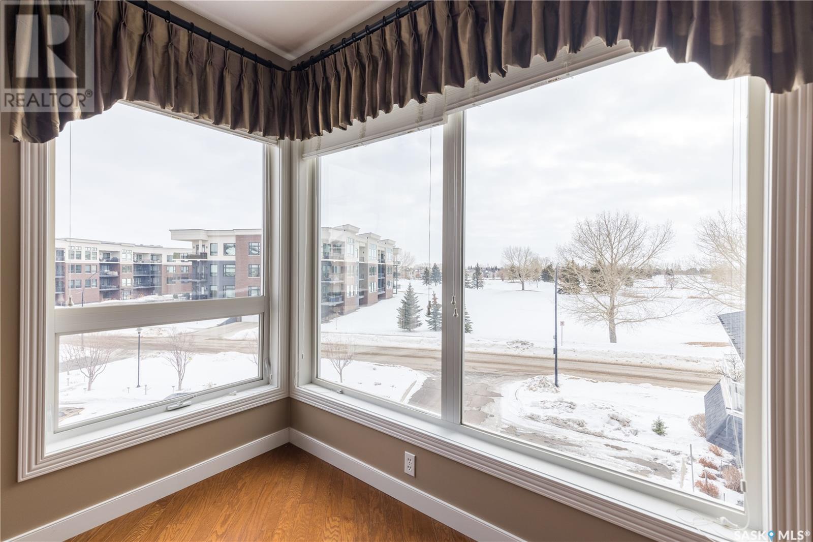 Executive condo living in The Willows! This 3rd floor unit faces south for great natural light and views of Willows Golf Course! With over 1,300sqft of living space you'll enjoy spacious rooms, 9ft ceilings, in-floor heat and central air. The maple kitchen has a generous amount of cabinets, granite countertops, stainless appliances and a large island with seating! The open floor plan flows easily to the dining room and living room, with access to the covered balcony where you can take in the golf course view! The den is a great spot for home office or TV room, while the 2 bedrooms are both a nice size! The primary suite features a large walk-in closet and 3pc ensuite complete with oversized shower. 2 parking stall are included, one underground and one surface, as well as a storage room. This exclusive building boasts an amenities room, exercise room and is located just minutes from everything Stonebridge has to offer! (id:22211)