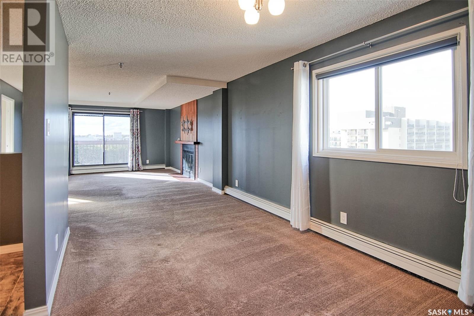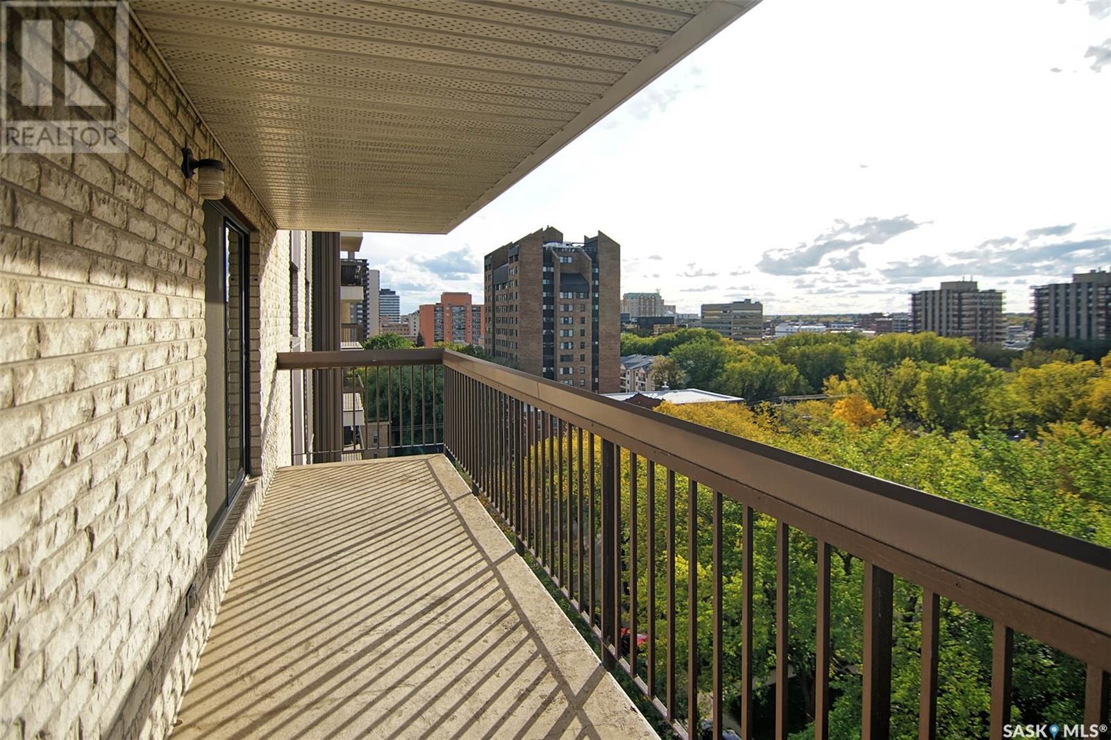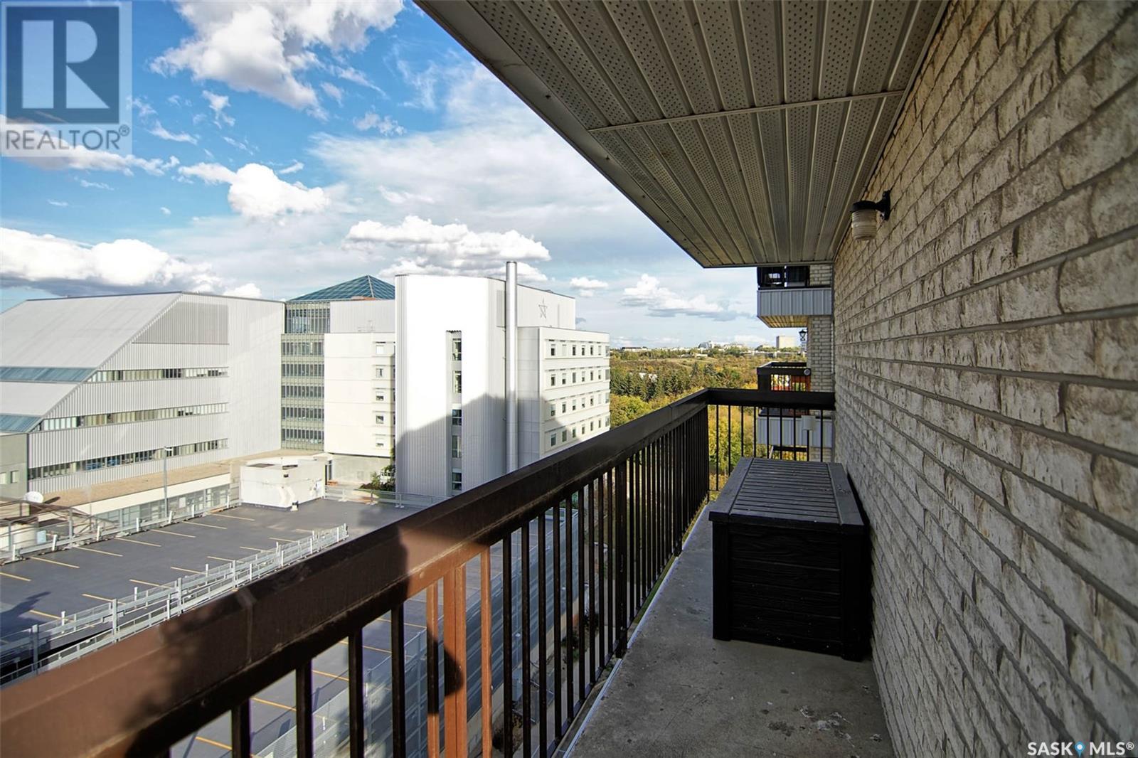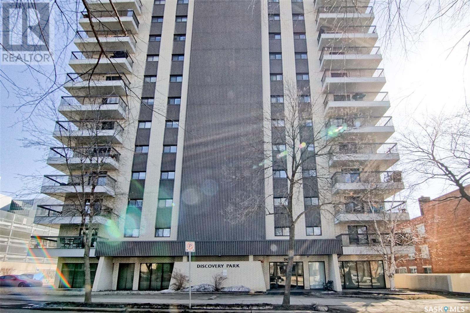 Quick possession for Students. Welcome to one of the most desirable areas in Saskatoon, City Park. This 1141 sq. ft. 2 bedroom one bath condo with underground parking is located on the 8th floor of the Discovery Condos. It is walking distance to City Centre and the University of Saskatchewan and a skip over to the City Hospital. Located on the 8th floor and a corner unit there is a wraparound deck and loads of light, both bedrooms are large with a huge living room and dining area plus a spacious kitchen. This building is unique in layout as it has only 4 units on each floor with shared laundry per floor. This wonderful building has an indoor swimming pool, recreation/gym room and a roof top patio to watch the sunsets. There are new windows as of 5 years ago and a new patio door. The deck is a pleasure to sit and have a cocktail in the warmer days and then on cooler days cozy up to the fireplace. You will fall in love with the view above the trees the way the sun peaks in the dining room window early in the morning and the gorgeous sunsets in the evening. The condo building is very well maintained with many of the suggested maintenance in the reserve study done a head of schedule. There is gated above ground parking along with the assigned underground parking. This building shows all the owners pride with the improvements and management. (id:22211)