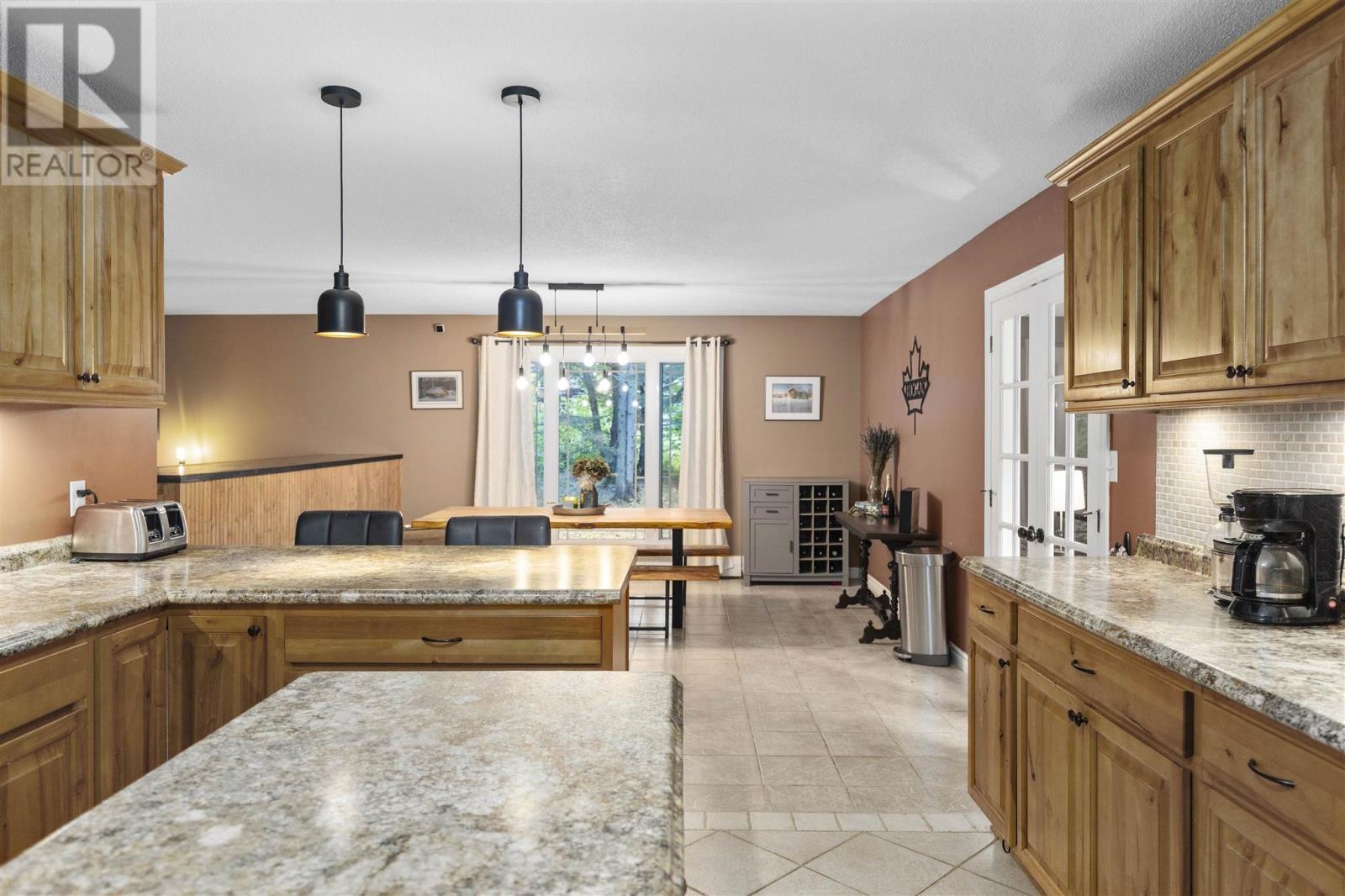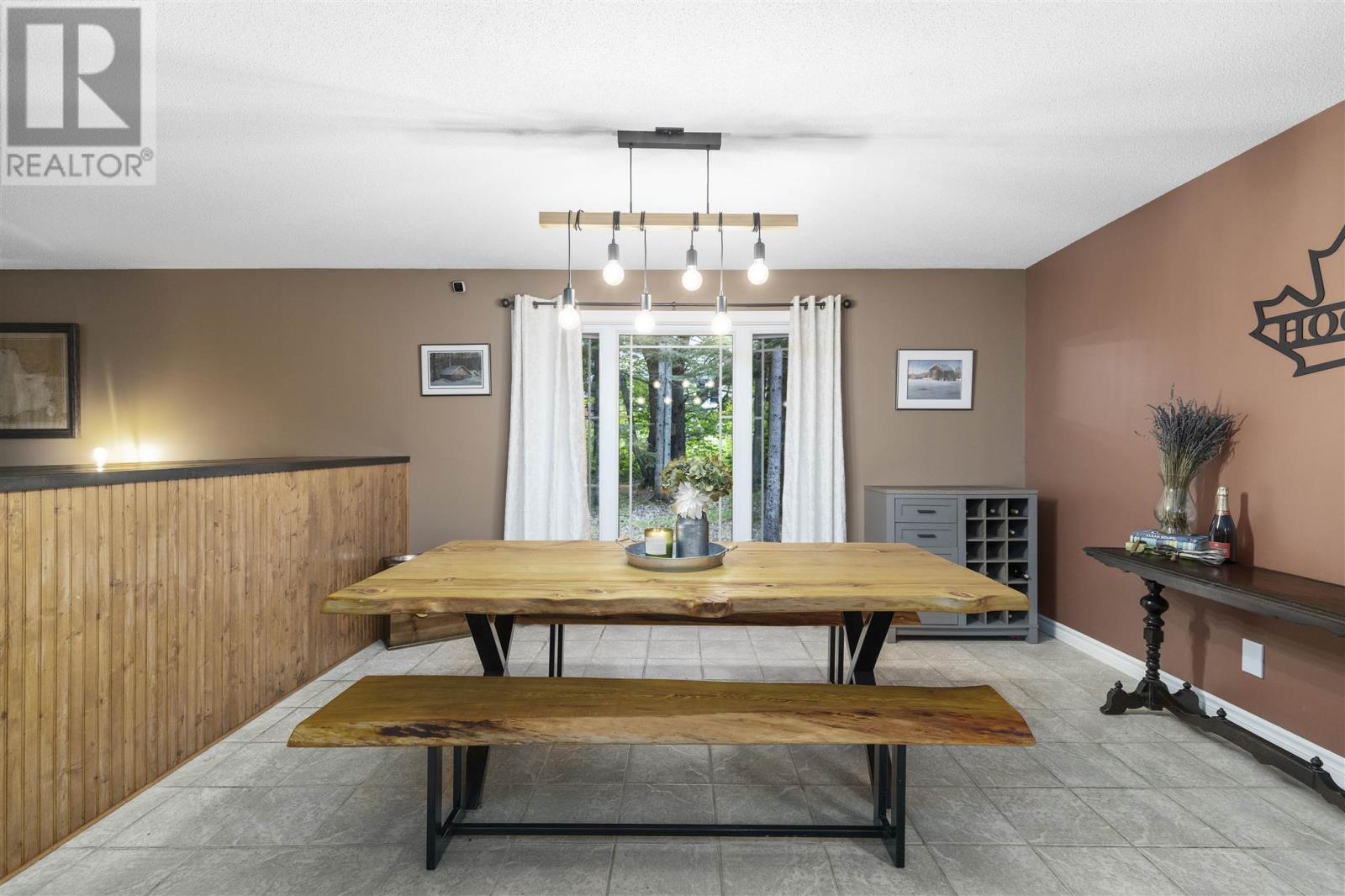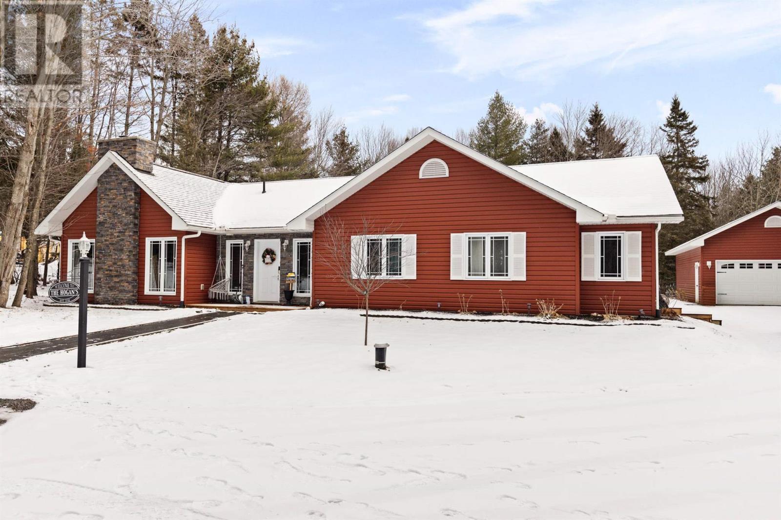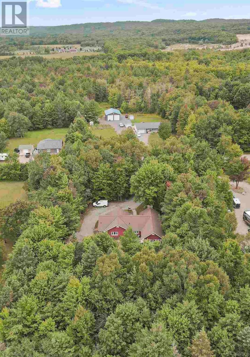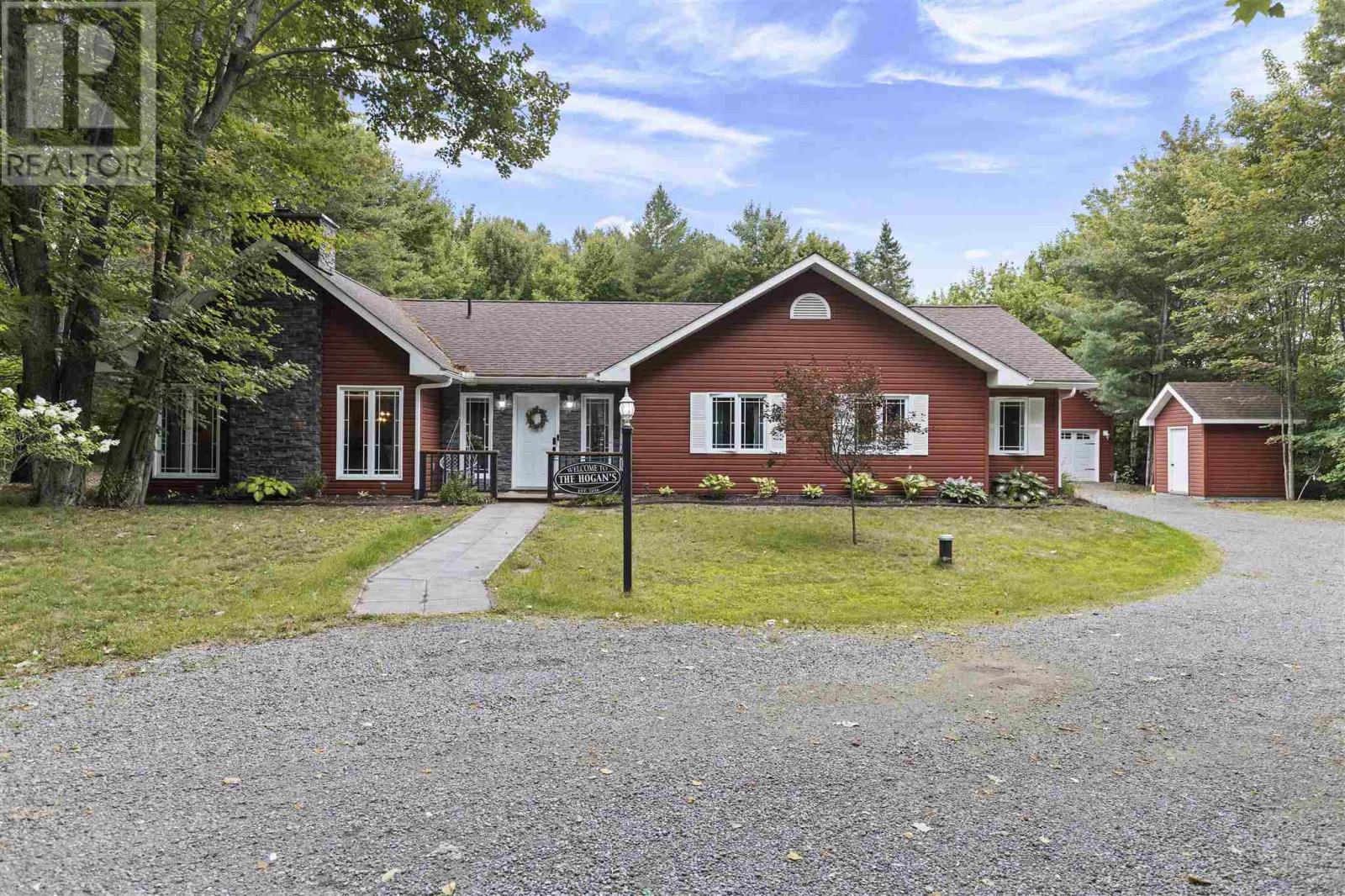 Tucked back perfectly on 5 acres of beautiful, mature hardwoods, this 2300 sqft ranch bungalow offers the peace and privacy you’ve been looking for! As you drive down the curved lit driveway you are welcomed by the cozy front porch which leads you in to the bright foyer with double closets. Down the hall you will find an expansive open concept living/dining and kitchen area. The living room is anchored by a large decorative fireplace with electric insert, oversized dining room with plenty of room for the family, eat-in kitchen with island and breakfast bar, walk-in pantry and half bathroom for guests. Through the french doors of the main living area is a large family/rec room space with beautiful windows and patio doors to rear deck/yard. The other end of the home offers 3 generous size bedrooms, 2 full bathrooms and laundry/utility room. Primary bedroom is large enough to easily fit king-size furniture and features a 3-piece ensuite and walk-in closet. The additional two bedrooms both have double closets for additional storage space. The laundry/utility room can be found at the end of the hall with exterior access to driveway; convenient for personal use/groceries. Efficient, natural-gas fuelled, hot water radiant heat keeps the home warm in the winter months. Home is complete with multiple outbuildings - detached double car garage, storage shed and chicken coop/dog run. This property is absolutely stunning, offers all the amenities of city living but with the peace and privacy of country living. Don’t miss out - call today to view! (id:22211)