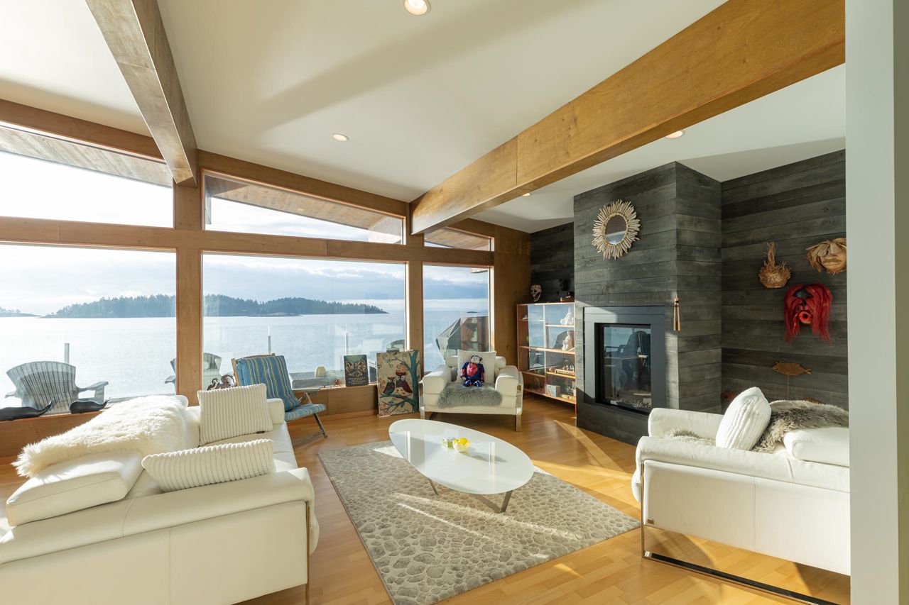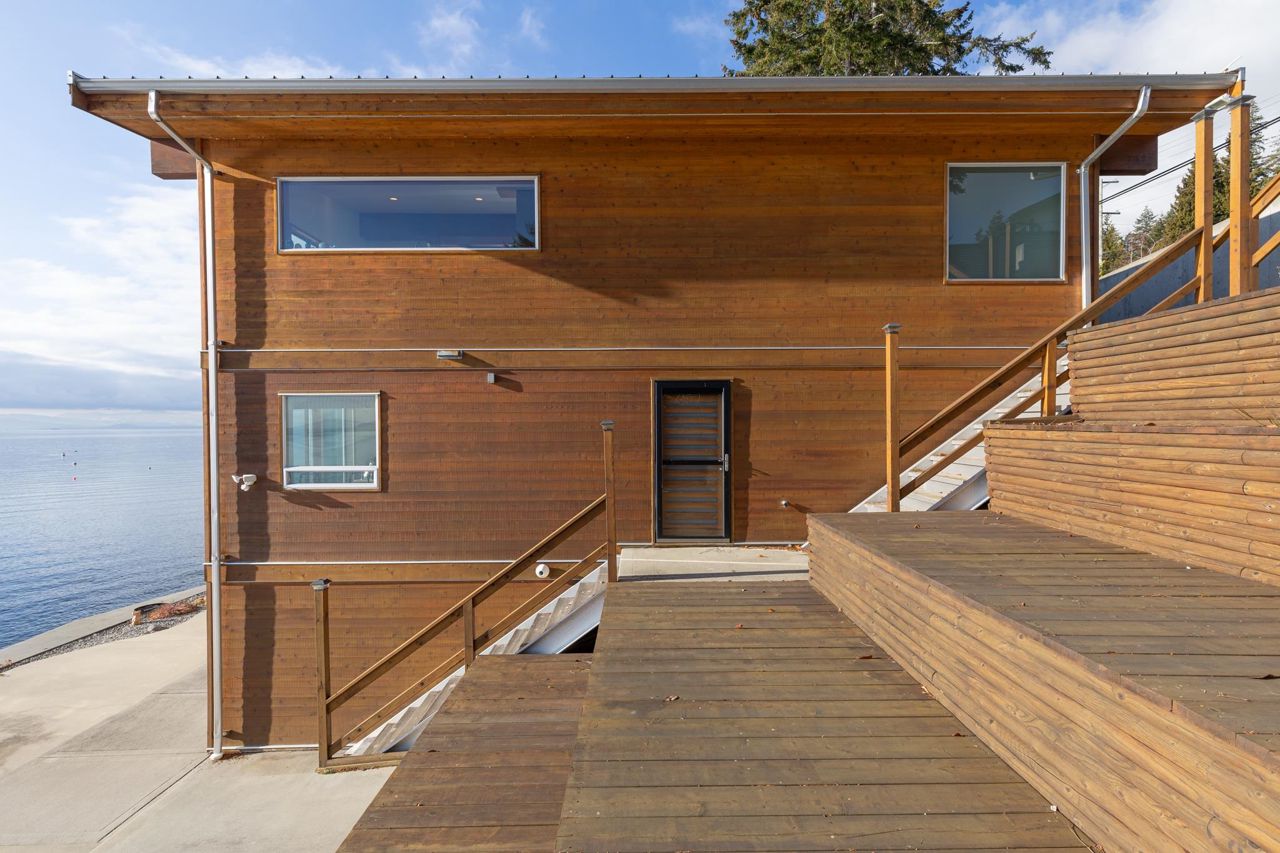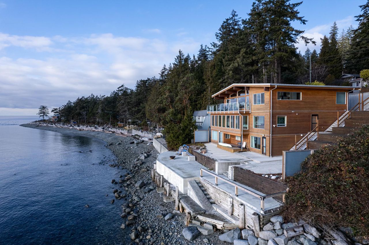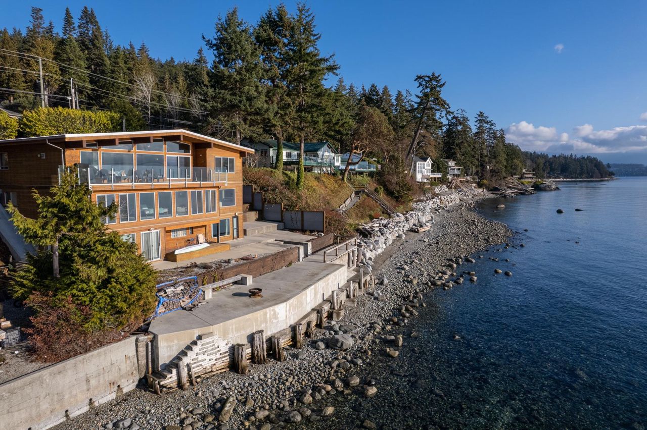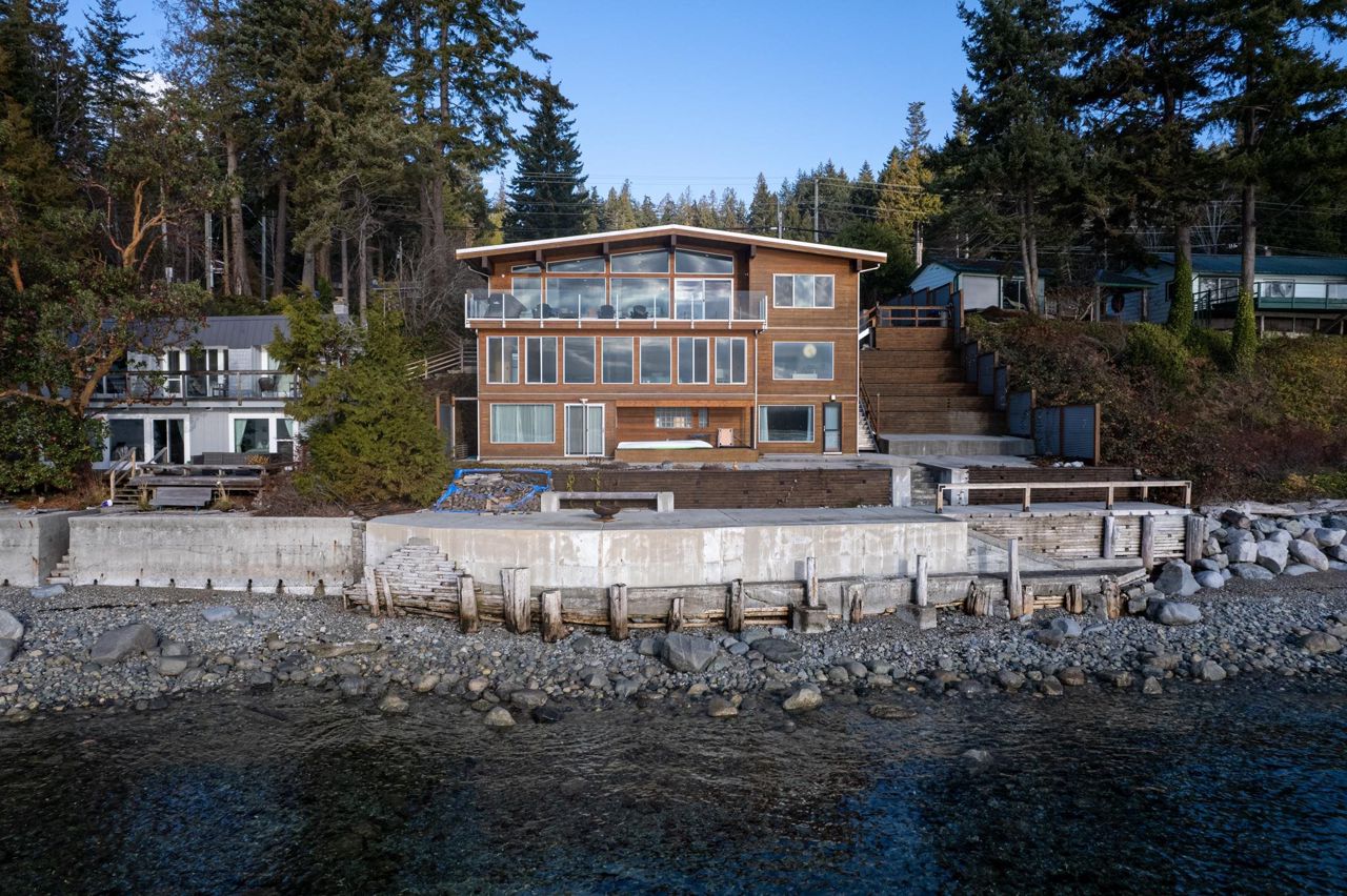 Stunning modern ocean front home with spectacular views of the Trail Islands. Situated on the West Sechelt shoreline approximately 3 kms from the town of Sechelt is this modern open concept home with amazing access and views of the Trail Islands and the Salish Sea. This home was completely renovated in 2008. The main floor is completely open with large picture windows and lovely vaults. Engineered hard wood floors throughout with a beautiful gas fireplace in the livingroom. The second floor is completely open except for 4 piece bathroom with large walk-in shower and circular soaker tub. The lowest level, which is level with the beach side patio, is designed for guests with bedroom, bathroom or living area.