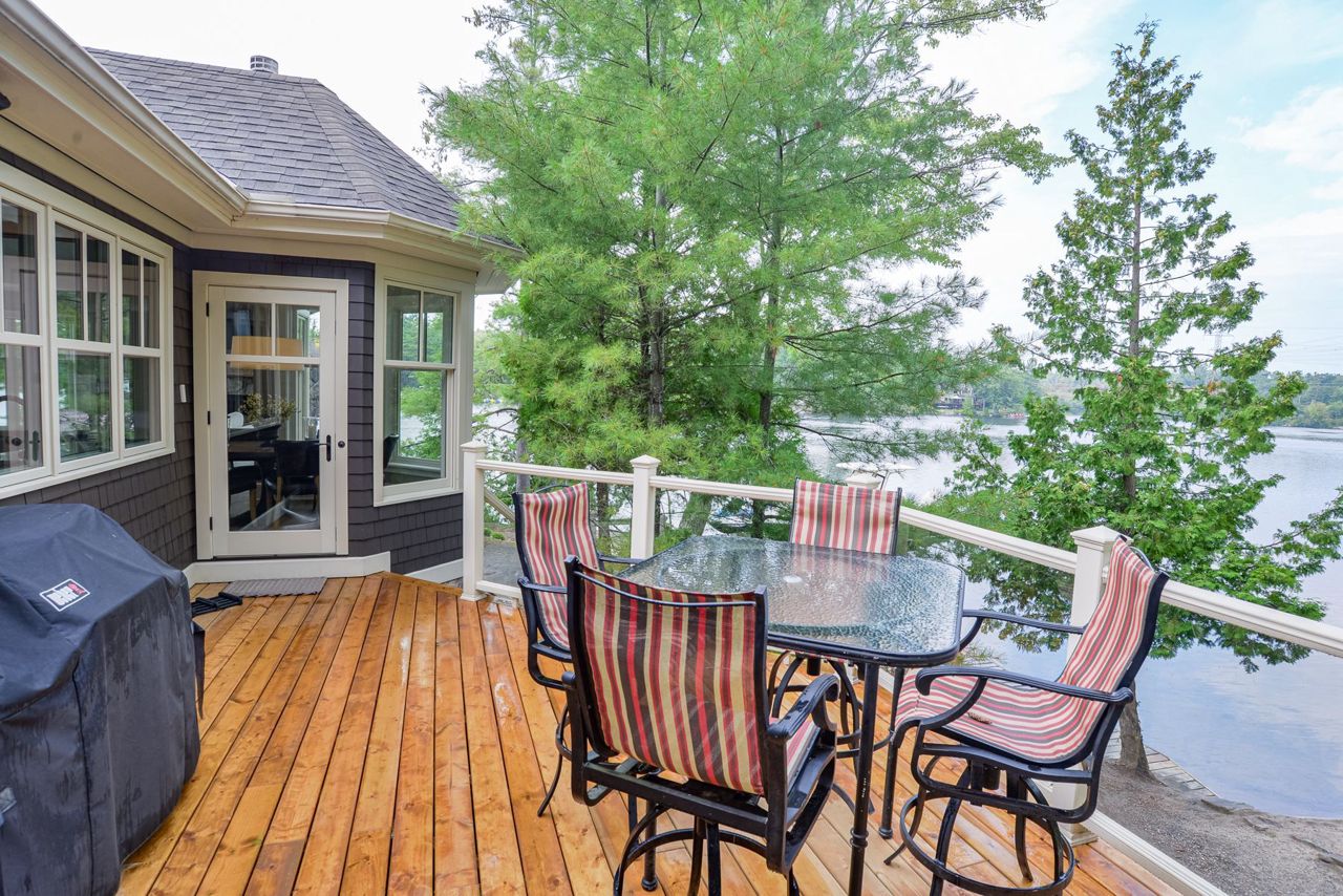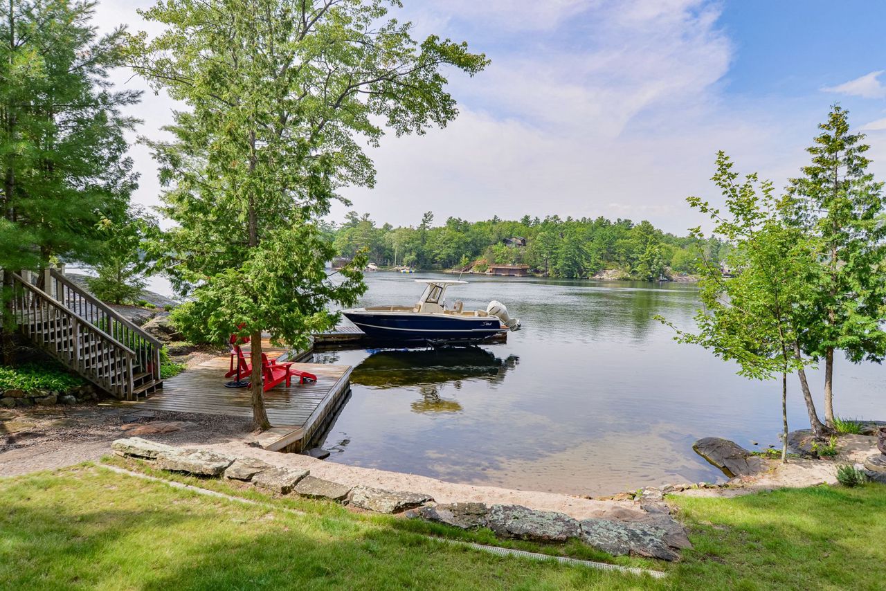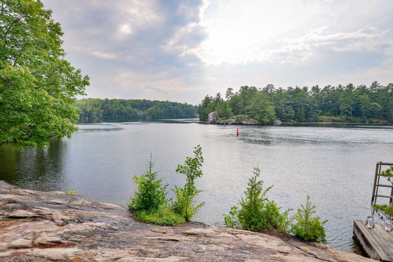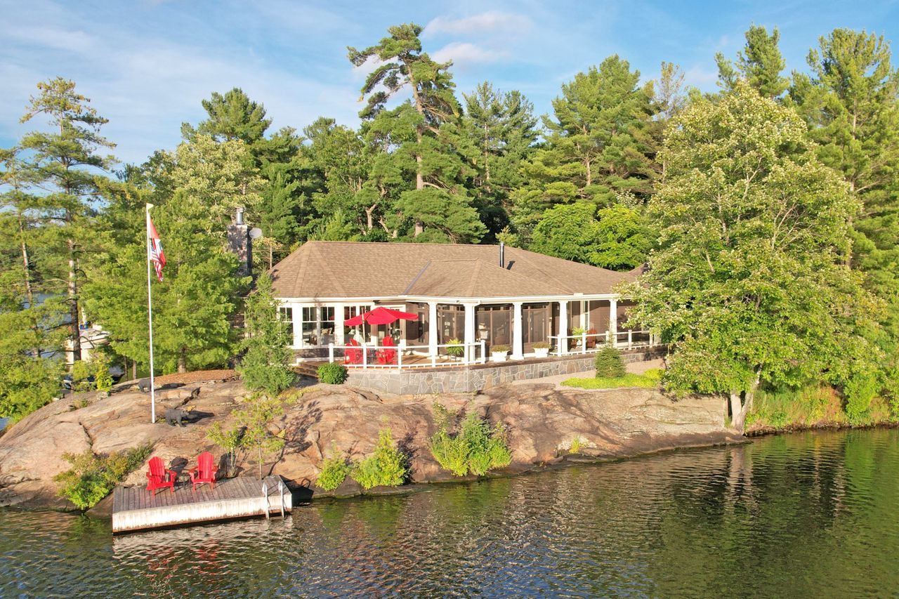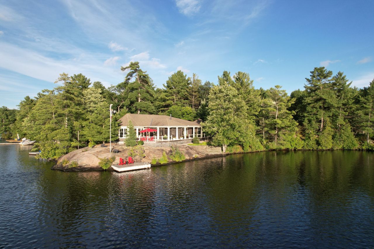 This exquisite waterfront retreat sits on a spectacular peninsula on the shores of beautiful Gloucester Pool. Featuring over 450' of frontage, year-round sunsets & all-day sun, plus 1.3 acres of gently sloping land & privacy. Enjoy both deep water off the dock & a hard-packed sandy beachfront. Between the luxurious 3-bedroom cottage & guest suite, you'll find nearly 3000 sq ft of bright living space to host your family & friends. Meticulous detailing & bespoke finishes include reclaimed rock elm floors & beams, vaulted ceilings, heated Italian Rhone limestone floors, high-end appliances, a walk-in pantry & custom cabinetry throughout the cottage. The exceptional layout brilliantly showcases water views from virtually every room. In the screened Muskoka Room, you can hear the waves lapping against the shore & watch the sun setting. 2+ car heated garage plus generator. For boating enthusiasts, it's 1 lock to the spectacular waters of Georgian Bay. Only 1 hr 30 min from Toronto.Geothermal Heating and Central Air, Humidity Control. Propane heating in garage and guest suite.