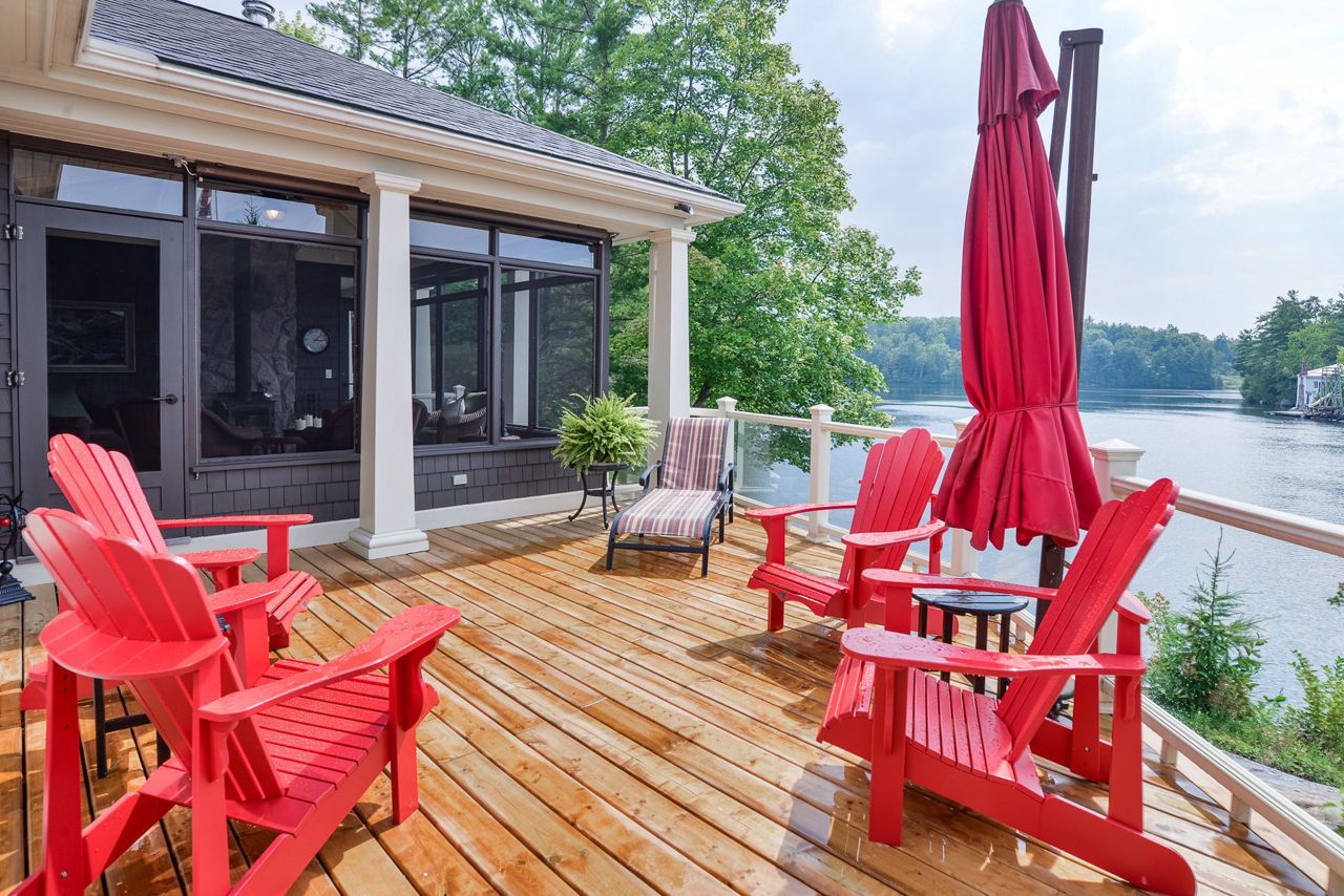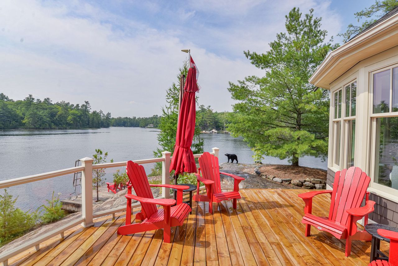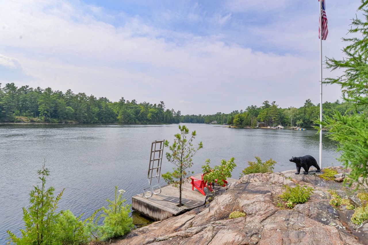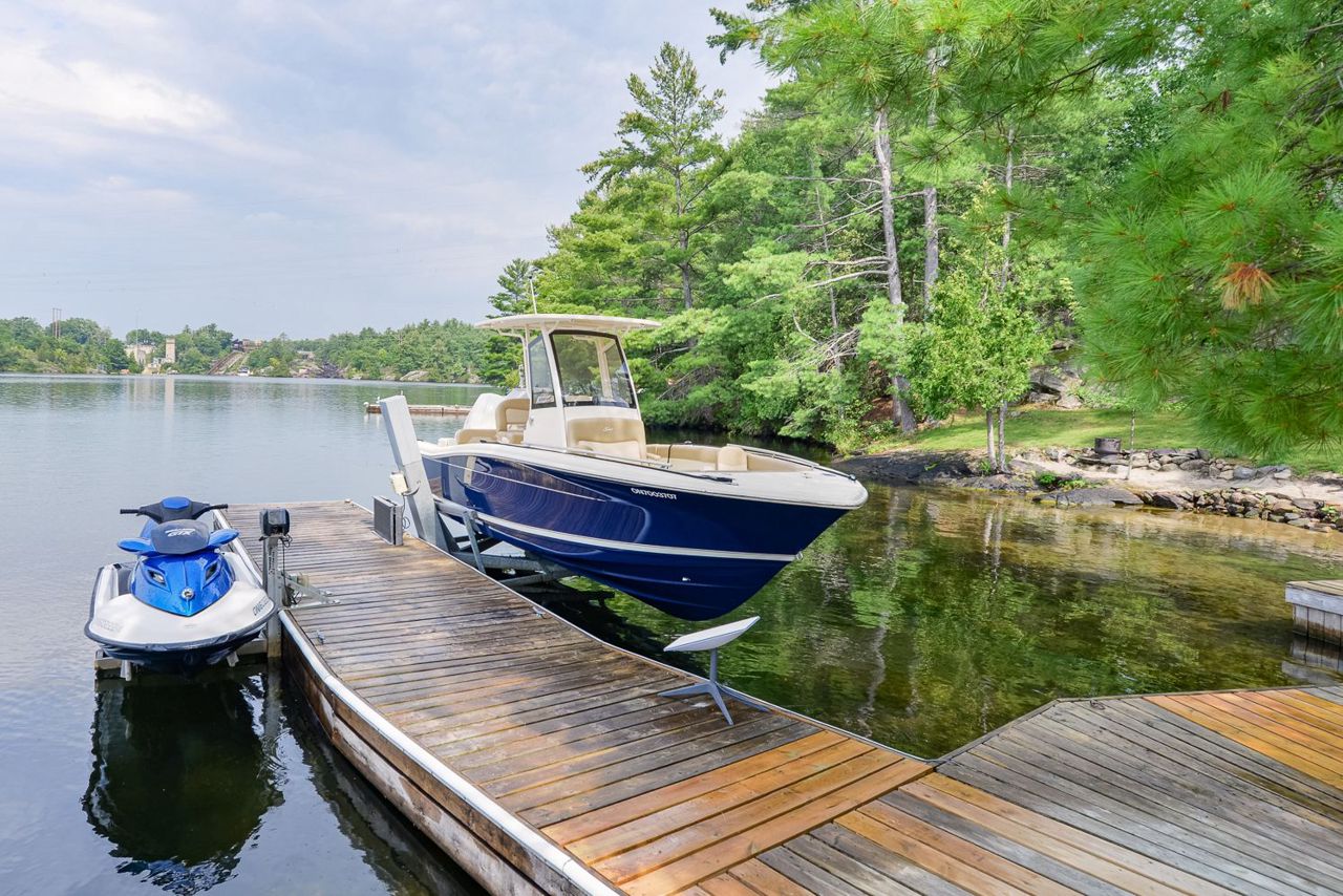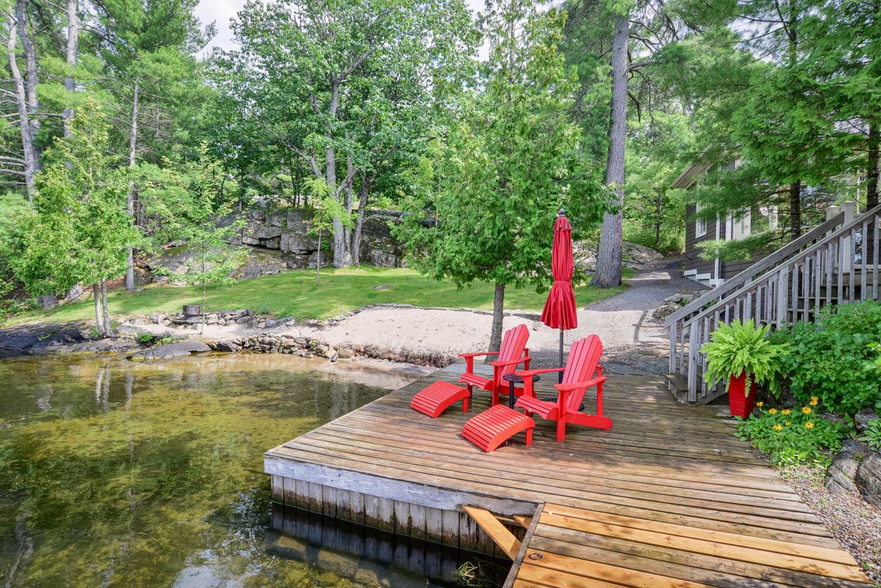 This exquisite waterfront retreat sits on a spectacular peninsula on the shores of beautiful Gloucester Pool. Featuring over 450' of frontage, year-round sunsets & all-day sun, plus 1.3 acres of gently sloping land & privacy. Enjoy both deep water off the dock & a hard-packed sandy beachfront. Between the luxurious 3-bedroom cottage & guest suite, you'll find nearly 3000 sq ft of bright living space to host your family & friends. Meticulous detailing & bespoke finishes include reclaimed rock elm floors & beams, vaulted ceilings, heated Italian Rhone limestone floors, high-end appliances, a walk-in pantry & custom cabinetry throughout the cottage. The exceptional layout brilliantly showcases water views from virtually every room. In the screened Muskoka Room, you can hear the waves lapping against the shore & watch the sun setting. 2+ car heated garage plus generator. For boating enthusiasts, it's 1 lock to the spectacular waters of Georgian Bay. Only 1 hr 30 min from Toronto.Geothermal Heating and Central Air, Humidity Control. Propane heating in garage and guest suite.