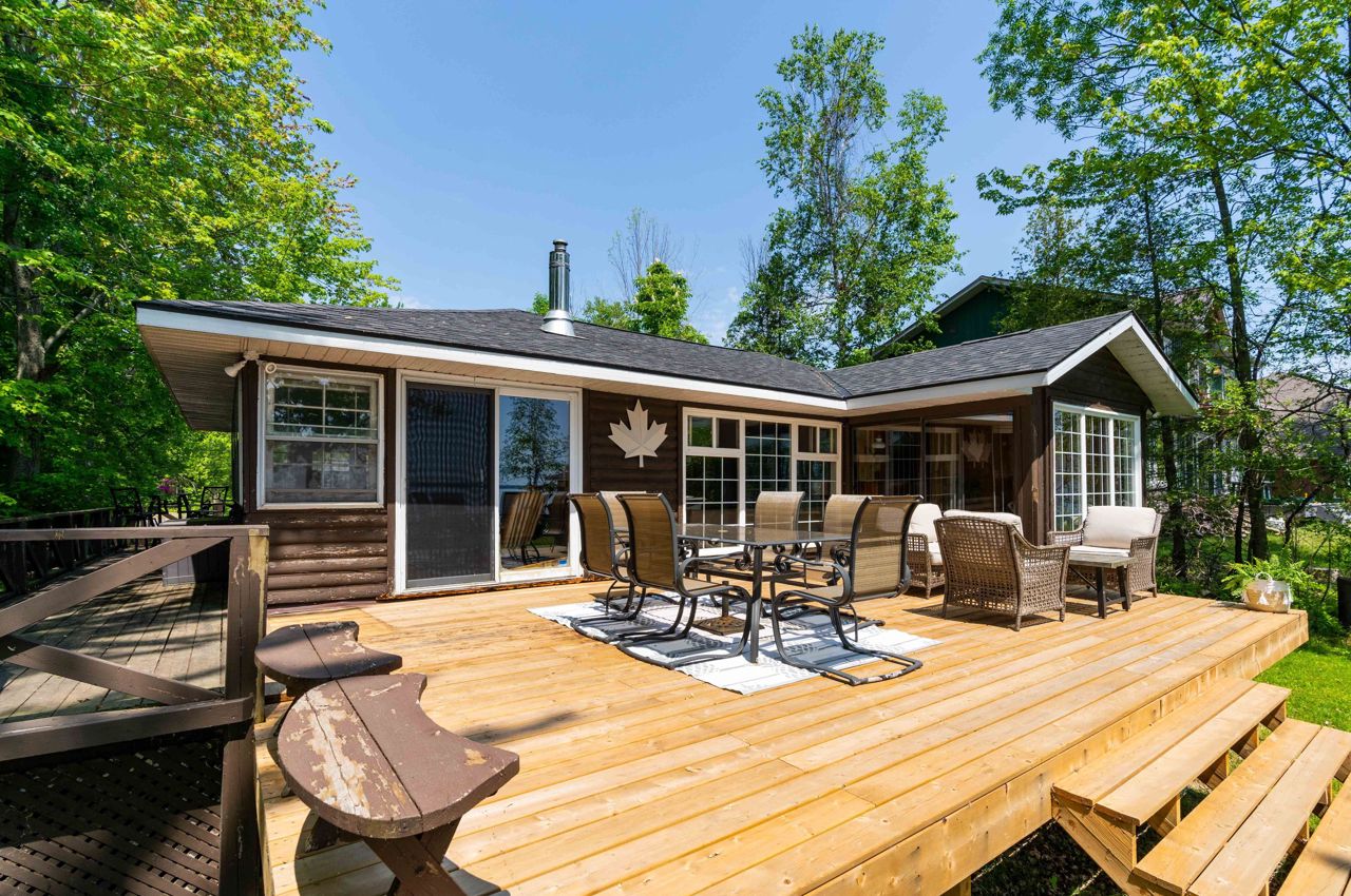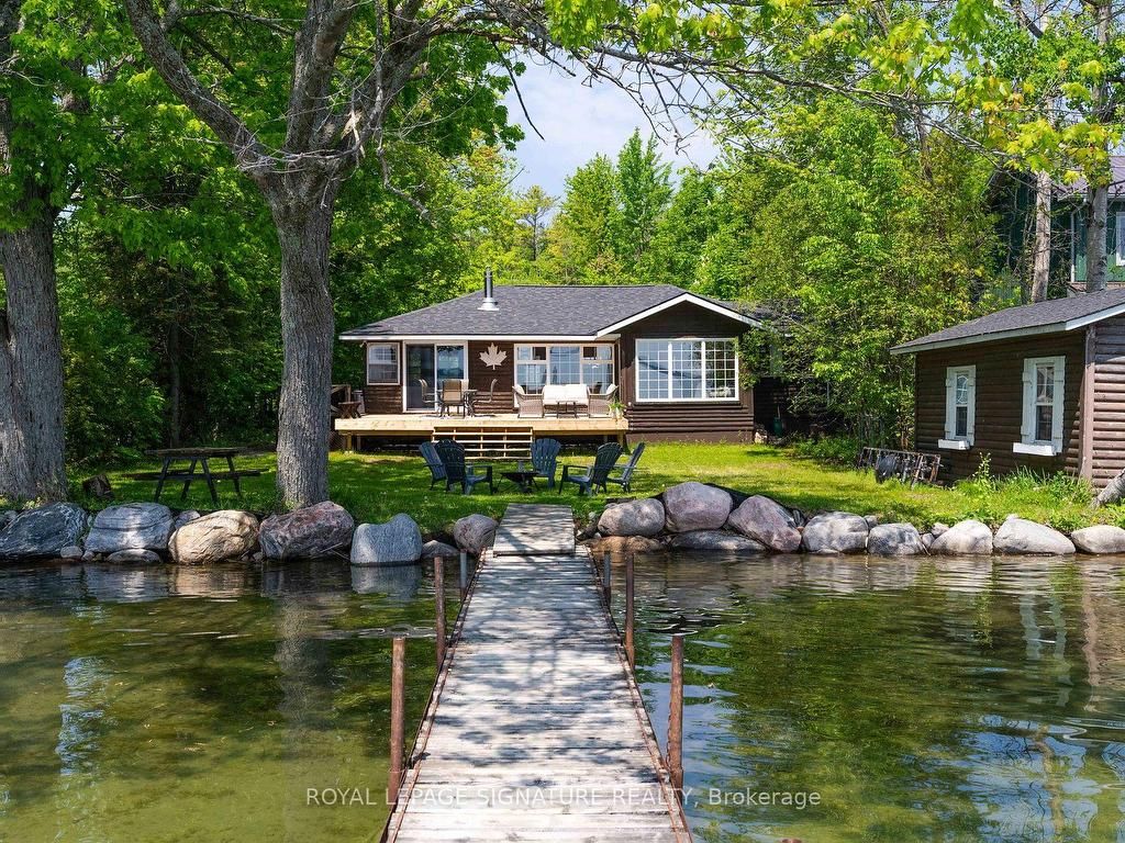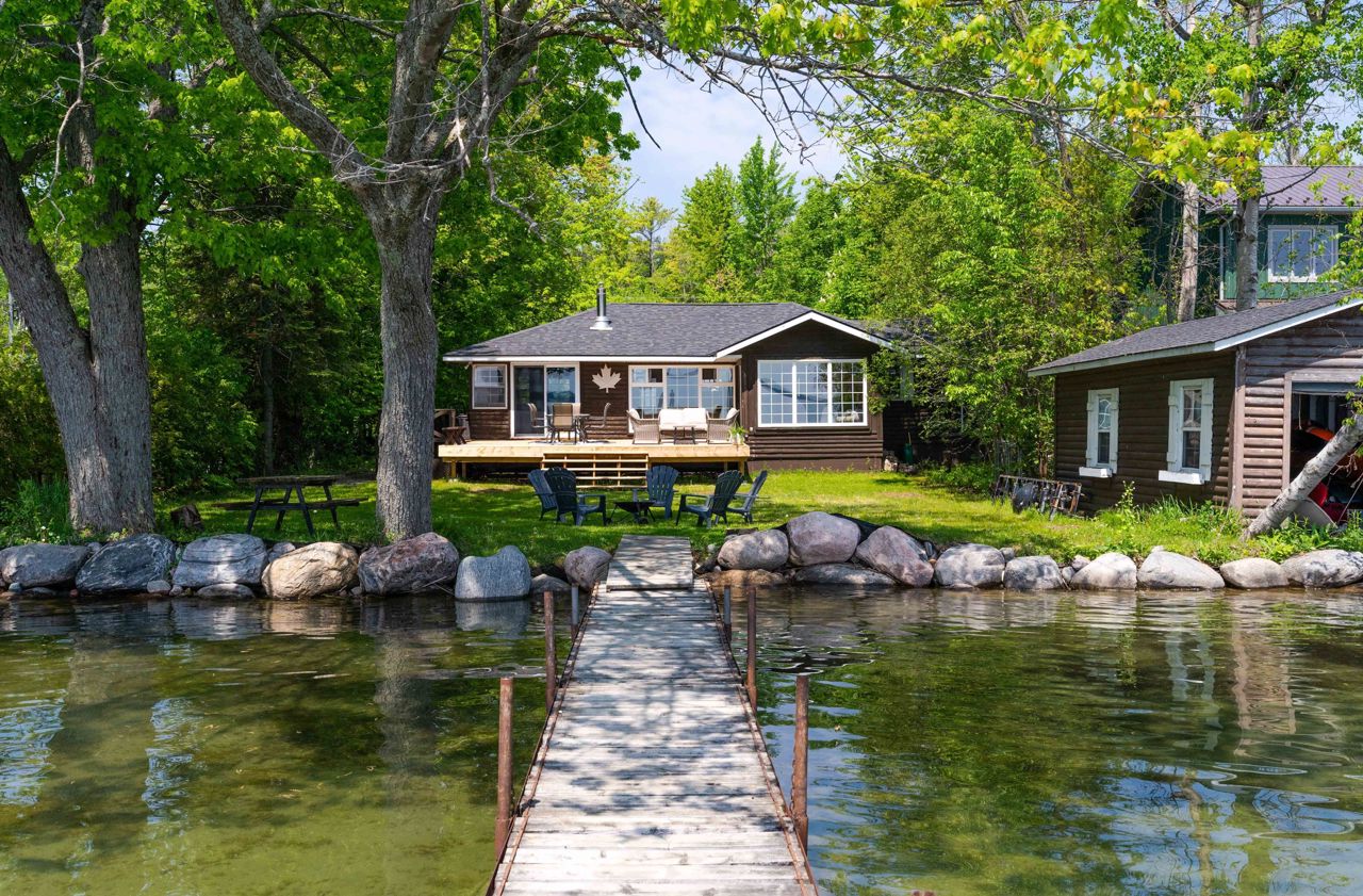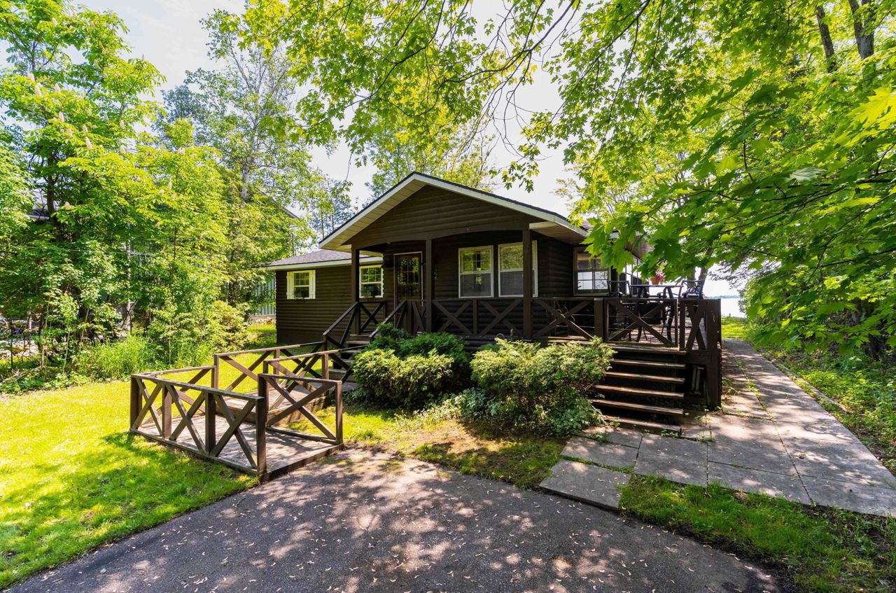LAKE COUCHICHING waterfront cottage with magical South, East views! This classic winterized, 3 bdrm, 2 bathroom with ensuite sits on a stunning private, level lot (75 x 200) on Wilson Point Orillia. Large picture windows overlook the 75' foot sandy, waterfront w/ updated stone retaining wall, standing dock and boat house. Generous sized bedrooms, open concept living / kitchen with walk out wrap around deck and wall to wall windows will a separate walk out to the waterfront deck make this a perfect place for entertaining. The double garage features a separate space, previously used as a bunkie for extra guests. 6 car parking with paved driveway back onto the quiet street, ideal for biking and walking or shoot some hoops in the driveway. Enjoy area features like the Grant Wetlands Nature Reserve, Orillia Millennium Trail, boat or bike to downtown Orillia for dining, shopping and entertainment. Don't miss this gorgeous property just 1.5 hours from GTA in the up and coming area of Orillia