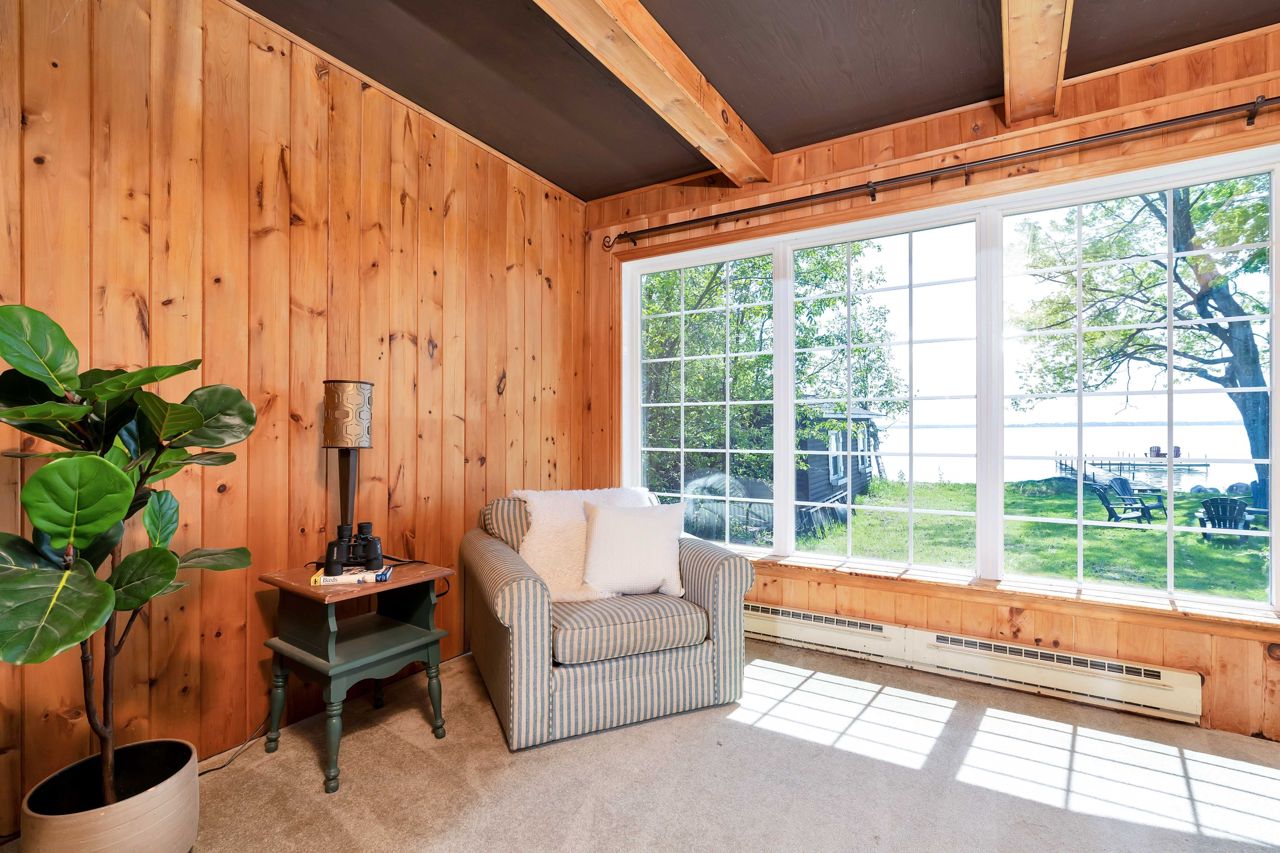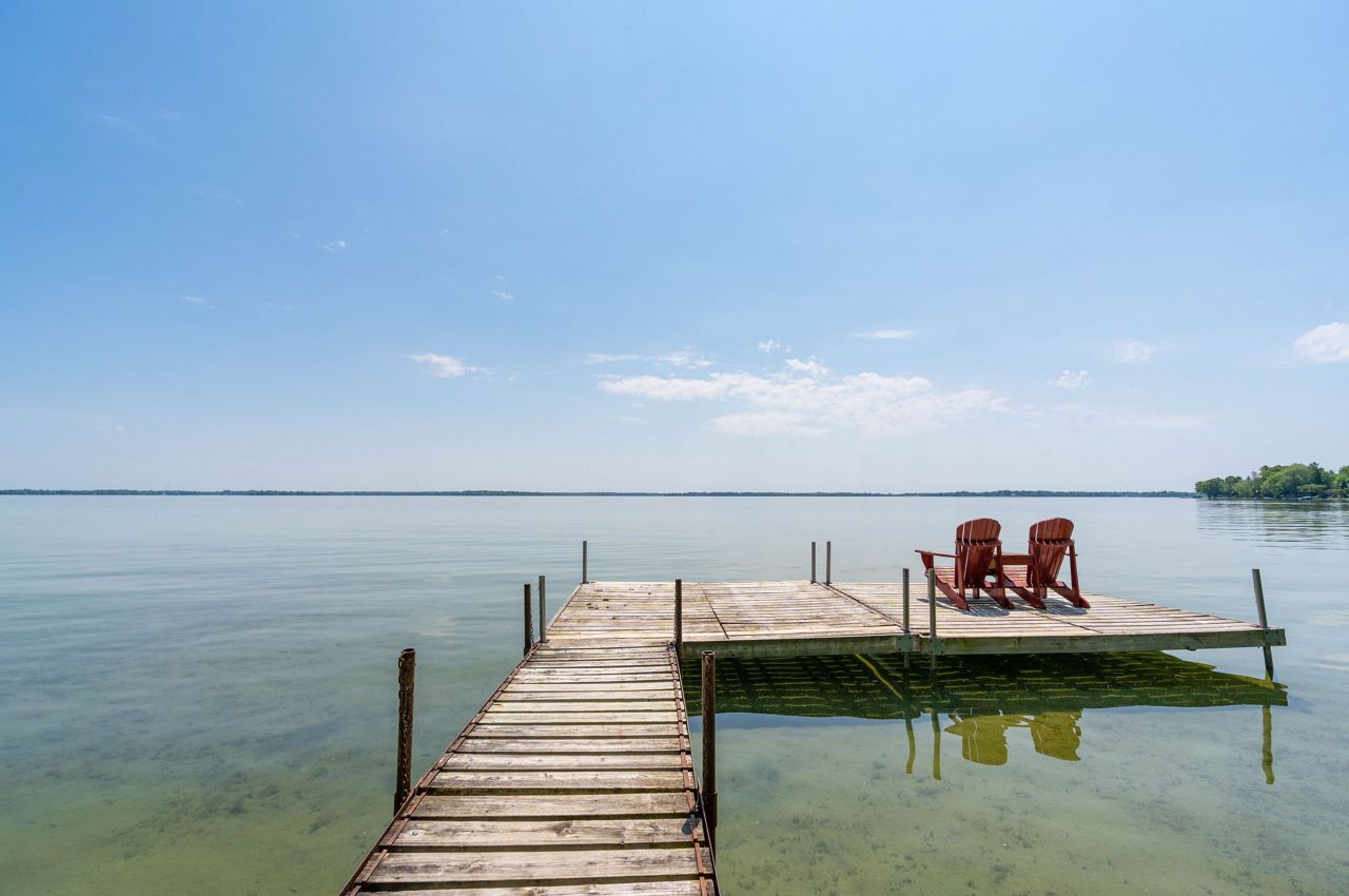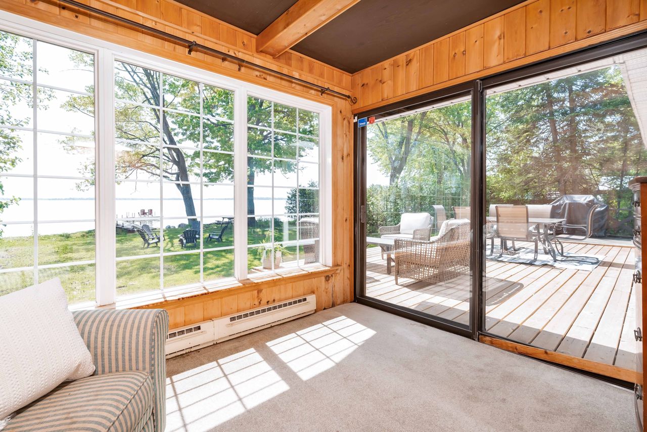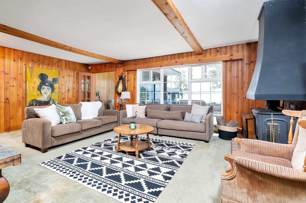 LAKE COUCHICHING waterfront cottage with magical South, East views! This classic winterized, 3 bdrm, 2 bathroom with ensuite sits on a stunning private, level lot (75 x 200) on Wilson Point Orillia. Large picture windows overlook the 75' foot sandy, waterfront w/ updated stone retaining wall, standing dock and boat house. Generous sized bedrooms, open concept living / kitchen with walk out wrap around deck and wall to wall windows will a separate walk out to the waterfront deck make this a perfect place for entertaining. The double garage features a separate space, previously used as a bunkie for extra guests. 6 car parking with paved driveway back onto the quiet street, ideal for biking and walking or shoot some hoops in the driveway. Enjoy area features like the Grant Wetlands Nature Reserve, Orillia Millennium Trail, boat or bike to downtown Orillia for dining, shopping and entertainment. Don't miss this gorgeous property just 1.5 hours from GTA in the up and coming area of Orillia