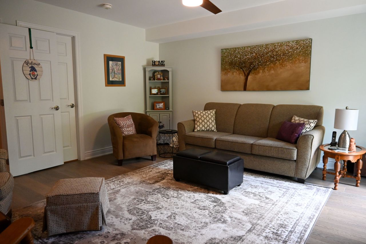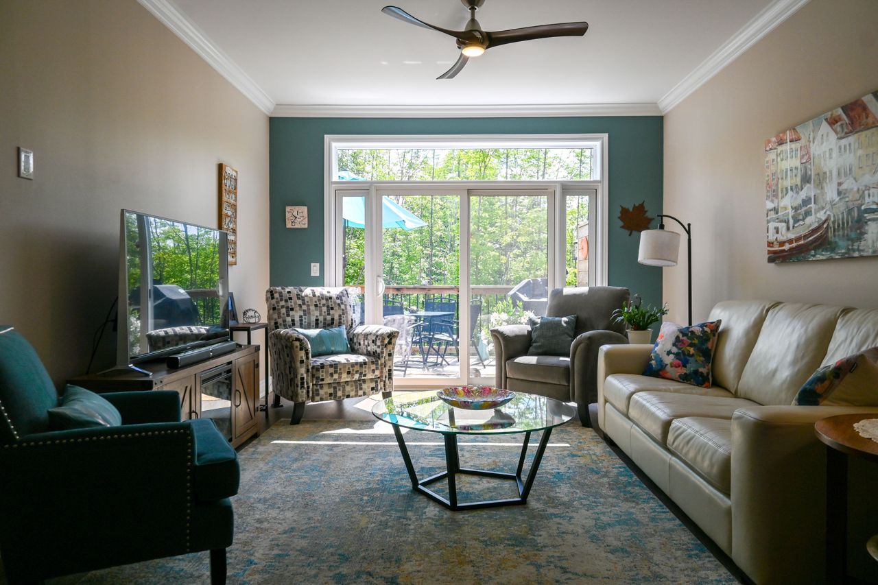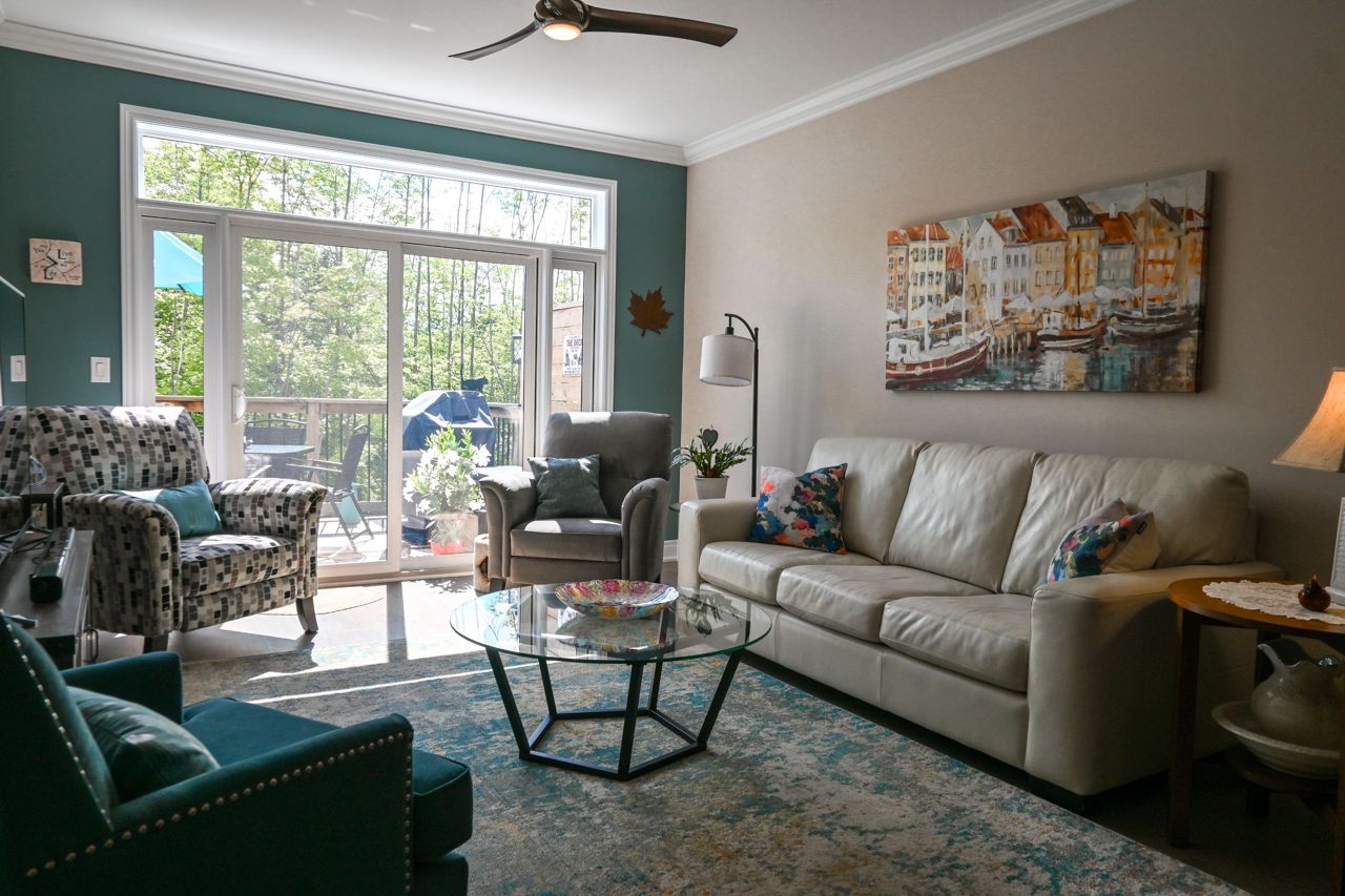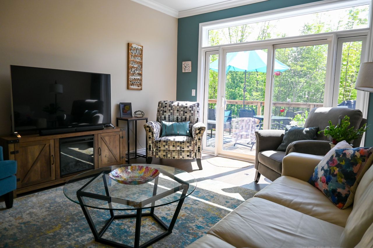 with abundant natural light and a walkout to the upper deck, offering stunning views of the lush green