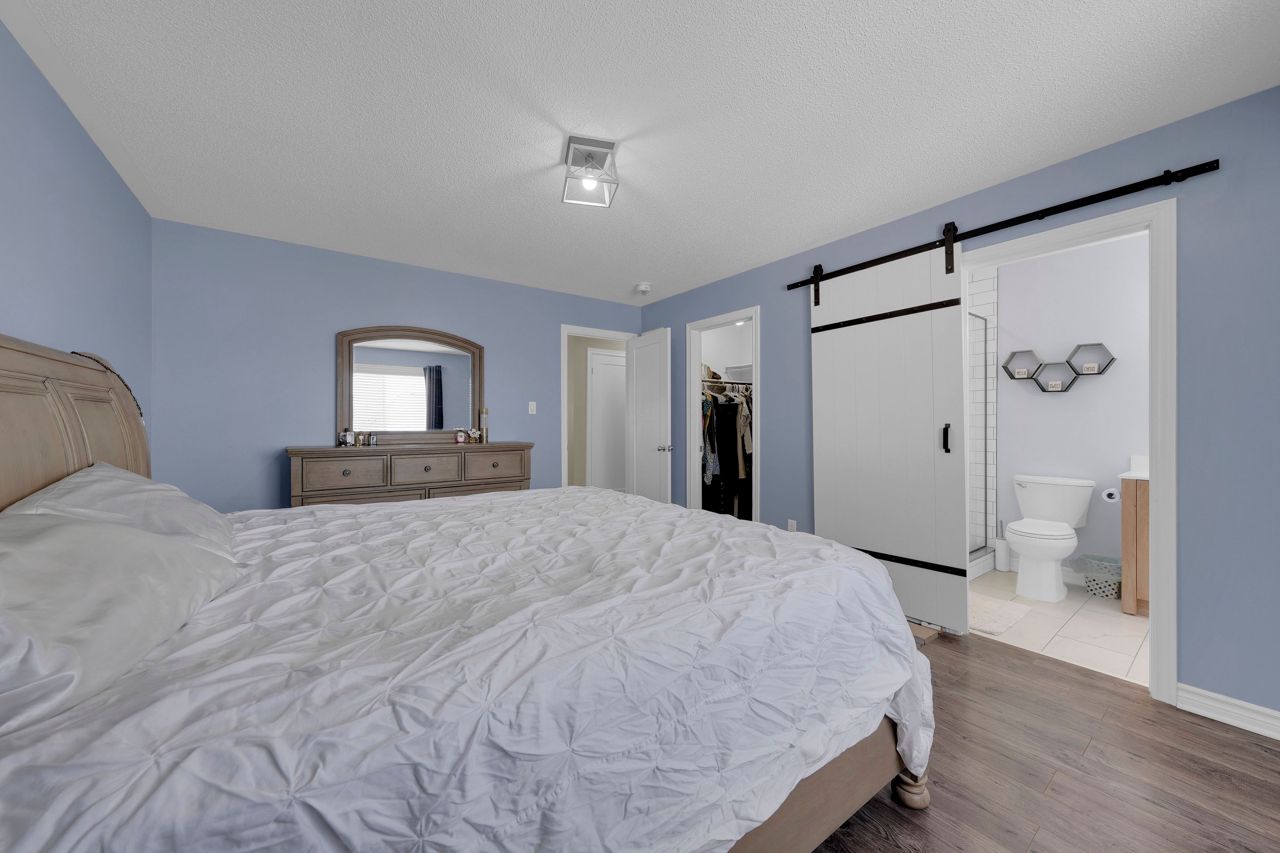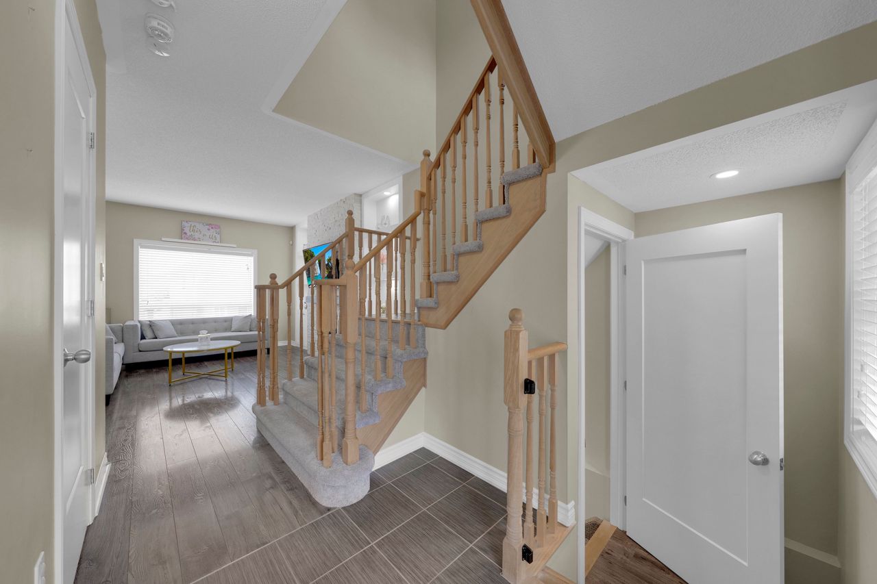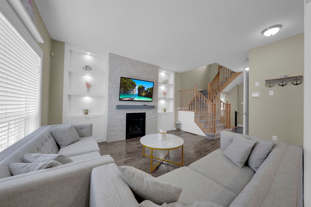 Impressive 3 bed, 4 bath home (built 2016) with 2000 sq. ft. living space incl. basement. Highlights: open concept kitchen/dining/living area, quartz counters, butcher block island, stainless steel appliances, luxury laminate flooring, gas fireplace, accent pallet wall, 9 ft. ceilings, garage access, large yard. Lower level (finished 2020) offers 2 pc. bath, laundry room, sunlit rec room. Upper floor: primary bed with updated 3 pc. ensuite & walk-in closet, 2nd bed with semi ensuite & walk-in closet, 3rd bed overlooking backyard. Outdoor features: 2 car garage, 4 car driveway, 16x16 ft. deck with 2020-built pergola, fully fenced yard with built-in planters, landscaped front yard with natural stone steps. Easy commute to highways 89, 10 & 410.